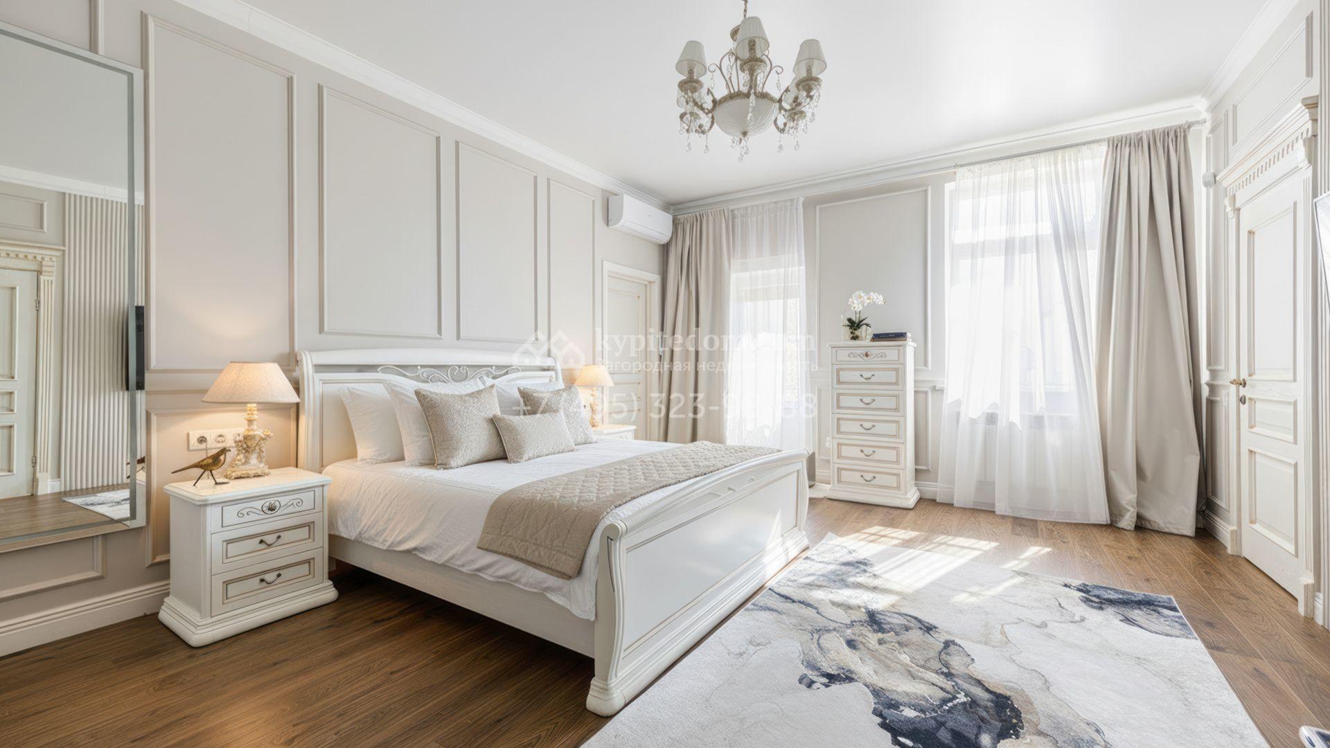 Внутренние пространства выдержаны в спокойных, светлых оттенках — преобладают белый и кремовый, мягко сочетающиеся с оттенками натурального дерева. Атмосфера наполнена легкостью и изяществом благодаря тщательно подобранному декору: ненавязчивые бра и светильники, изящные резные элементы мебели и дверей, художественные кованые ограждения и ковры с утончённым рисунком.