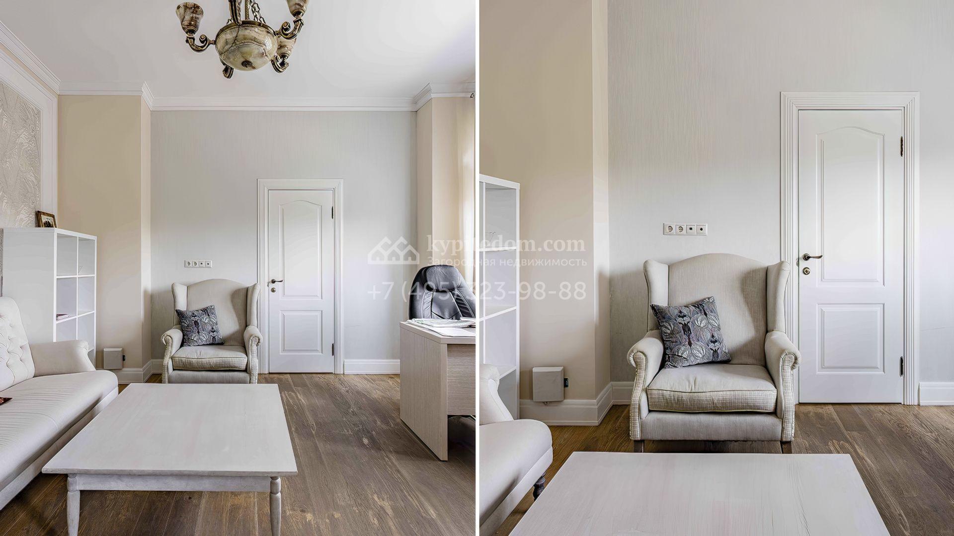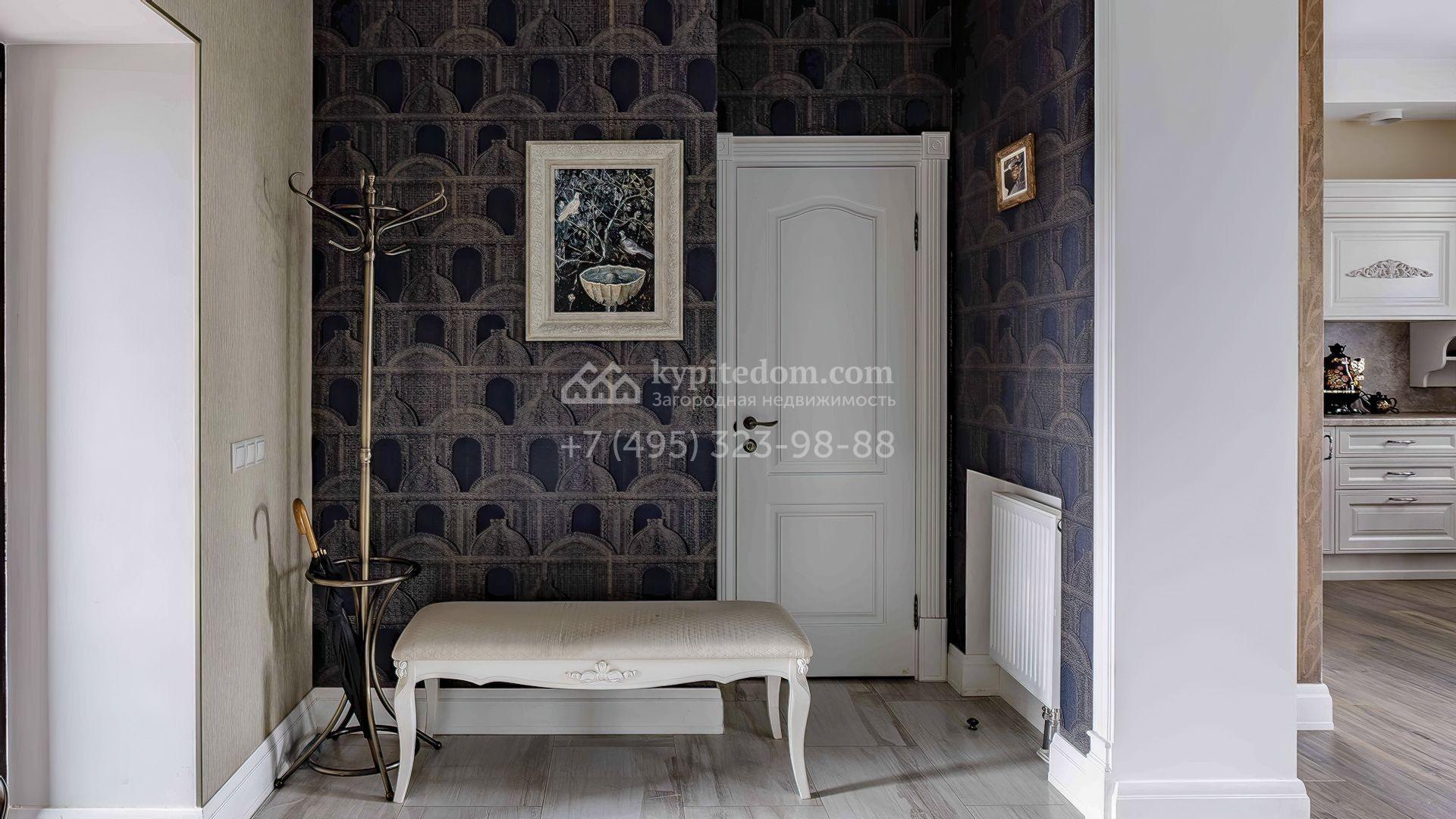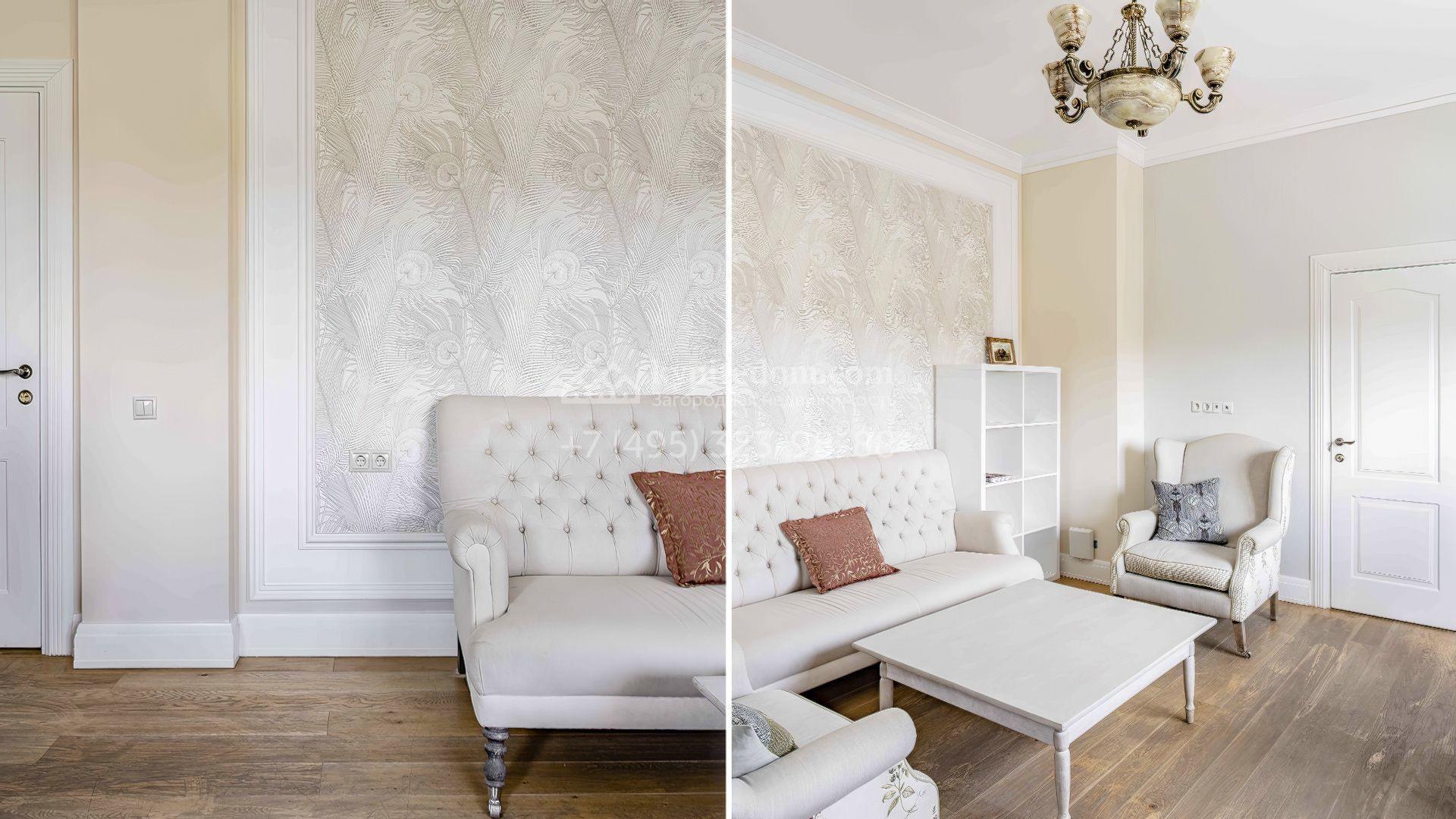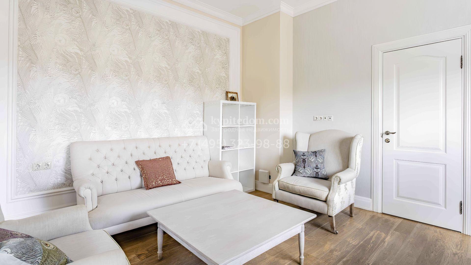 Интерьеры поддерживают общую концепцию дома, выделяя светлые оттенки, натуральные материалы и утонченные детали. Изящные обои с тонкими узорами придают помещению элегантность, а лаконичная мебель в сочетании с предметами декора и дизайнерскими люстрами подчеркивает уютную атмосферу.
