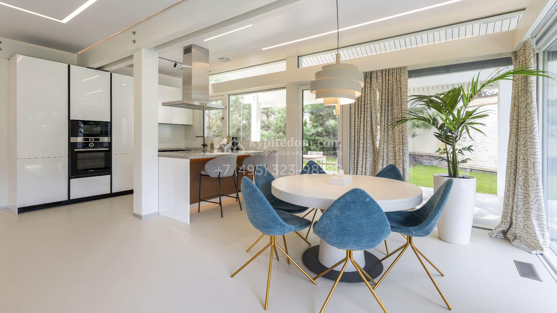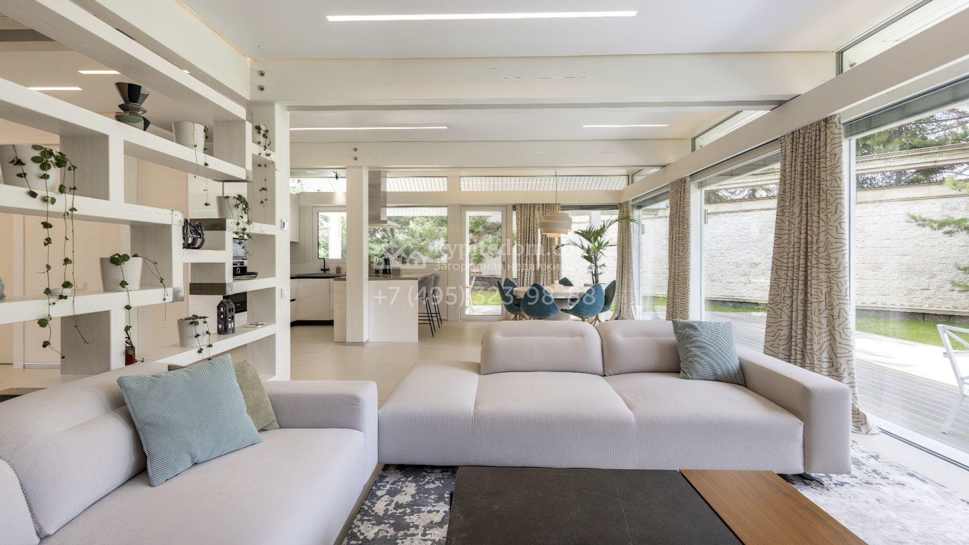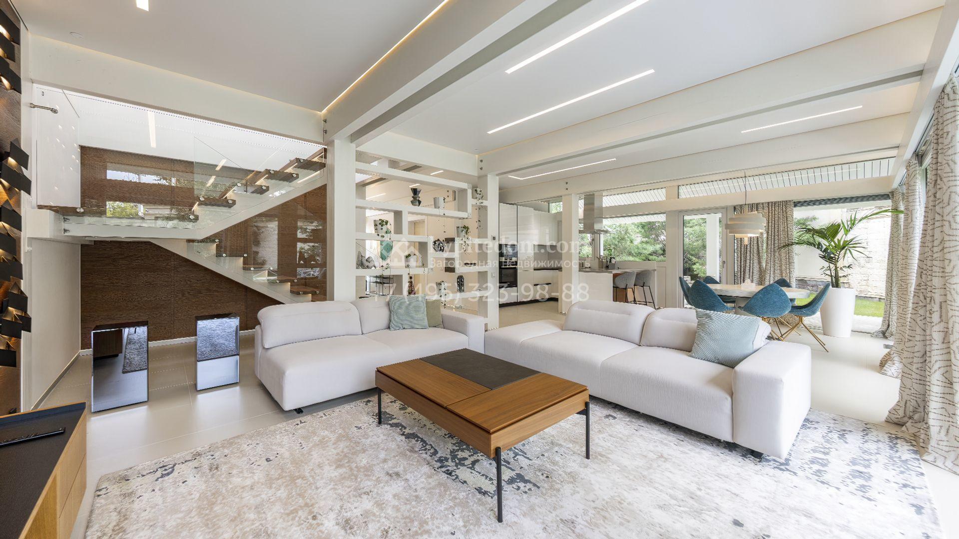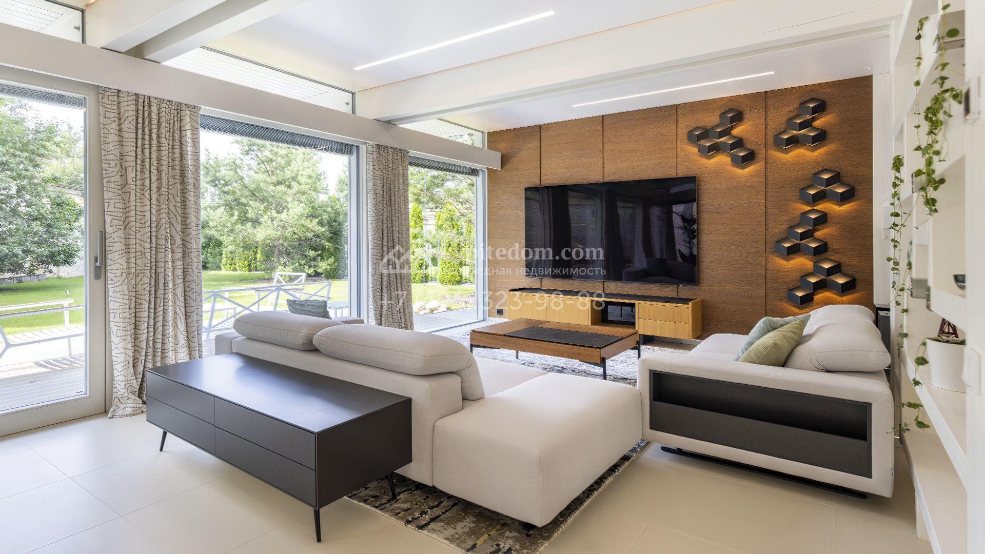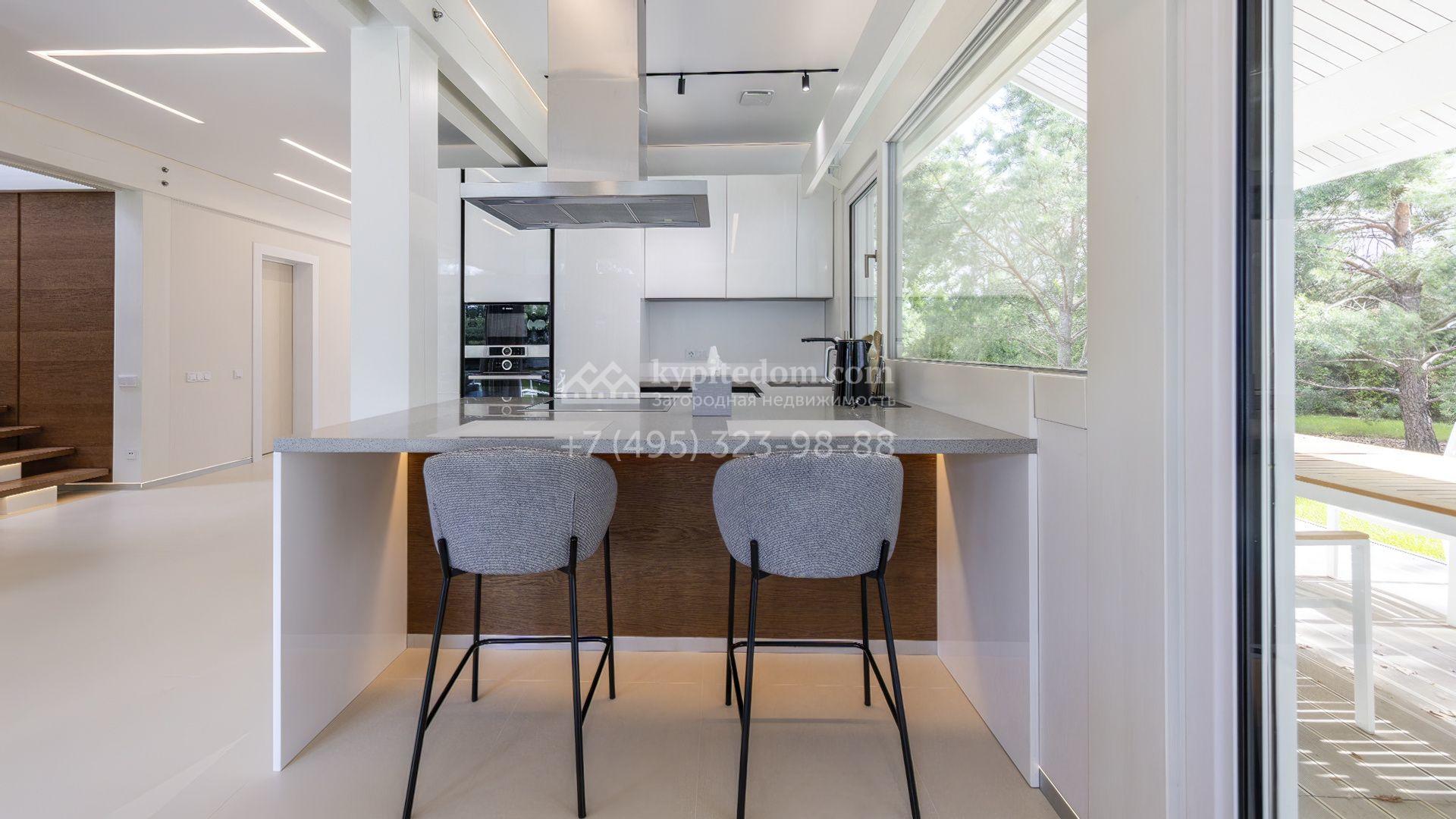 Интерьеры оформлены по эксклюзивному проекту, где в отделке преобладают нейтральные оттенки, дополненные природными текстурами. Продуманное освещение и панорамные окна наполняют комнаты светом и визуально расширяют пространство. Коттедж полностью меблирован и оснащен техникой от Samsung и Asko. В котельной установлен резервный генератор мощностью 21 кВт от итальянского производителя.