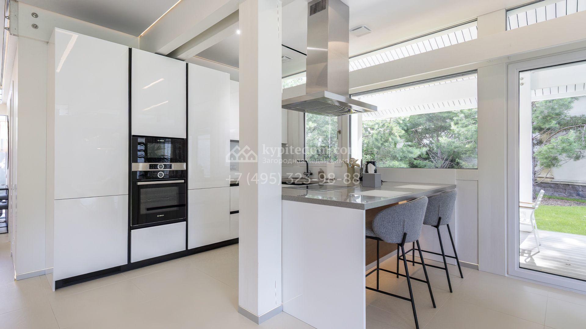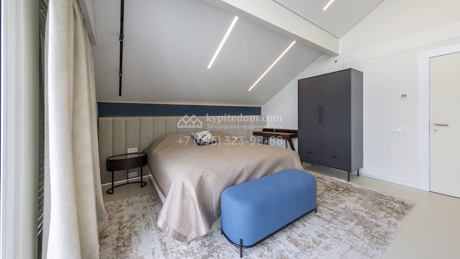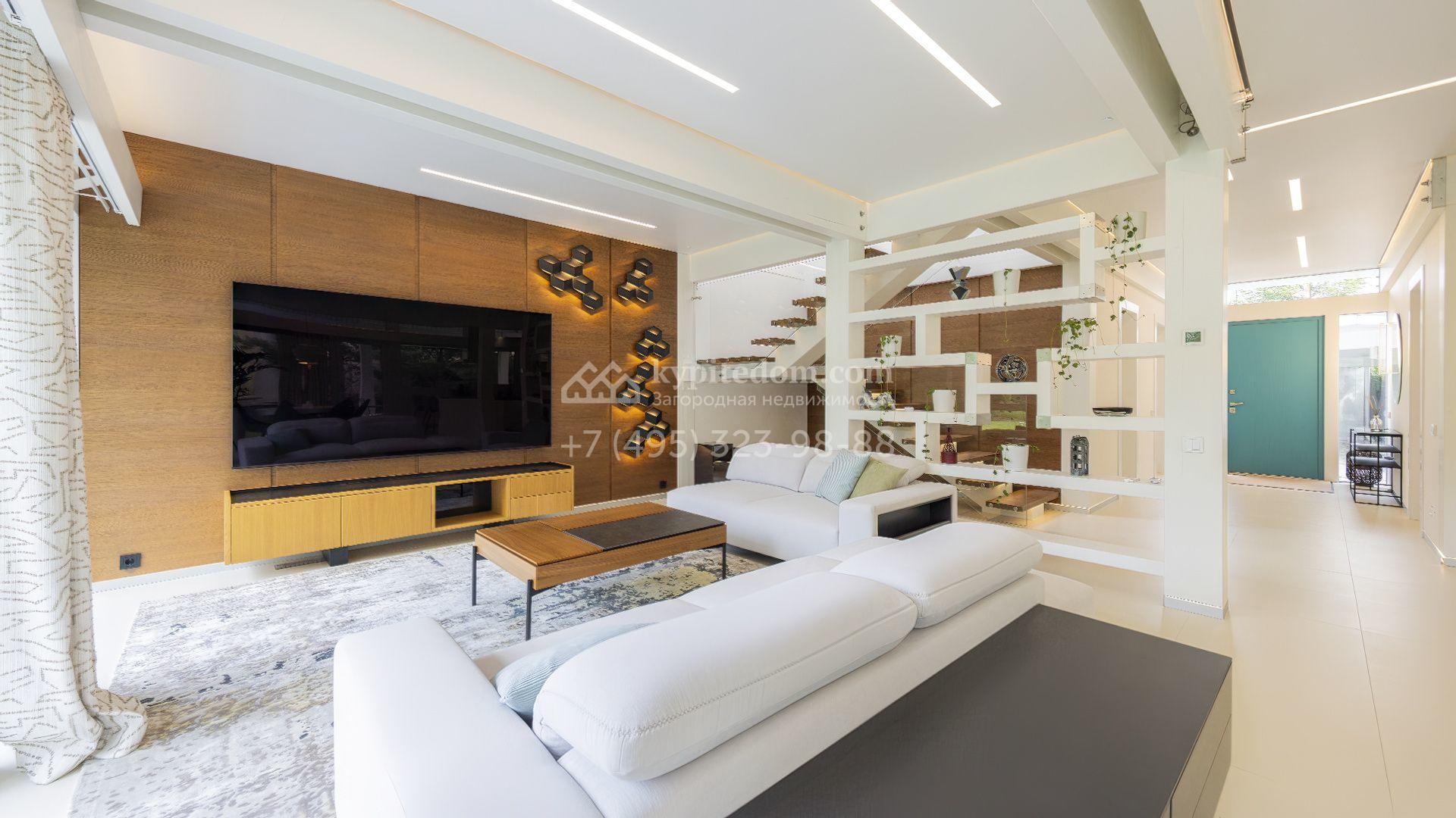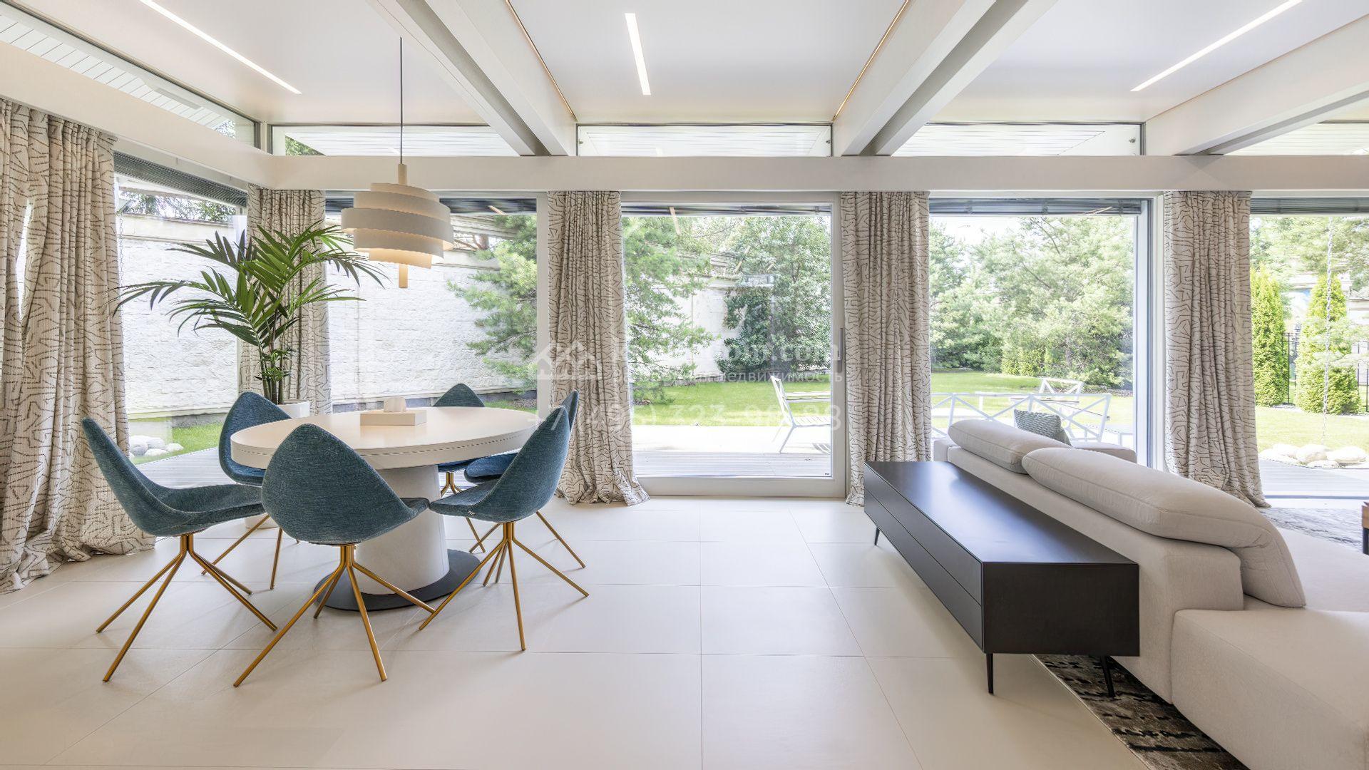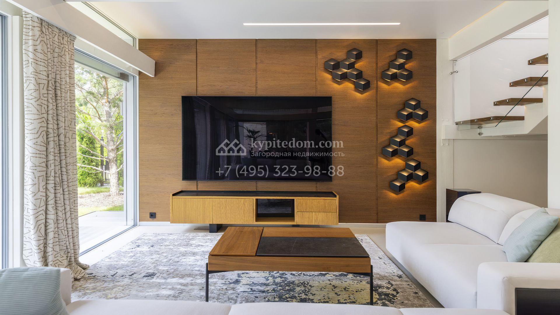 Интерьеры оформлены по эксклюзивному проекту, где в отделке преобладают нейтральные оттенки, дополненные природными текстурами. Продуманное освещение и панорамные окна наполняют комнаты светом и визуально расширяют пространство. Коттедж полностью меблирован и оснащен техникой от Samsung и Asko. В котельной установлен резервный генератор мощностью 21 кВт от итальянского производителя.