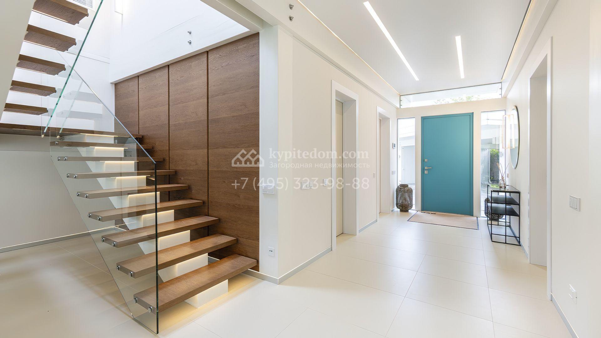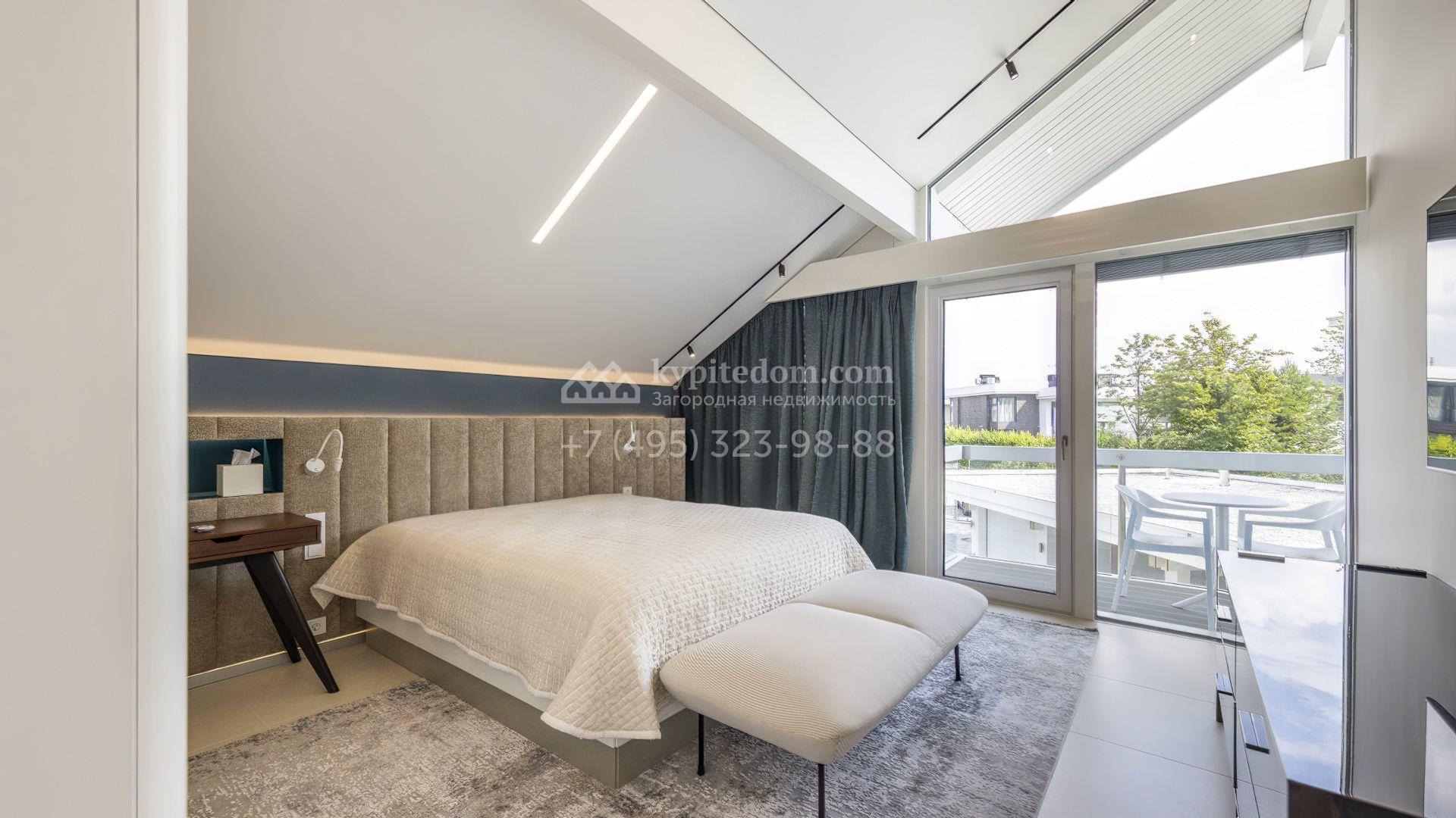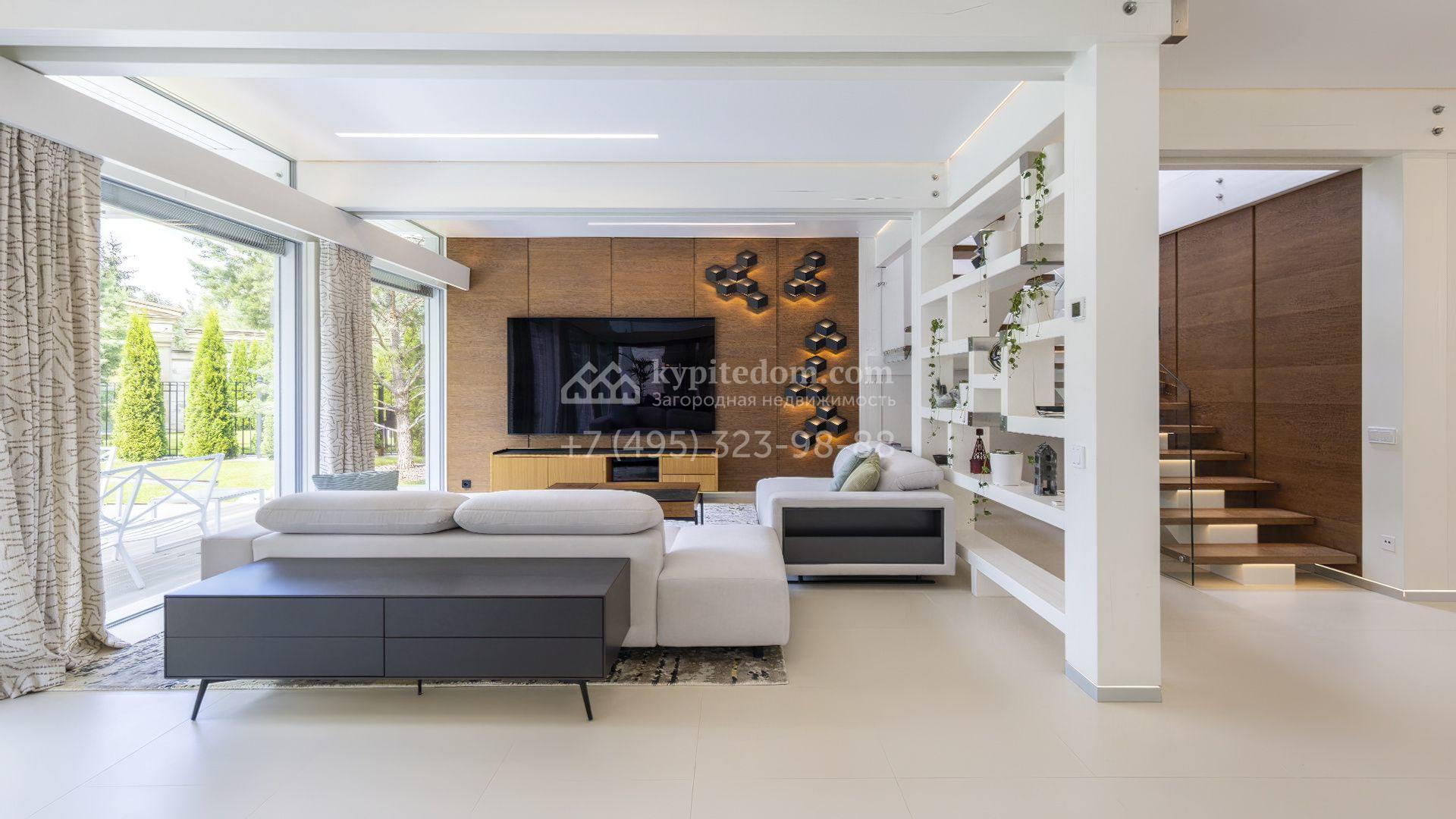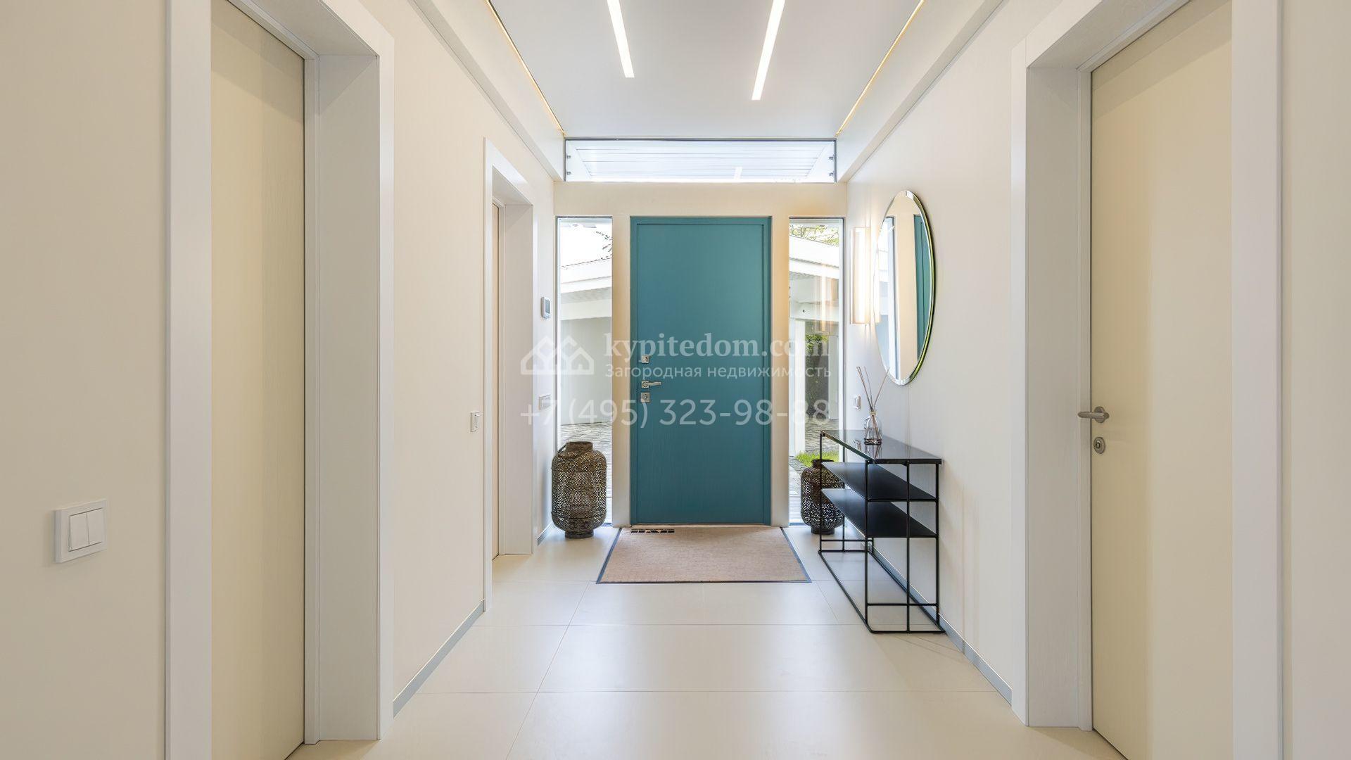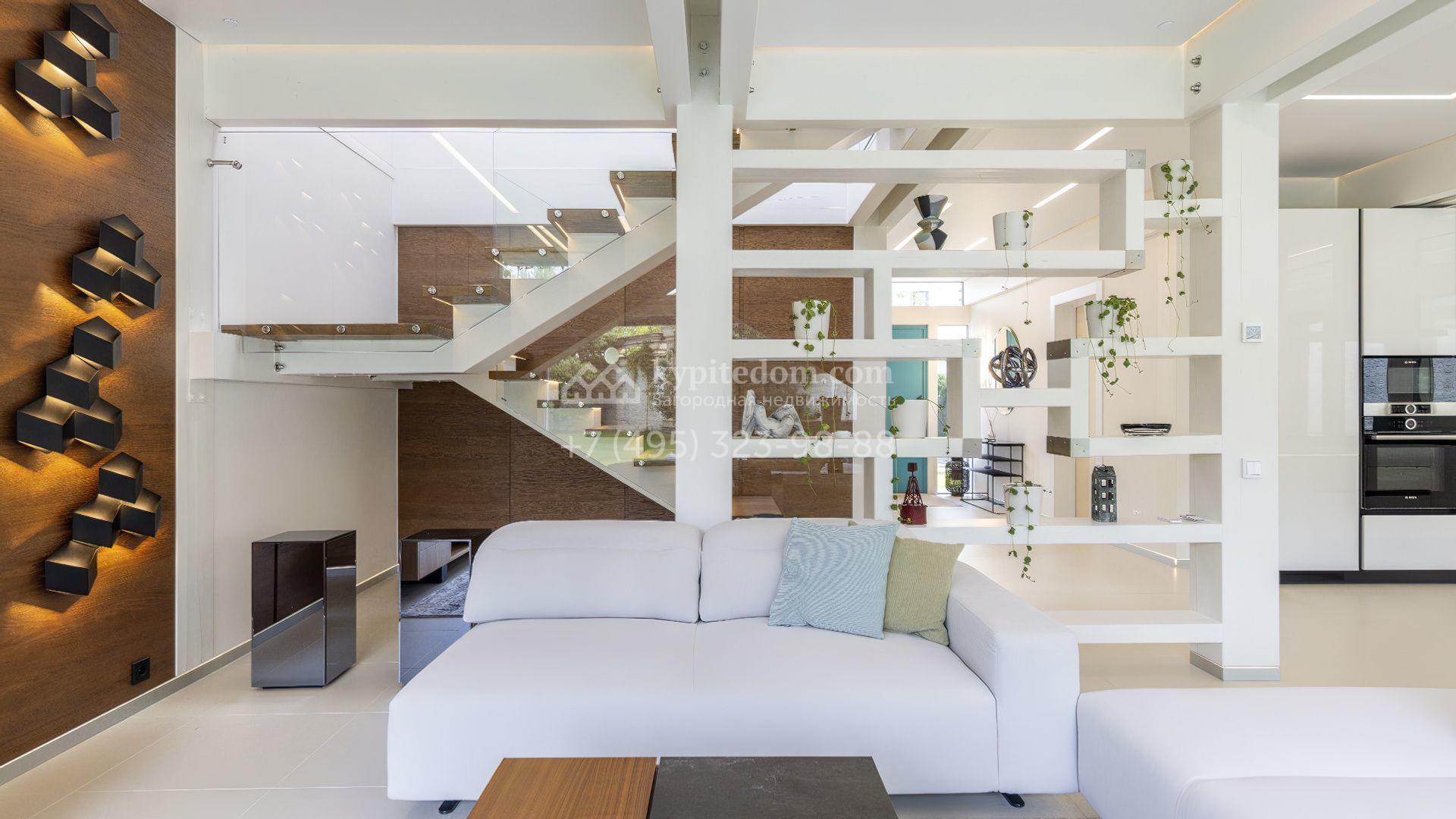 Интерьеры оформлены по эксклюзивному проекту, где в отделке преобладают нейтральные оттенки, дополненные природными текстурами. Продуманное освещение и панорамные окна наполняют комнаты светом и визуально расширяют пространство. Коттедж полностью меблирован и оснащен техникой от Samsung и Asko. В котельной установлен резервный генератор мощностью 21 кВт от итальянского производителя.