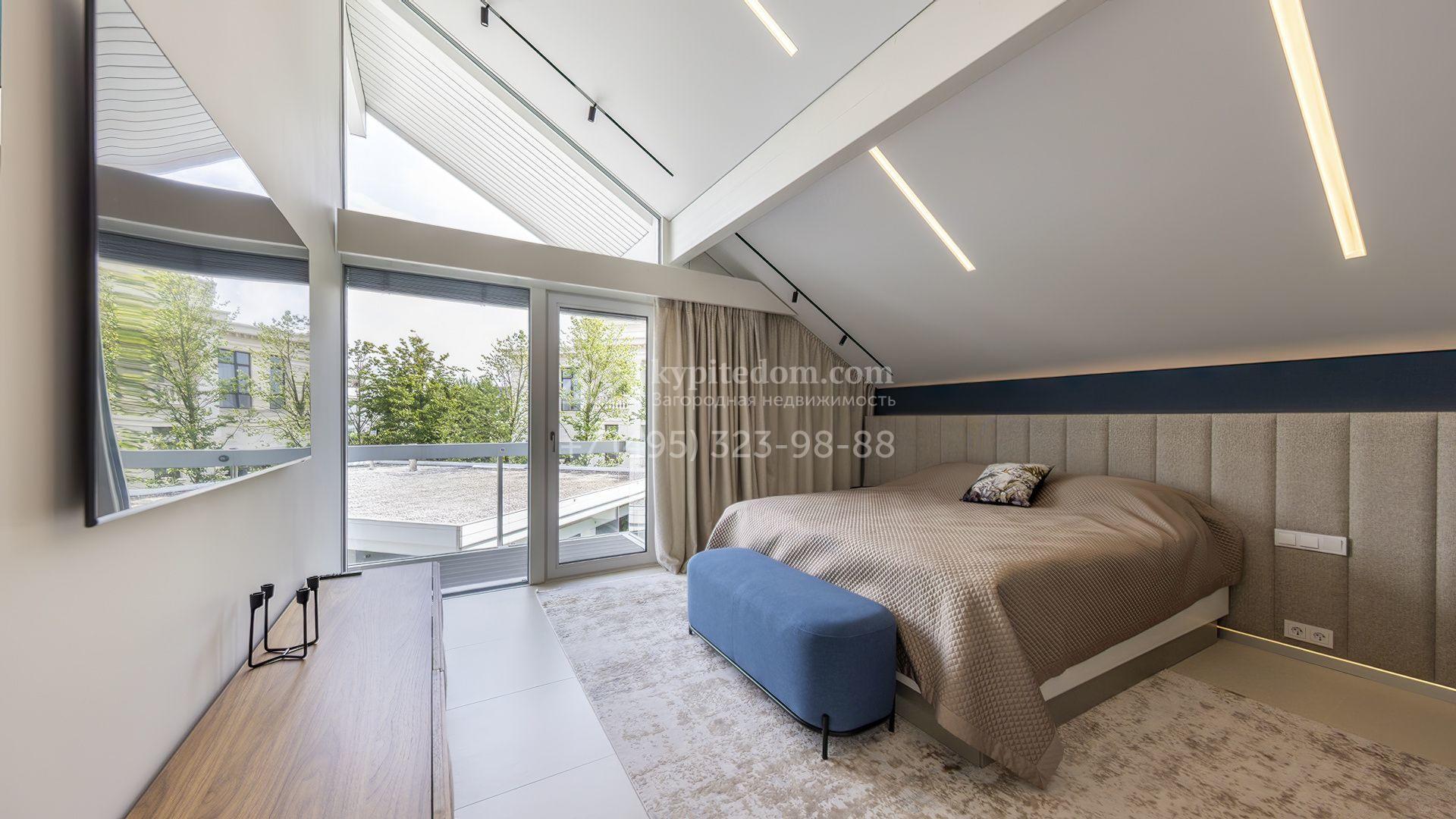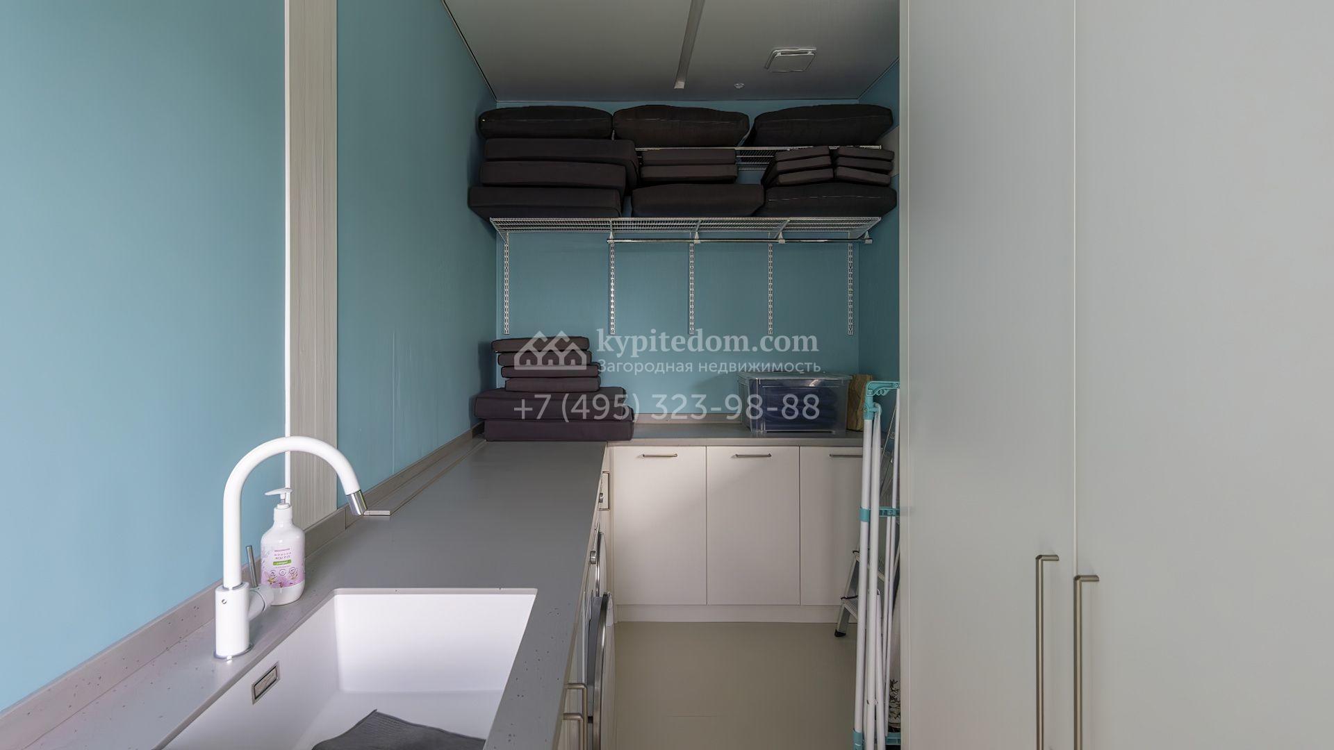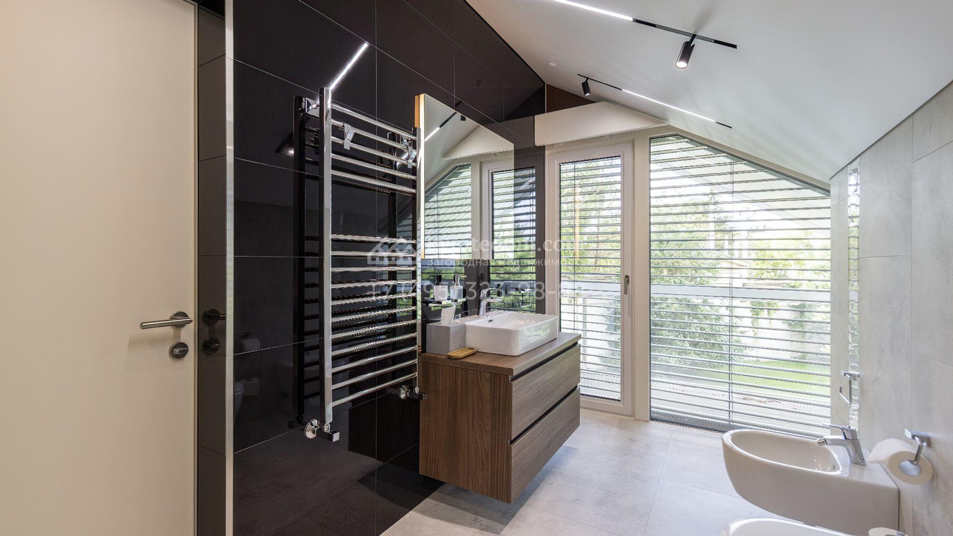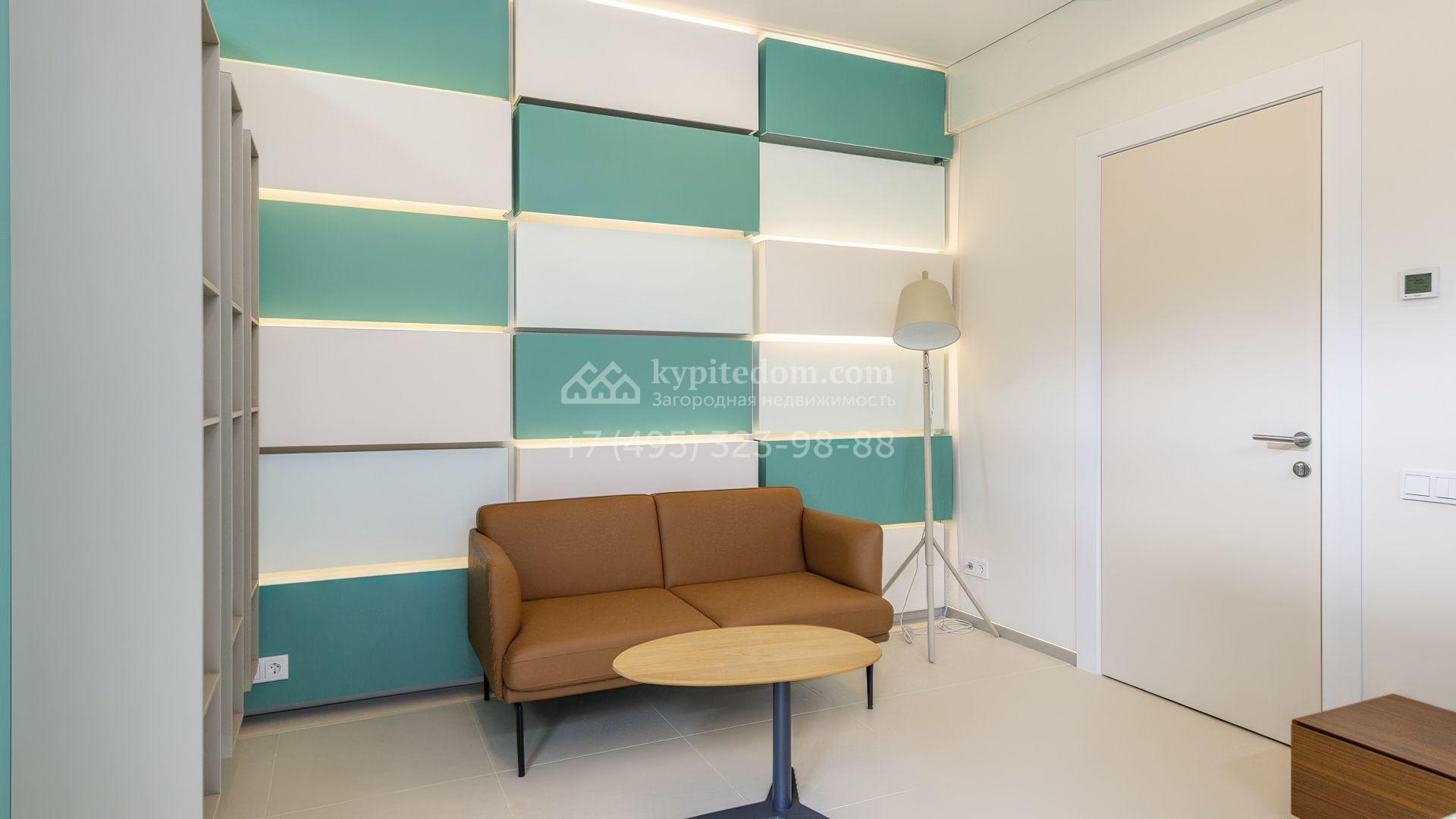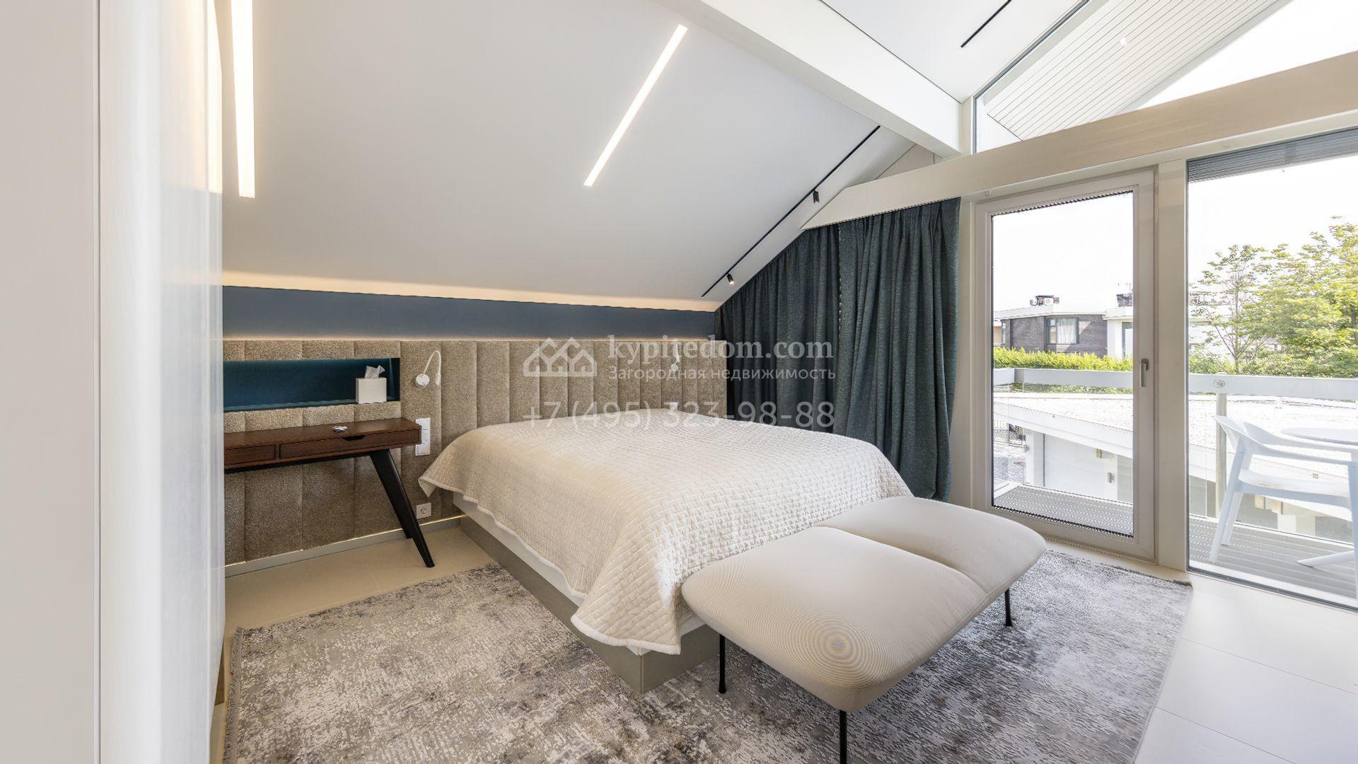 Интерьеры оформлены по эксклюзивному проекту, где в отделке преобладают нейтральные оттенки, дополненные природными текстурами. Продуманное освещение и панорамные окна наполняют комнаты светом и визуально расширяют пространство. Коттедж полностью меблирован и оснащен техникой от Samsung и Asko. В котельной установлен резервный генератор мощностью 21 кВт от итальянского производителя.