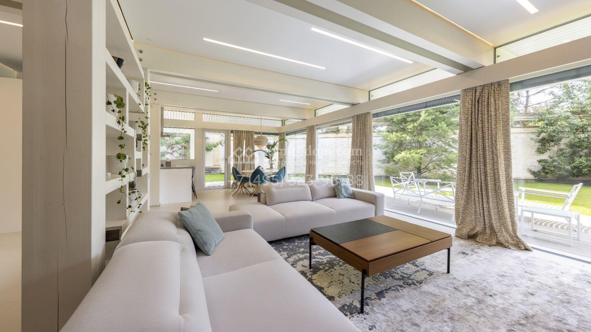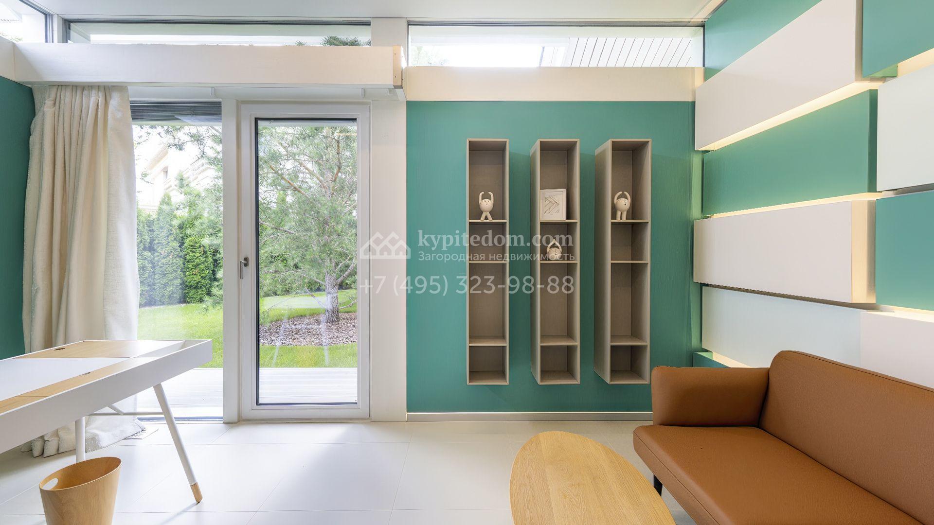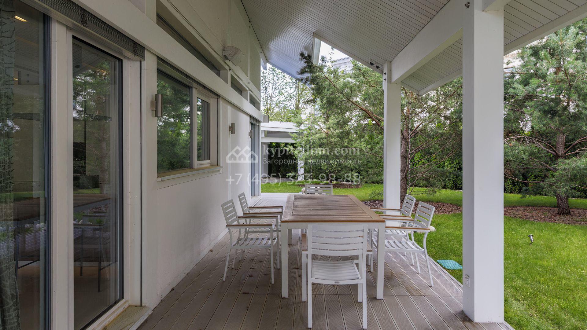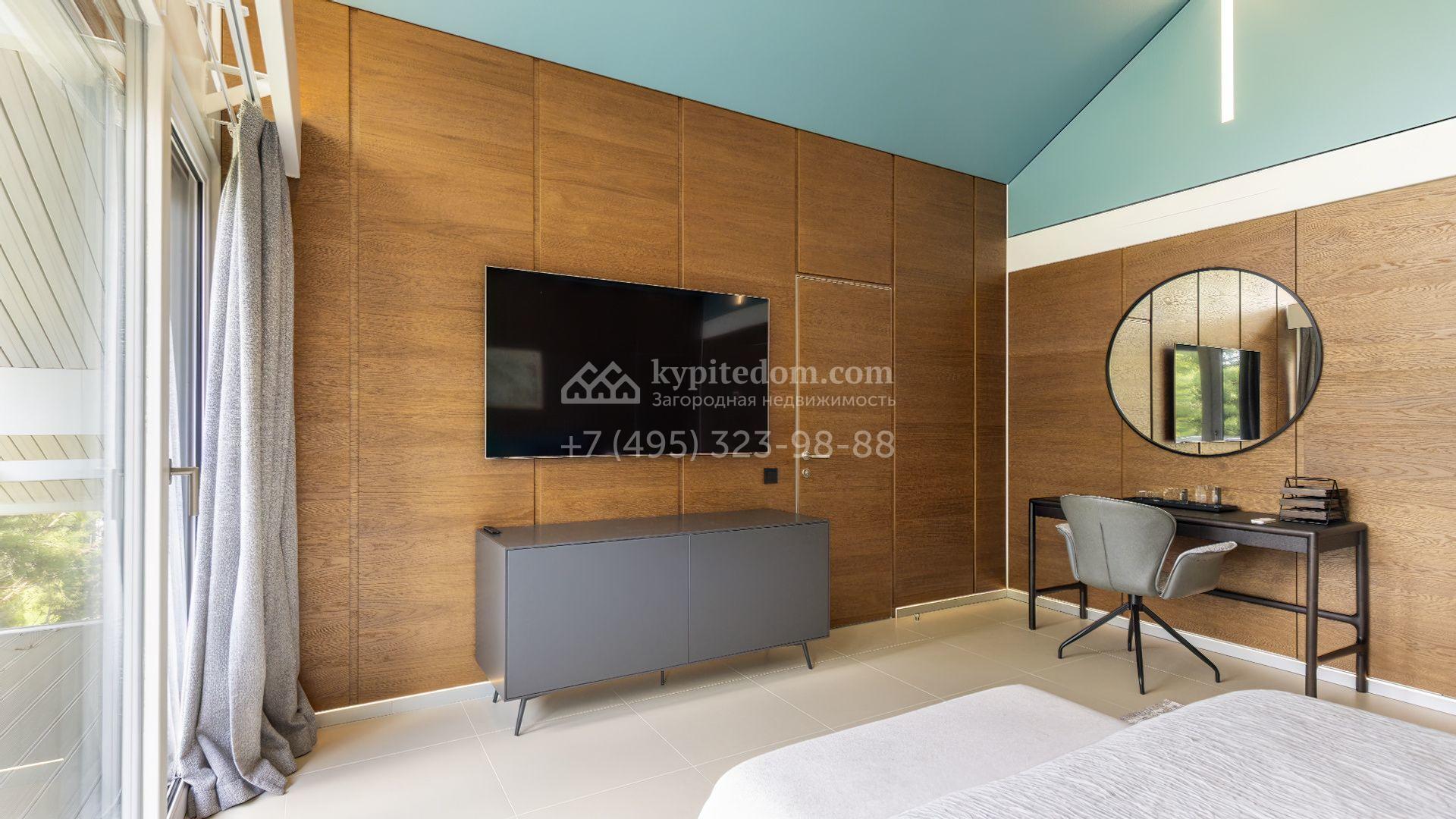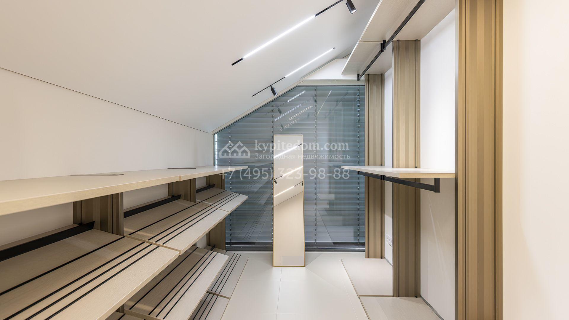 Интерьеры оформлены по эксклюзивному проекту, где в отделке преобладают нейтральные оттенки, дополненные природными текстурами. Продуманное освещение и панорамные окна наполняют комнаты светом и визуально расширяют пространство. Коттедж полностью меблирован и оснащен техникой от Samsung и Asko. В котельной установлен резервный генератор мощностью 21 кВт от итальянского производителя.