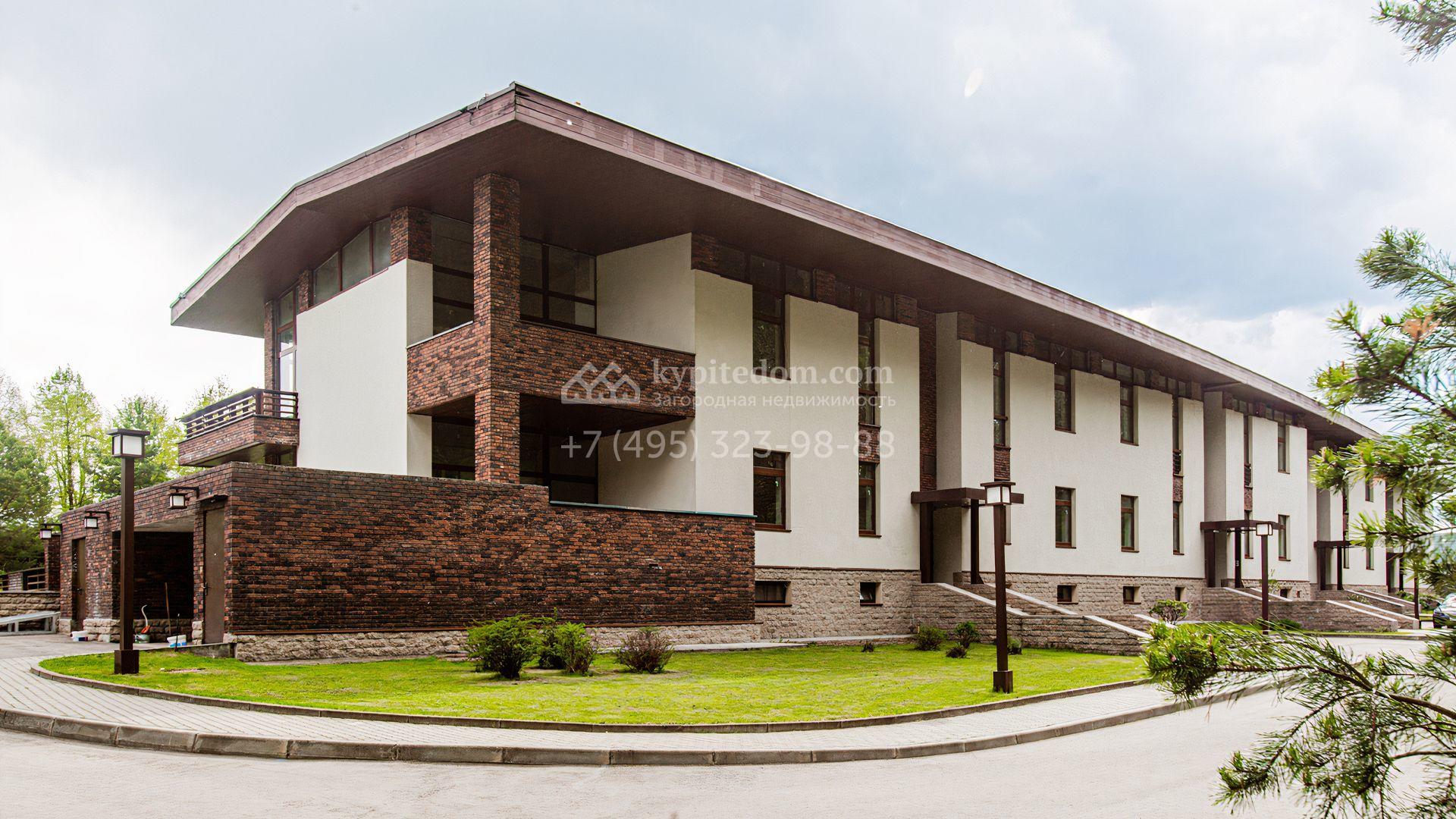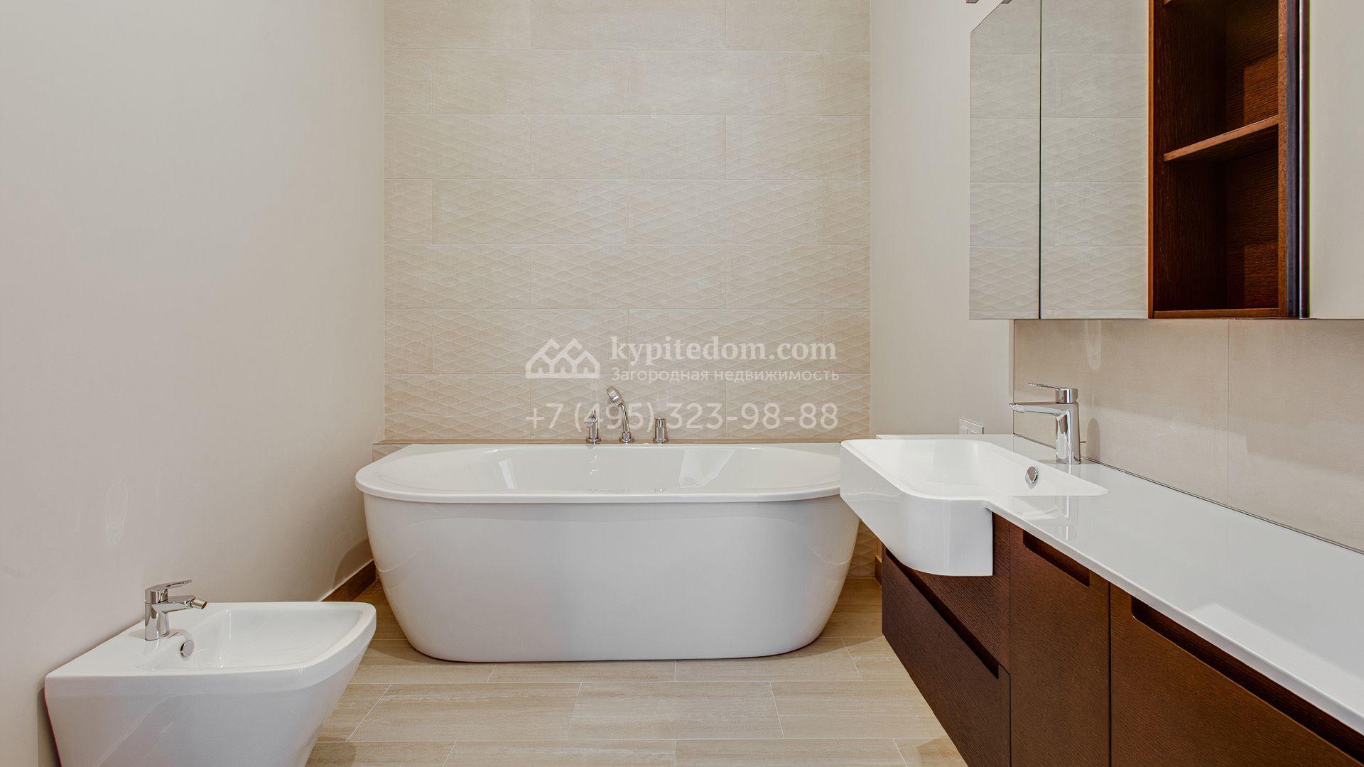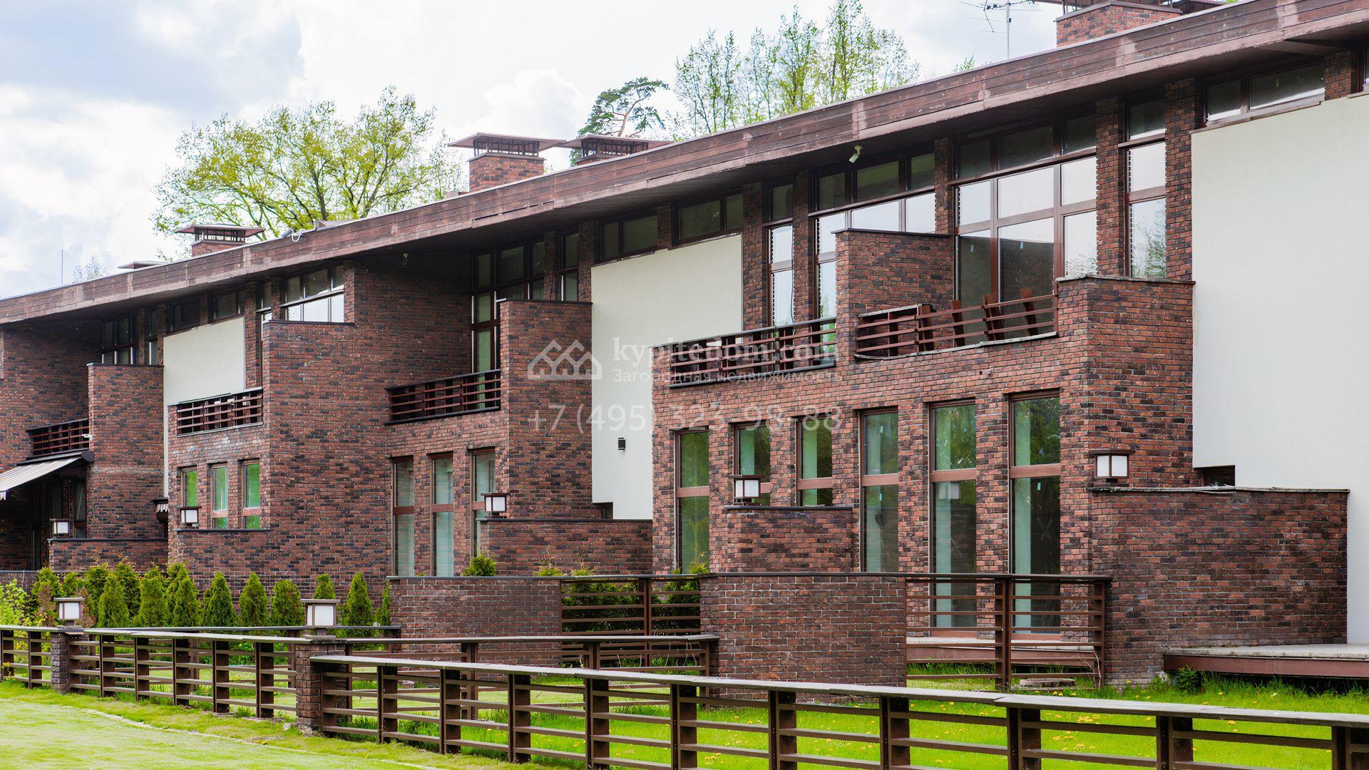 Трехуровневый таунхаус площадью 360 м² построен на полевом участке 3 сотки с газоном. Фасад с большими окнами в современном стиле облицован красным клинкерным кирпичом и бежевой штукатуркой. Лаконичный интерьер сочетает молочные оттенки и фактуру темного дерева. В доме разместили 3 спальни, гостиную-столовую с выходом на патио, кухню, кабинет и SPA-зону с сауной и комнатой отдыха. Предусмотрен блок для персонала с 2-мя спальнями и кухней. С участка открывается вид на высаженные деревья и кустарники.