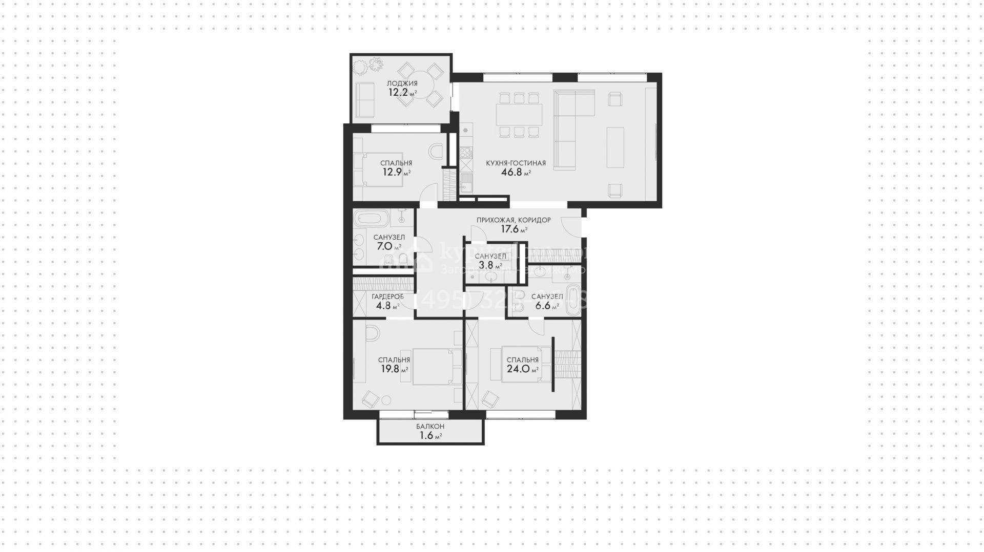 Квартира площадью 157,6 м² расположена на седьмом этаже семиэтажного дома. Свободная планировка позволяет воплотить множество интерьерных решений. Проект может включать кухню-сготиную с выходом на лоджию, спальню с санузлом, спальню с гардеробной и балконом, гостевую спальню, которую можно оборудовать как кабинет. Окна выходят на три стороны и открывают живописные виды на приватный парк и внутренний двор.