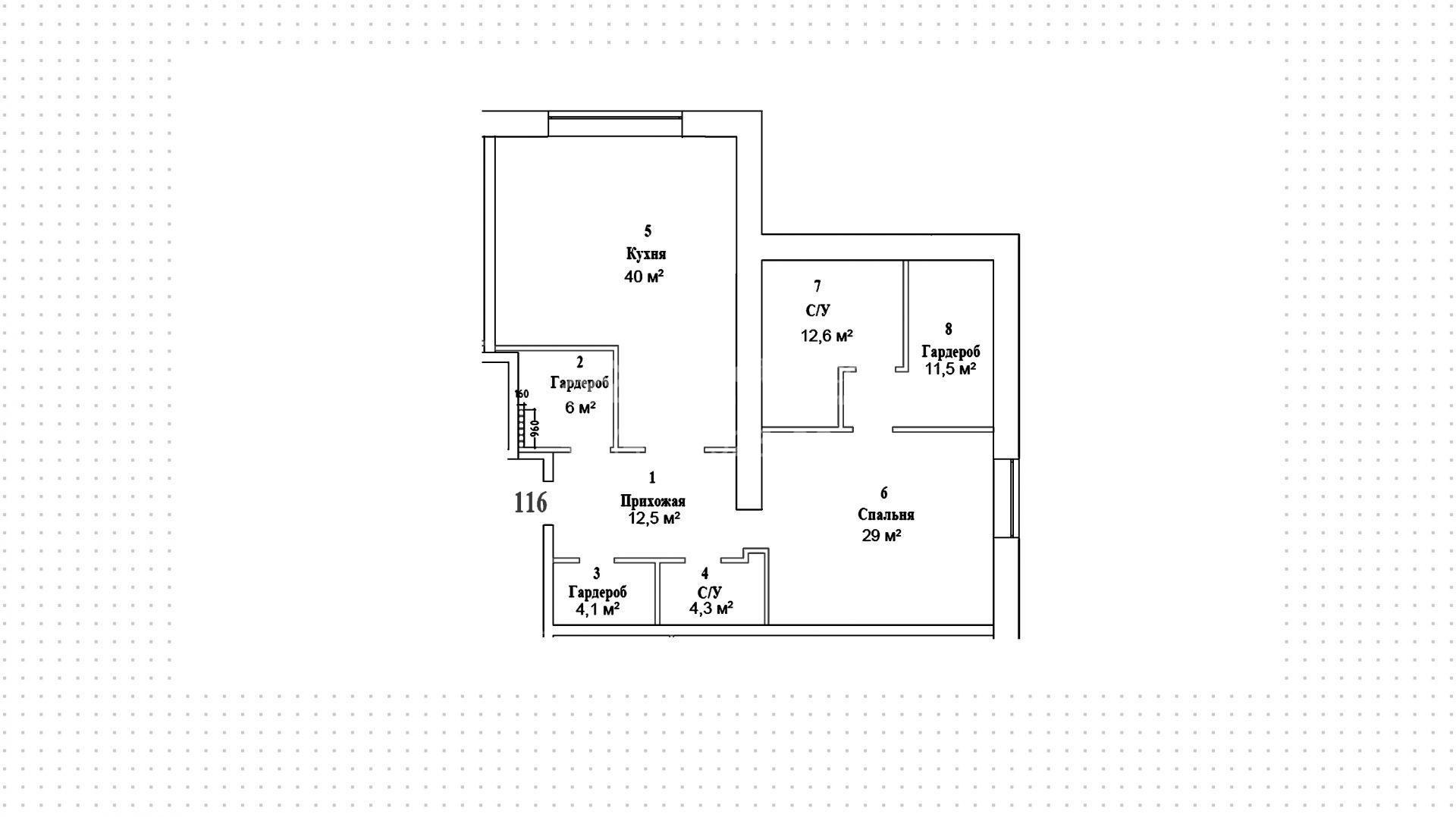 Солнечная видовая квартира на пятом этаже, общей площадью 117 м². В квартире предусмотрена спальня с личной ванной комнатой и гардеробной, просторная кухня, гостевой санузел и гардеробная. Квартира предлагается без отделки.