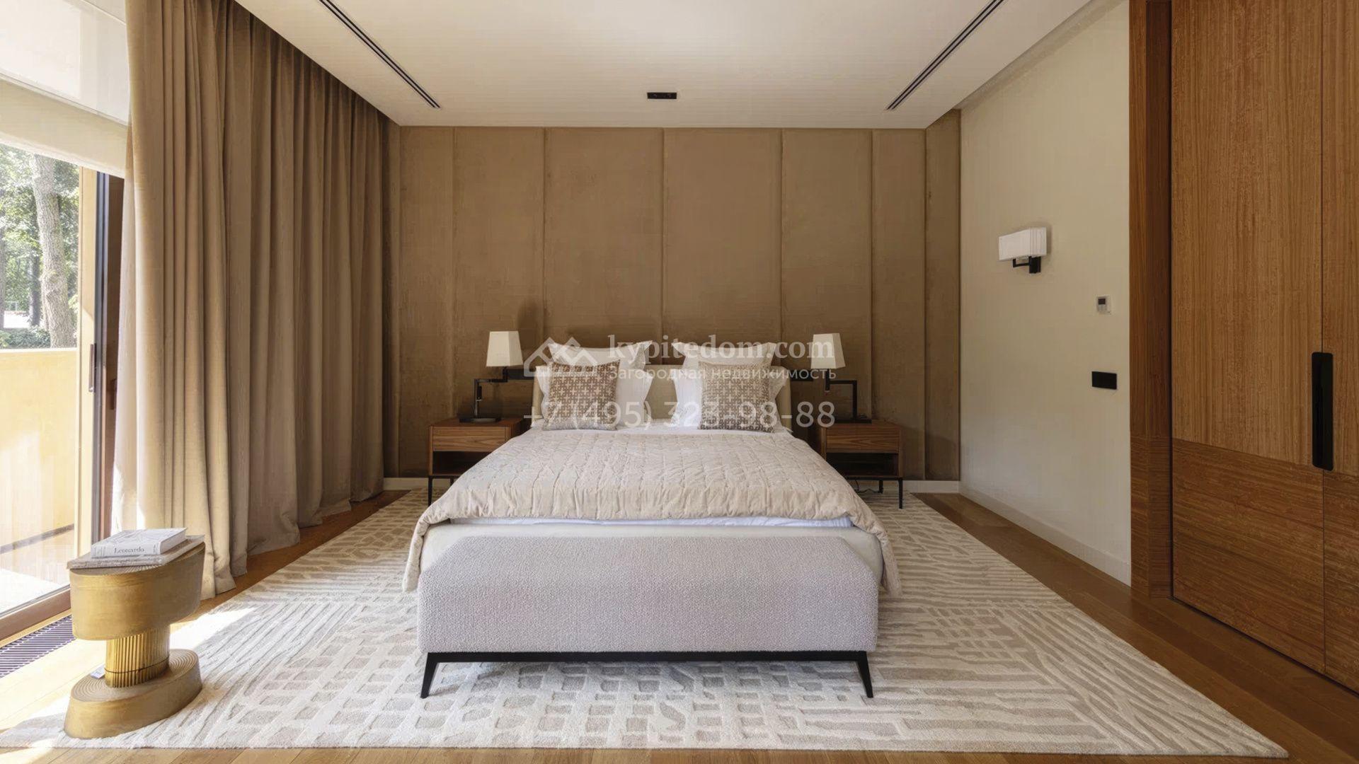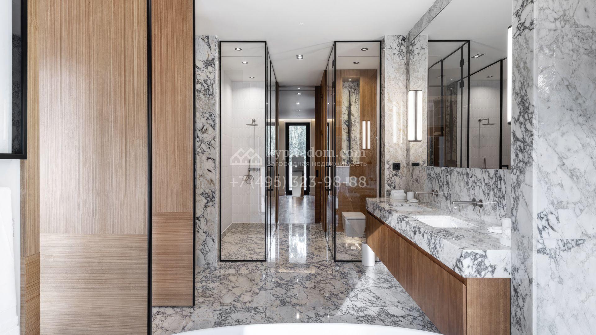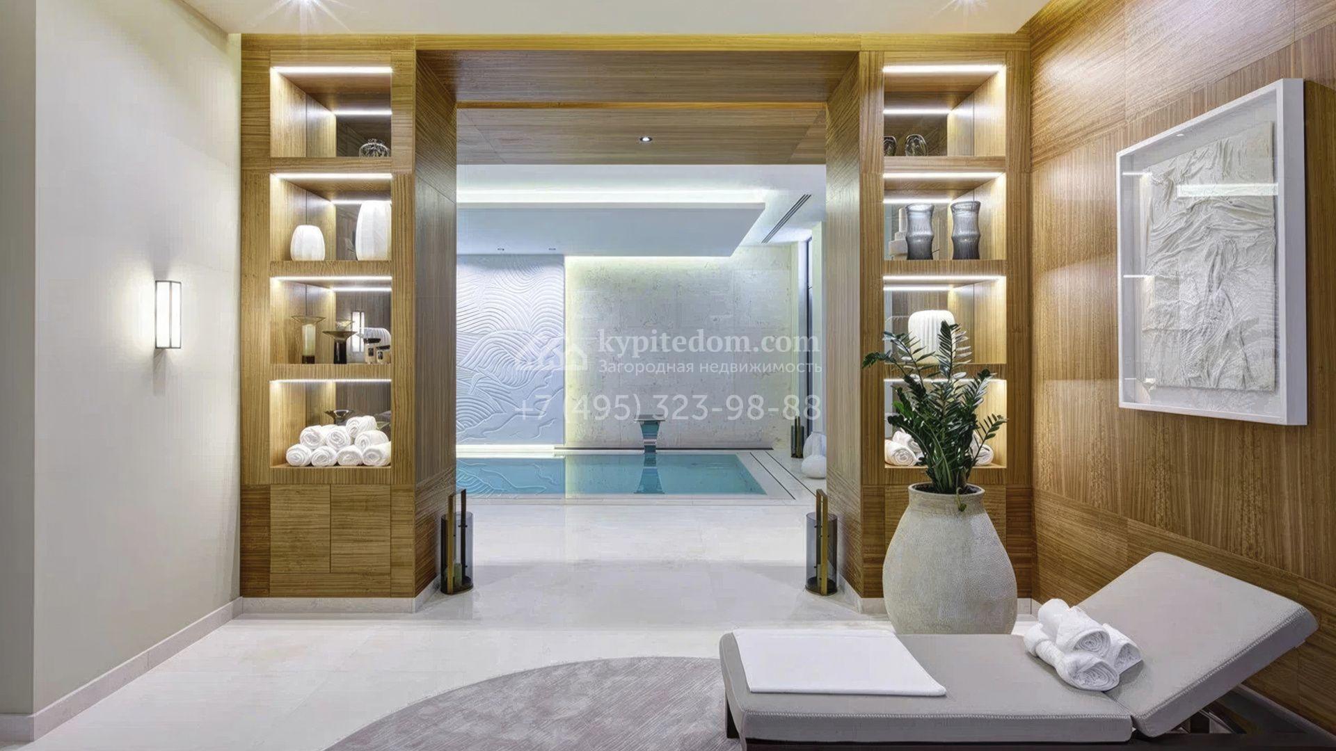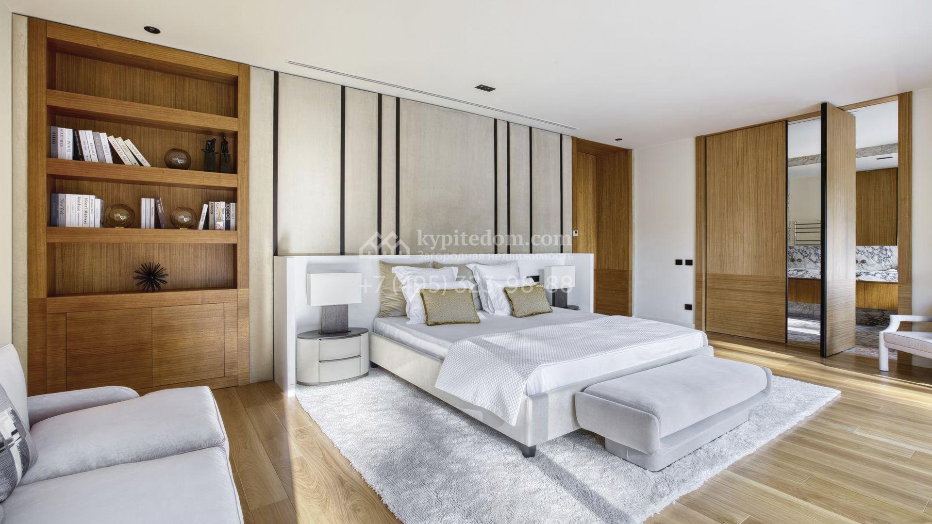 На втором и третьем — 5 спален, включая мастер-спальню с двумя гардеробными и выходом на террасу. Цокольный этаж превращён в роскошную спа-зону с сауной, хаммамом и переливным бассейном длиной 11 метров. Дополняют инфраструктуру четырёхместный гараж и квартира для персонала. Благоустроенная территория с аккуратным газоном, кустарниками, мощёными дорожками и мягким освещением создаёт завершённый образ идеального пространства для жизни.