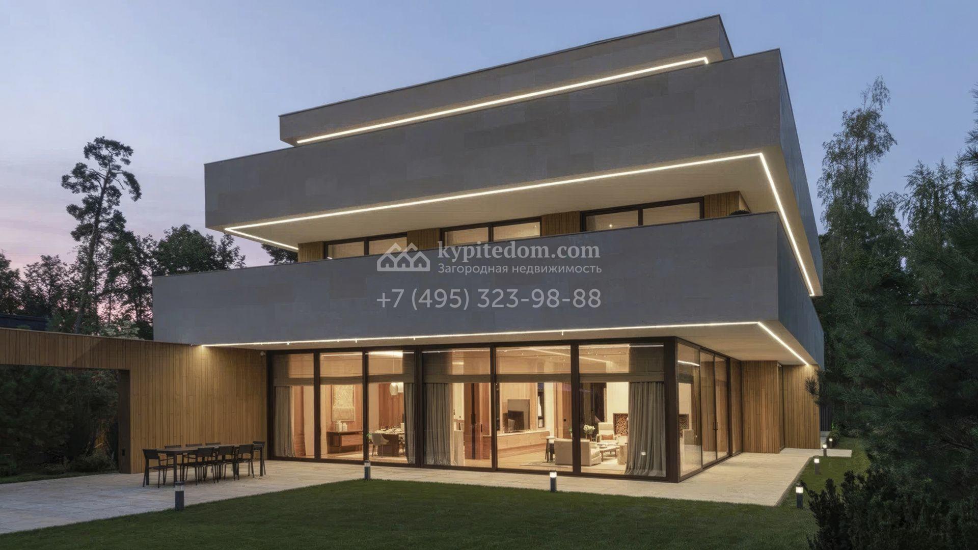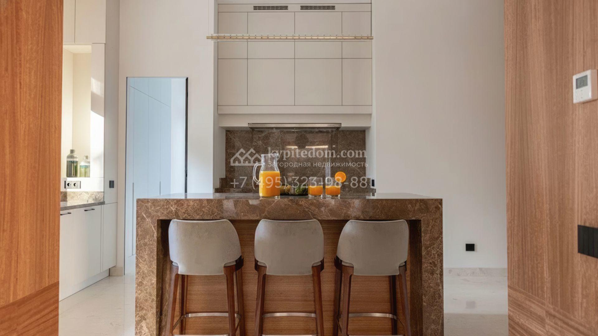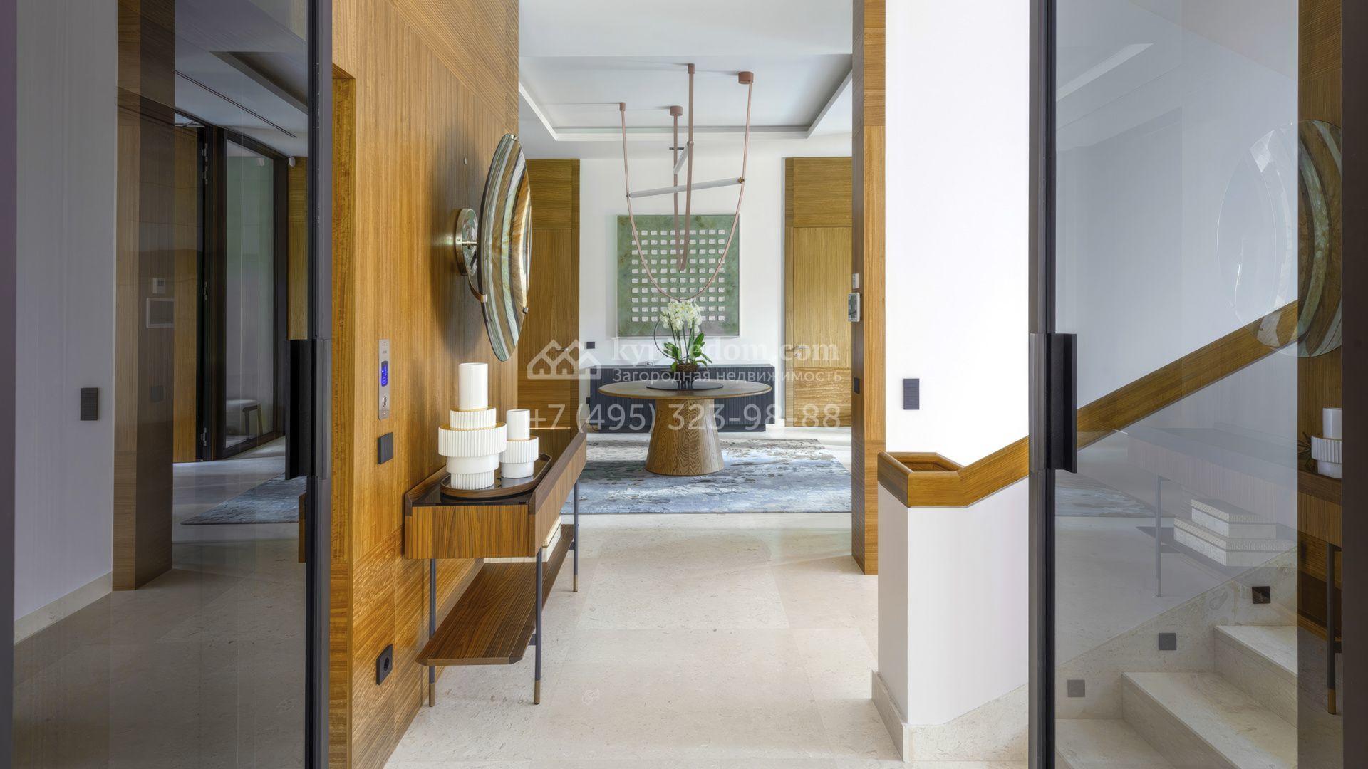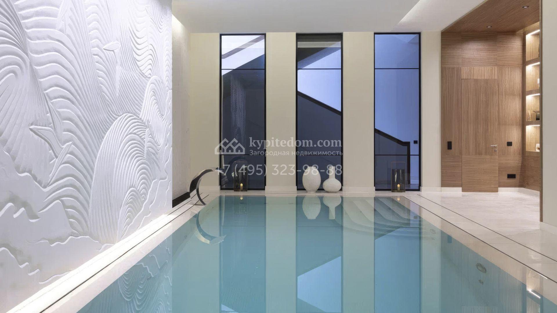 На втором и третьем — 5 спален, включая мастер-спальню с двумя гардеробными и выходом на террасу. Цокольный этаж превращён в роскошную спа-зону с сауной, хаммамом и переливным бассейном длиной 11 метров. Дополняют инфраструктуру четырёхместный гараж и квартира для персонала. Благоустроенная территория с аккуратным газоном, кустарниками, мощёными дорожками и мягким освещением создаёт завершённый образ идеального пространства для жизни.
