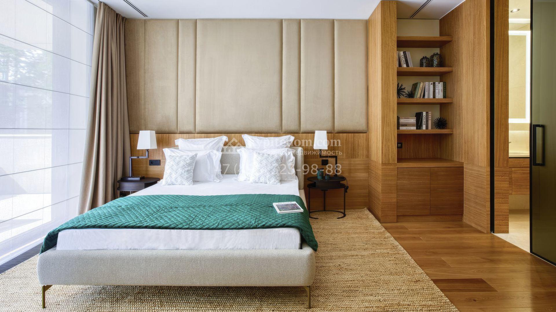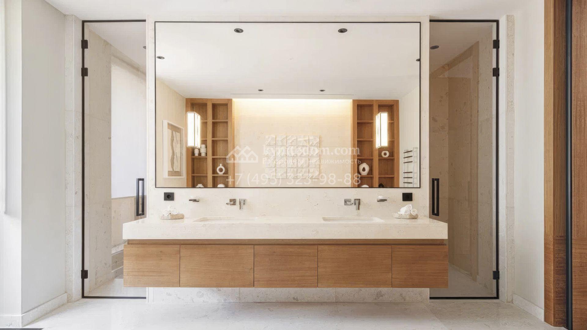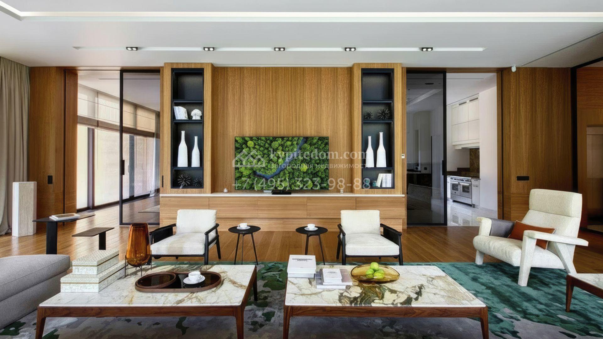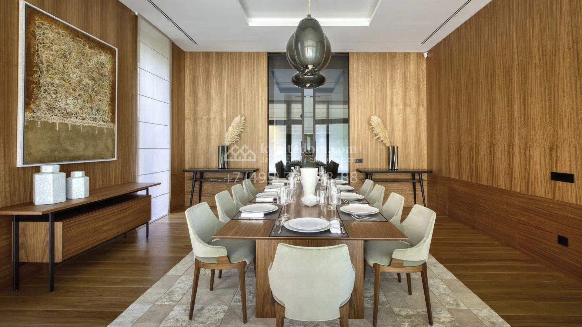 На втором и третьем — 5 спален, включая мастер-спальню с двумя гардеробными и выходом на террасу. Цокольный этаж превращён в роскошную спа-зону с сауной, хаммамом и переливным бассейном длиной 11 метров. Дополняют инфраструктуру четырёхместный гараж и квартира для персонала. Благоустроенная территория с аккуратным газоном, кустарниками, мощёными дорожками и мягким освещением создаёт завершённый образ идеального пространства для жизни.