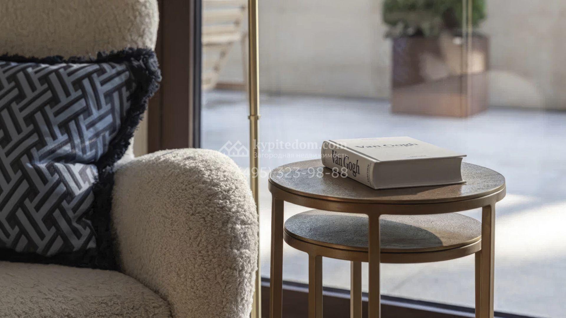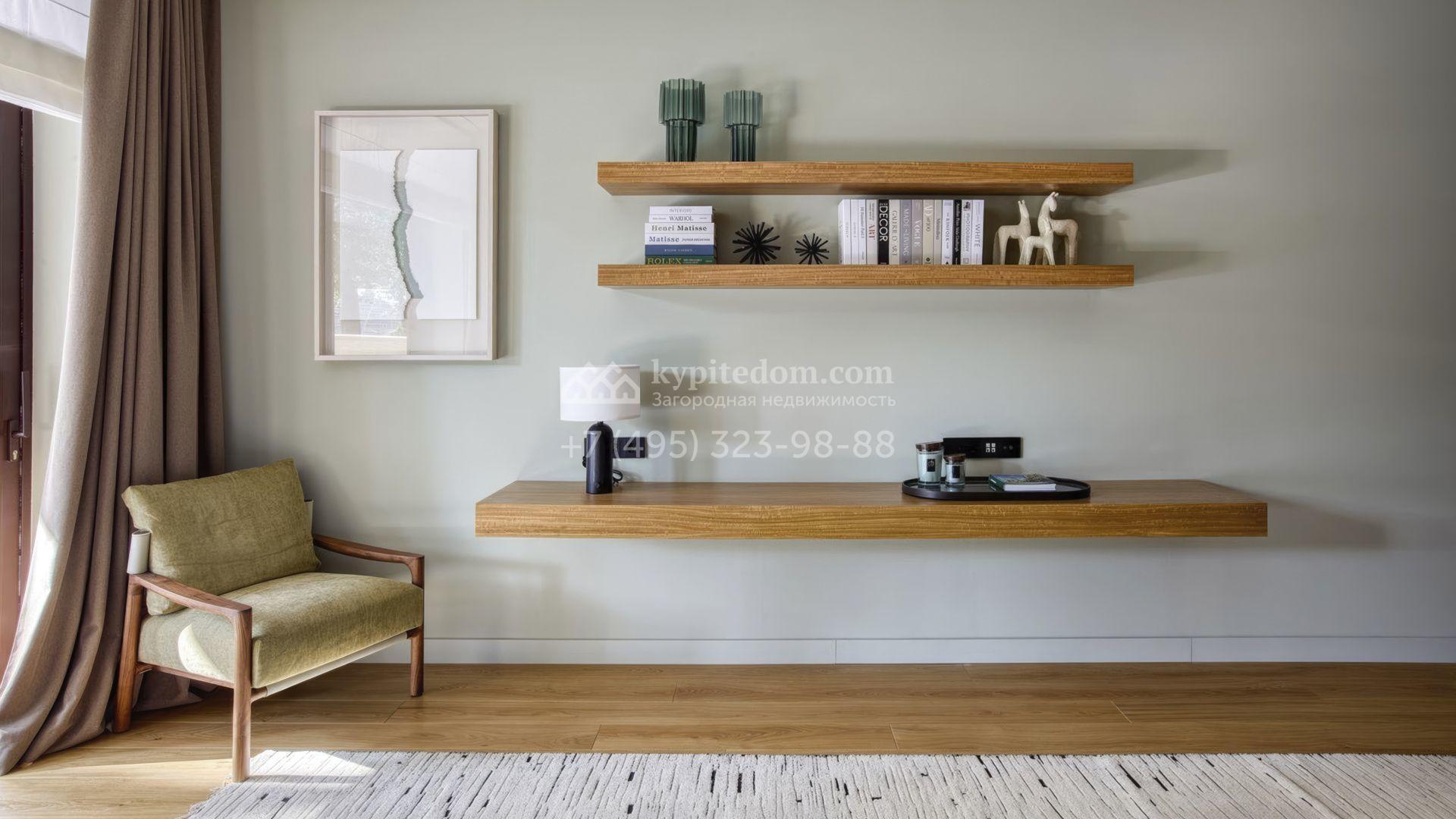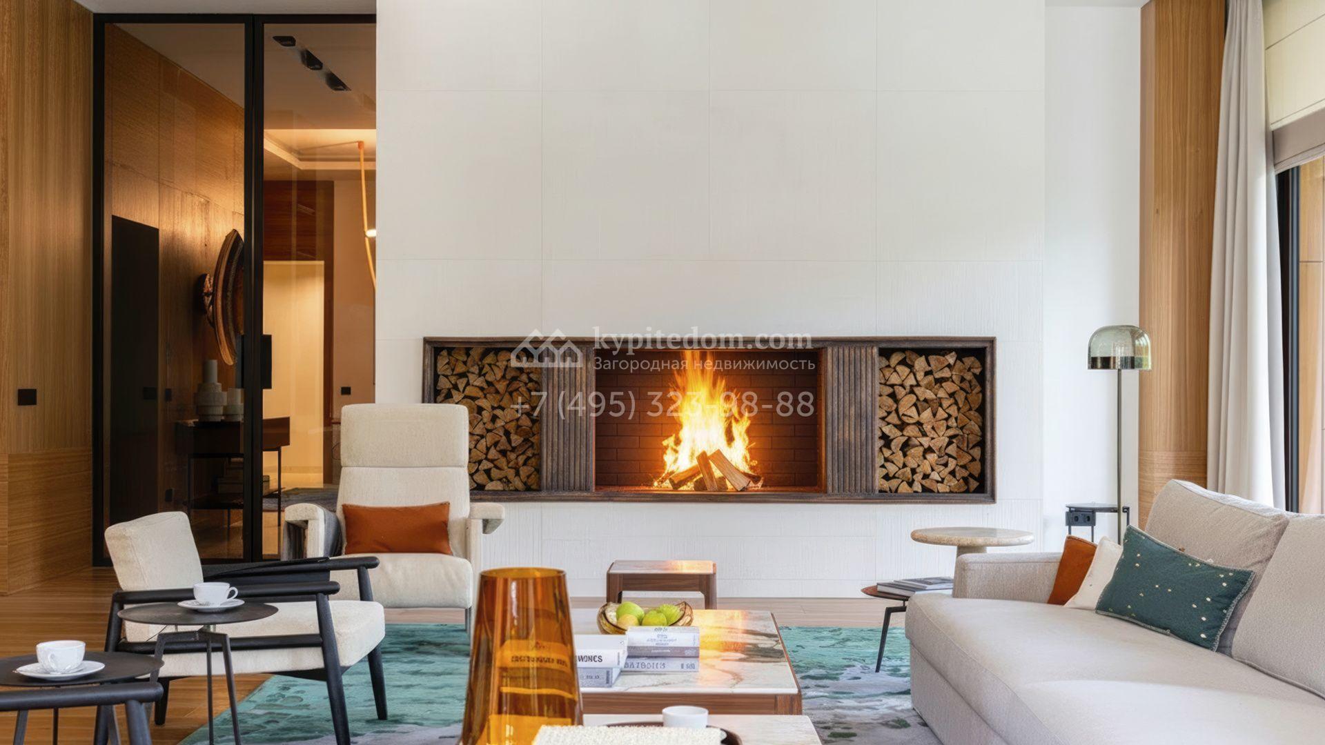 Войдя в особняк, вы оказываетесь в элегантном холле с акцентными настенными панелями из эвкалипта и итальянскими светильниками Flos. Сердцем резиденции стала просторная гостиная с камином работы скульптора Александра Чичкина и индийским ковром ручной работы. На первом уровне также разместили кухню с мраморным островом «Эмперадор Дарк» (Emperador Dark) и техникой Bertazzoni, столовую и лаконичный кабинет.