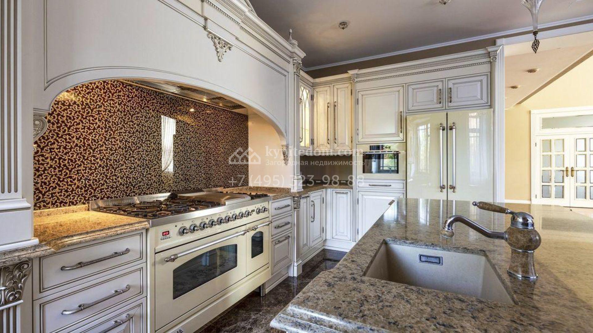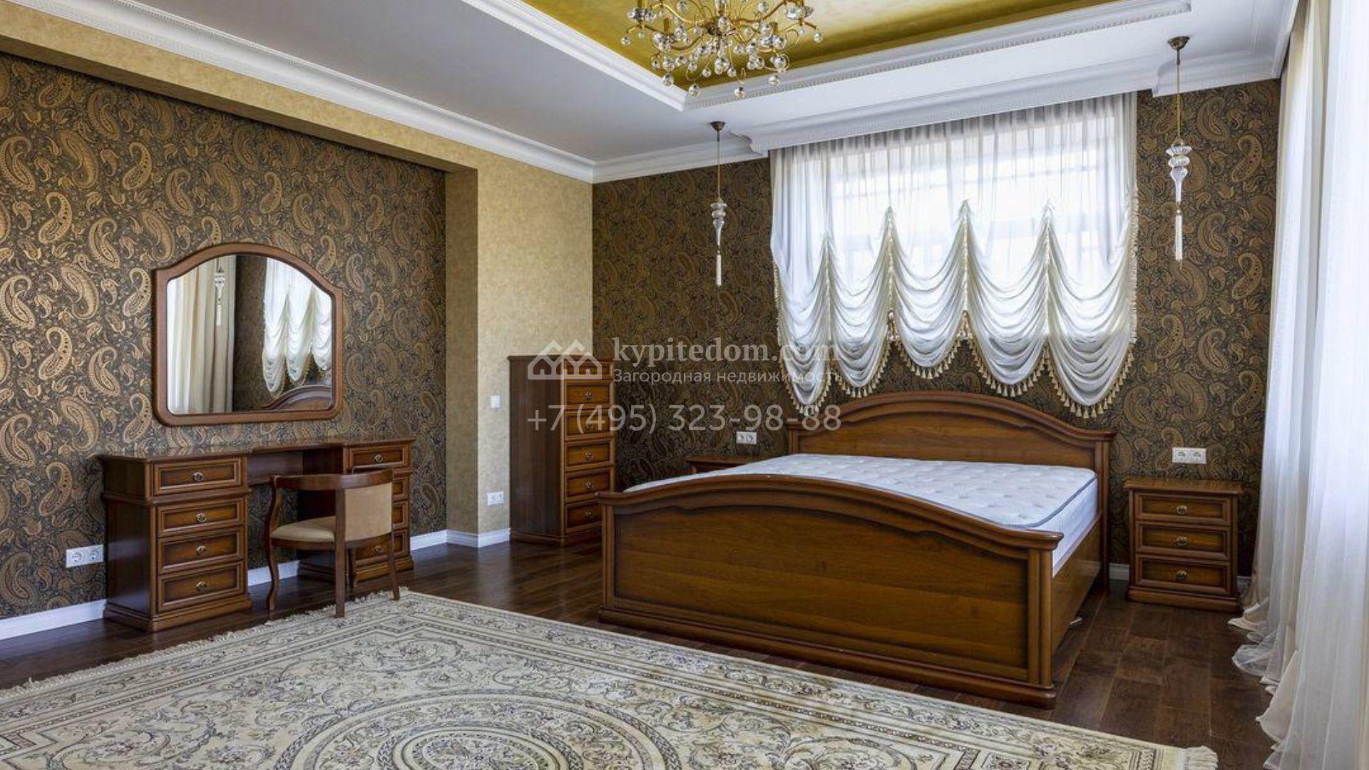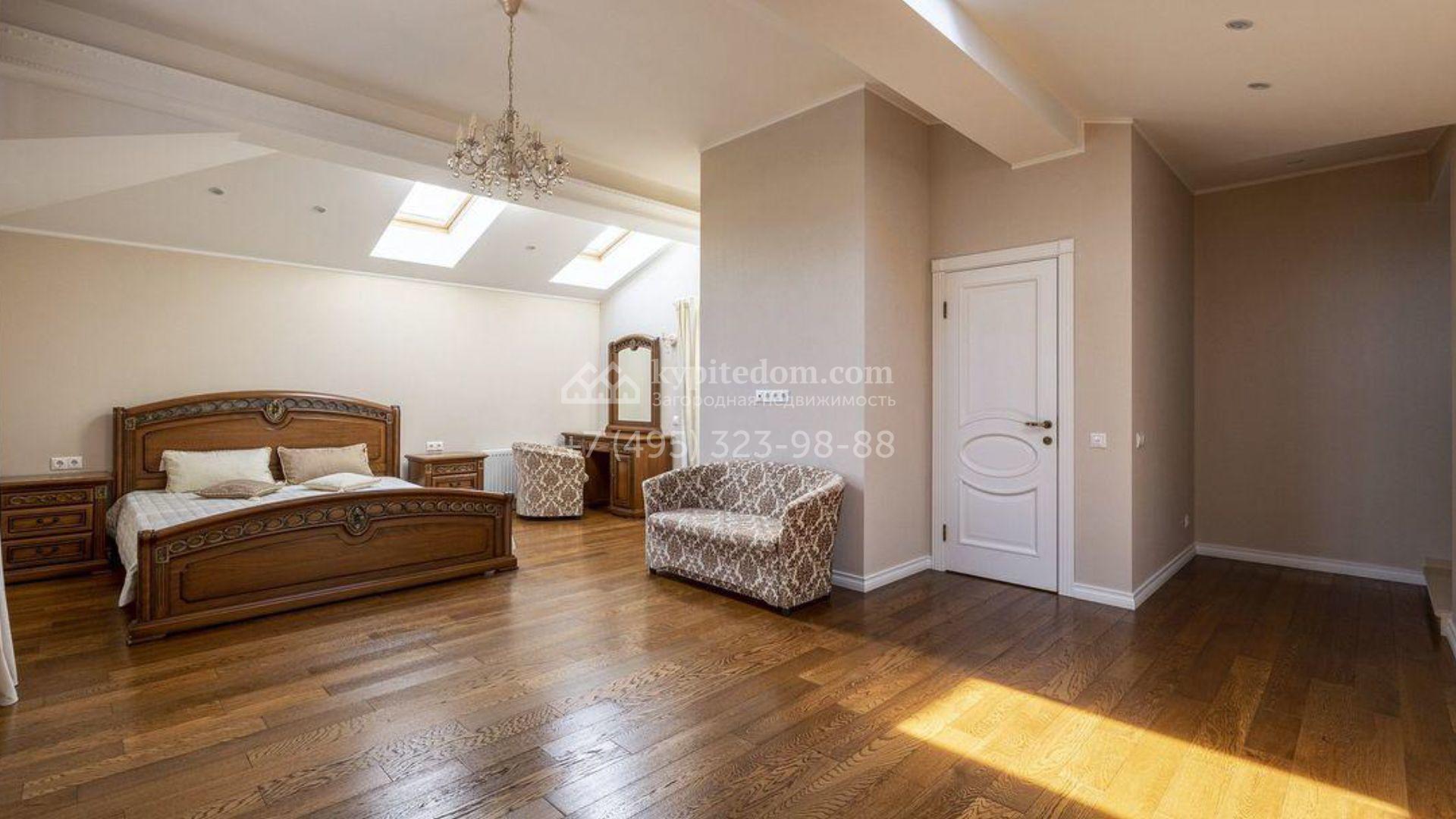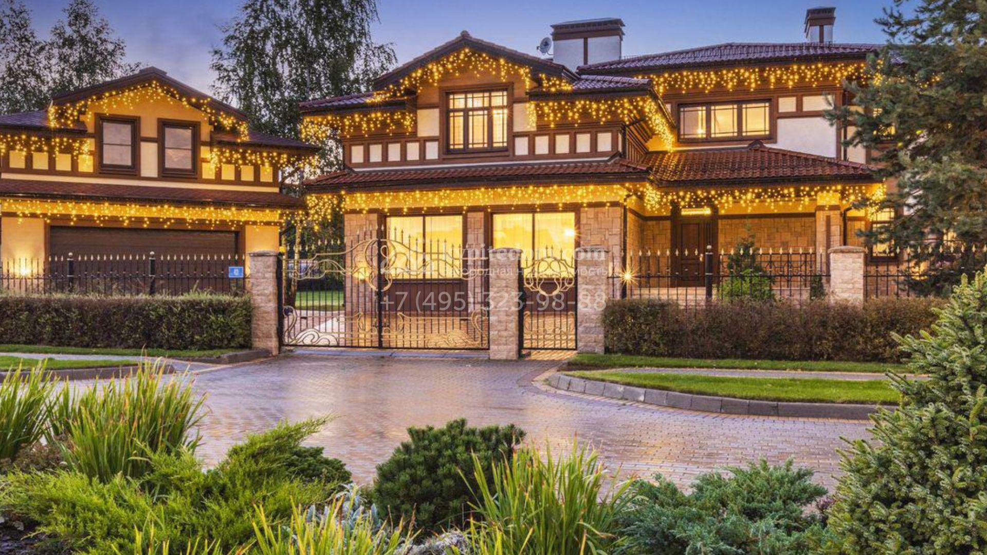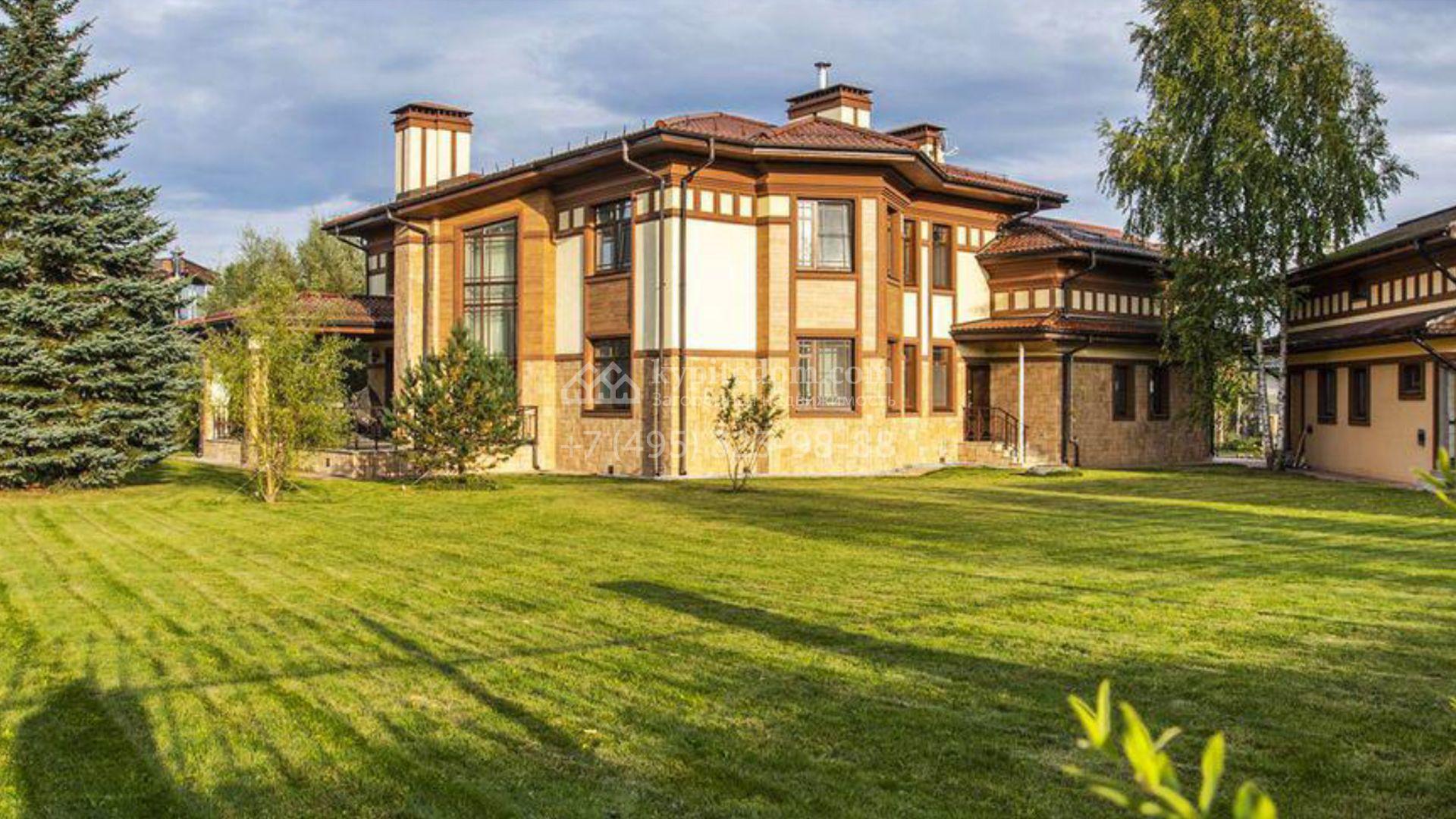 Загородный дом площадью 500 м² расположен на полевом участке 23 сотки. Фасад облицован бежевым камнем, штукатуркой и декорирован балками. В отделке интерьера использованы теплые оттенки, фактура дерева и камня и орнаменты. Планировка резиденции включает 5 спален, просторную гостиную с камином и вторым светом, кухню-столовую с выходом на террасу, кабинет и спортзал. Рядом с домом построен гараж 150 м² на 2 машины, на втором этаже которого находится квартира для персонала с 2-мя спальнями. На участке выполнен ландшафтный дизайн, засеян газон и высажены деревья.