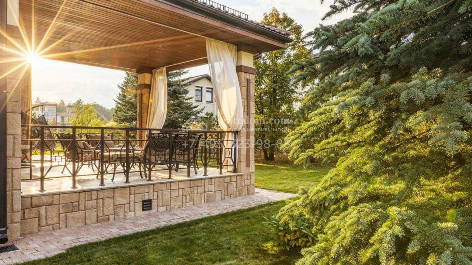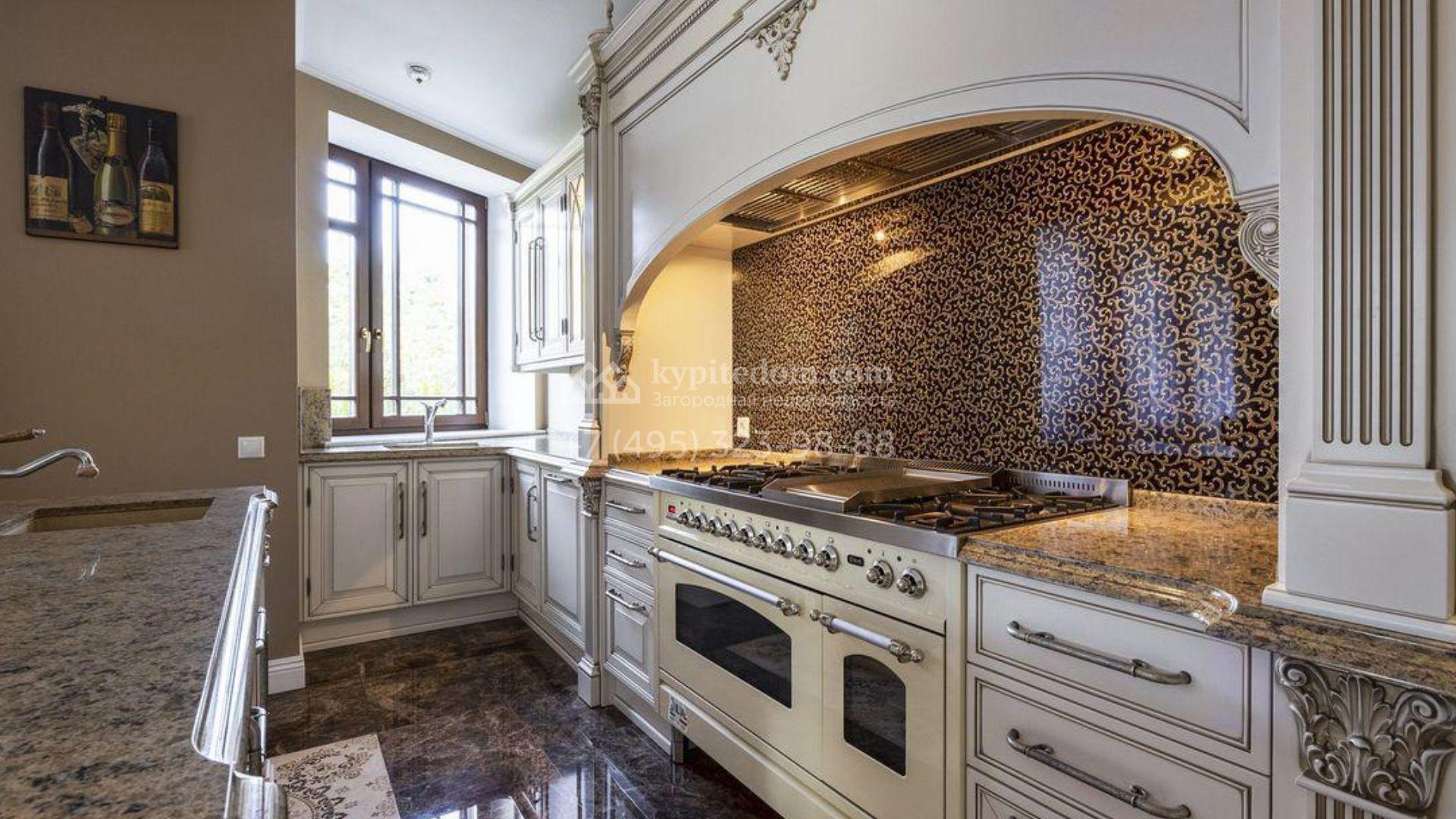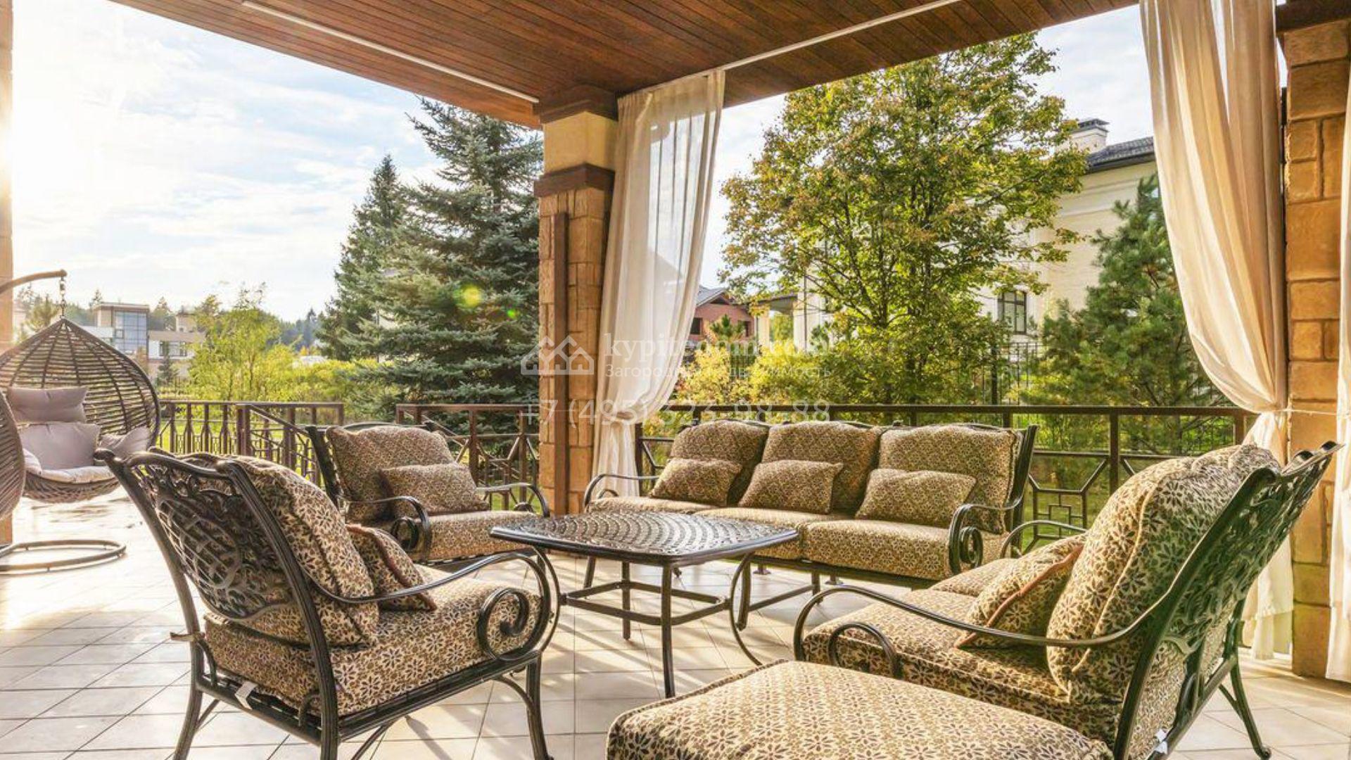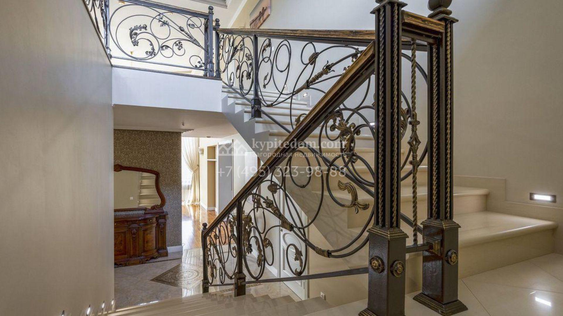 Загородный дом площадью 500 м² расположен на полевом участке 23 сотки. Фасад облицован бежевым камнем, штукатуркой и декорирован балками. В отделке интерьера использованы теплые оттенки, фактура дерева и камня и орнаменты. Планировка резиденции включает 5 спален, просторную гостиную с камином и вторым светом, кухню-столовую с выходом на террасу, кабинет и спортзал. Рядом с домом построен гараж 150 м² на 2 машины, на втором этаже которого находится квартира для персонала с 2-мя спальнями. На участке выполнен ландшафтный дизайн, засеян газон и высажены деревья.