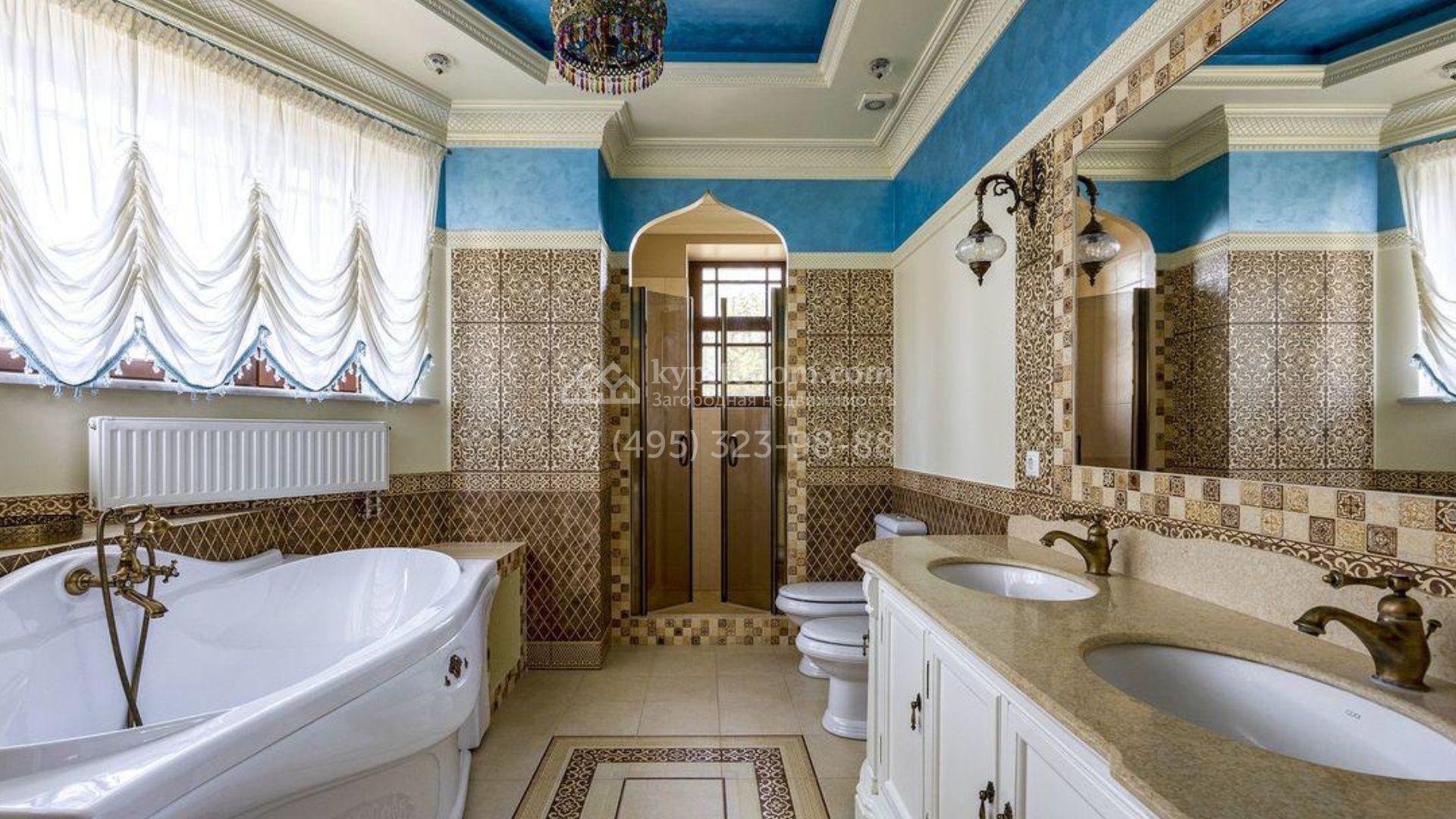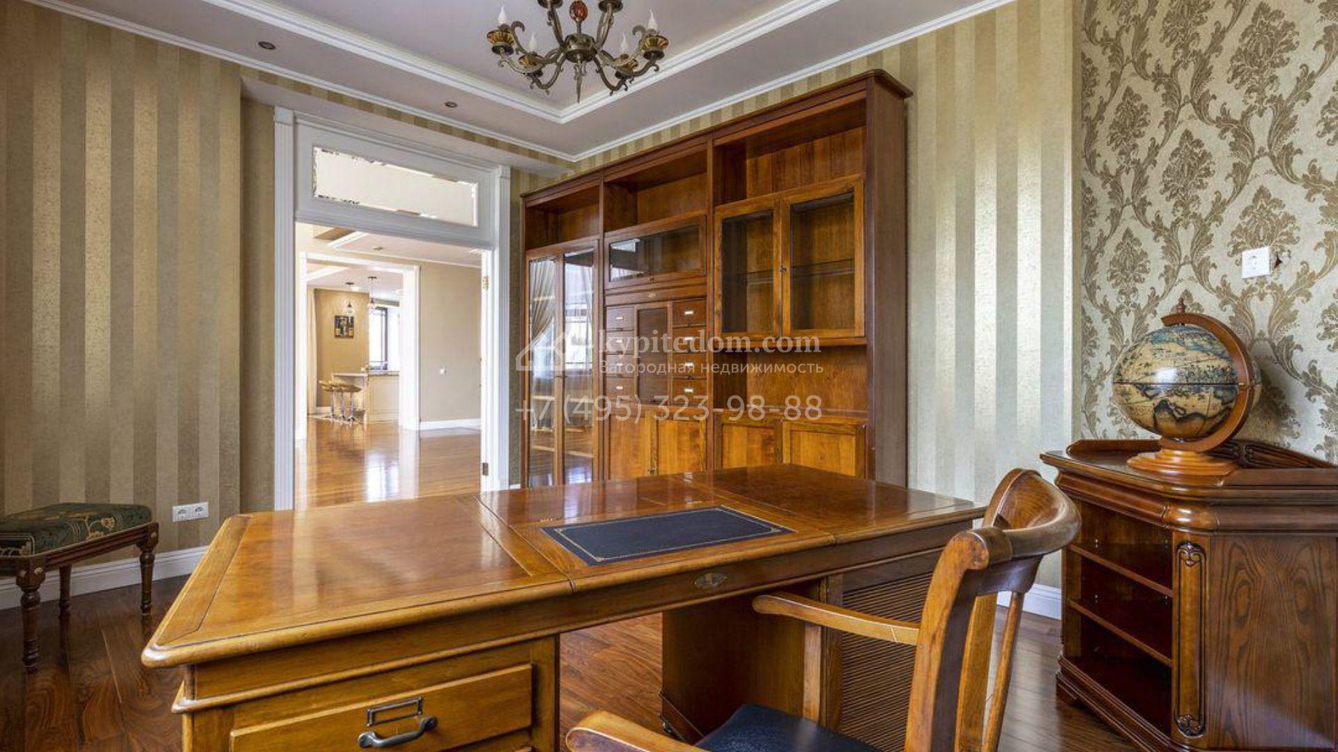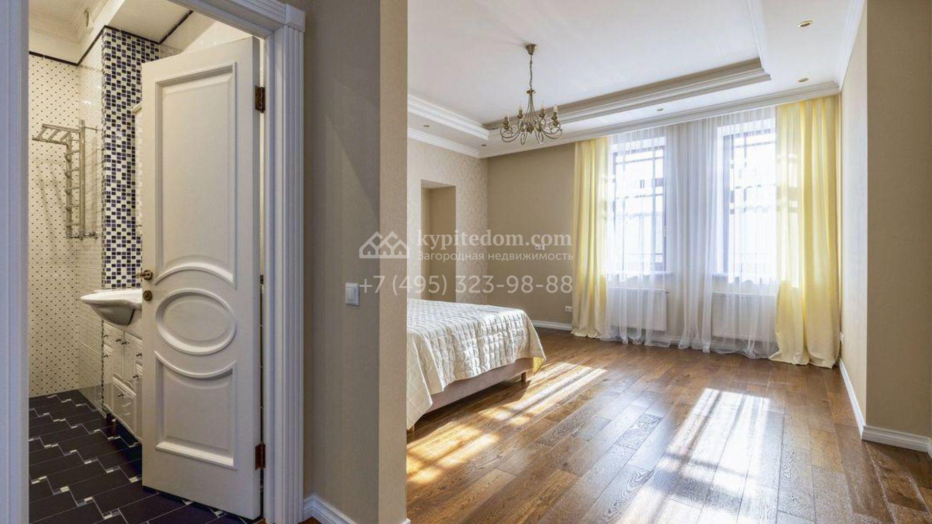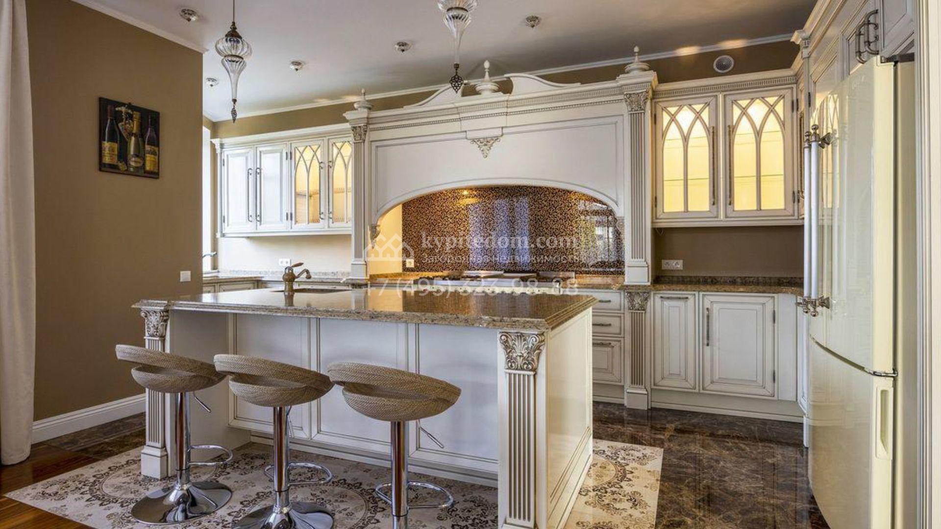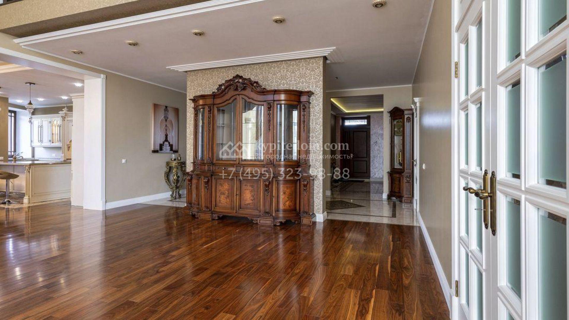 Загородный дом площадью 500 м² расположен на полевом участке 23 сотки. Фасад облицован бежевым камнем, штукатуркой и декорирован балками. В отделке интерьера использованы теплые оттенки, фактура дерева и камня и орнаменты. Планировка резиденции включает 5 спален, просторную гостиную с камином и вторым светом, кухню-столовую с выходом на террасу, кабинет и спортзал. Рядом с домом построен гараж 150 м² на 2 машины, на втором этаже которого находится квартира для персонала с 2-мя спальнями. На участке выполнен ландшафтный дизайн, засеян газон и высажены деревья.