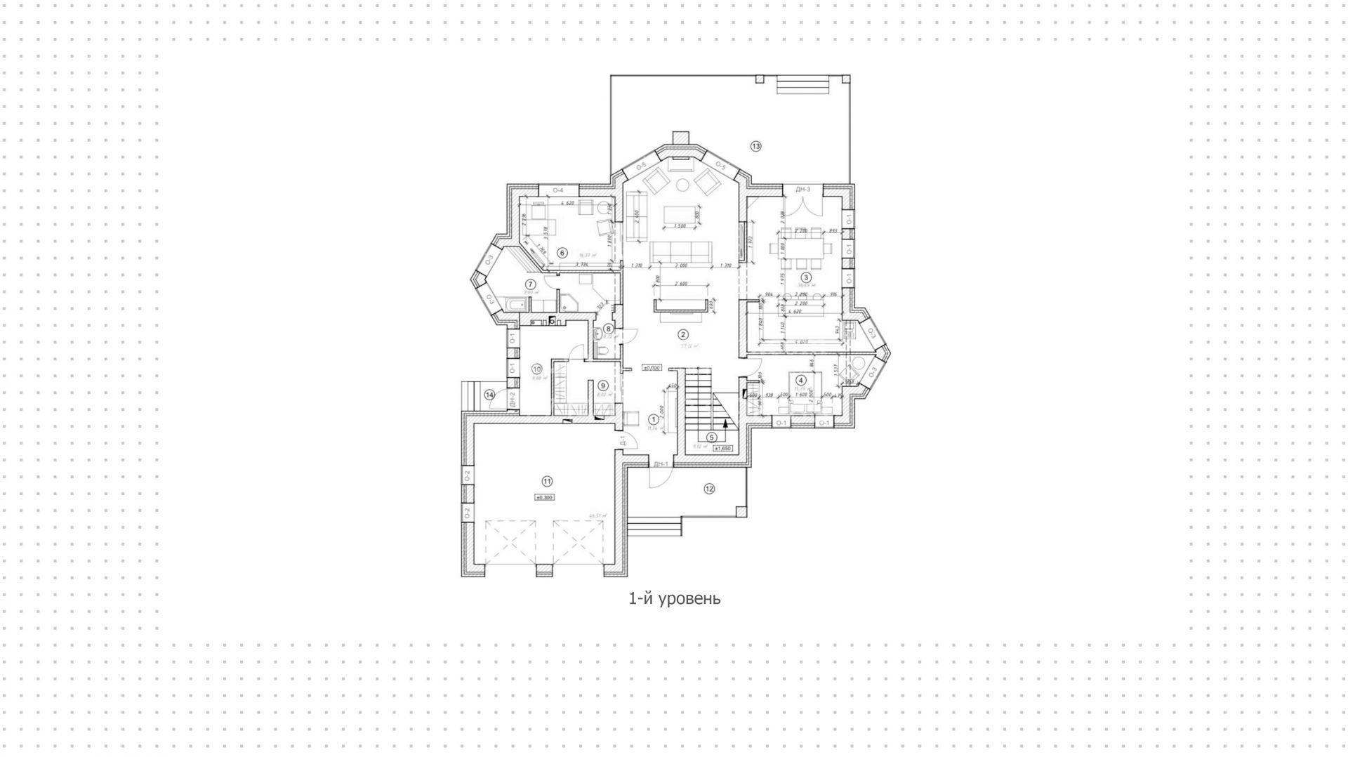 1-й уровень: холл, гостиная, кухня-столовая, терраса, кабинет, гостевая спальня, спортзал/игровая, санузел с местом под сауну, прачечная, бойлерная.