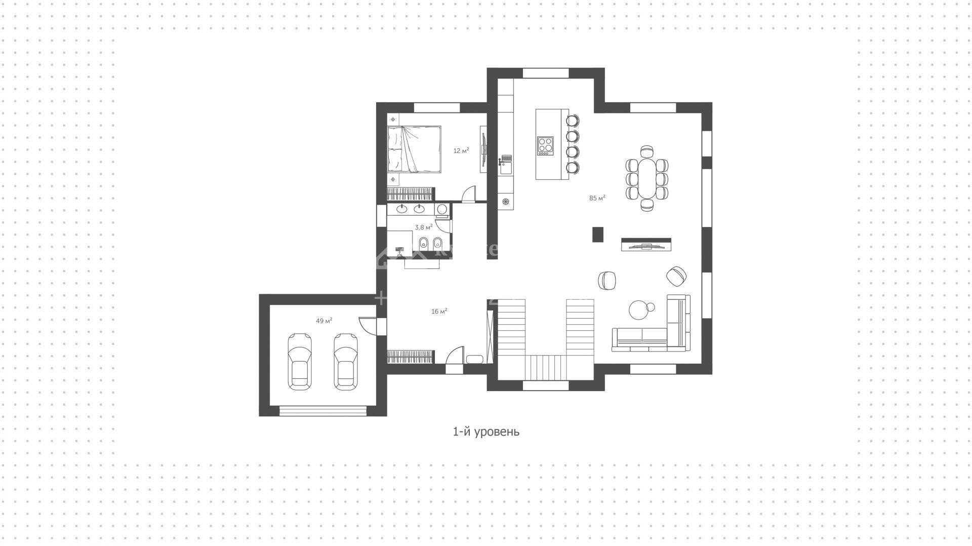 Планировка включает четыре спальни, кабинет и объединённую зону гостиной и кухни-столовой, где можно собираться на семейные завтраки, готовить вместе ужин или проводить спокойные вечера у панорамных окон. В контуре дома предусмотрен гараж на два автомобиля, а на участке возведена баня — место для отдыха после насыщенного дня.