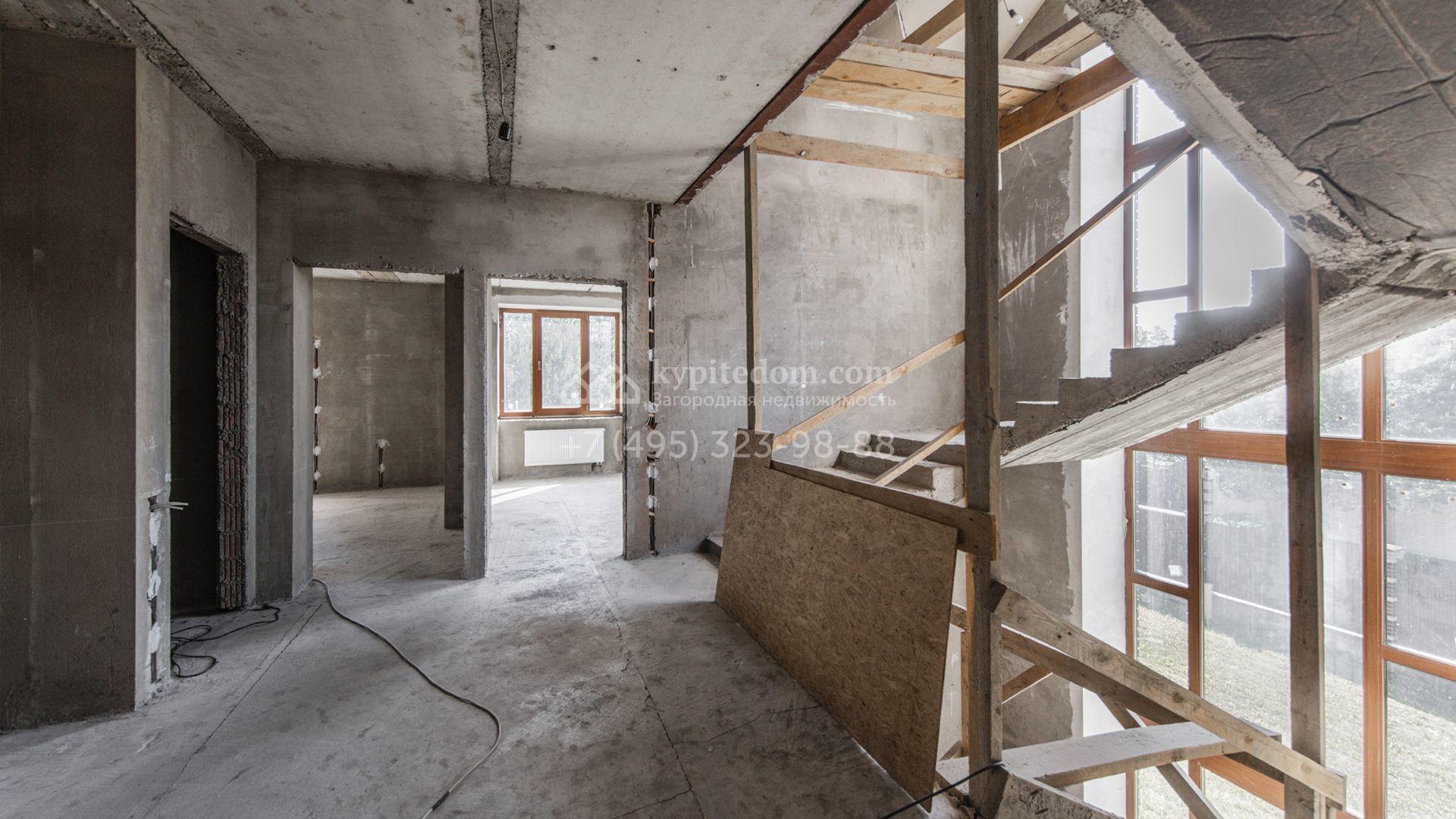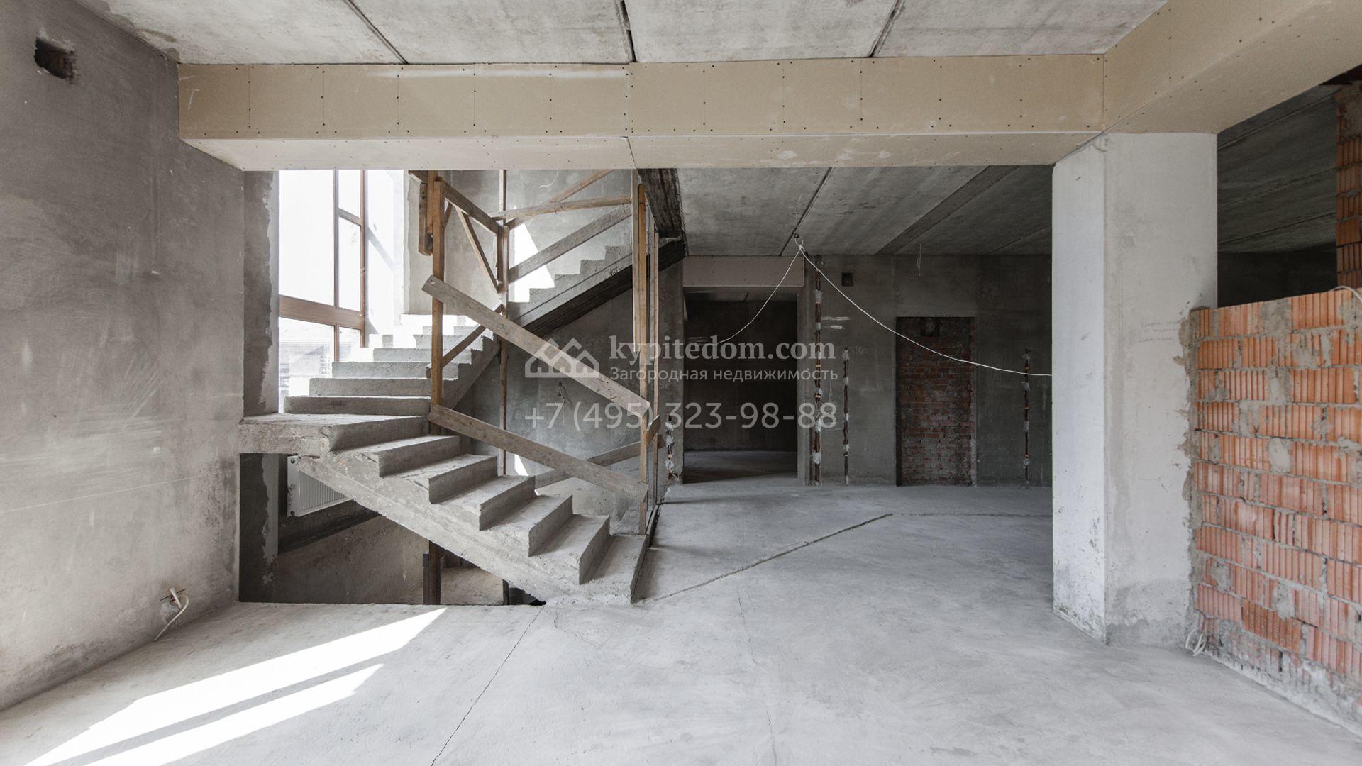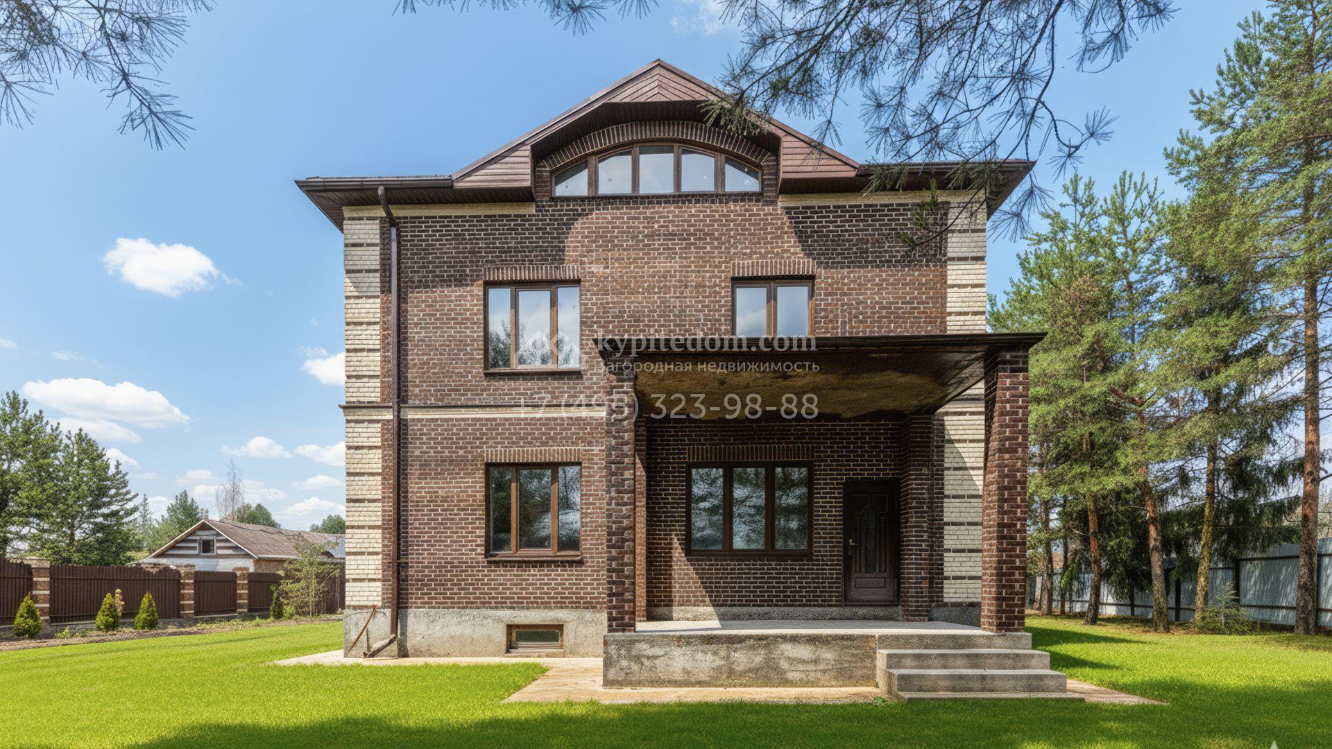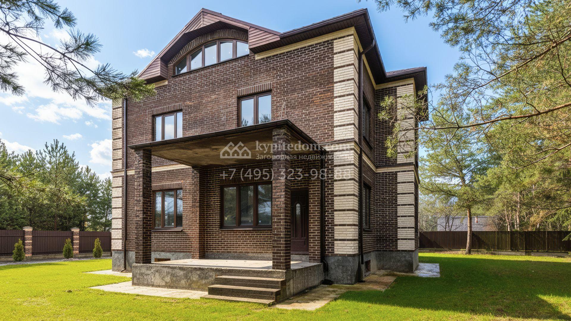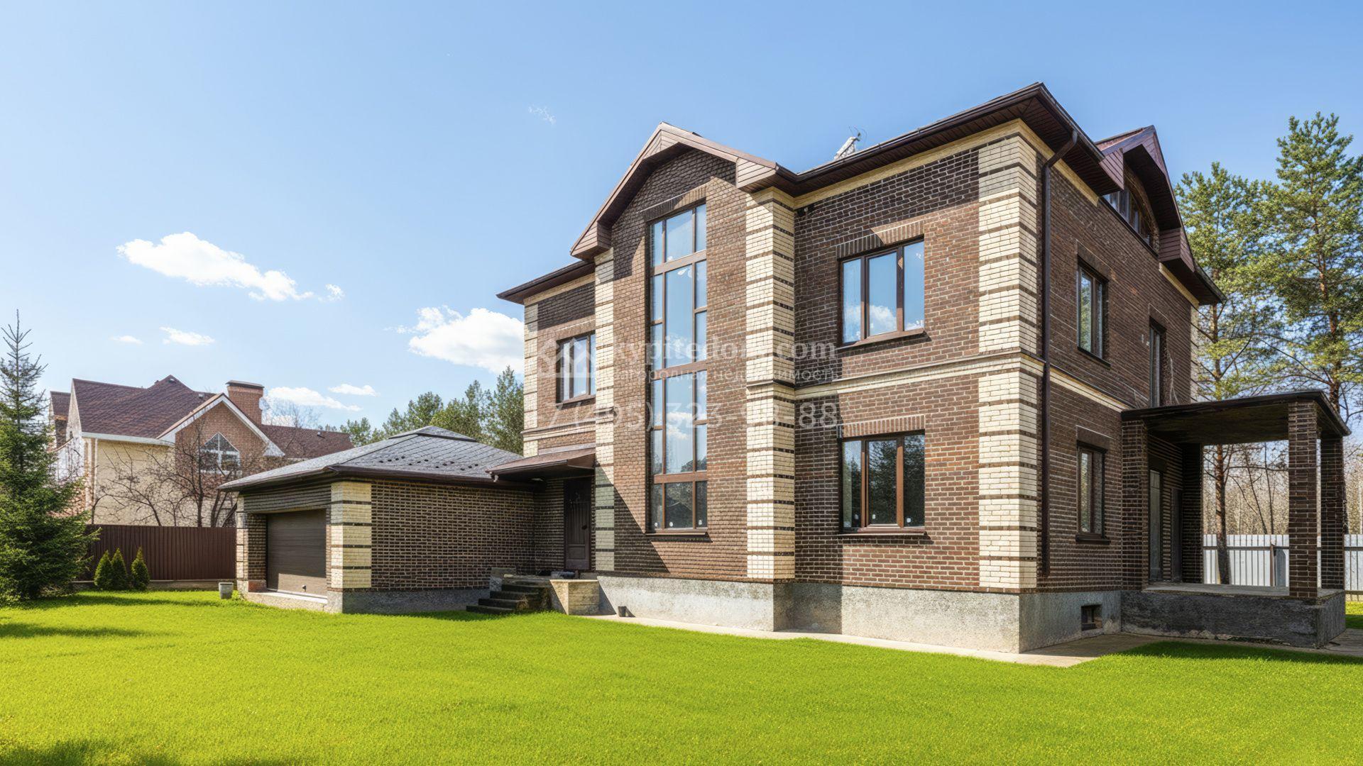 Коттедж площадью 500 м² расположен на участке 16,5 соток, окружённом взрослыми хвойными деревьями. Фасад облицован молочным и тёмно-коричневым клинкерным кирпичом, а центральный ризалит с высоким вертикальным остеклением создает объём и визуально вытягивает силуэт здания. Внутри выполнена предчистовая отделка white box, позволяющая спроектировать индивидуальный интерьер и настроить пространство под собственный ритм жизни.