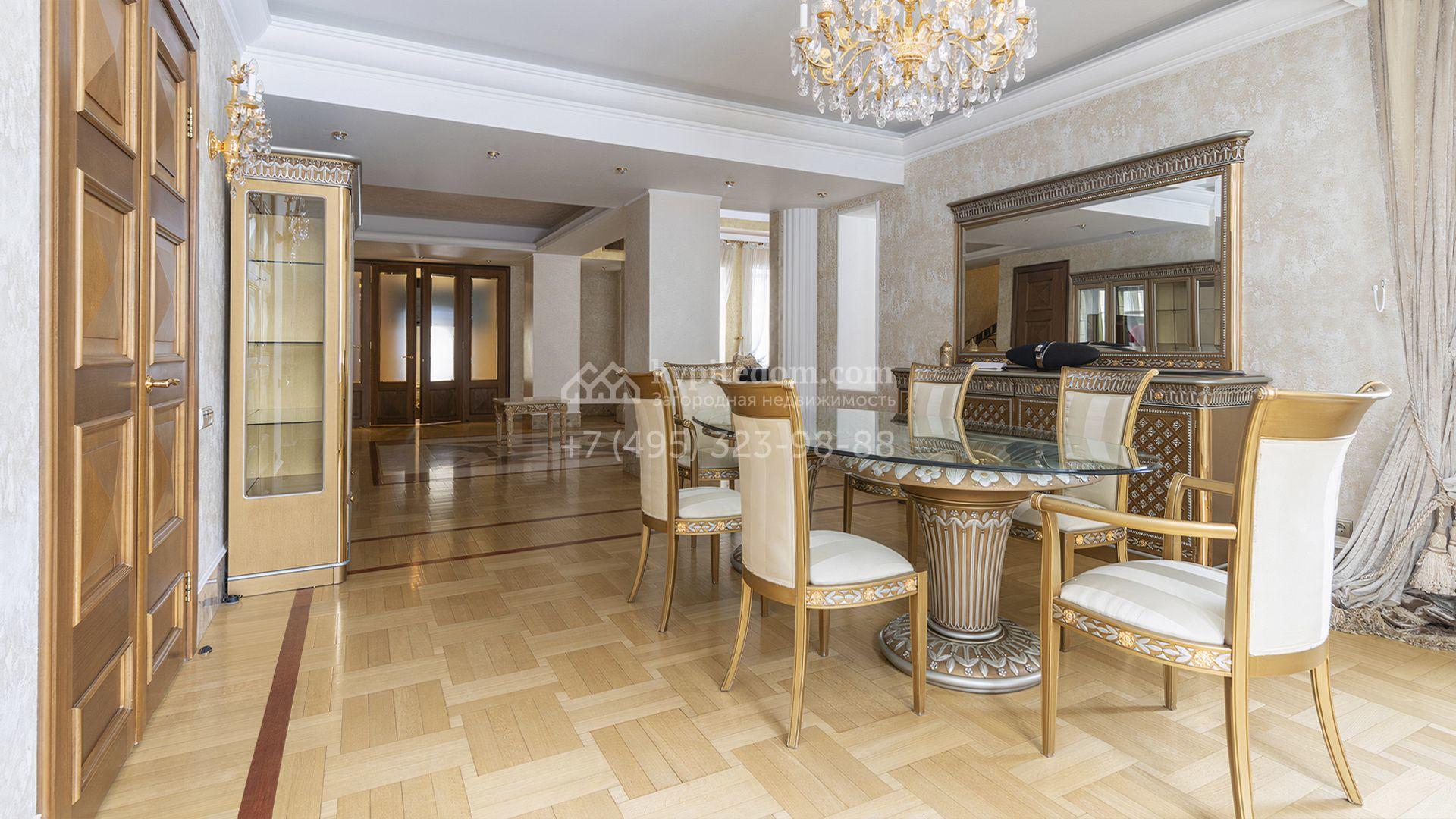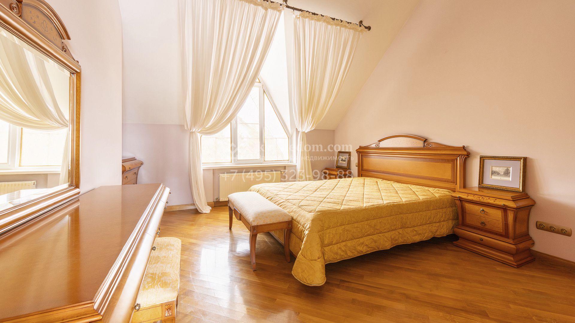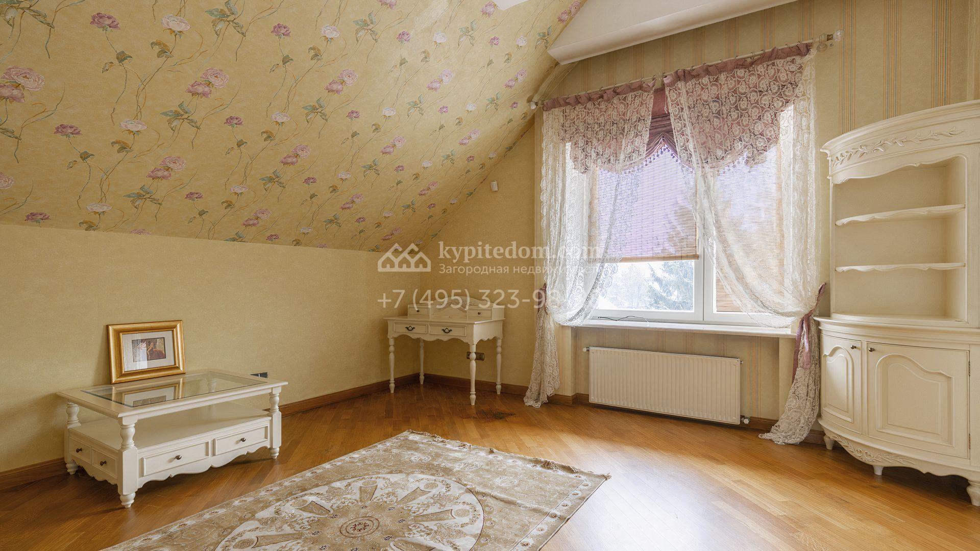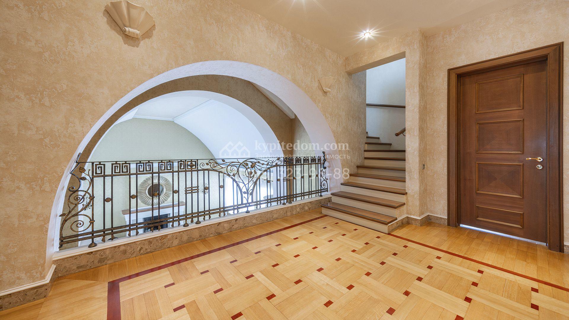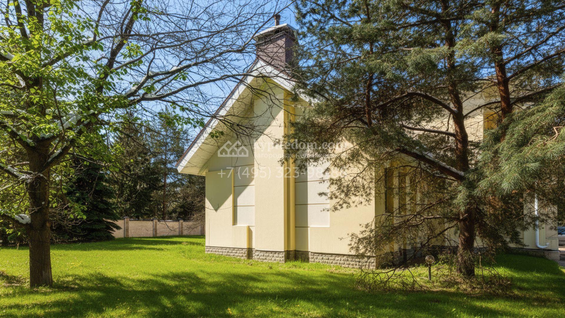 Загородный дом площадью 850 м² расположен на участке 25 соток. Фасад здания облицован желтоватой штукатуркой и декорирован рустовкой. В отделке интерьера с элементами классического стиля использованы теплые оттенки, орнаменты и фактура дерева. Планировка коттеджа включает 4 спальни, 3 ванные комнаты, гардеробные, столовую и большую гостиную с дровяным камином. На цокольном этаже расположены зона отдыха с сауной и небольшим бассейном и хозяйственная часть с комнатой для персонала. В контуре дома предусмотрен гараж на 2 машины и паркинг на улице ещё для 2 машин. На участке выполнен ландшафтный дизайн, обустроена зона барбекю и высажены хвойные деревья по периметру участка.