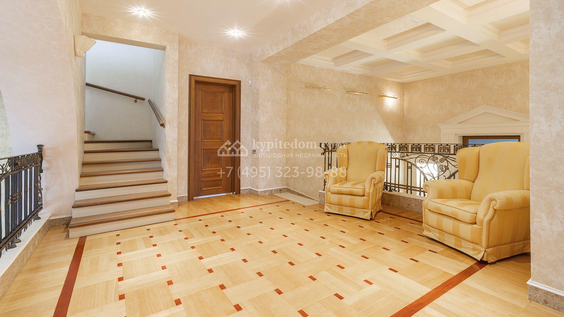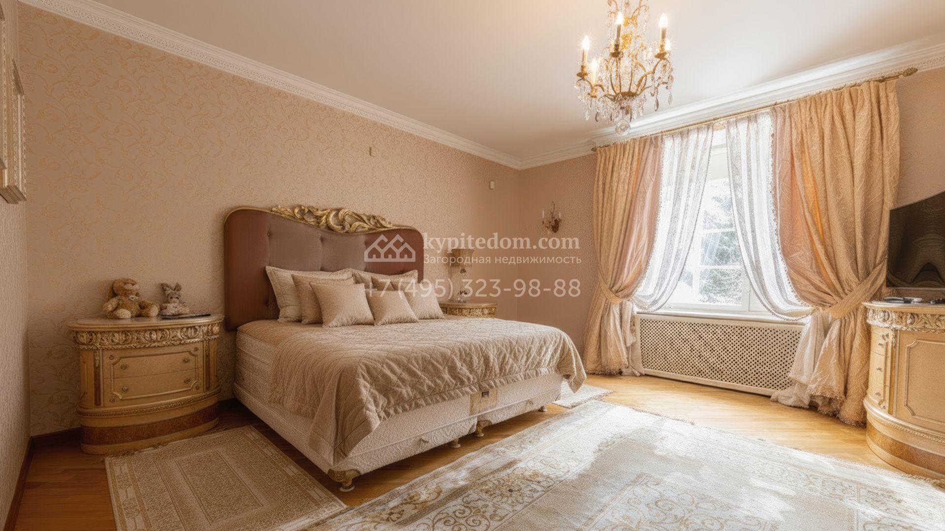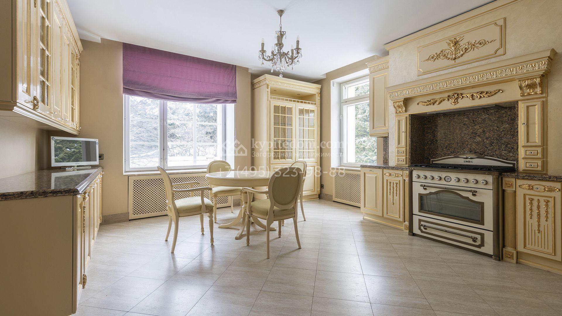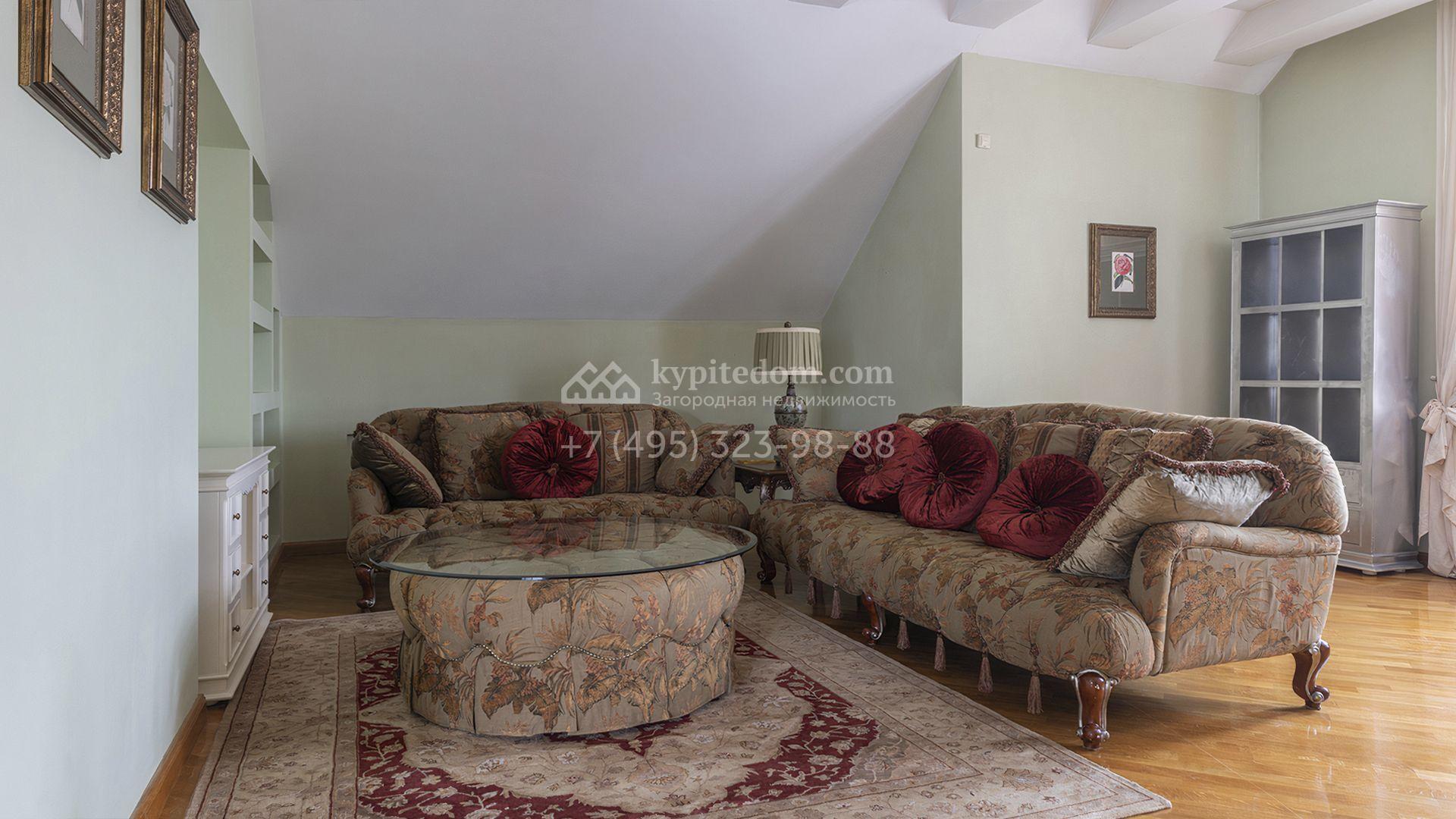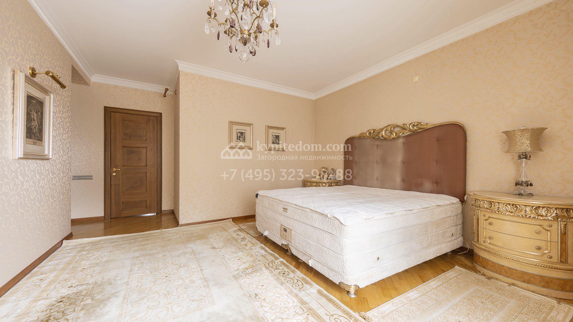Загородный дом площадью 850 м² расположен на участке 25 соток. Фасад здания облицован желтоватой штукатуркой и декорирован рустовкой. В отделке интерьера с элементами классического стиля использованы теплые оттенки, орнаменты и фактура дерева. Планировка коттеджа включает 4 спальни, 3 ванные комнаты, гардеробные, столовую и большую гостиную с дровяным камином. На цокольном этаже расположены зона отдыха с сауной и небольшим бассейном и хозяйственная часть с комнатой для персонала. В контуре дома предусмотрен гараж на 2 машины и паркинг на улице ещё для 2 машин. На участке выполнен ландшафтный дизайн, обустроена зона барбекю и высажены хвойные деревья по периметру участка.