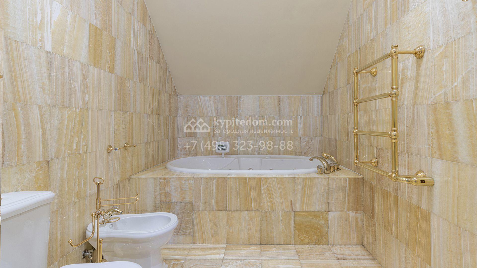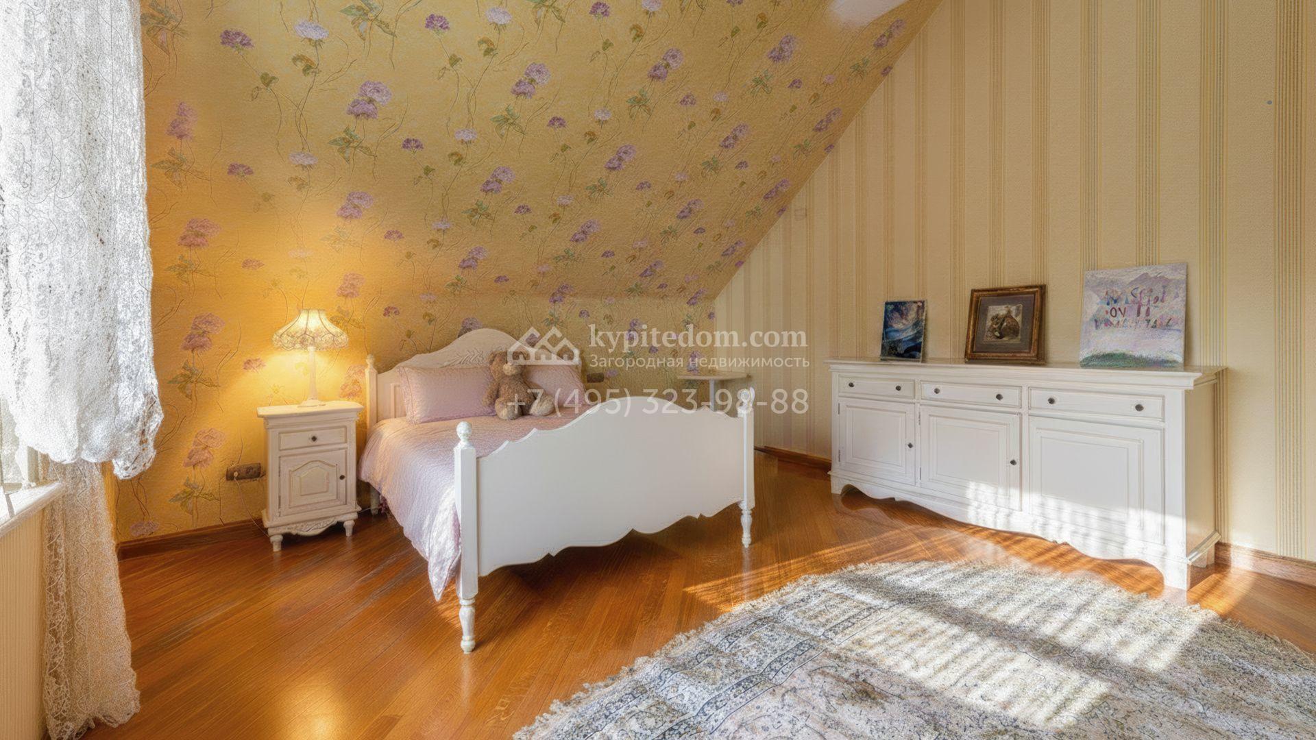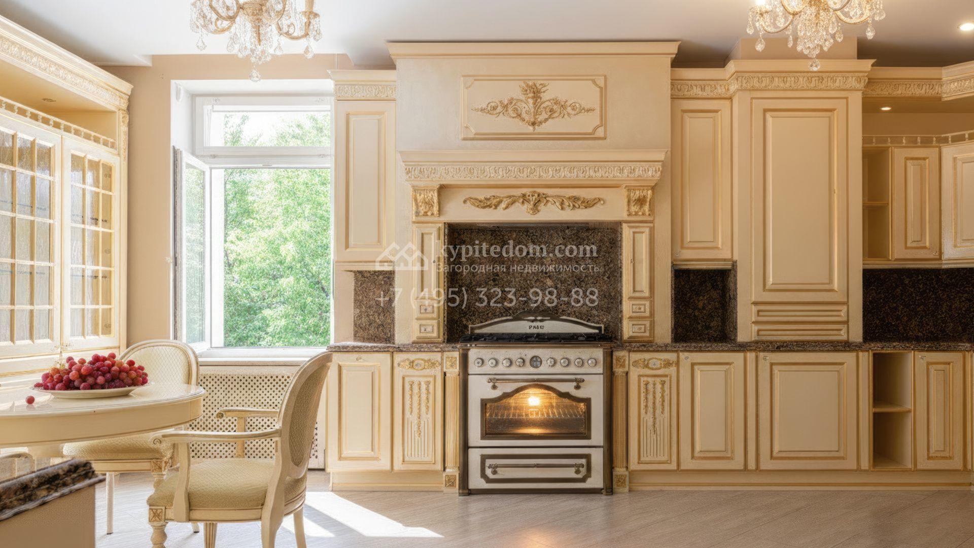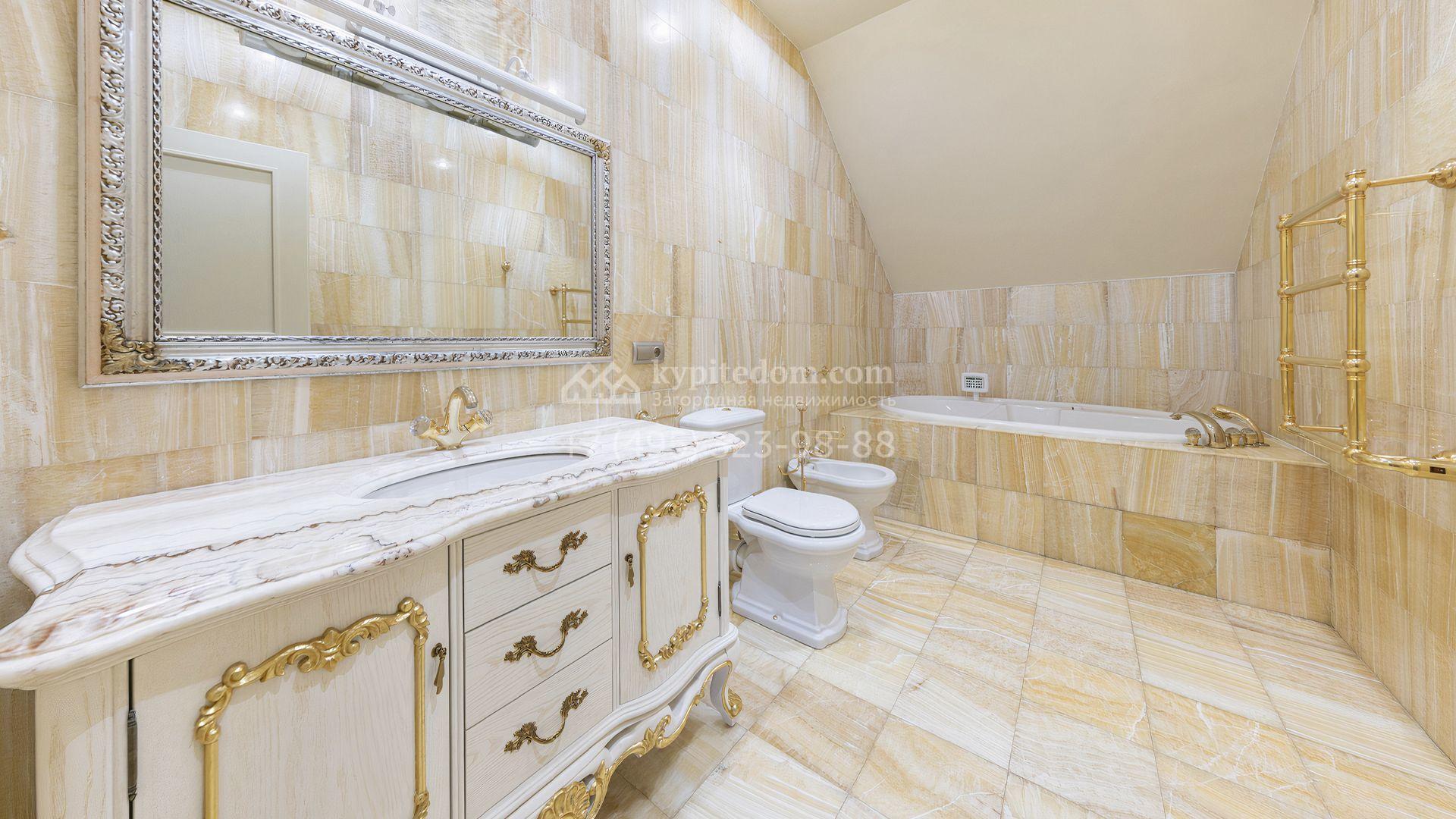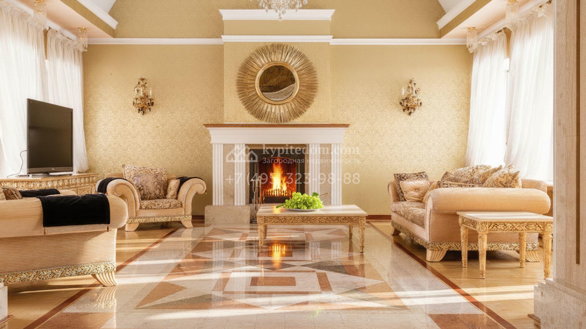 Загородный дом площадью 850 м² расположен на участке 25 соток. Фасад здания облицован желтоватой штукатуркой и декорирован рустовкой. В отделке интерьера с элементами классического стиля использованы теплые оттенки, орнаменты и фактура дерева. Планировка коттеджа включает 4 спальни, 3 ванные комнаты, гардеробные, столовую и большую гостиную с дровяным камином. На цокольном этаже расположены зона отдыха с сауной и небольшим бассейном и хозяйственная часть с комнатой для персонала. В контуре дома предусмотрен гараж на 2 машины и паркинг на улице ещё для 2 машин. На участке выполнен ландшафтный дизайн, обустроена зона барбекю и высажены хвойные деревья по периметру участка.
