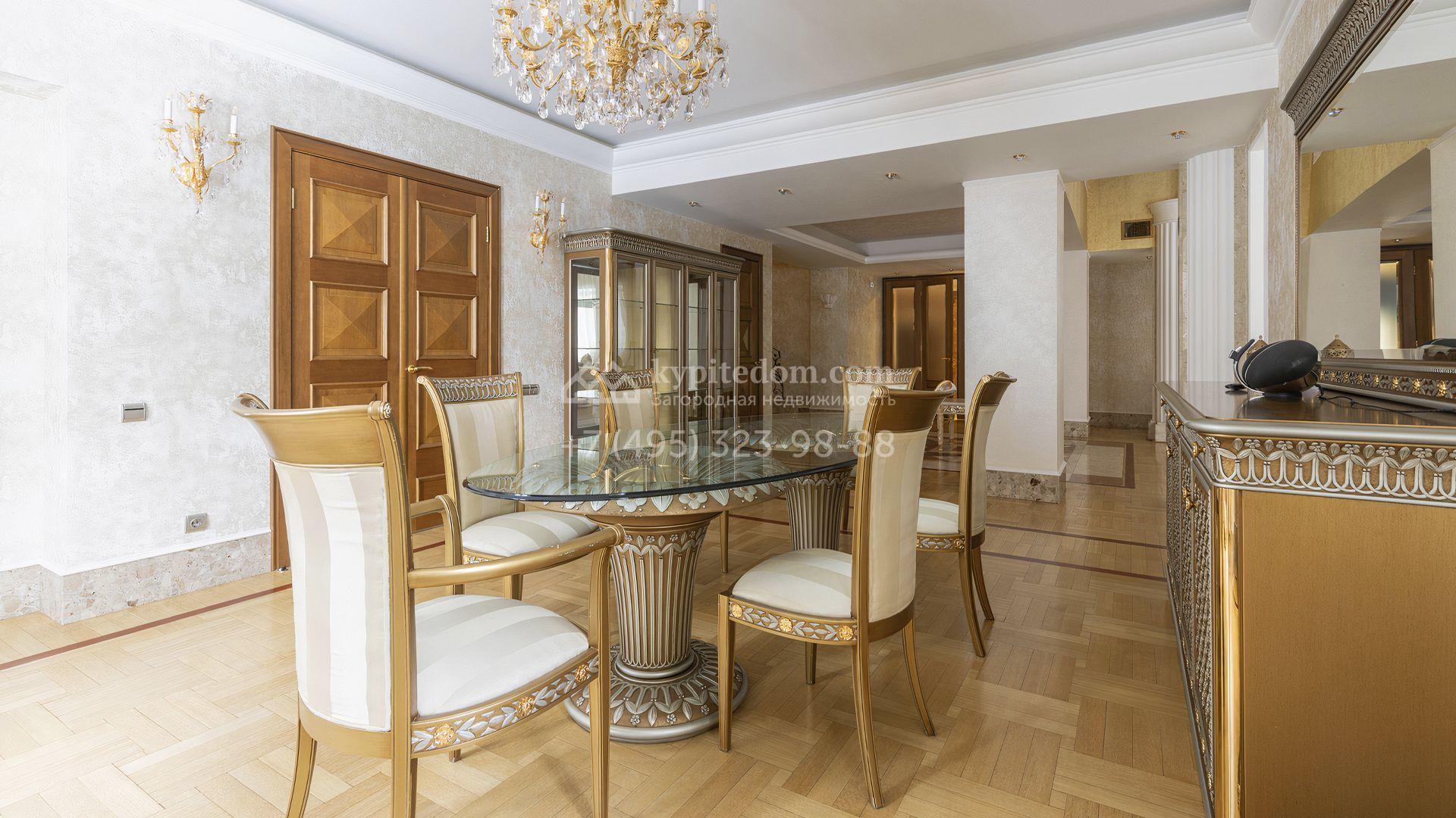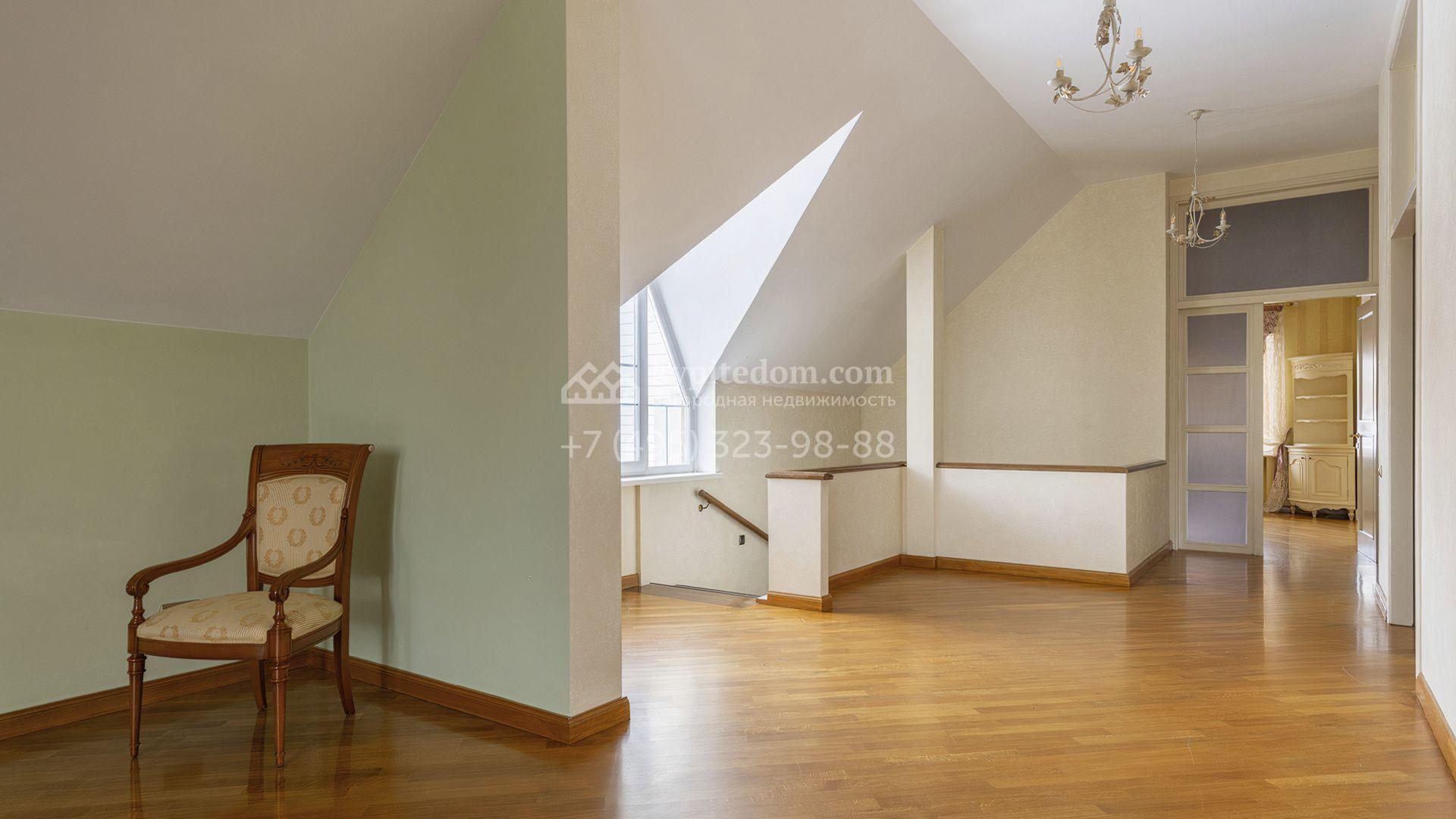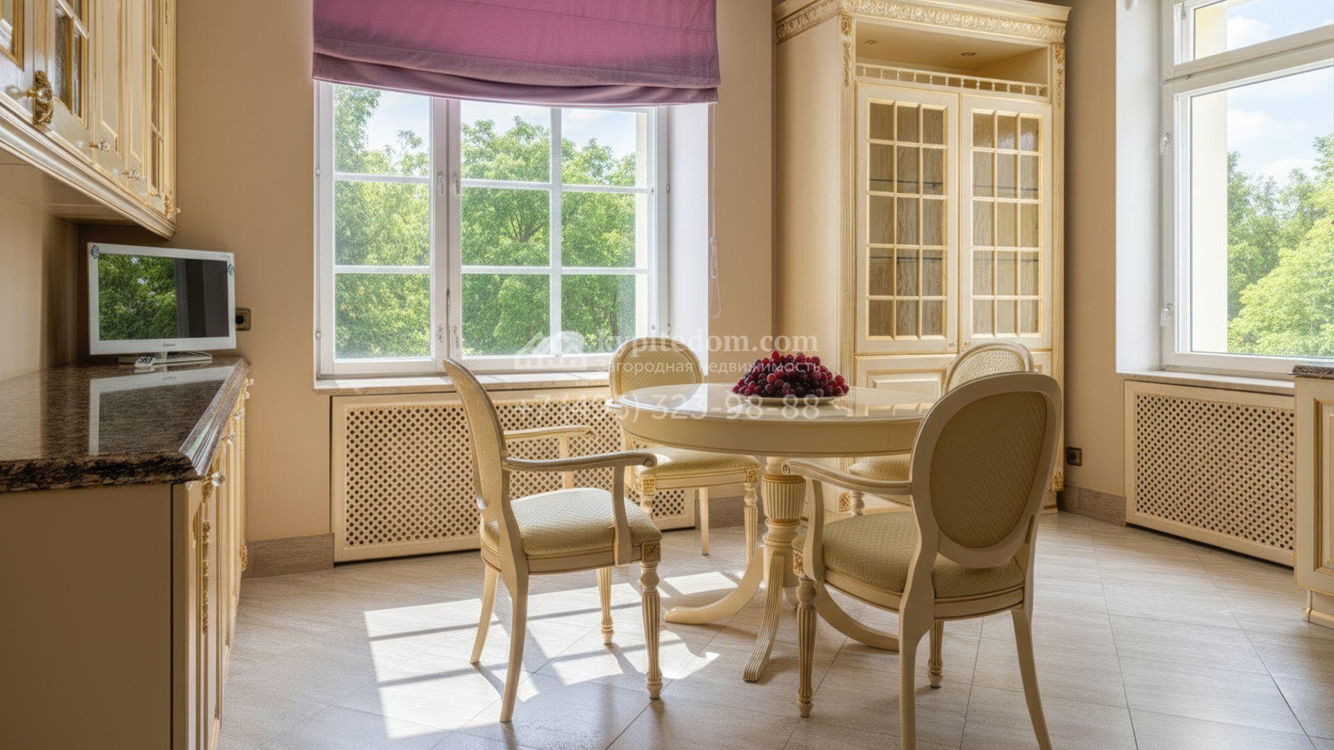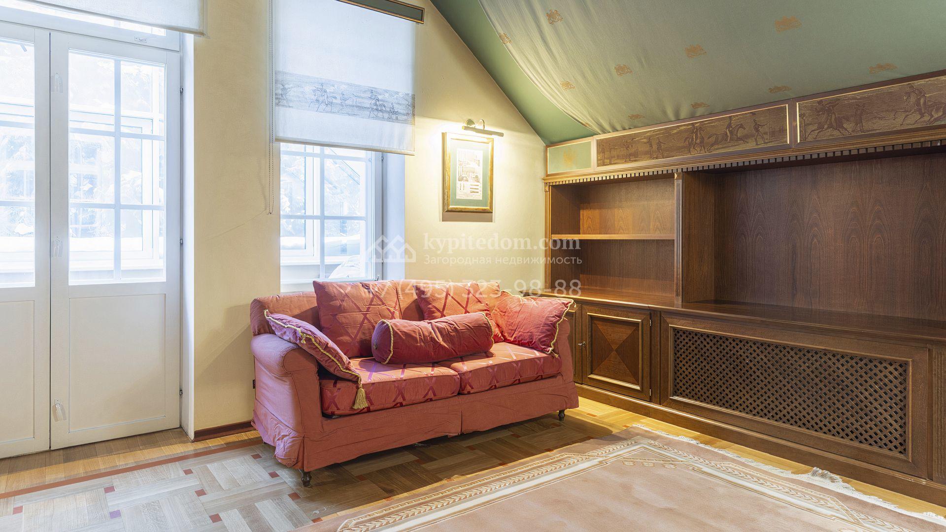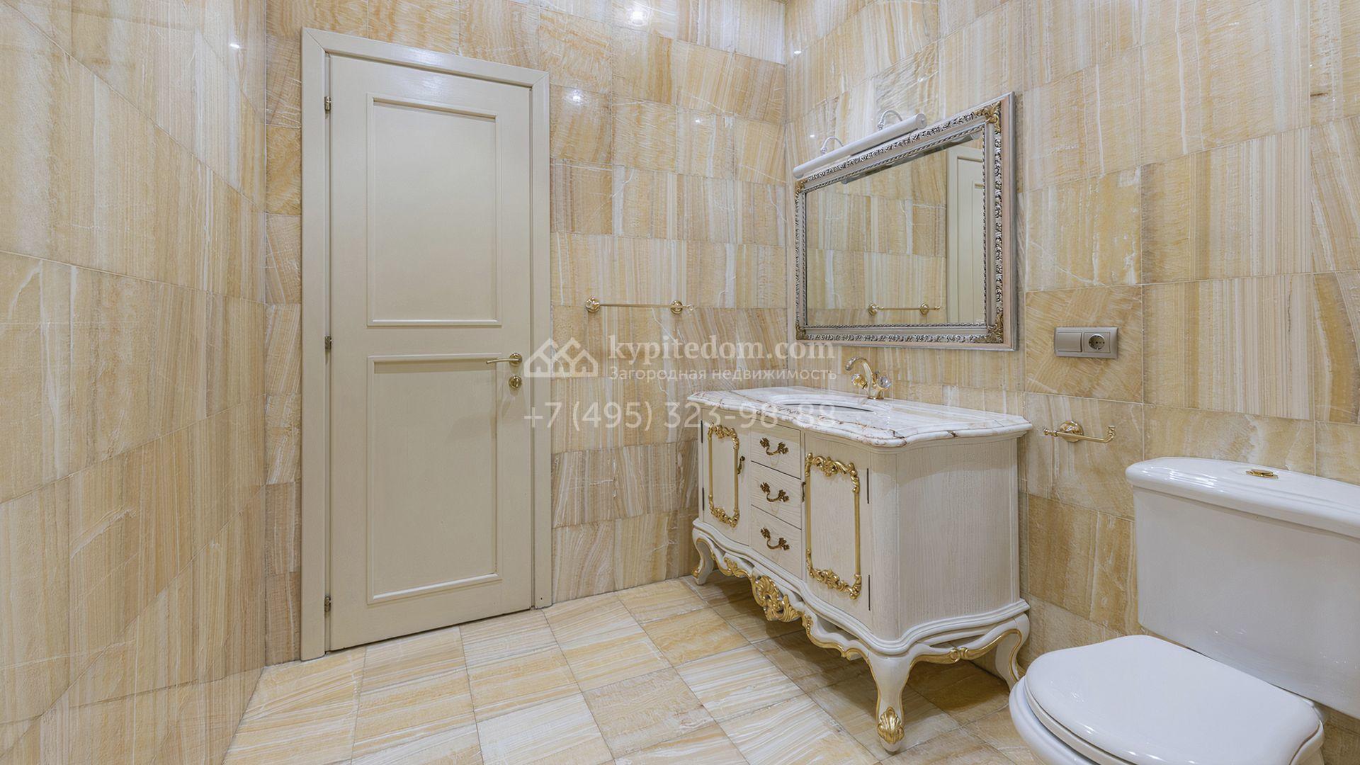 Загородный дом площадью 850 м² расположен на участке 25 соток. Фасад здания облицован желтоватой штукатуркой и декорирован рустовкой. В отделке интерьера с элементами классического стиля использованы теплые оттенки, орнаменты и фактура дерева. Планировка коттеджа включает 4 спальни, 3 ванные комнаты, гардеробные, столовую и большую гостиную с дровяным камином. На цокольном этаже расположены зона отдыха с сауной и небольшим бассейном и хозяйственная часть с комнатой для персонала. В контуре дома предусмотрен гараж на 2 машины и паркинг на улице ещё для 2 машин. На участке выполнен ландшафтный дизайн, обустроена зона барбекю и высажены хвойные деревья по периметру участка.