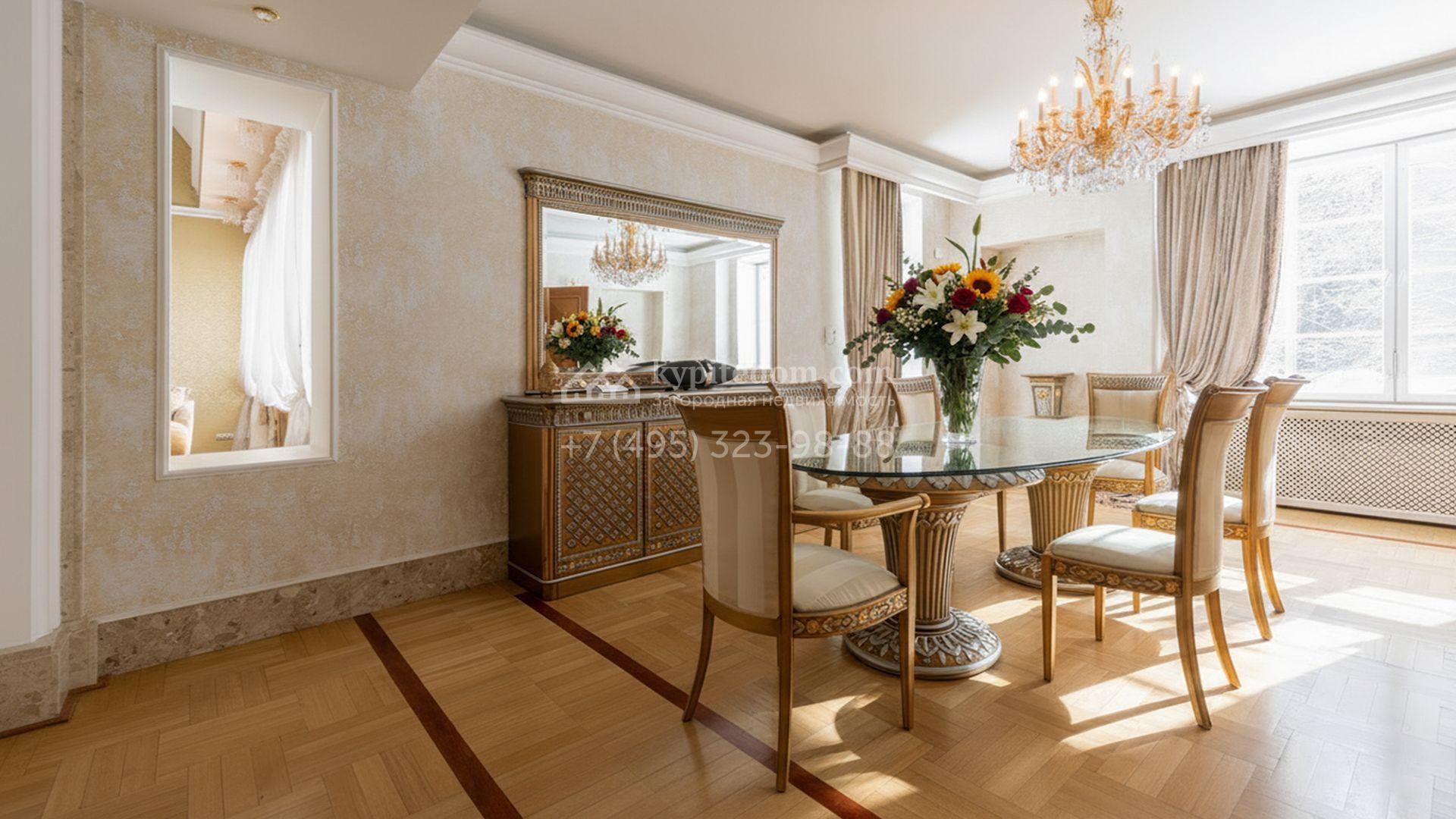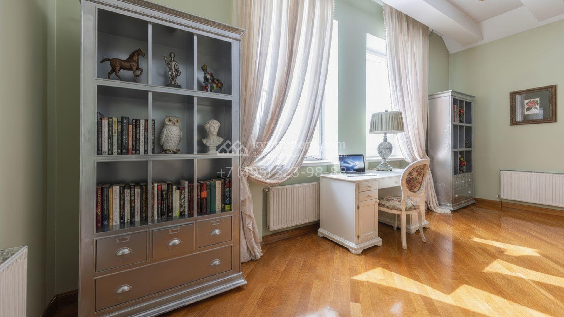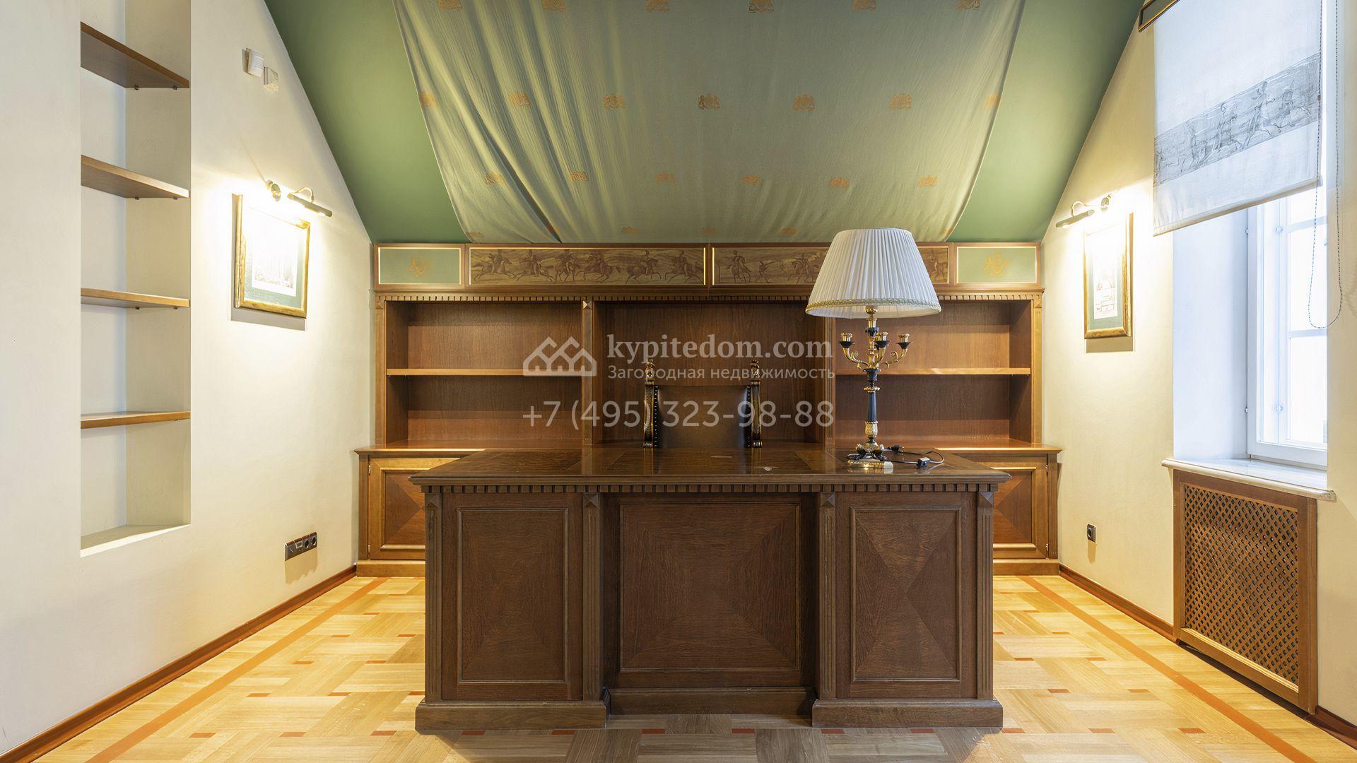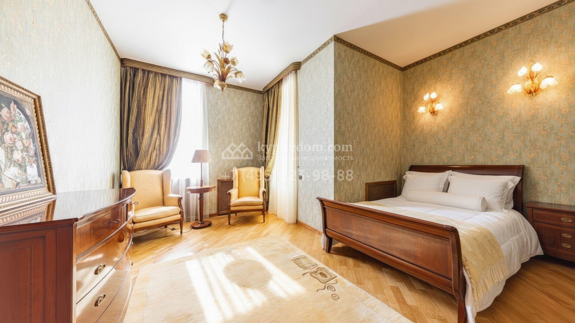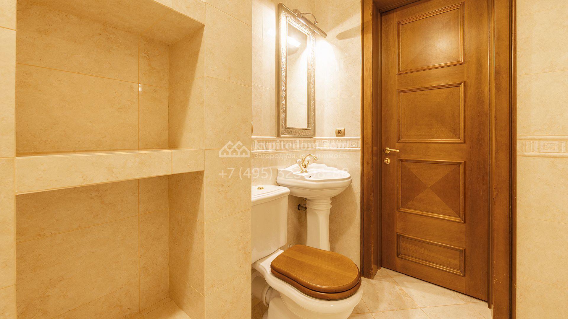 Загородный дом площадью 850 м² расположен на участке 25 соток. Фасад здания облицован желтоватой штукатуркой и декорирован рустовкой. В отделке интерьера с элементами классического стиля использованы теплые оттенки, орнаменты и фактура дерева. Планировка коттеджа включает 4 спальни, 3 ванные комнаты, гардеробные, столовую и большую гостиную с дровяным камином. На цокольном этаже расположены зона отдыха с сауной и небольшим бассейном и хозяйственная часть с комнатой для персонала. В контуре дома предусмотрен гараж на 2 машины и паркинг на улице ещё для 2 машин. На участке выполнен ландшафтный дизайн, обустроена зона барбекю и высажены хвойные деревья по периметру участка.