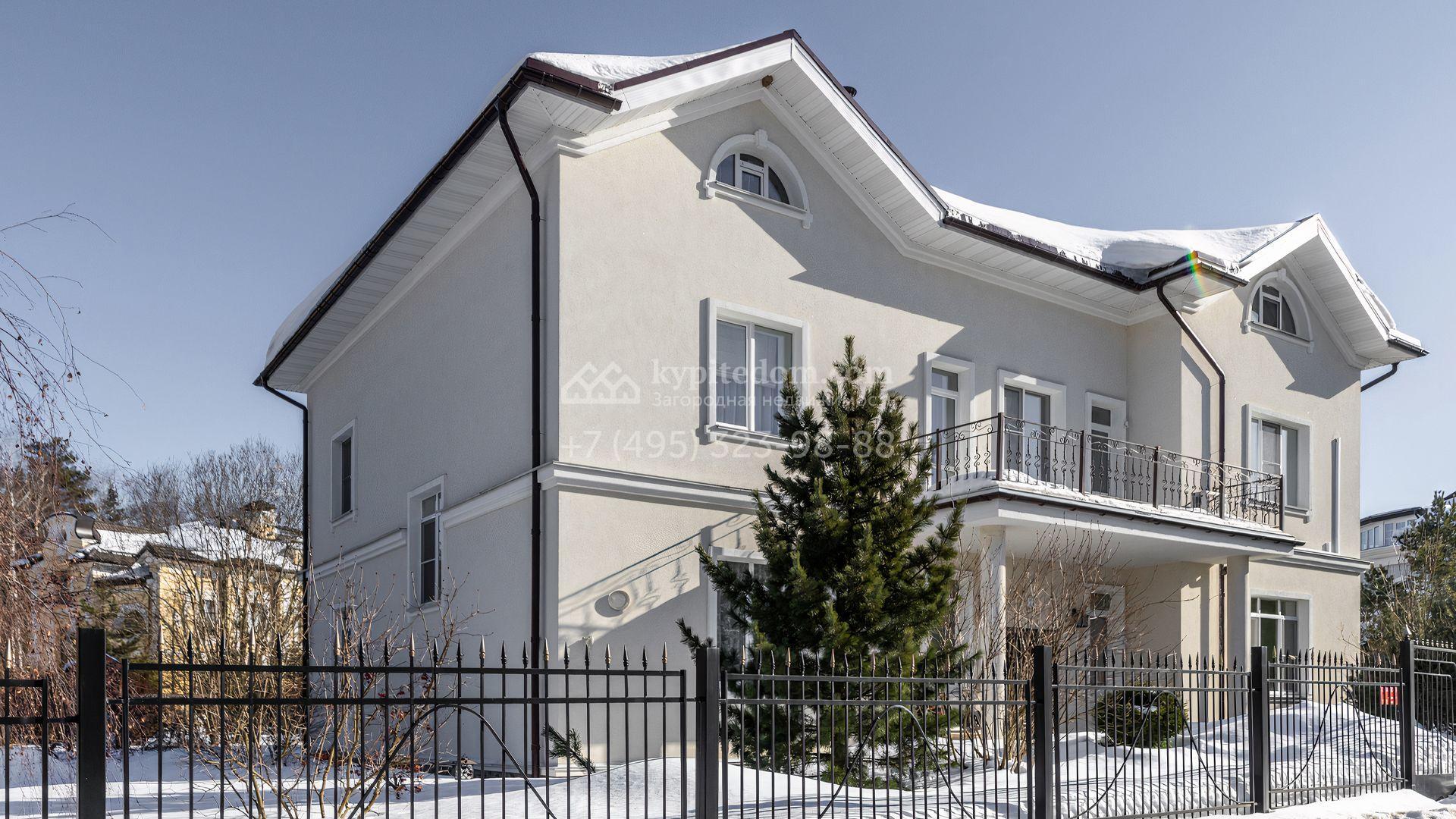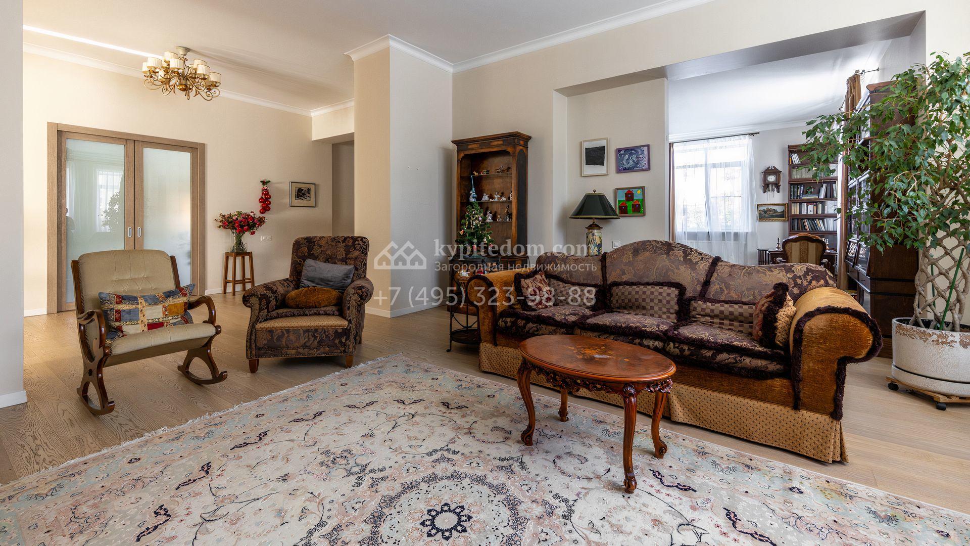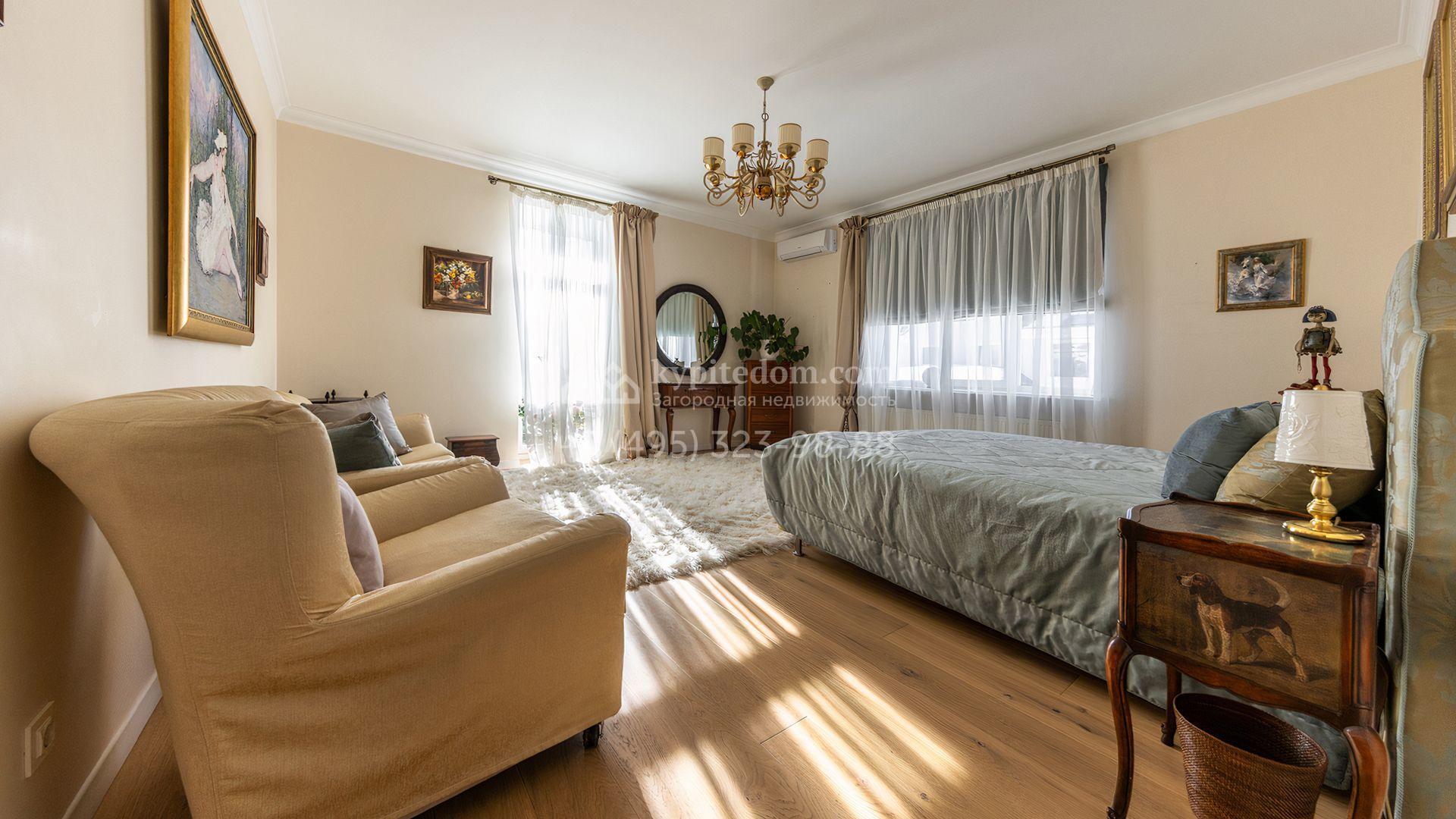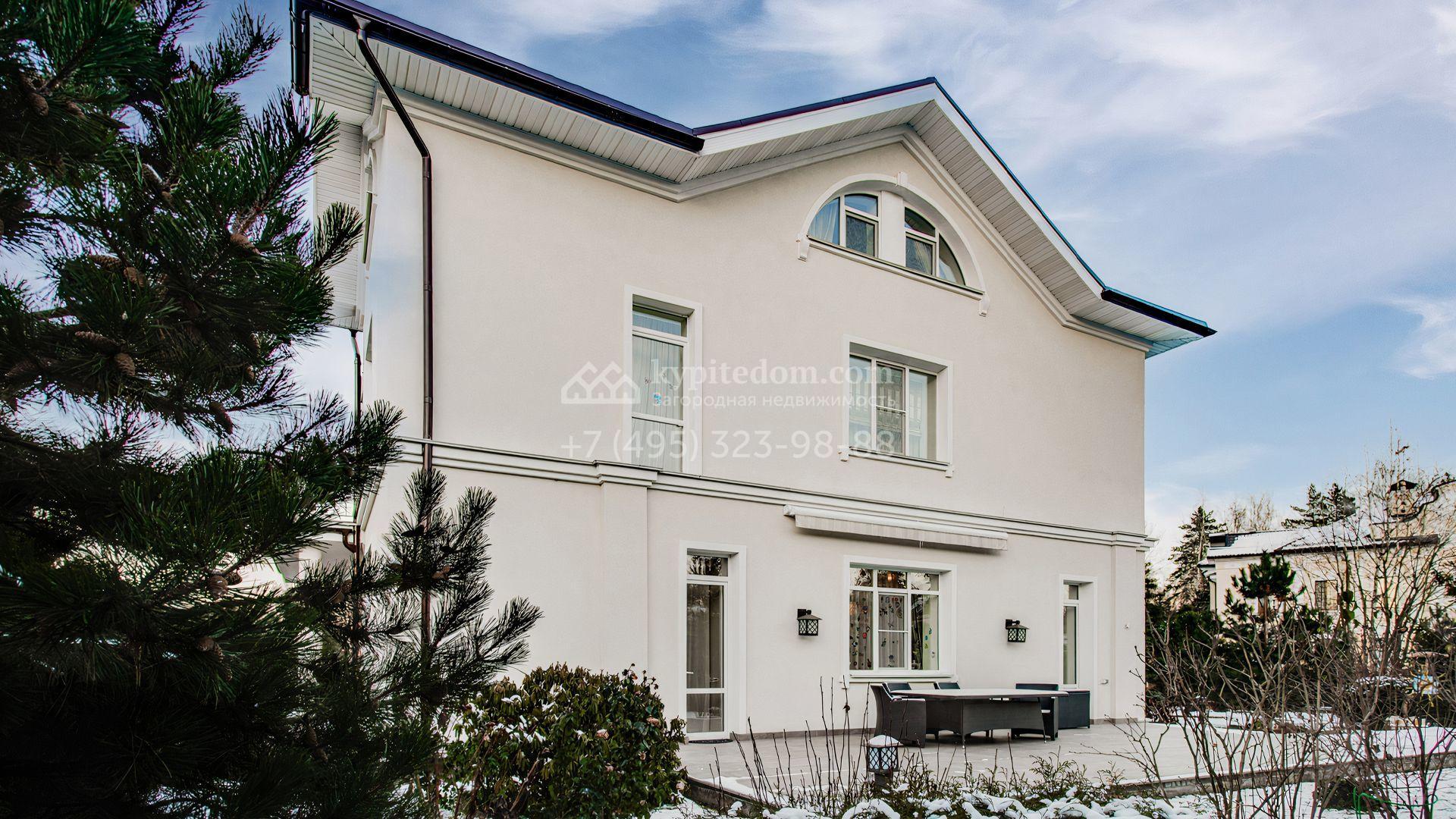 Загородный дом площадью 627 м² построен на просторном полевом участке 21,2 сотки. Лаконичный фасад здания облицован бежевой штукатуркой, украшен белыми наличниками, колоннами и черными коваными элементами. В отделке интерьера использованы теплые оттенки в сочетании с фактурой дерева, создающие домашний уют. Планировка резиденции включает 5 спален, гостиную, кухню, столовую, кабинет и игровую. Рядом расположены гараж на 2 машины с котельной, детская площадка и бассейн с подогревом. На участке выполнен ландшафтный дизайн и высажены деревья.
