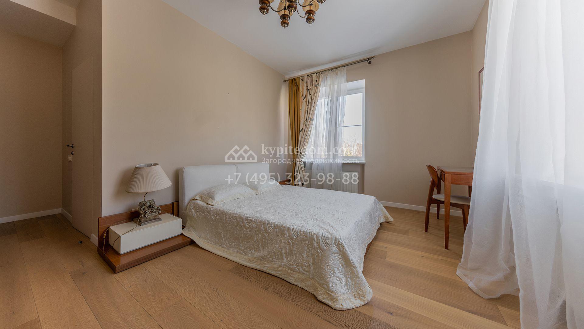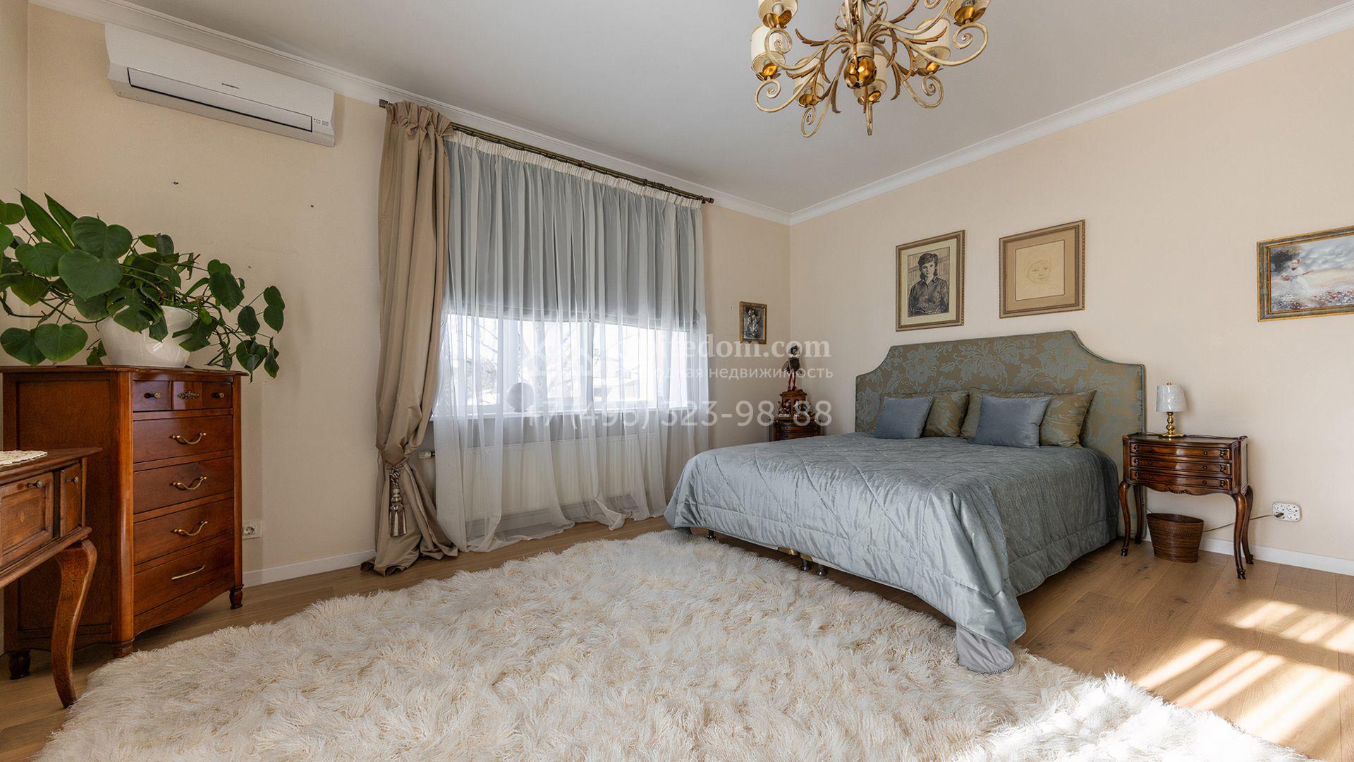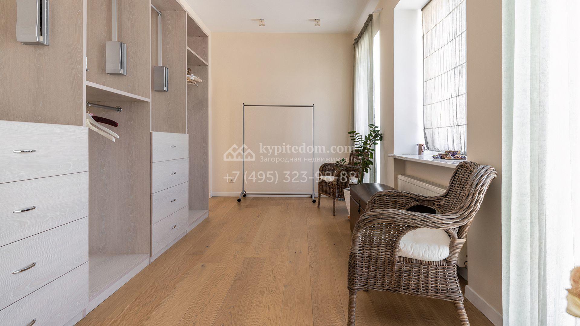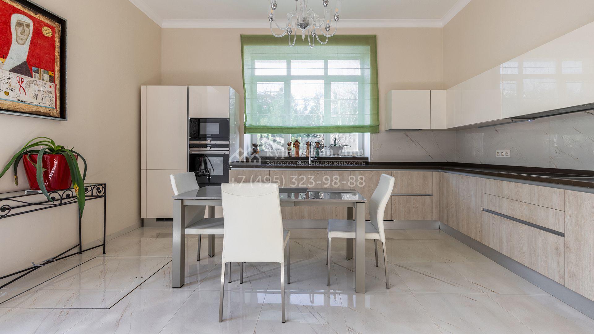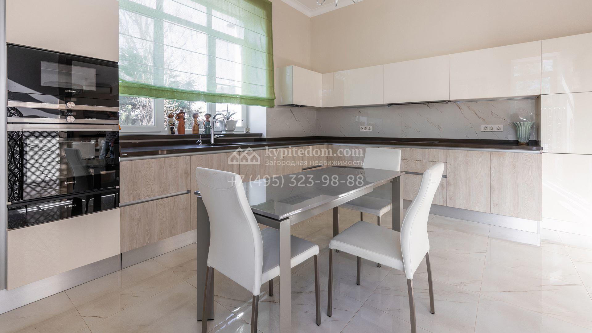 Загородный дом площадью 627 м² построен на просторном полевом участке 21,2 сотки. Лаконичный фасад здания облицован бежевой штукатуркой, украшен белыми наличниками, колоннами и черными коваными элементами. В отделке интерьера использованы теплые оттенки в сочетании с фактурой дерева, создающие домашний уют. Планировка резиденции включает 5 спален, гостиную, кухню, столовую, кабинет и игровую. Рядом расположены гараж на 2 машины с котельной, детская площадка и бассейн с подогревом. На участке выполнен ландшафтный дизайн и высажены деревья.