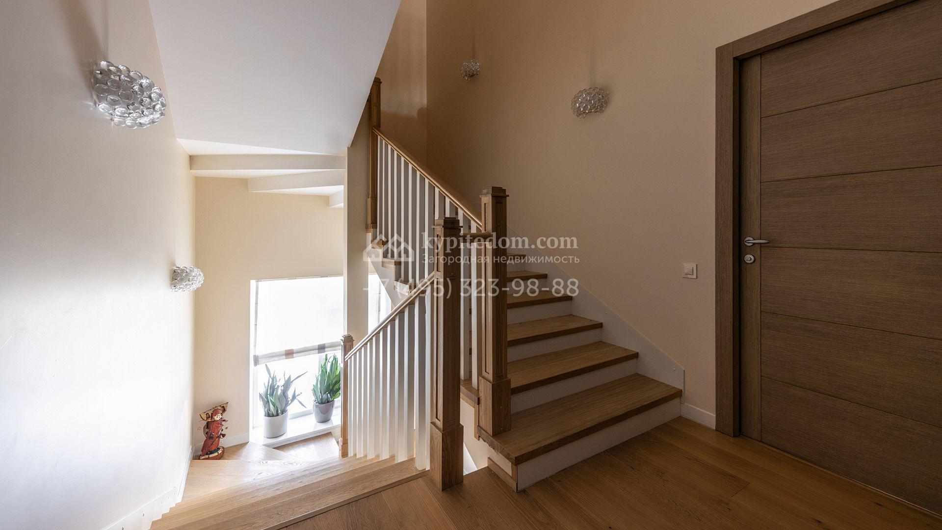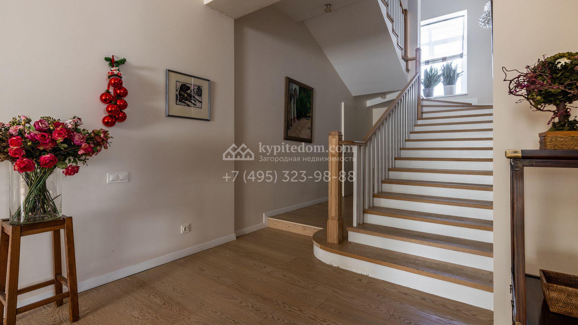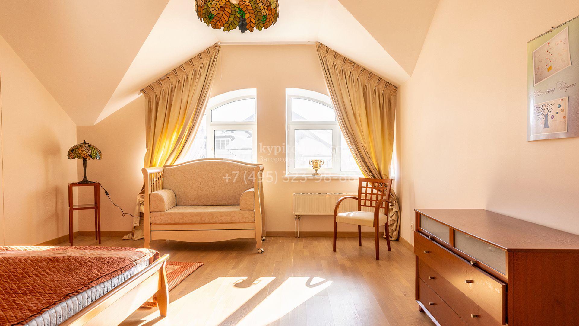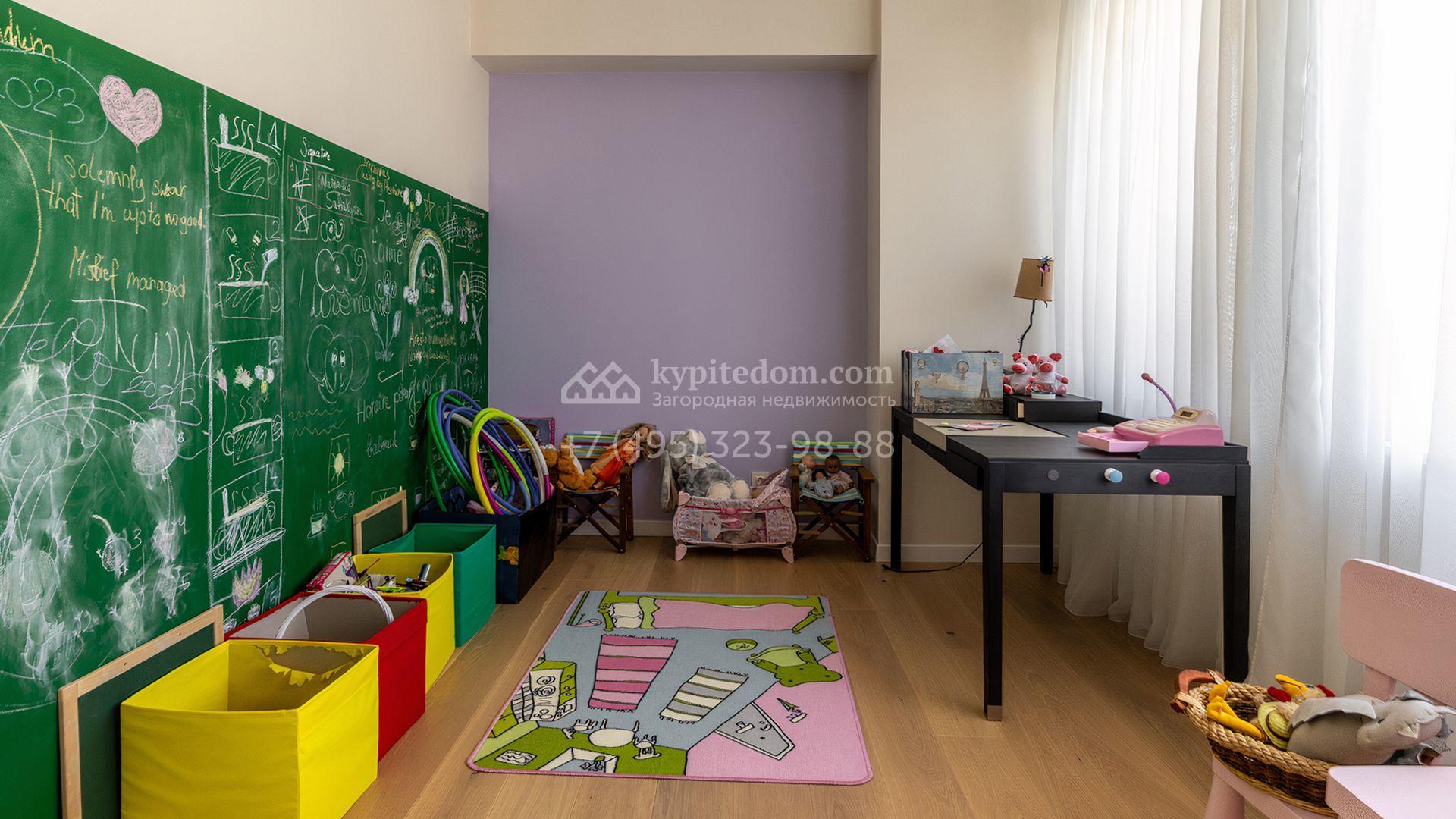 Загородный дом площадью 627 м² построен на просторном полевом участке 21,2 сотки. Лаконичный фасад здания облицован бежевой штукатуркой, украшен белыми наличниками, колоннами и черными коваными элементами. В отделке интерьера использованы теплые оттенки в сочетании с фактурой дерева, создающие домашний уют. Планировка резиденции включает 5 спален, гостиную, кухню, столовую, кабинет и игровую. Рядом расположены гараж на 2 машины с котельной, детская площадка и бассейн с подогревом. На участке выполнен ландшафтный дизайн и высажены деревья.