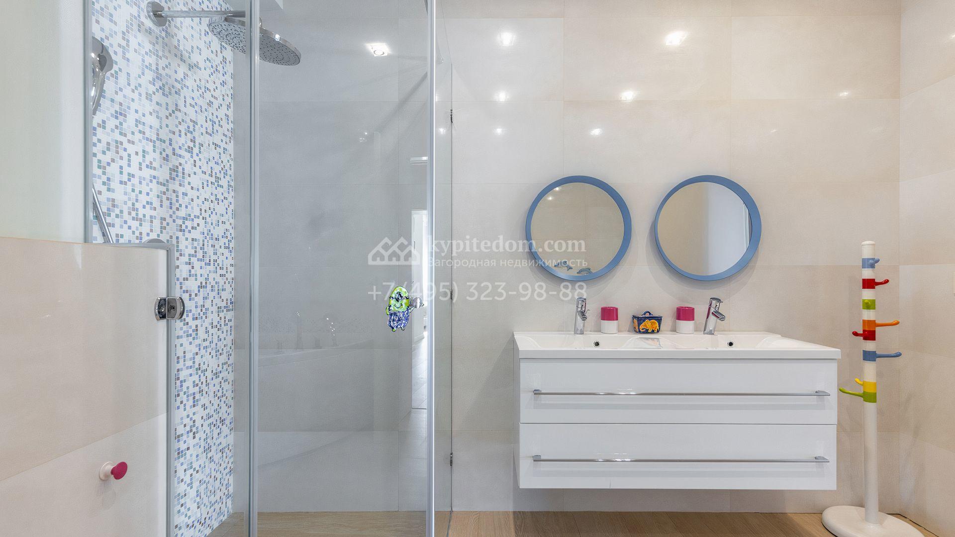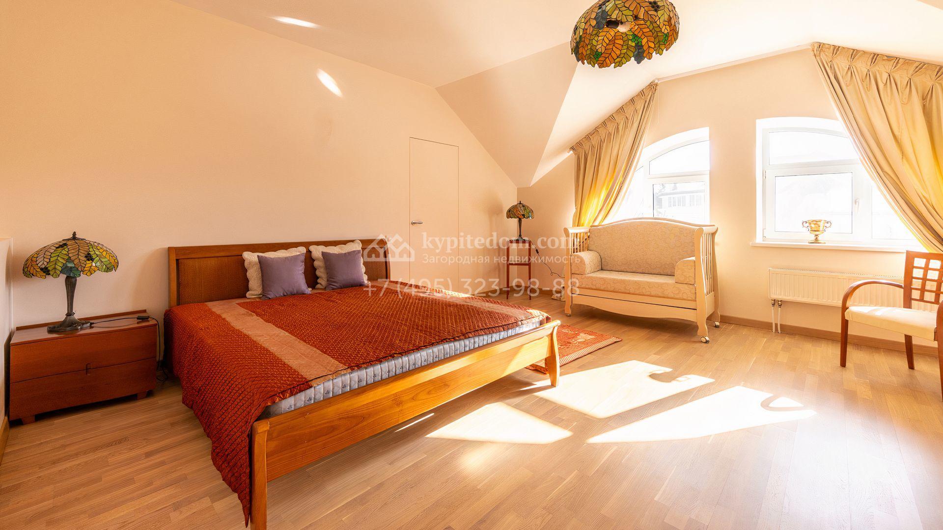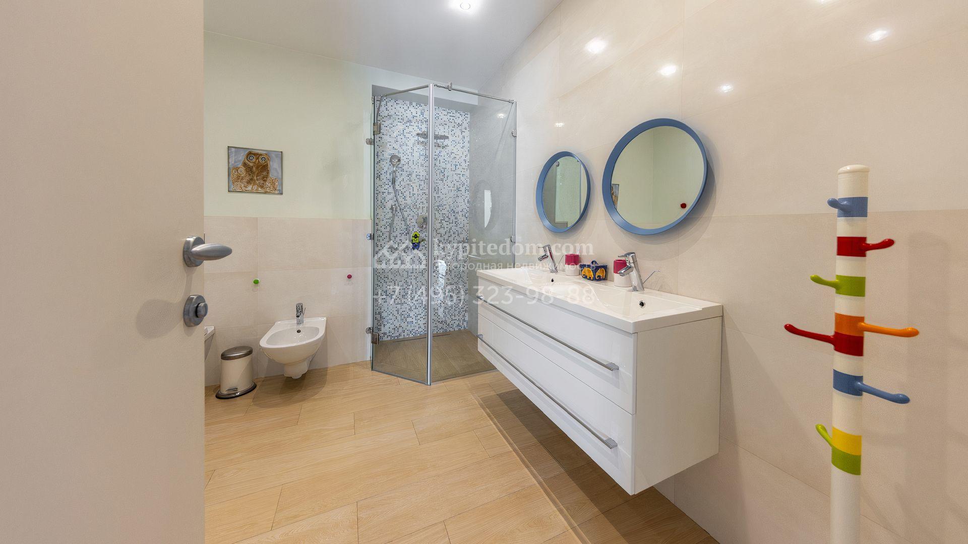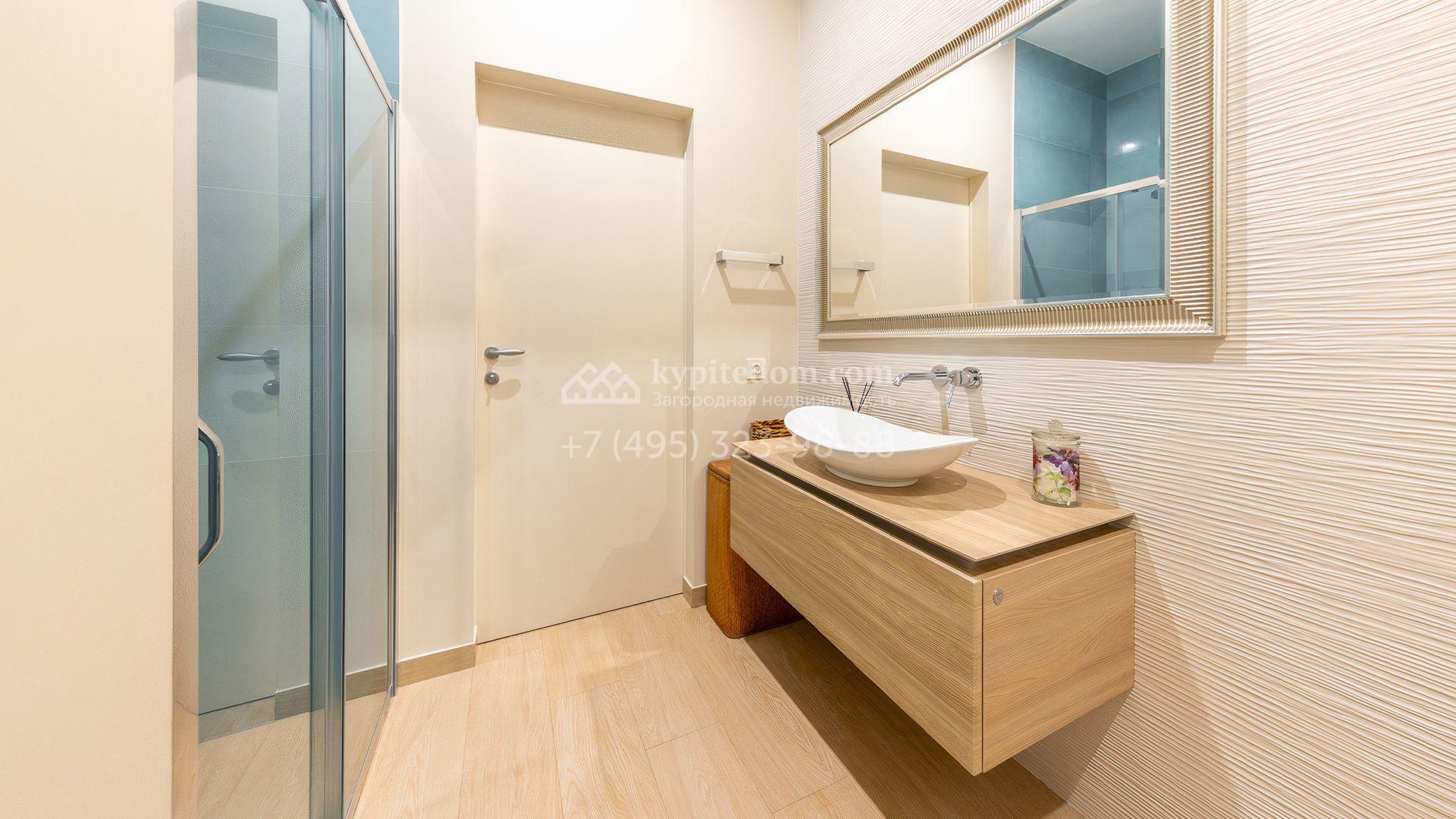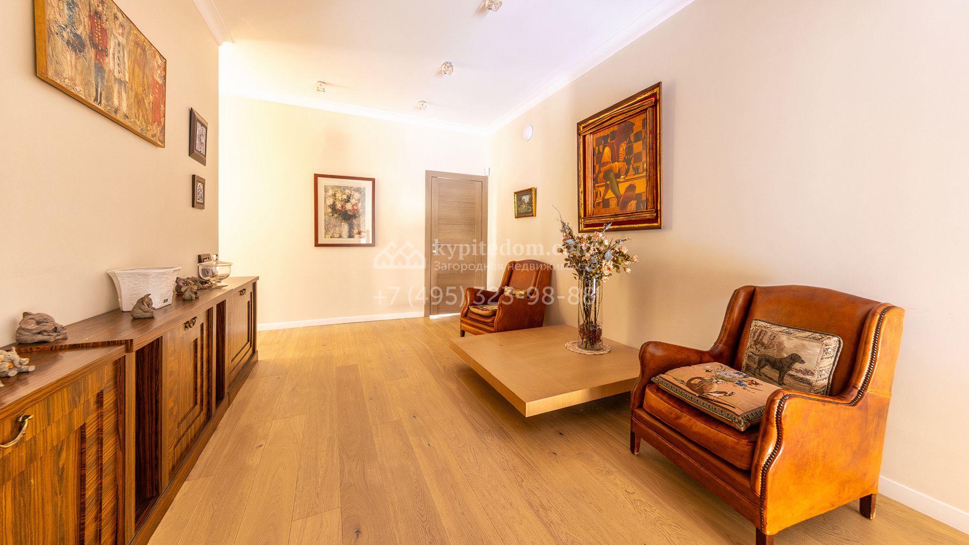 Загородный дом площадью 627 м² построен на просторном полевом участке 21,2 сотки. Лаконичный фасад здания облицован бежевой штукатуркой, украшен белыми наличниками, колоннами и черными коваными элементами. В отделке интерьера использованы теплые оттенки в сочетании с фактурой дерева, создающие домашний уют. Планировка резиденции включает 5 спален, гостиную, кухню, столовую, кабинет и игровую. Рядом расположены гараж на 2 машины с котельной, детская площадка и бассейн с подогревом. На участке выполнен ландшафтный дизайн и высажены деревья.