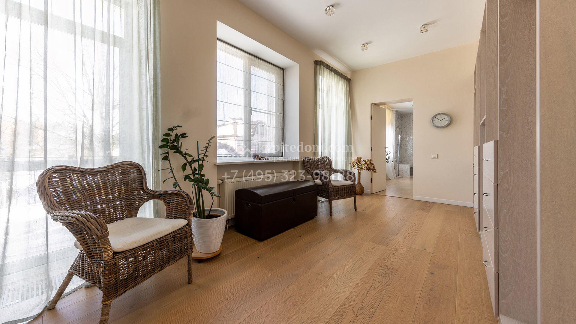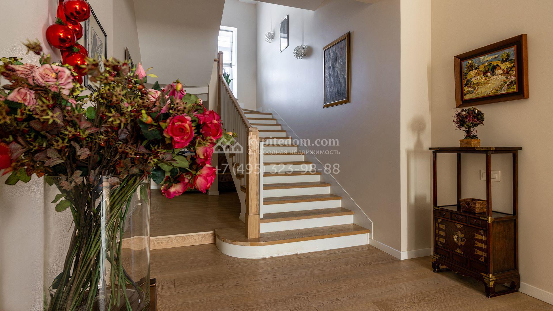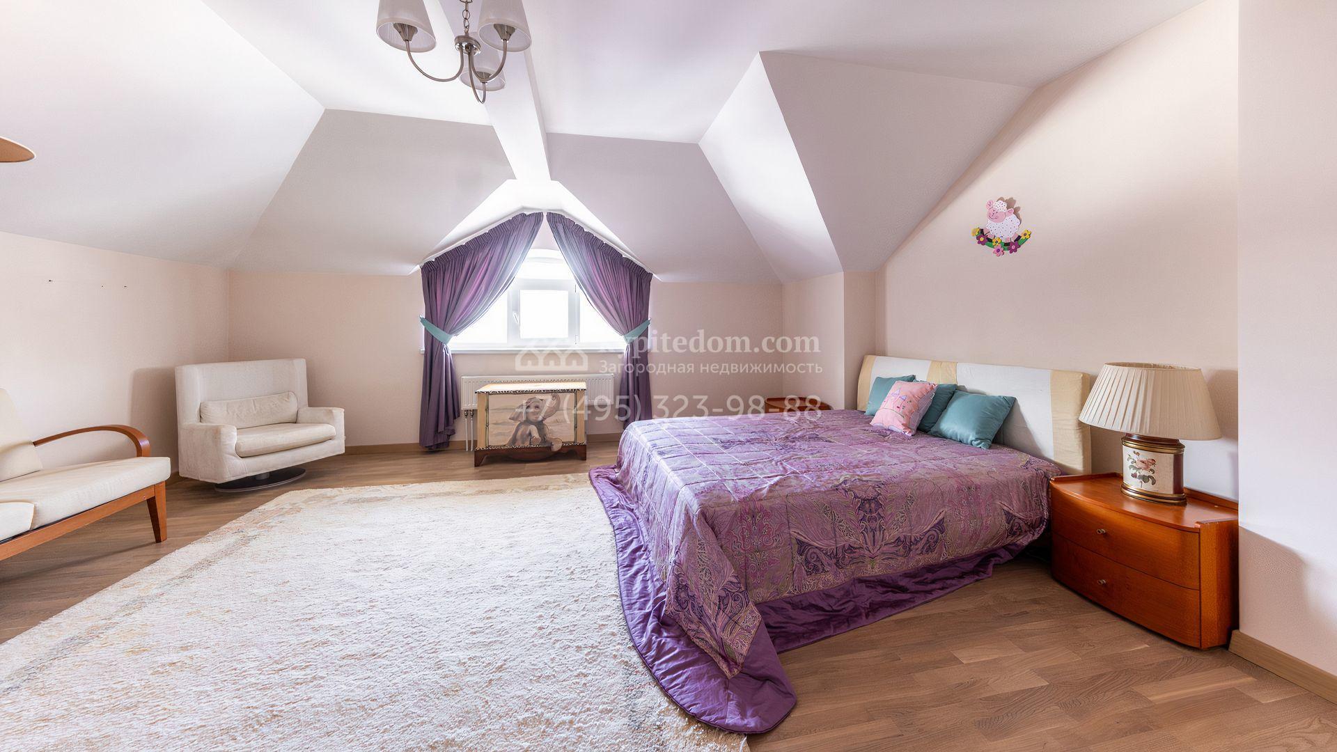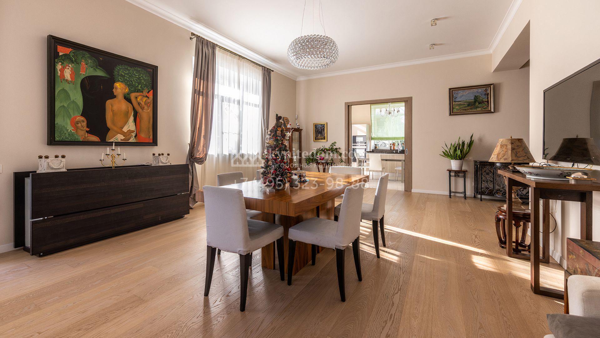 Загородный дом площадью 627 м² построен на просторном полевом участке 21,2 сотки. Лаконичный фасад здания облицован бежевой штукатуркой, украшен белыми наличниками, колоннами и черными коваными элементами. В отделке интерьера использованы теплые оттенки в сочетании с фактурой дерева, создающие домашний уют. Планировка резиденции включает 5 спален, гостиную, кухню, столовую, кабинет и игровую. Рядом расположены гараж на 2 машины с котельной, детская площадка и бассейн с подогревом. На участке выполнен ландшафтный дизайн и высажены деревья.