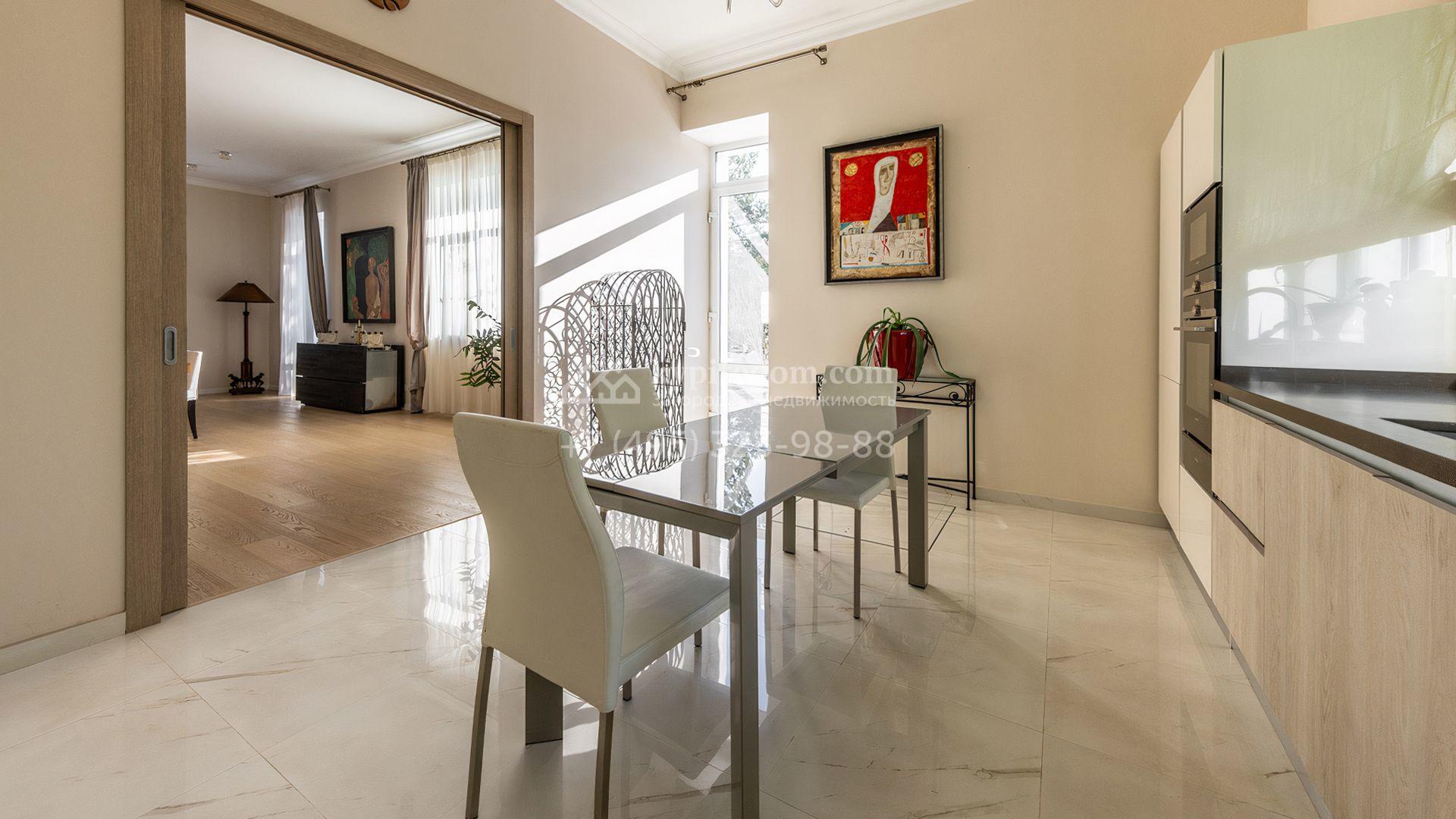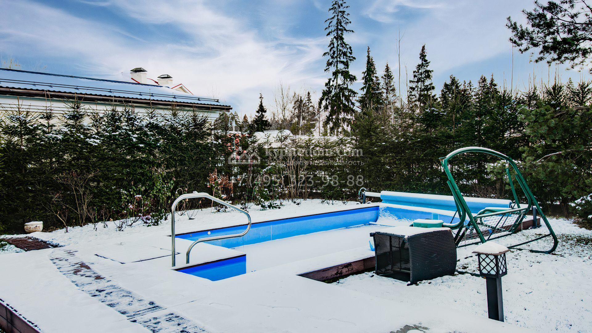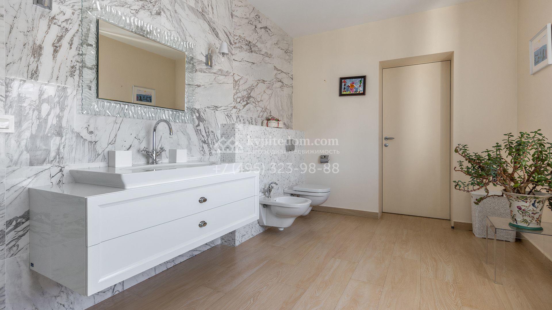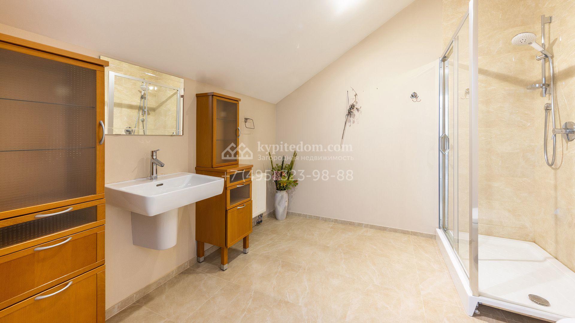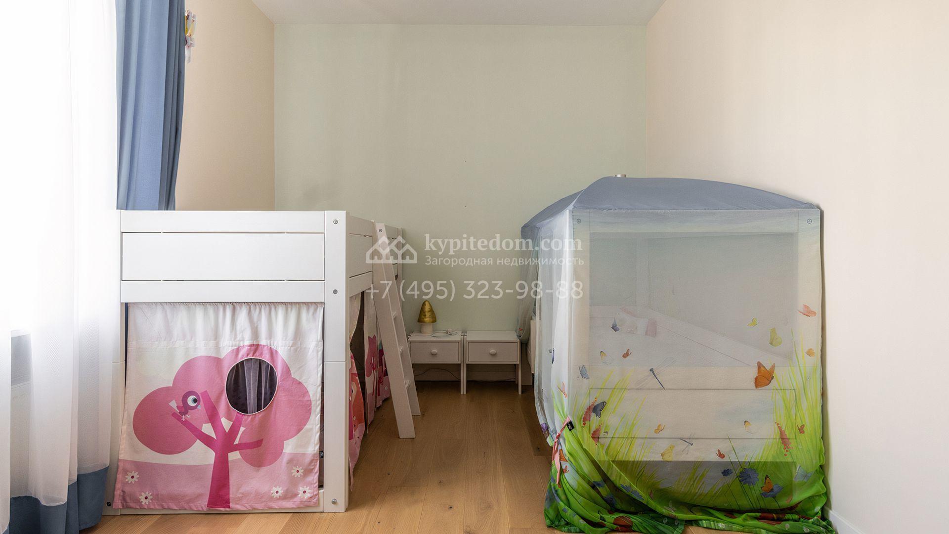 Загородный дом площадью 627 м² построен на просторном полевом участке 21,2 сотки. Лаконичный фасад здания облицован бежевой штукатуркой, украшен белыми наличниками, колоннами и черными коваными элементами. В отделке интерьера использованы теплые оттенки в сочетании с фактурой дерева, создающие домашний уют. Планировка резиденции включает 5 спален, гостиную, кухню, столовую, кабинет и игровую. Рядом расположены гараж на 2 машины с котельной, детская площадка и бассейн с подогревом. На участке выполнен ландшафтный дизайн и высажены деревья.