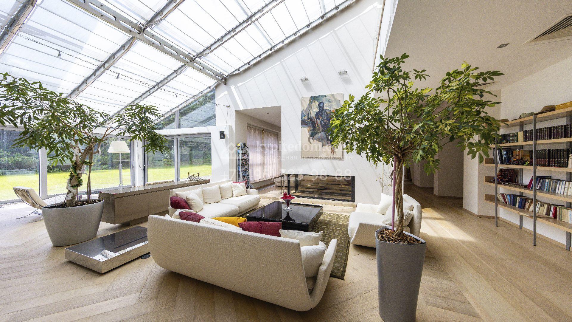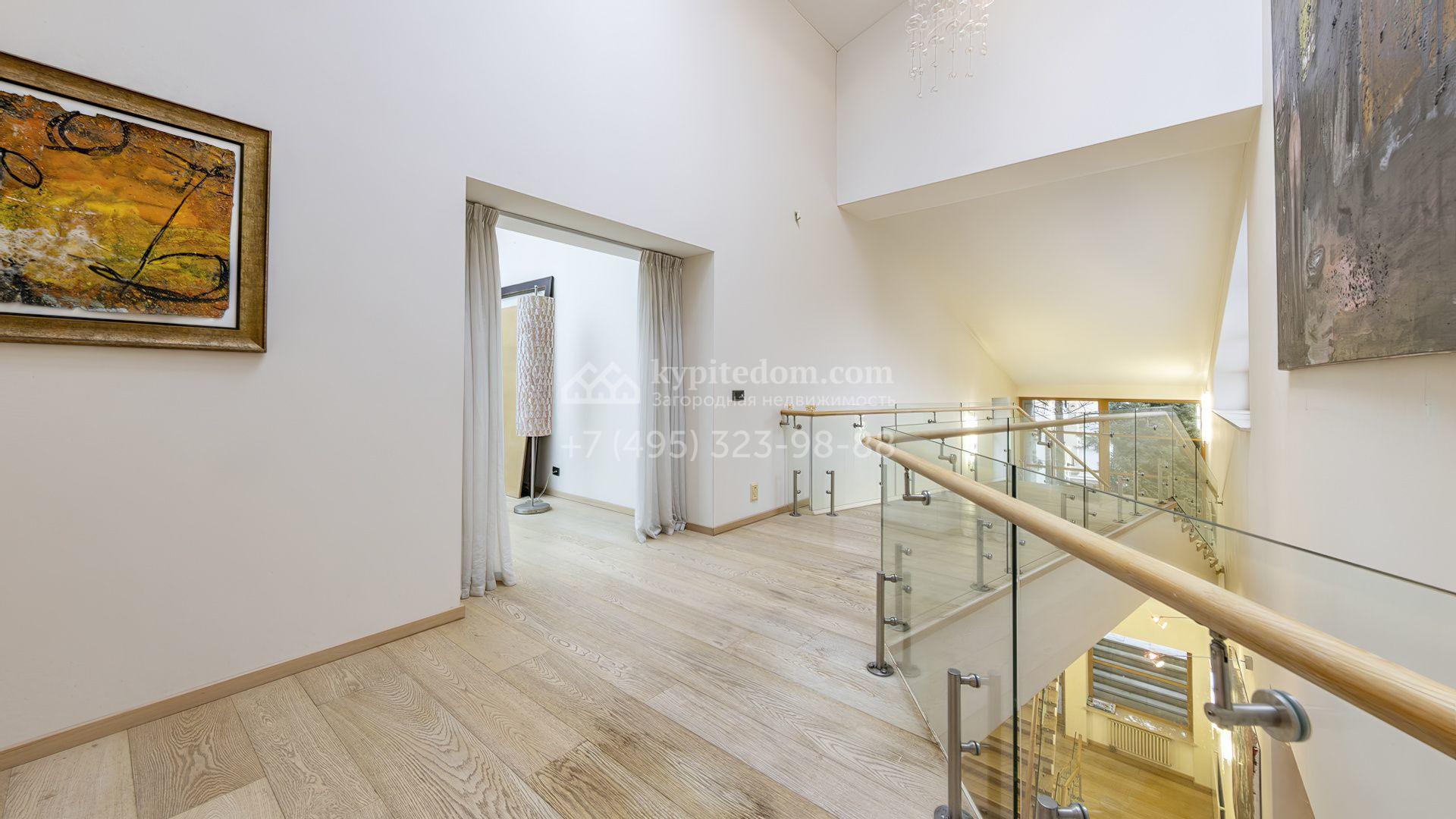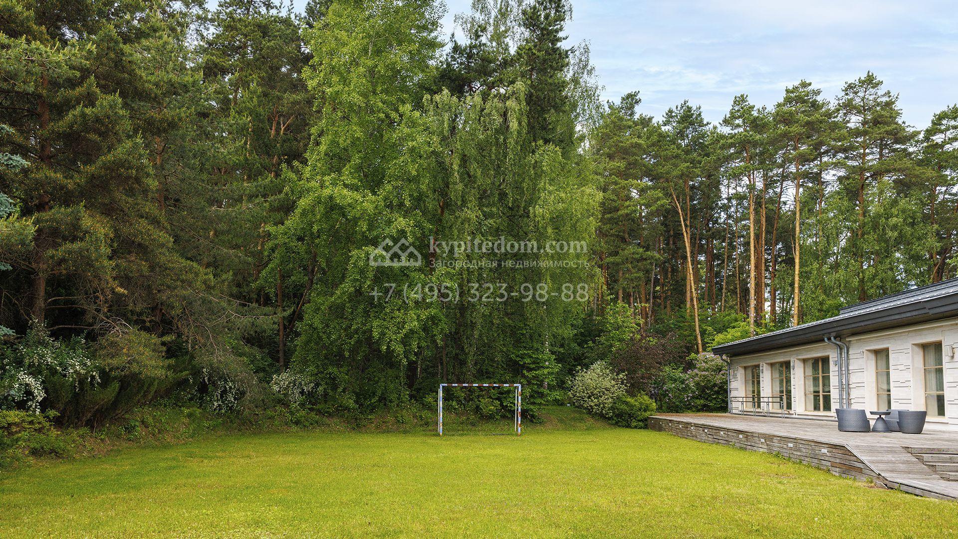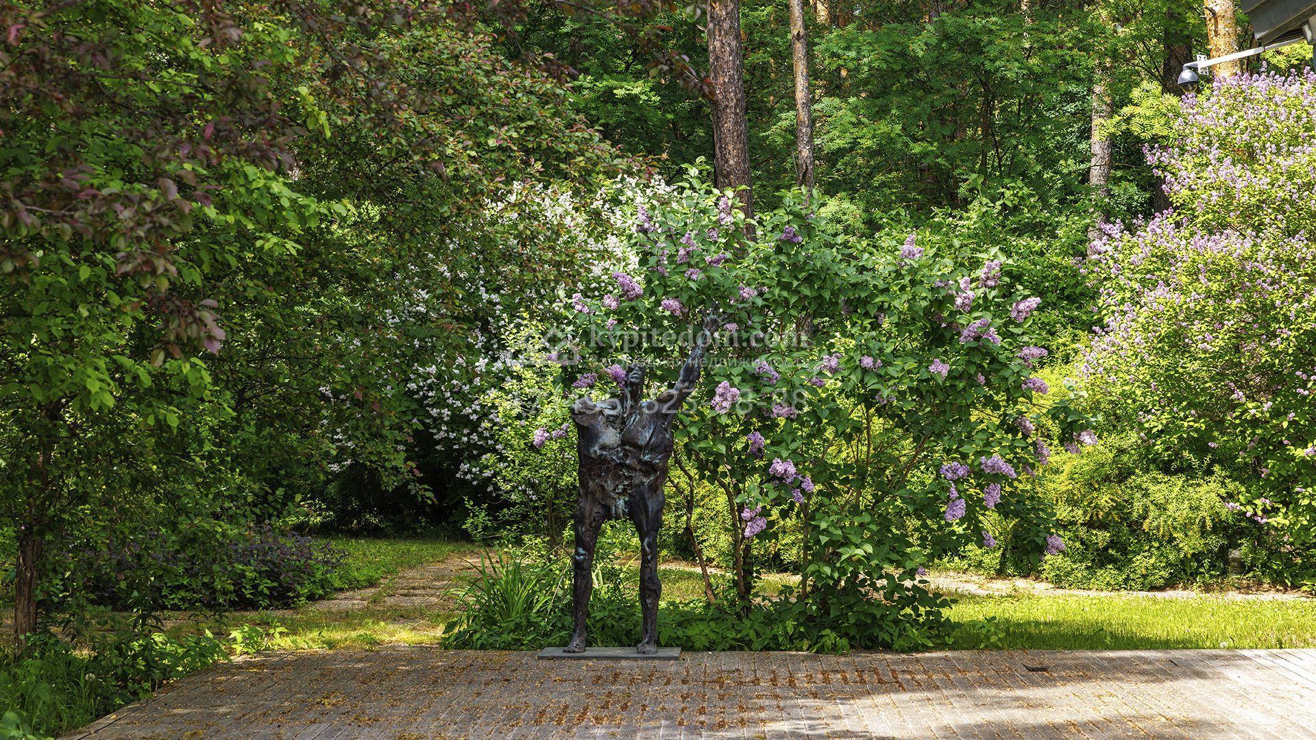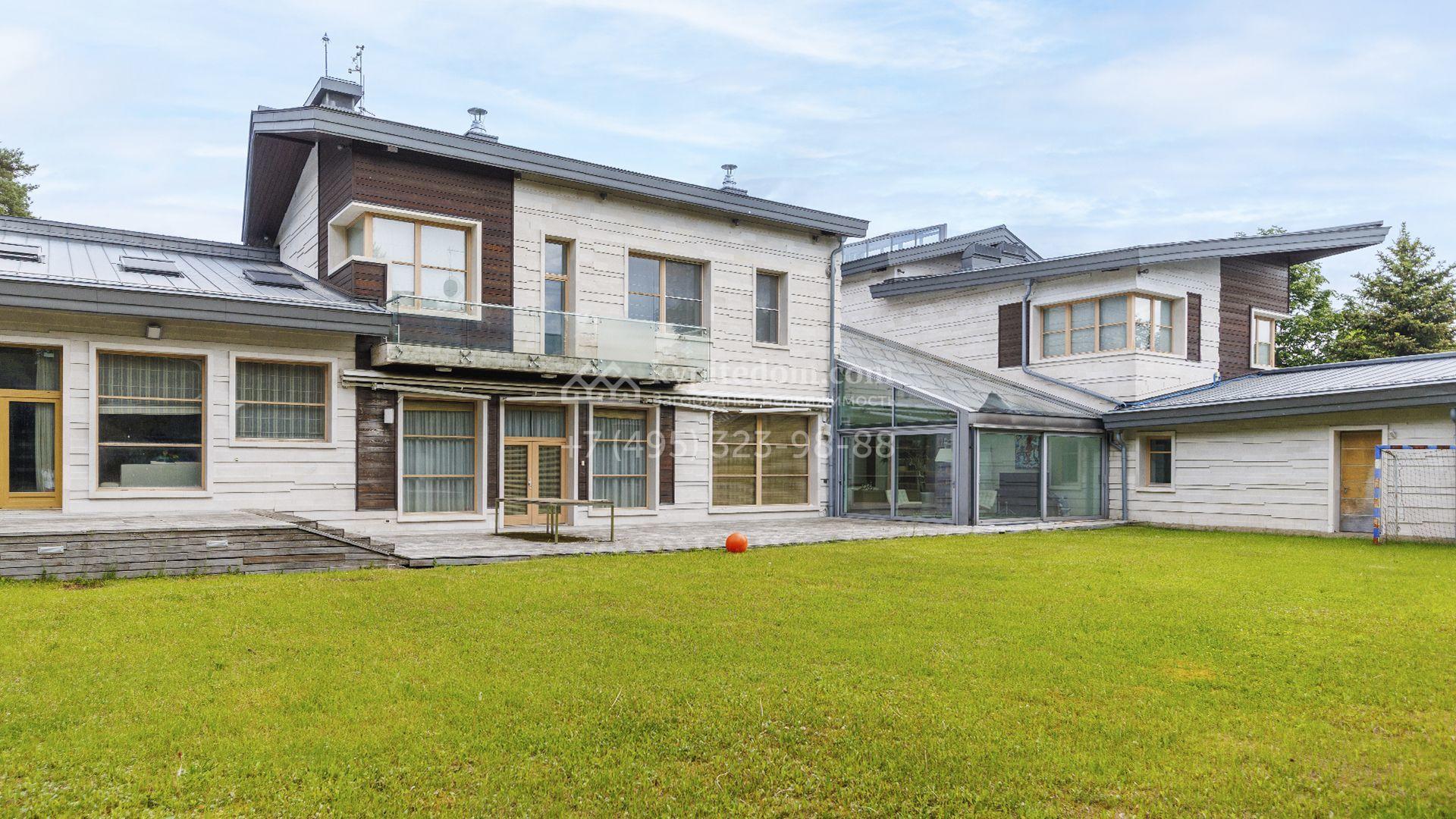 Двухэтажная резиденция площадью 1636 м² расположена на участке площадью 60 соток. Фасад здания выделяется контрастной фактурой — светлый камень и темная древесина сдержанно сочетают скандинавский стиль с современностью. Интерьеры оформлены в стиле минимализм, где живопись и скульптуры становятся ключевыми элементами декора. Из просторной гостиной-библиотеки с двойным светом открывается живописный вид на окружающий лес.