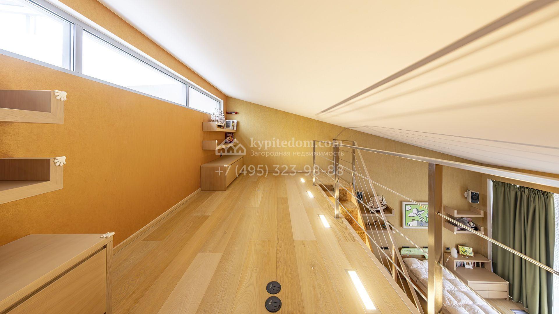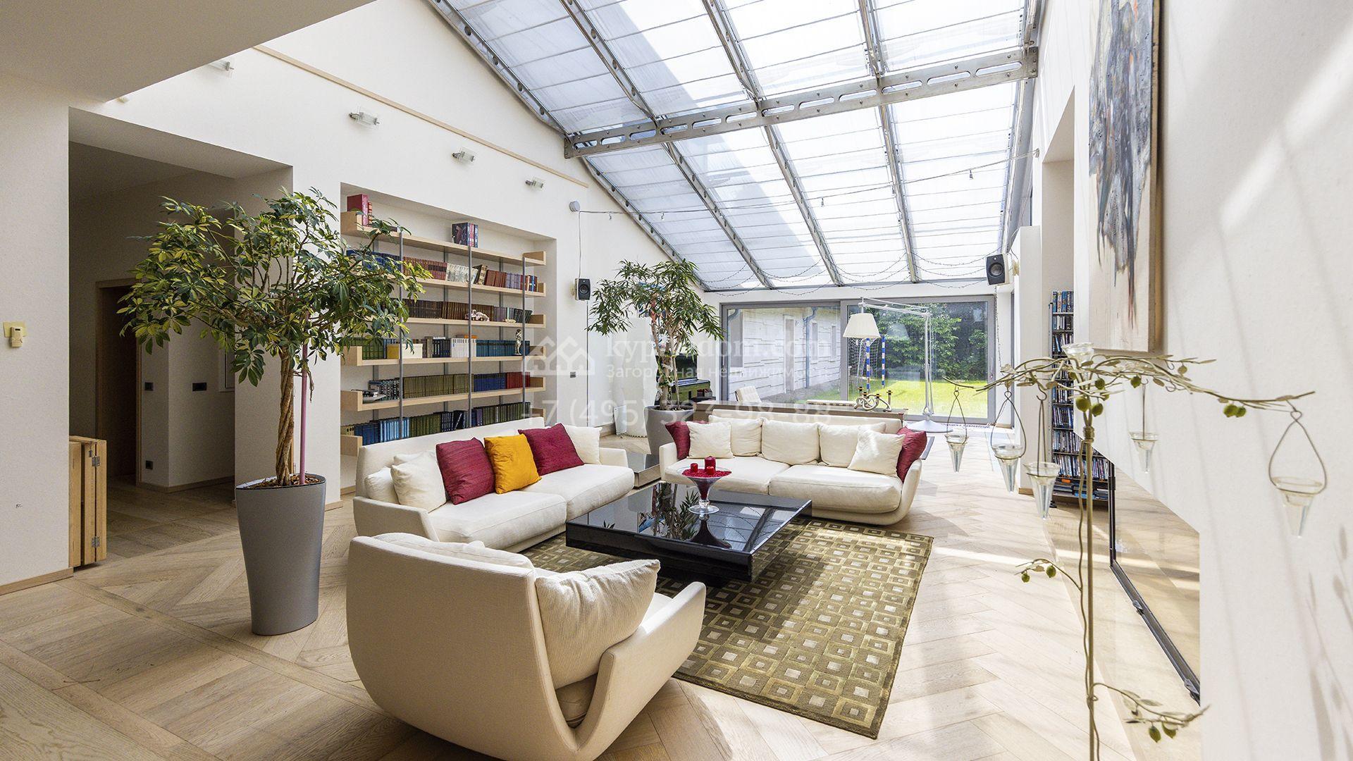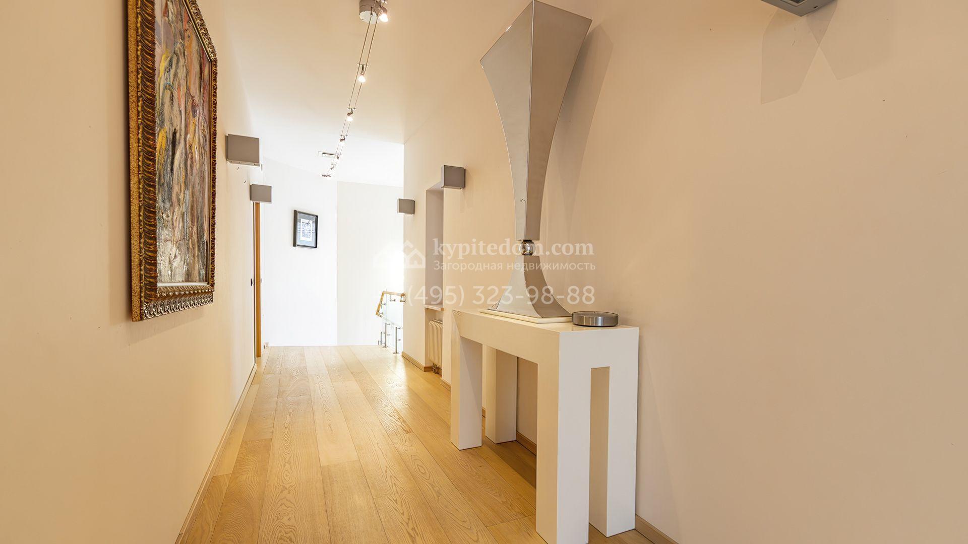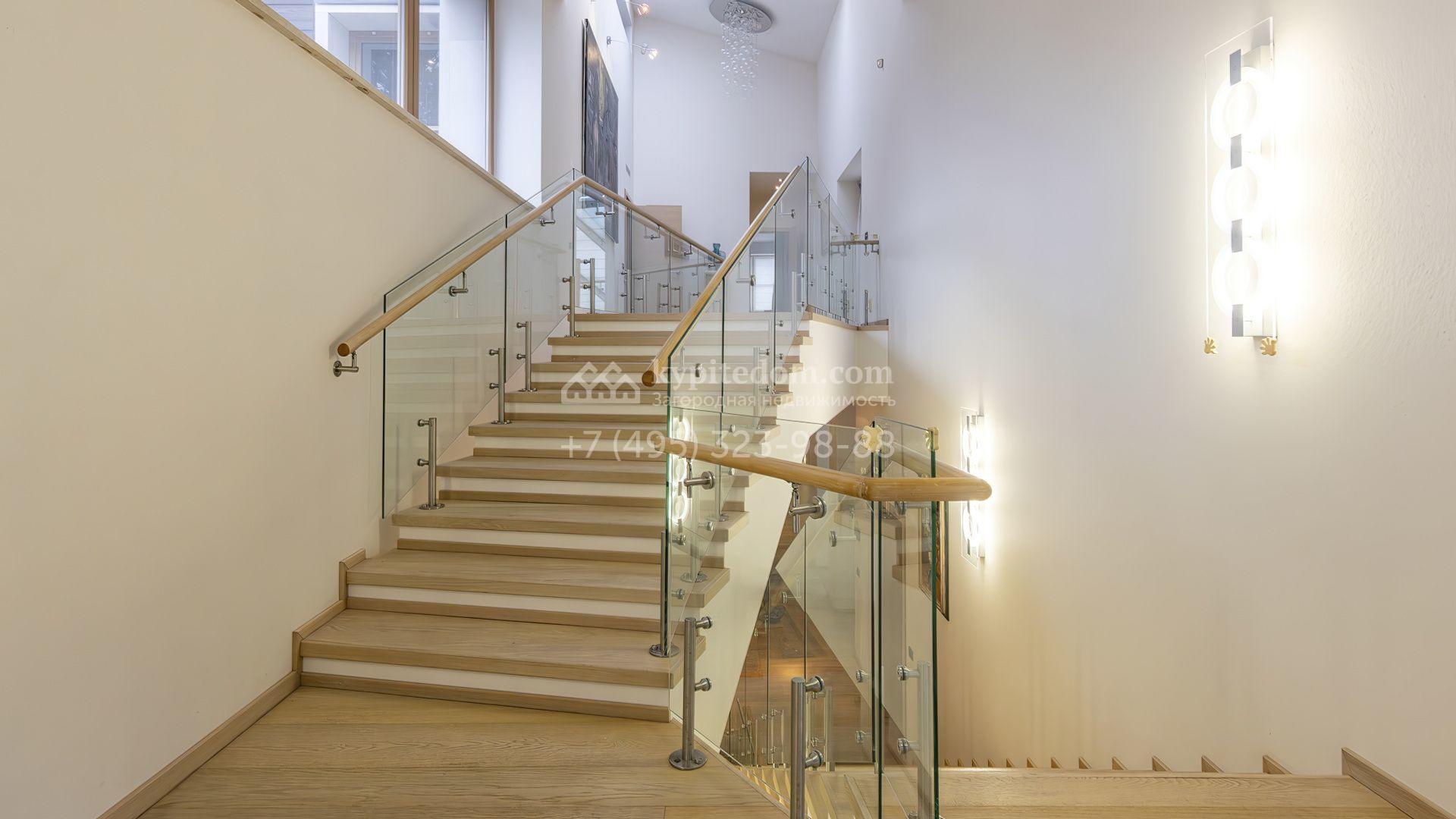 Двухэтажная резиденция площадью 1636 м² расположена на участке площадью 60 соток. Фасад здания выделяется контрастной фактурой — светлый камень и темная древесина сдержанно сочетают скандинавский стиль с современностью. Интерьеры оформлены в стиле минимализм, где живопись и скульптуры становятся ключевыми элементами декора. Из просторной гостиной-библиотеки с двойным светом открывается живописный вид на окружающий лес.