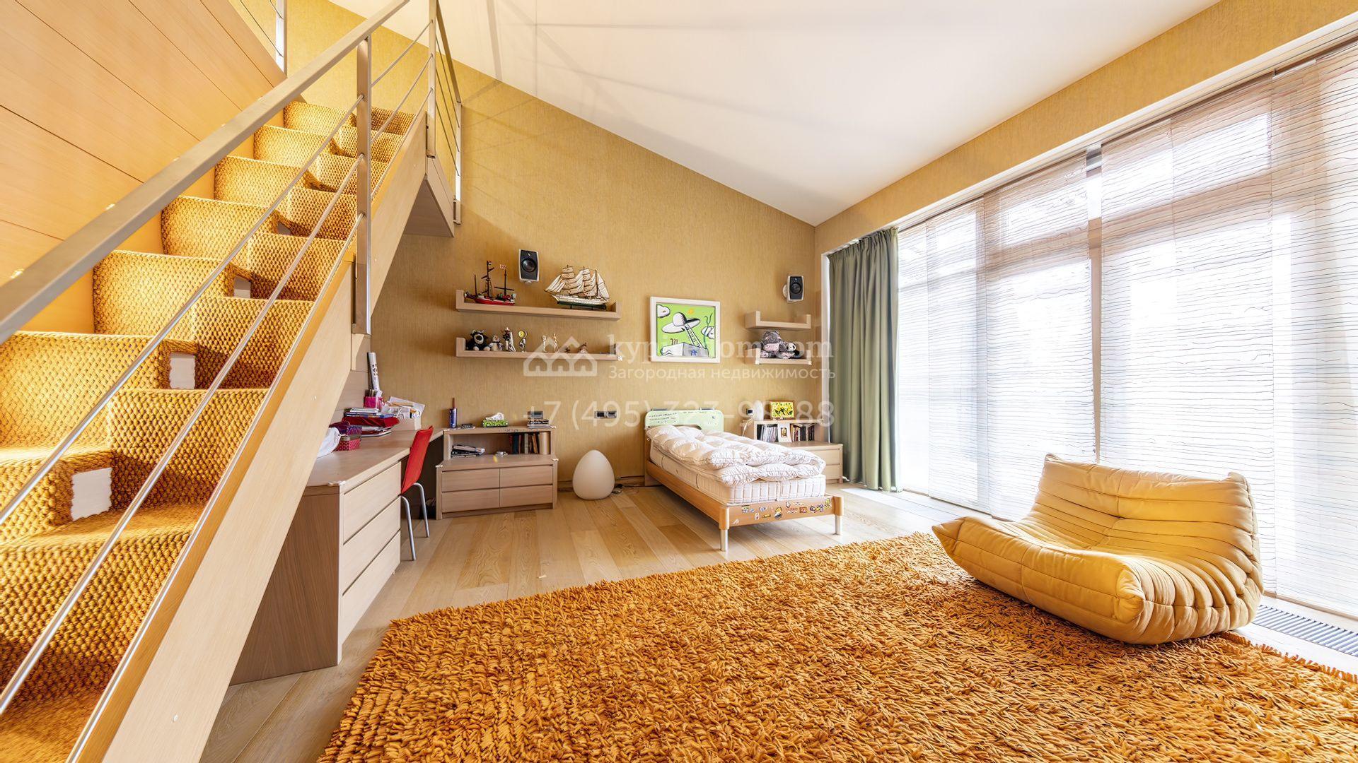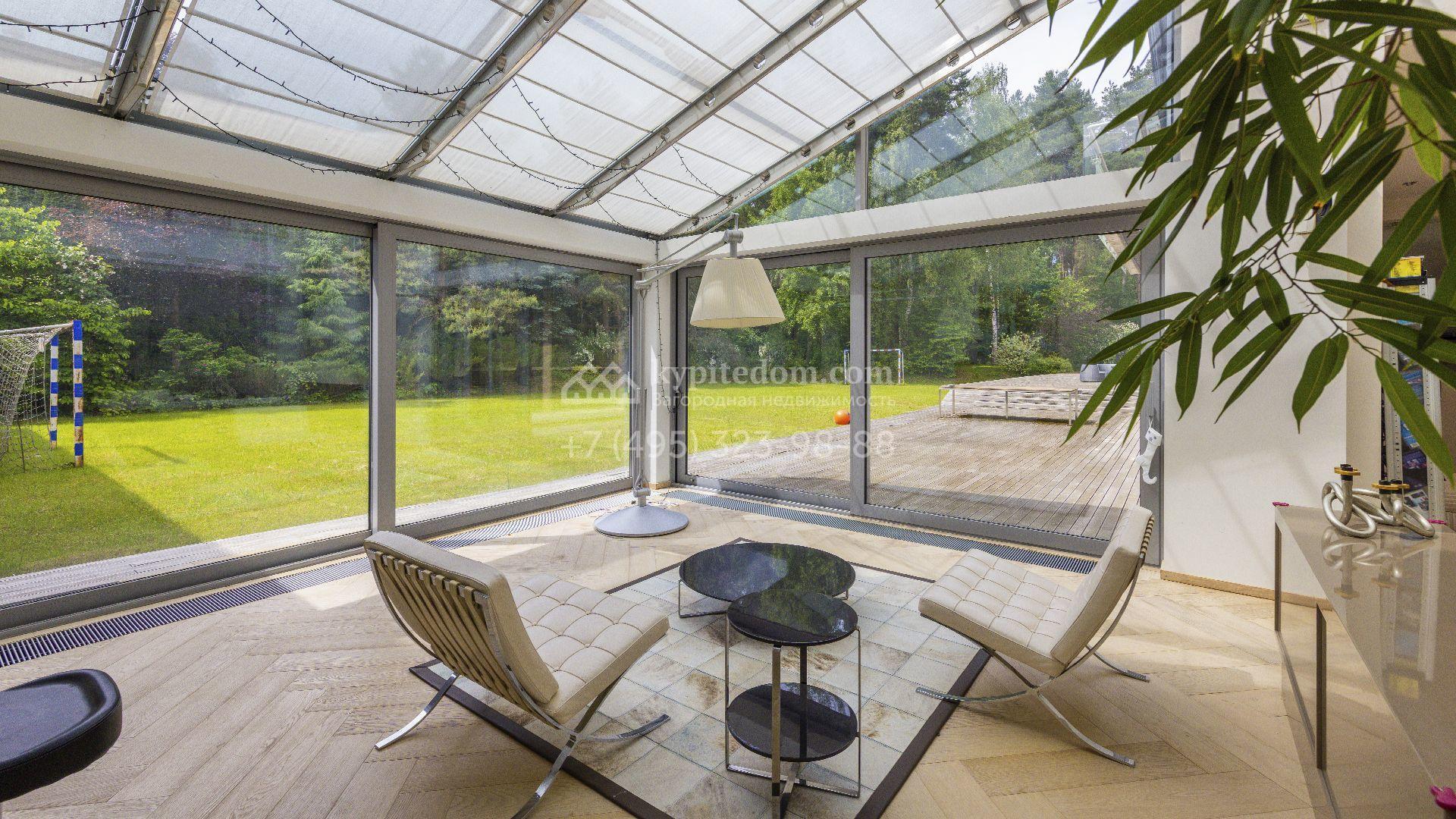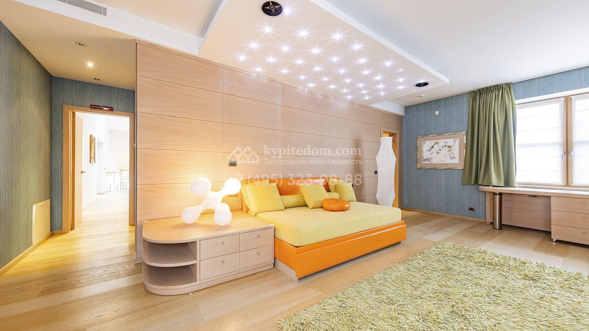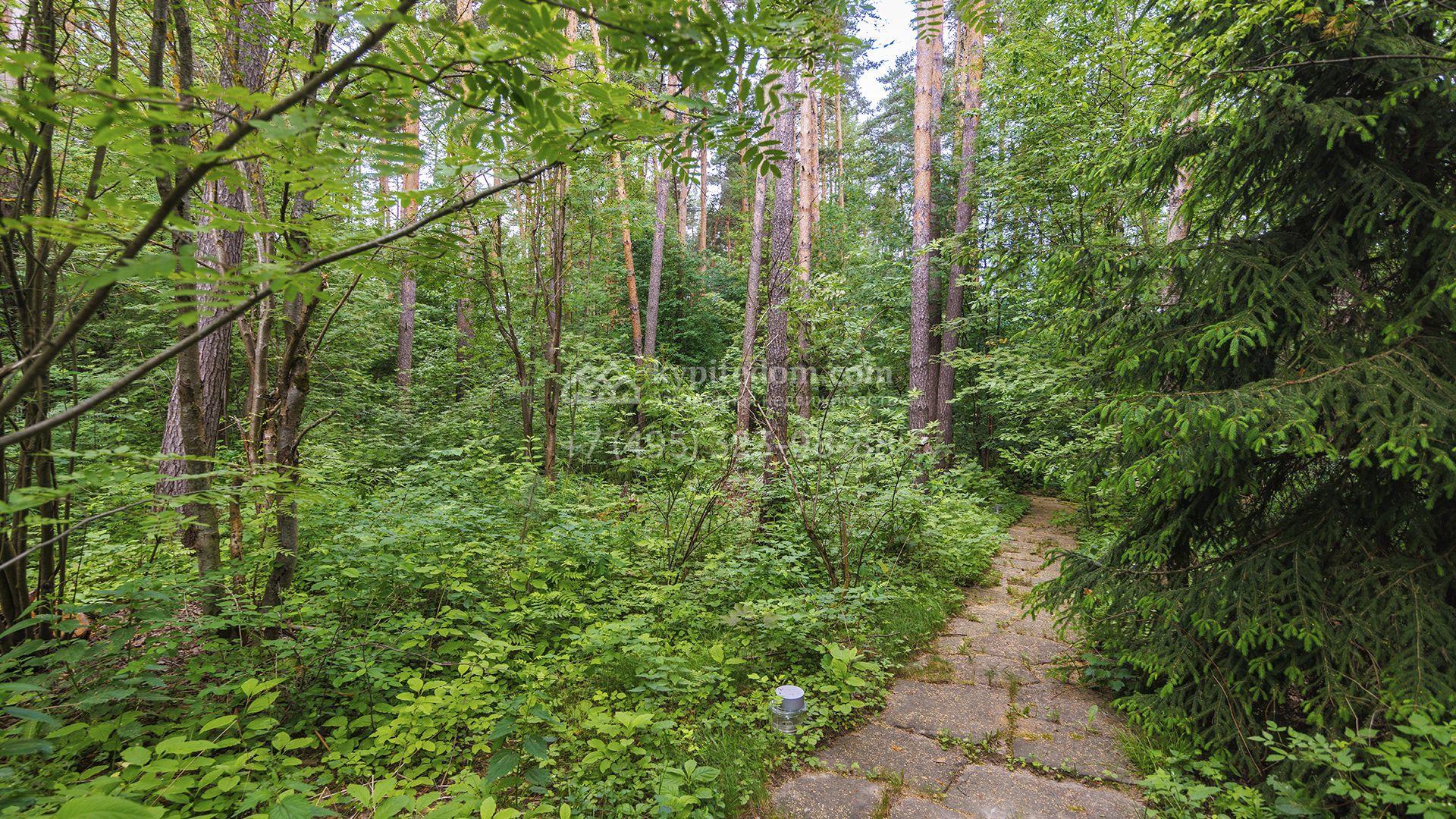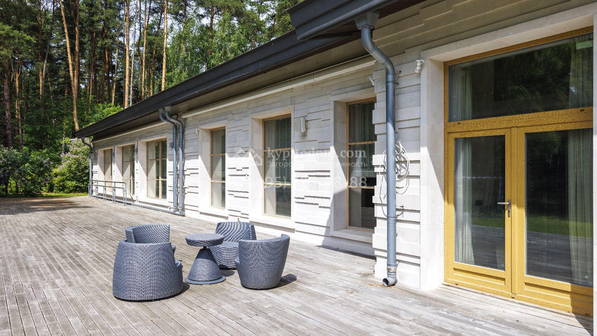 Двухэтажная резиденция площадью 1636 м² расположена на участке площадью 60 соток. Фасад здания выделяется контрастной фактурой — светлый камень и темная древесина сдержанно сочетают скандинавский стиль с современностью. Интерьеры оформлены в стиле минимализм, где живопись и скульптуры становятся ключевыми элементами декора. Из просторной гостиной-библиотеки с двойным светом открывается живописный вид на окружающий лес.