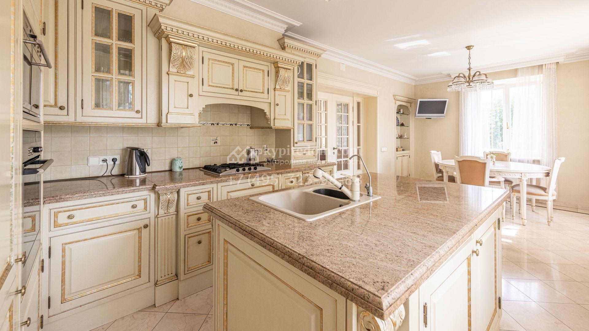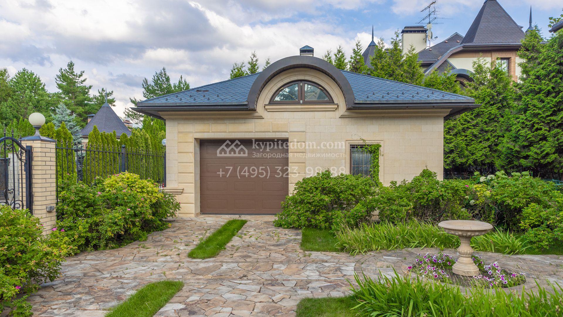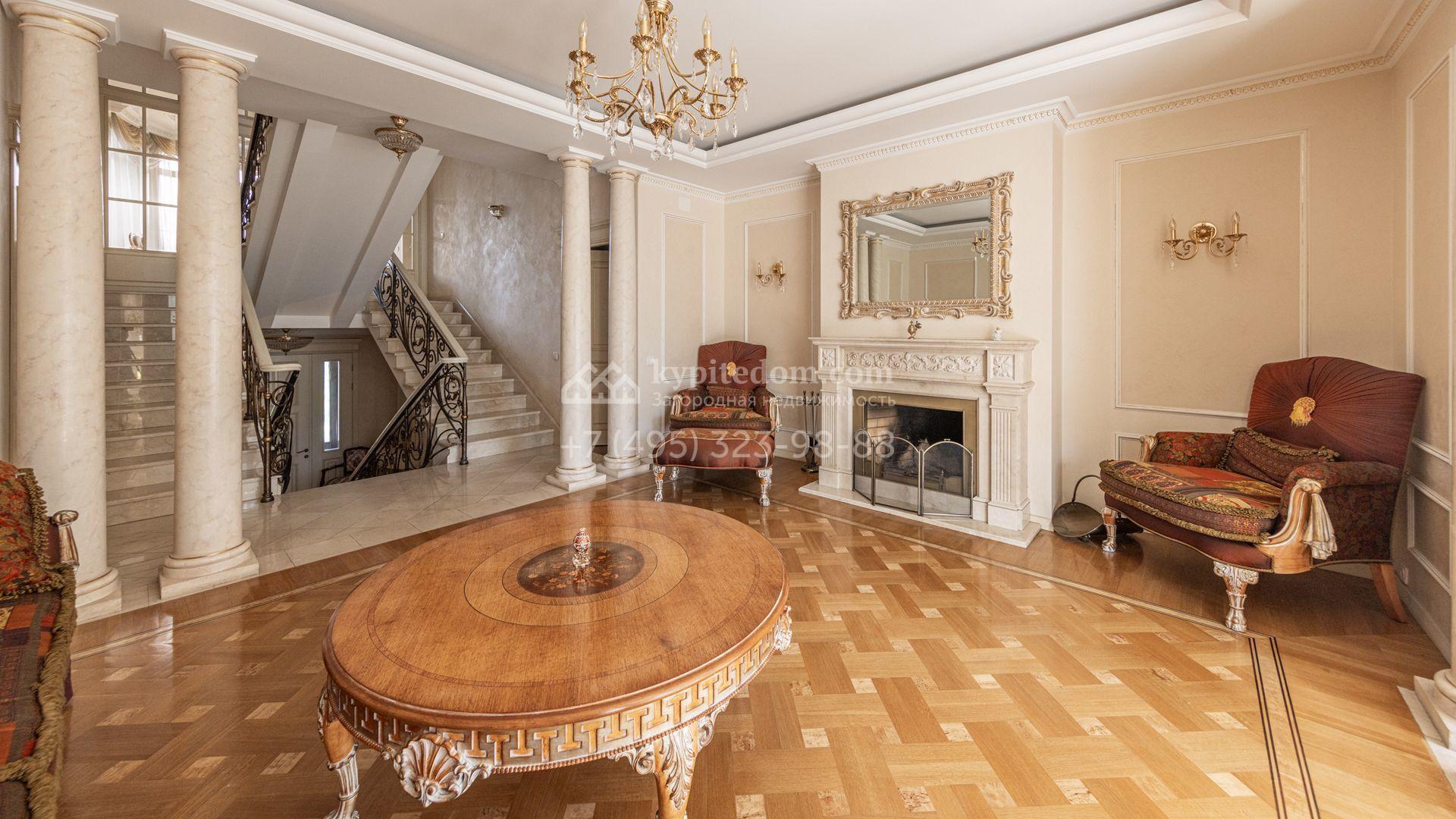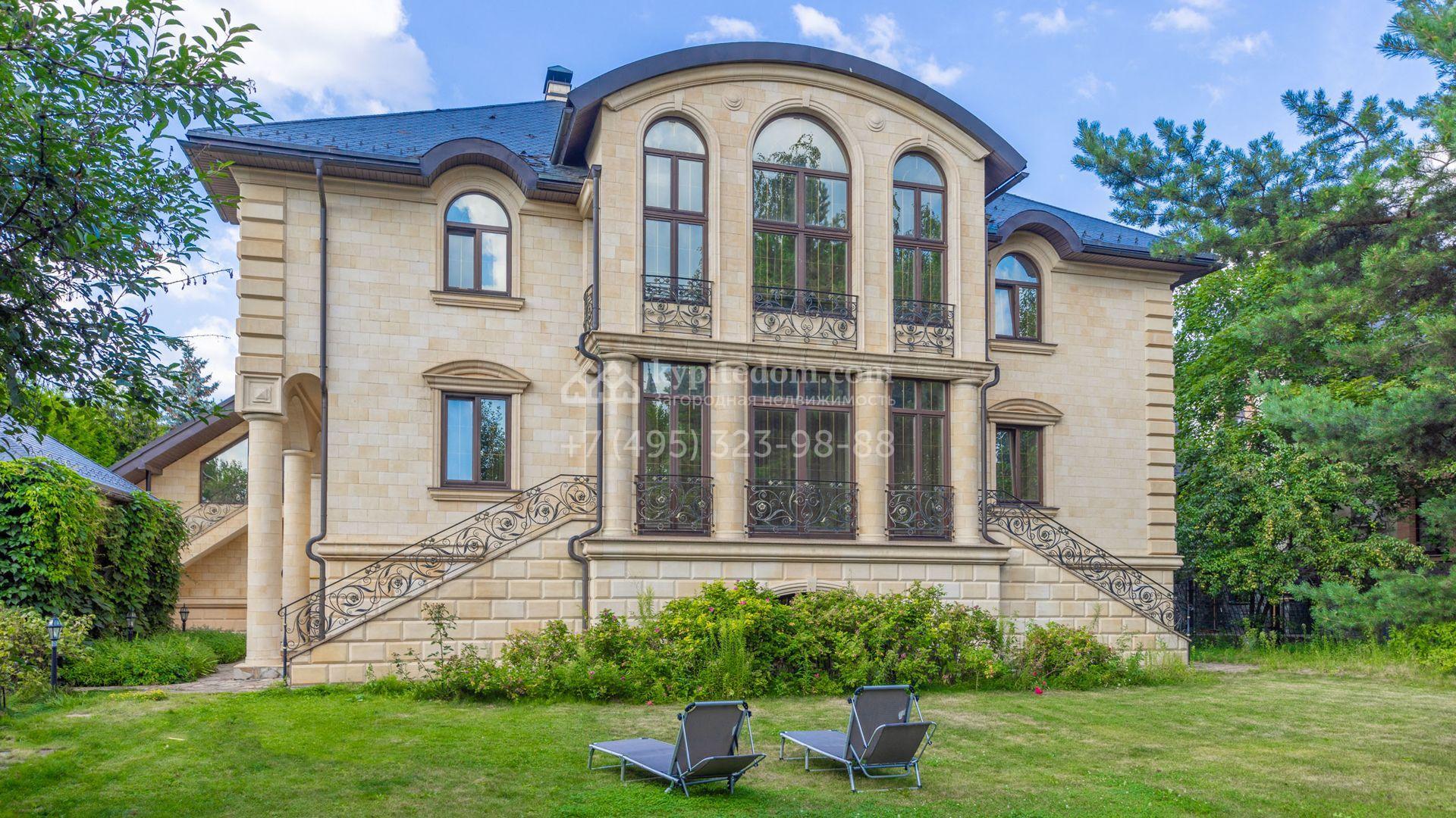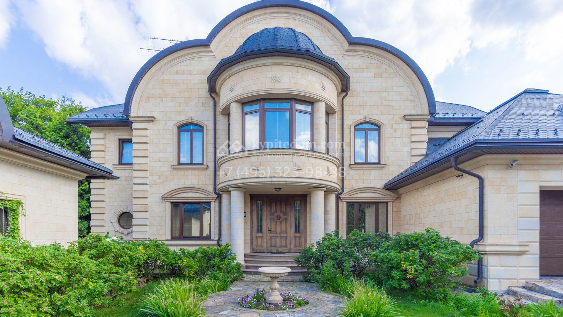 Загородный дом площадью 660 м² расположен на участке 15 соток с ландшафтным дизайном. Необычный фасад облицован бежевой клинкерной плиткой, украшен колоннами и рустовкой. Интерьер в классическом стиле выполнен в теплых тонах, в отделке использованы мрамор, дуб и карельская береза, лепнина украшена сусальным золотом. В особняке спланировали 5 спален гостиную с камином и зимним садом, кабинет, кухню-столову, игровую комнату, библиотеку, хамам, сауну и домашний кинотеатр. На участке построили дом для персонала, гараж и беседку, по периметру высадили хвойные деревья, дорожки вымощены из натурального камня.