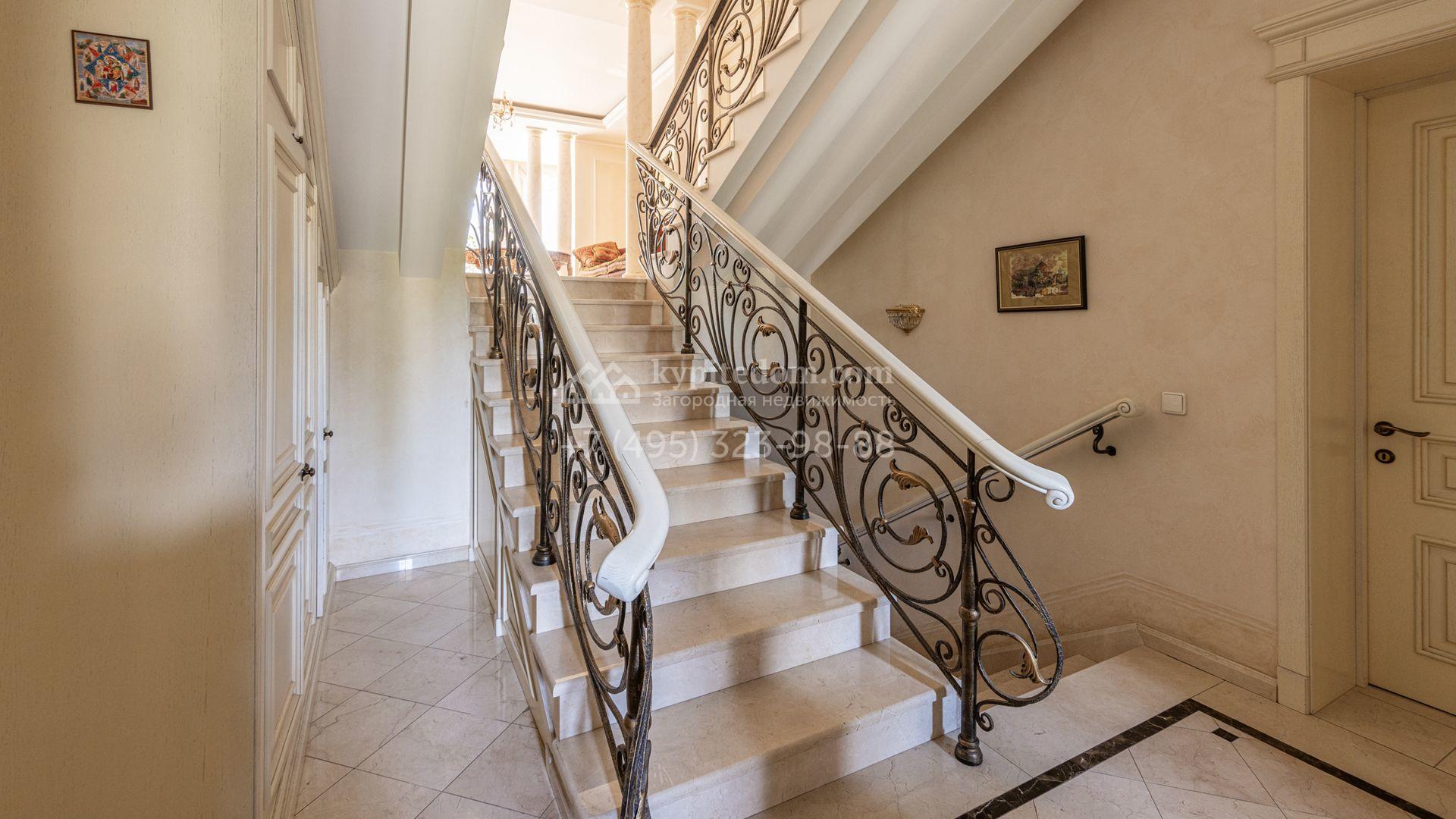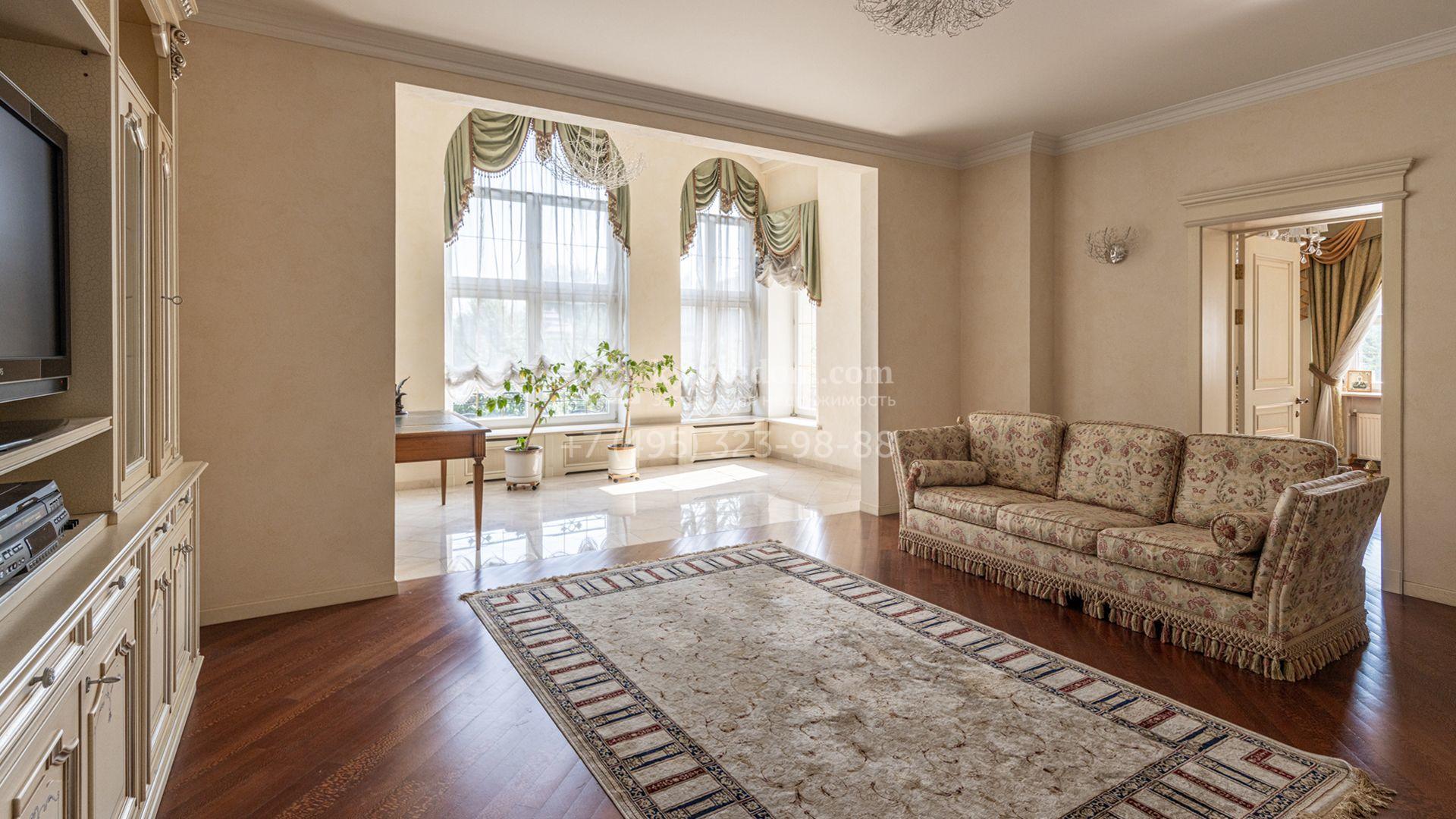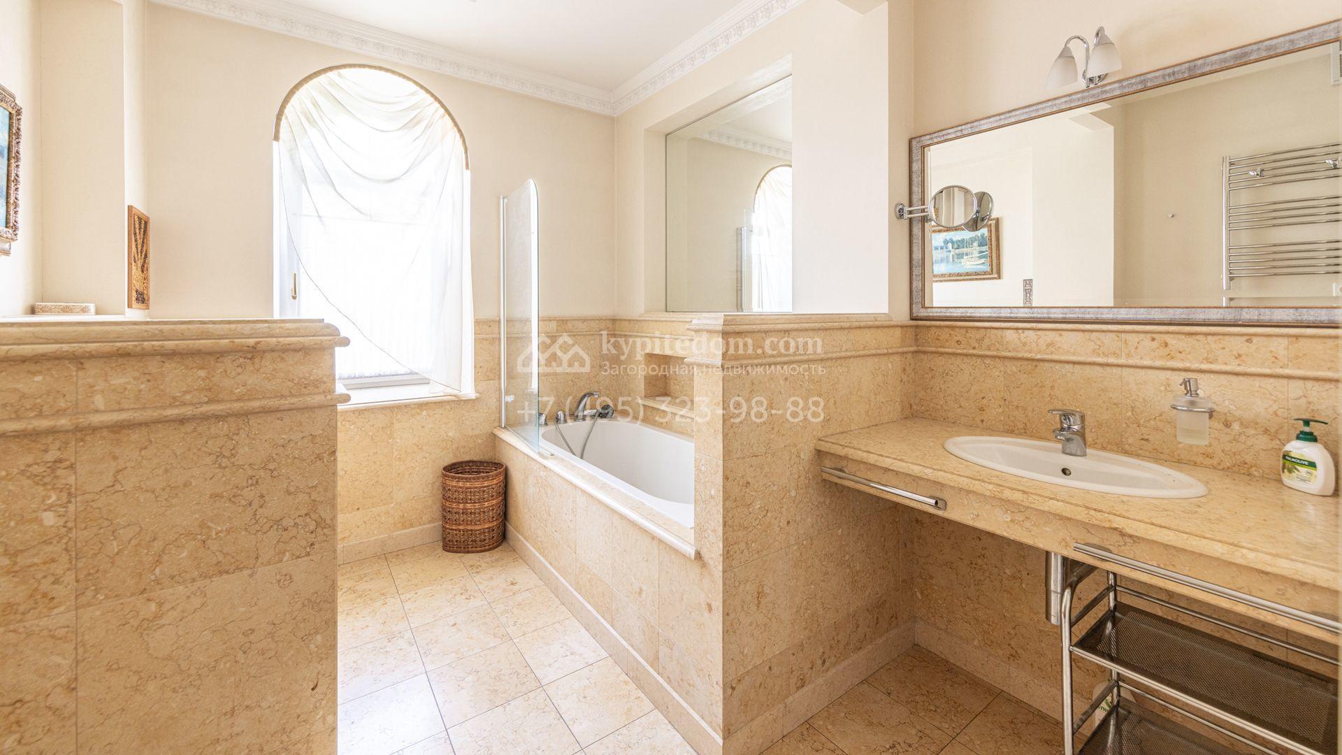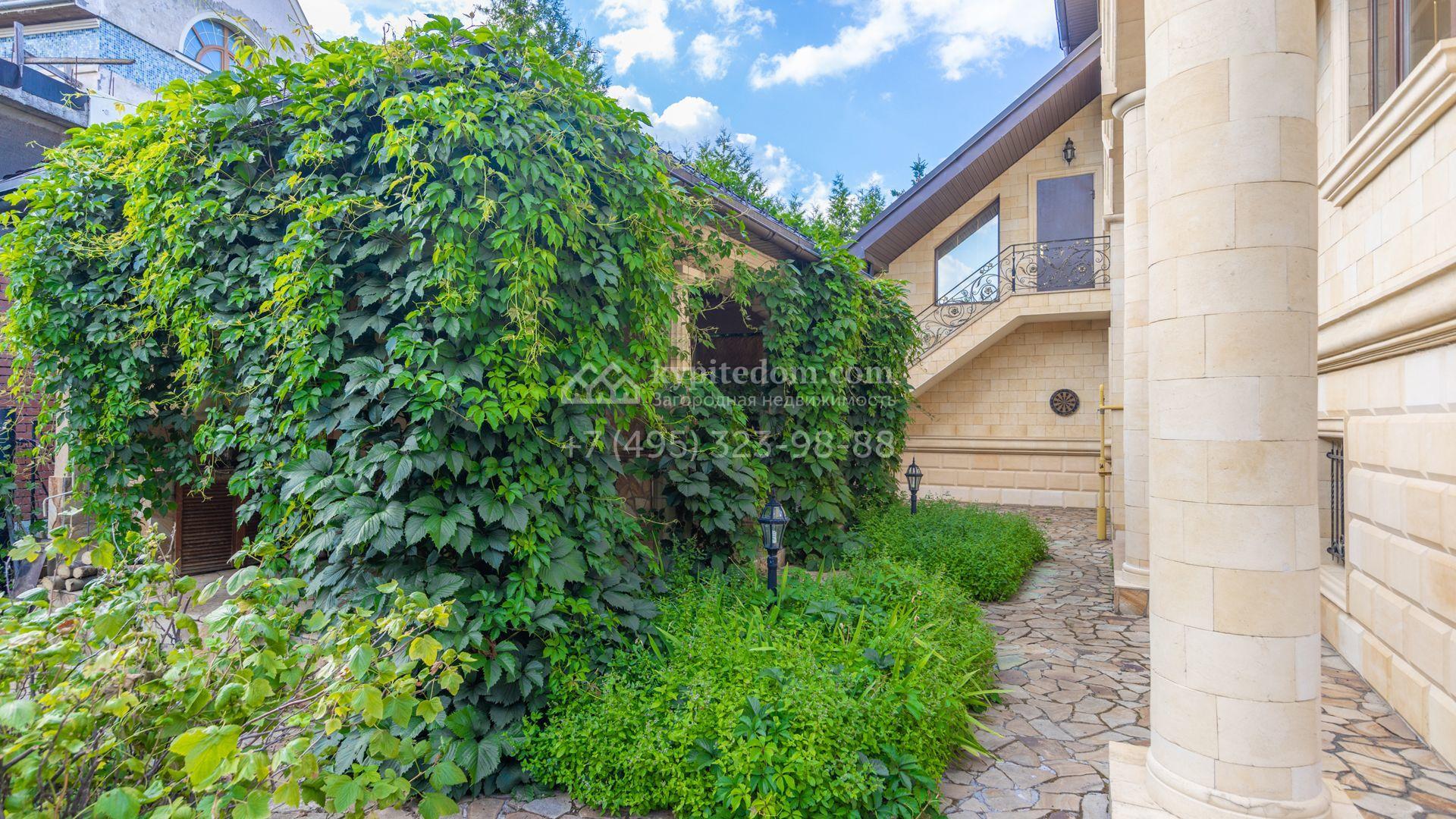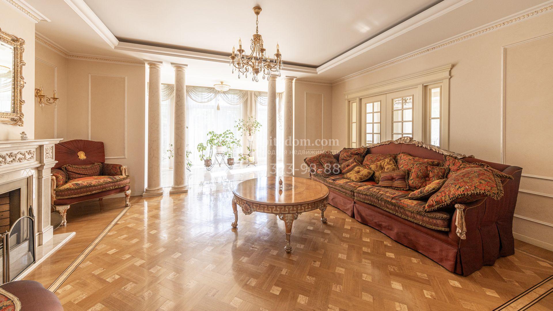 Загородный дом площадью 660 м² расположен на участке 15 соток с ландшафтным дизайном. Необычный фасад облицован бежевой клинкерной плиткой, украшен колоннами и рустовкой. Интерьер в классическом стиле выполнен в теплых тонах, в отделке использованы мрамор, дуб и карельская береза, лепнина украшена сусальным золотом. В особняке спланировали 5 спален гостиную с камином и зимним садом, кабинет, кухню-столову, игровую комнату, библиотеку, хамам, сауну и домашний кинотеатр. На участке построили дом для персонала, гараж и беседку, по периметру высадили хвойные деревья, дорожки вымощены из натурального камня.