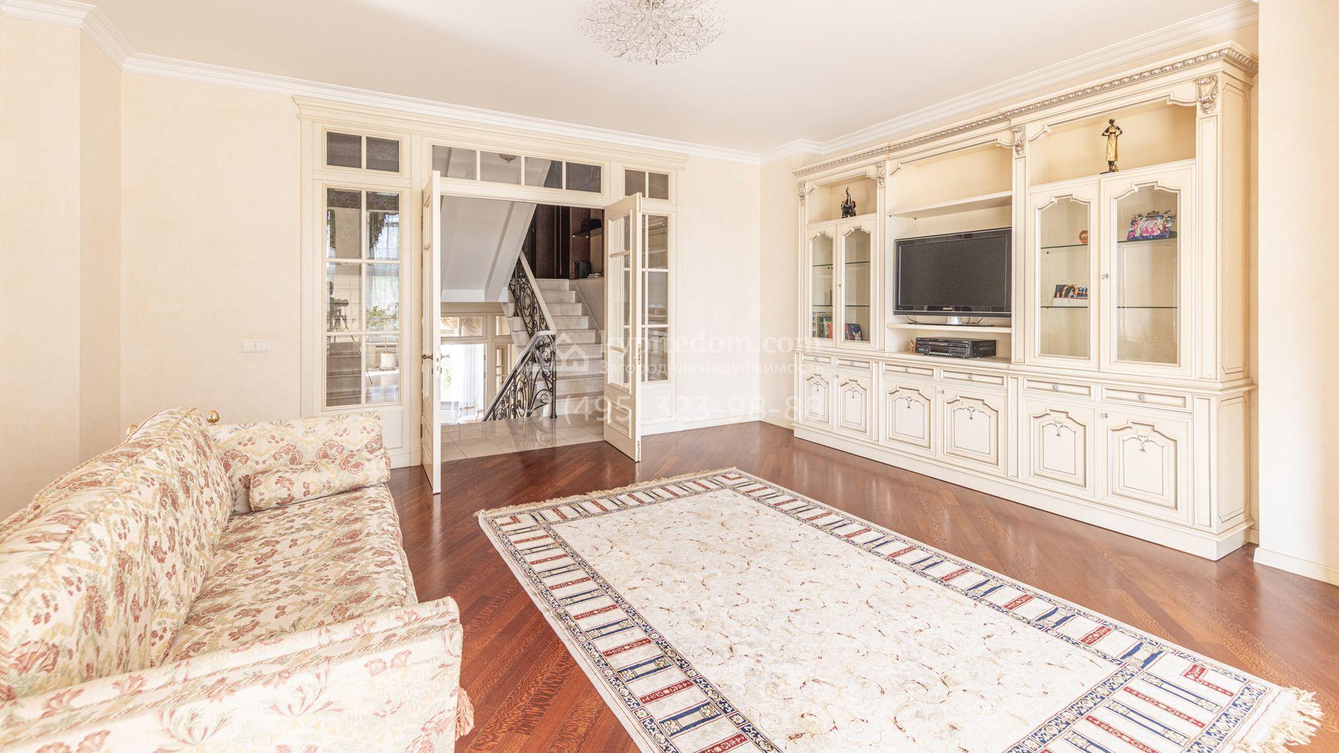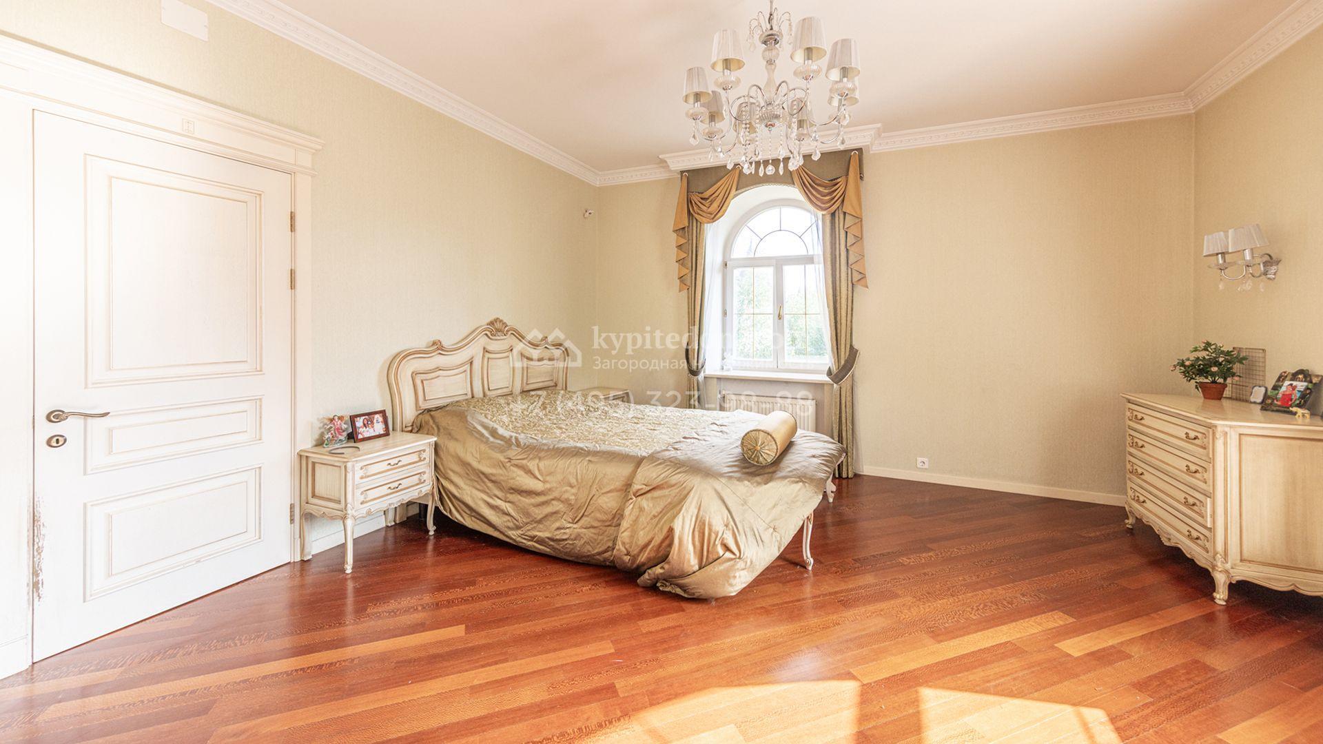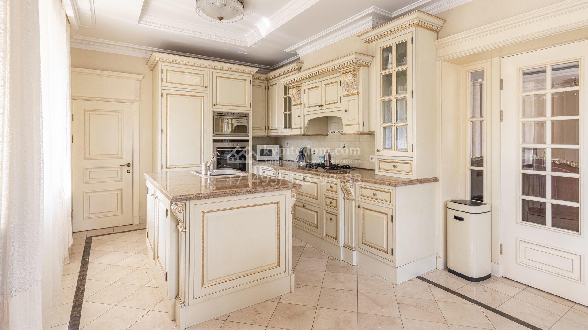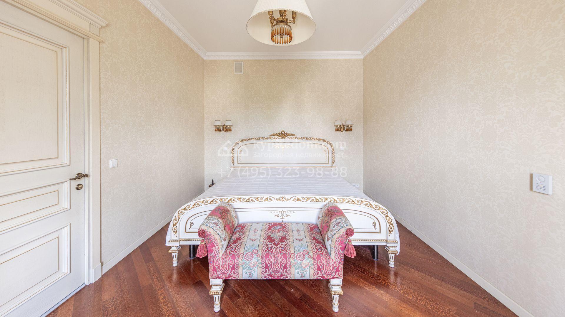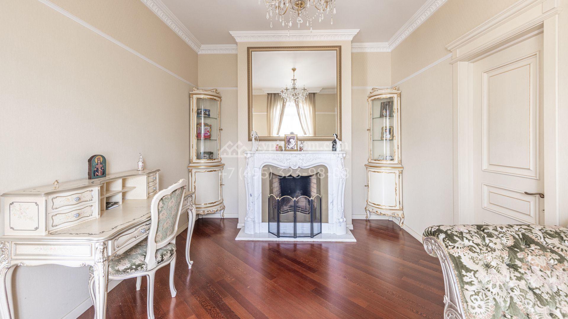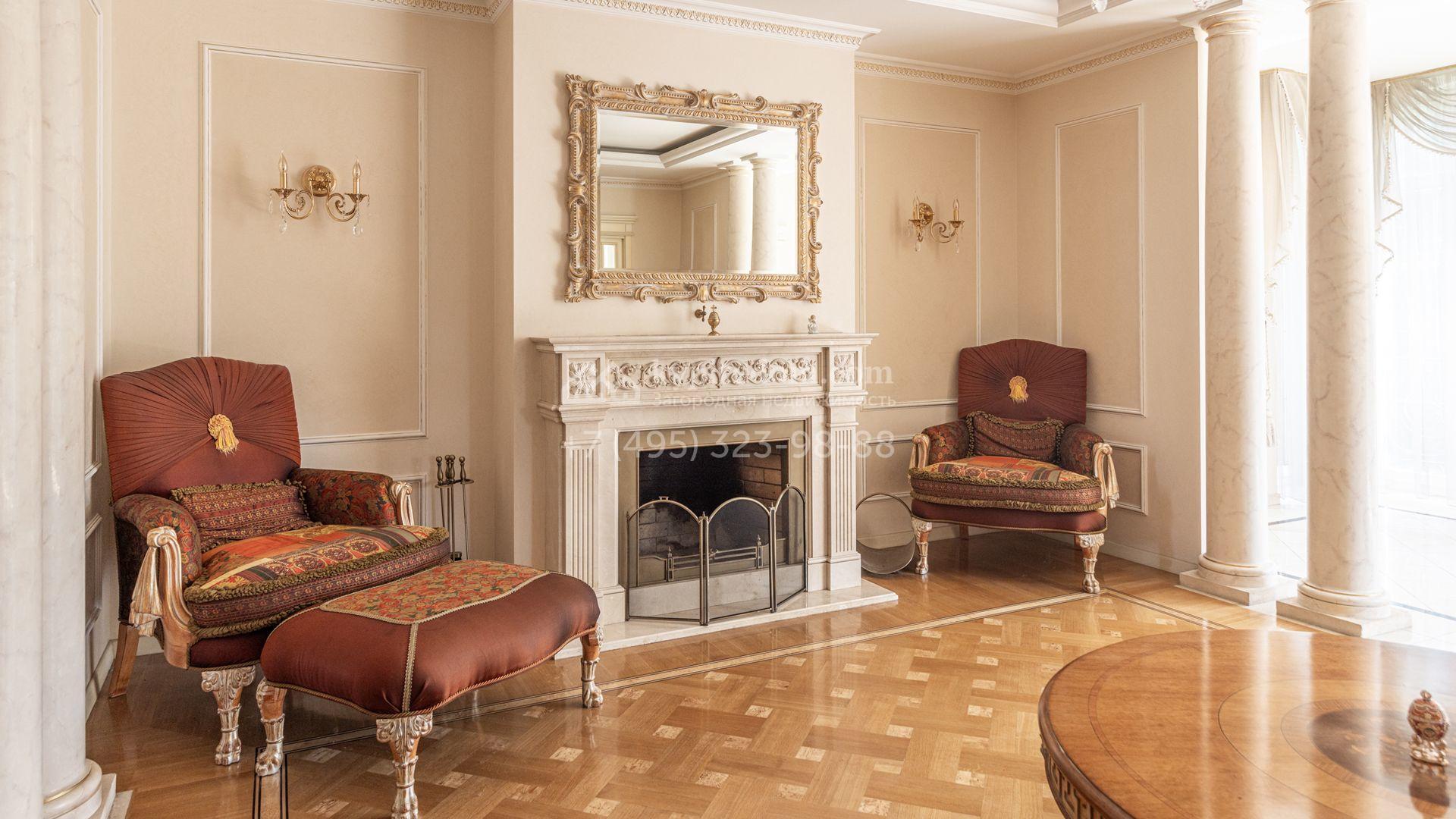 Загородный дом площадью 660 м² расположен на участке 15 соток с ландшафтным дизайном. Необычный фасад облицован бежевой клинкерной плиткой, украшен колоннами и рустовкой. Интерьер в классическом стиле выполнен в теплых тонах, в отделке использованы мрамор, дуб и карельская береза, лепнина украшена сусальным золотом. В особняке спланировали 5 спален гостиную с камином и зимним садом, кабинет, кухню-столову, игровую комнату, библиотеку, хамам, сауну и домашний кинотеатр. На участке построили дом для персонала, гараж и беседку, по периметру высадили хвойные деревья, дорожки вымощены из натурального камня.