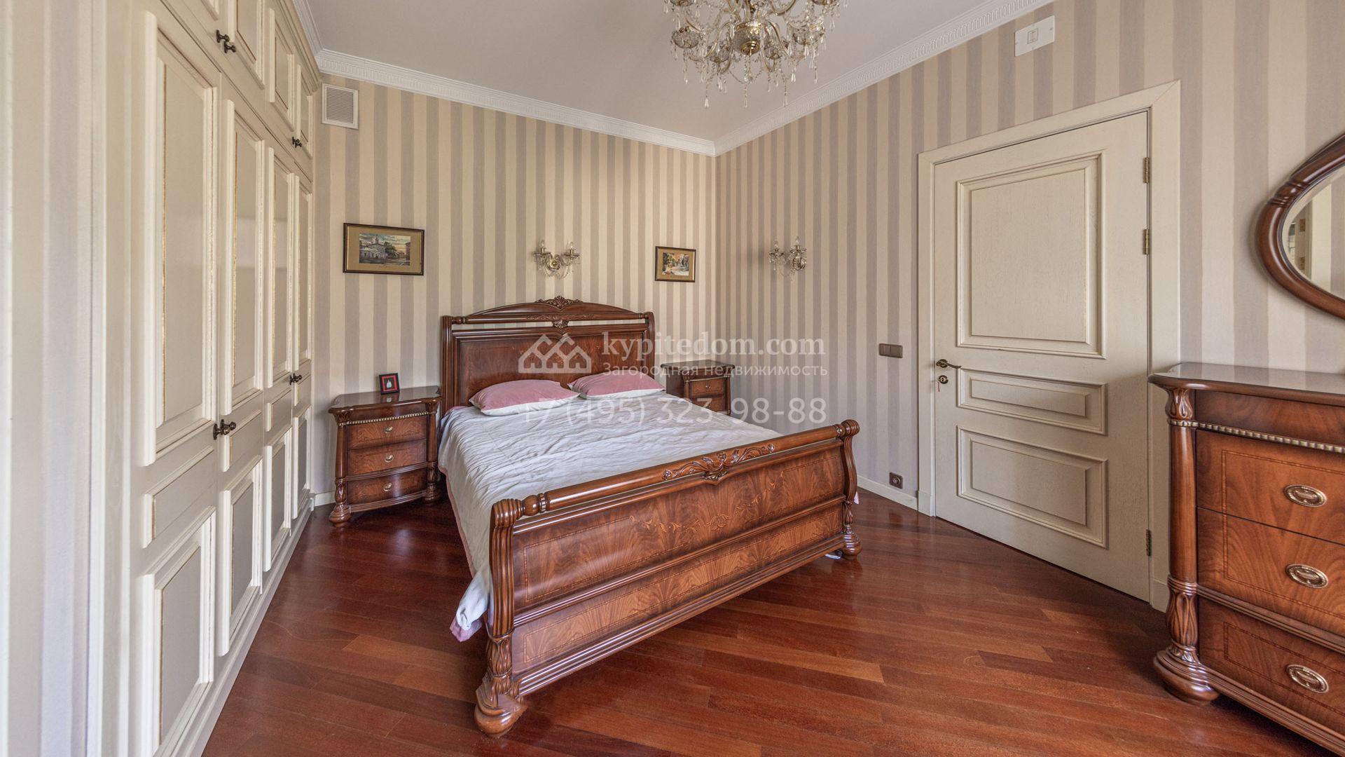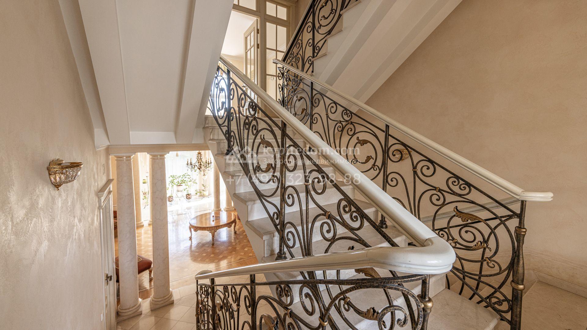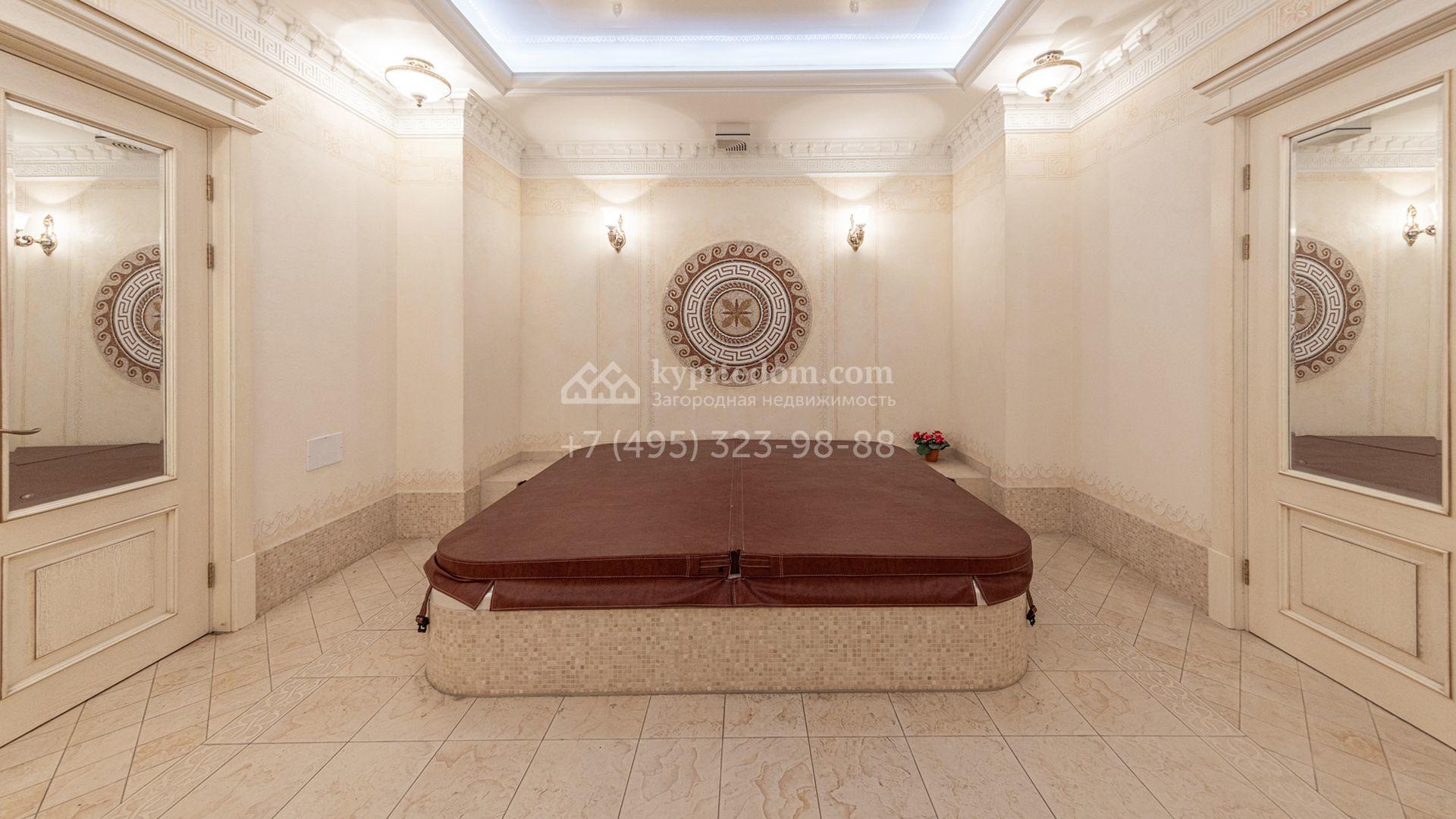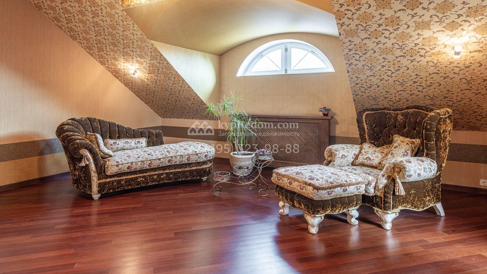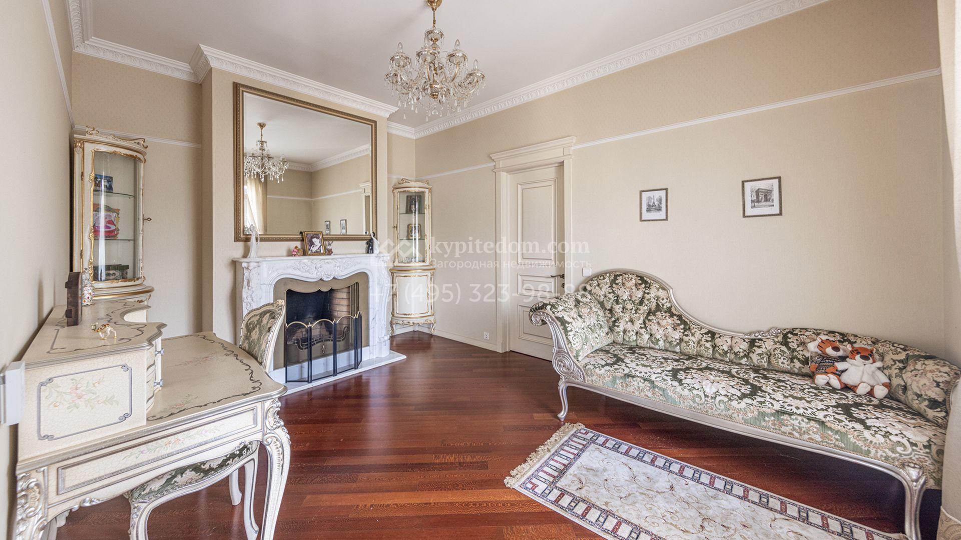 Загородный дом площадью 660 м² расположен на участке 15 соток с ландшафтным дизайном. Необычный фасад облицован бежевой клинкерной плиткой, украшен колоннами и рустовкой. Интерьер в классическом стиле выполнен в теплых тонах, в отделке использованы мрамор, дуб и карельская береза, лепнина украшена сусальным золотом. В особняке спланировали 5 спален гостиную с камином и зимним садом, кабинет, кухню-столову, игровую комнату, библиотеку, хамам, сауну и домашний кинотеатр. На участке построили дом для персонала, гараж и беседку, по периметру высадили хвойные деревья, дорожки вымощены из натурального камня.