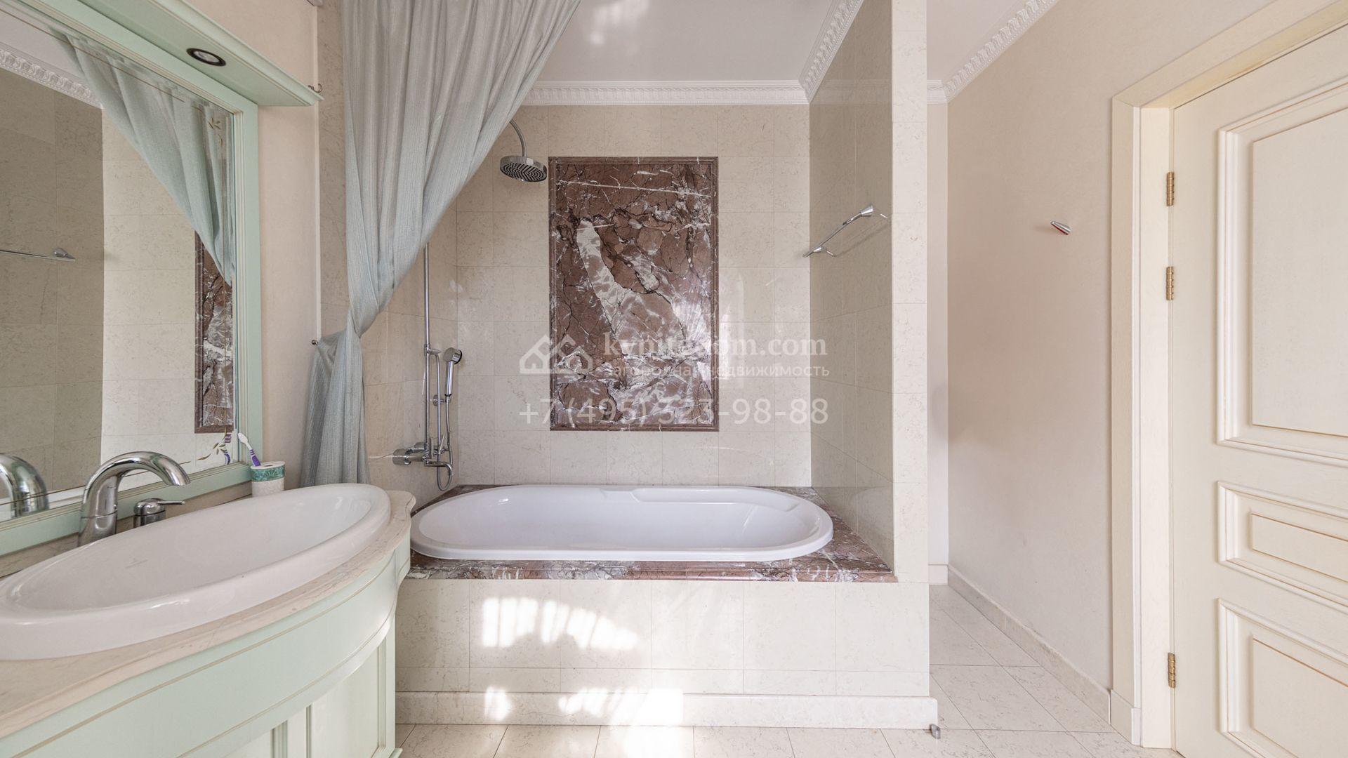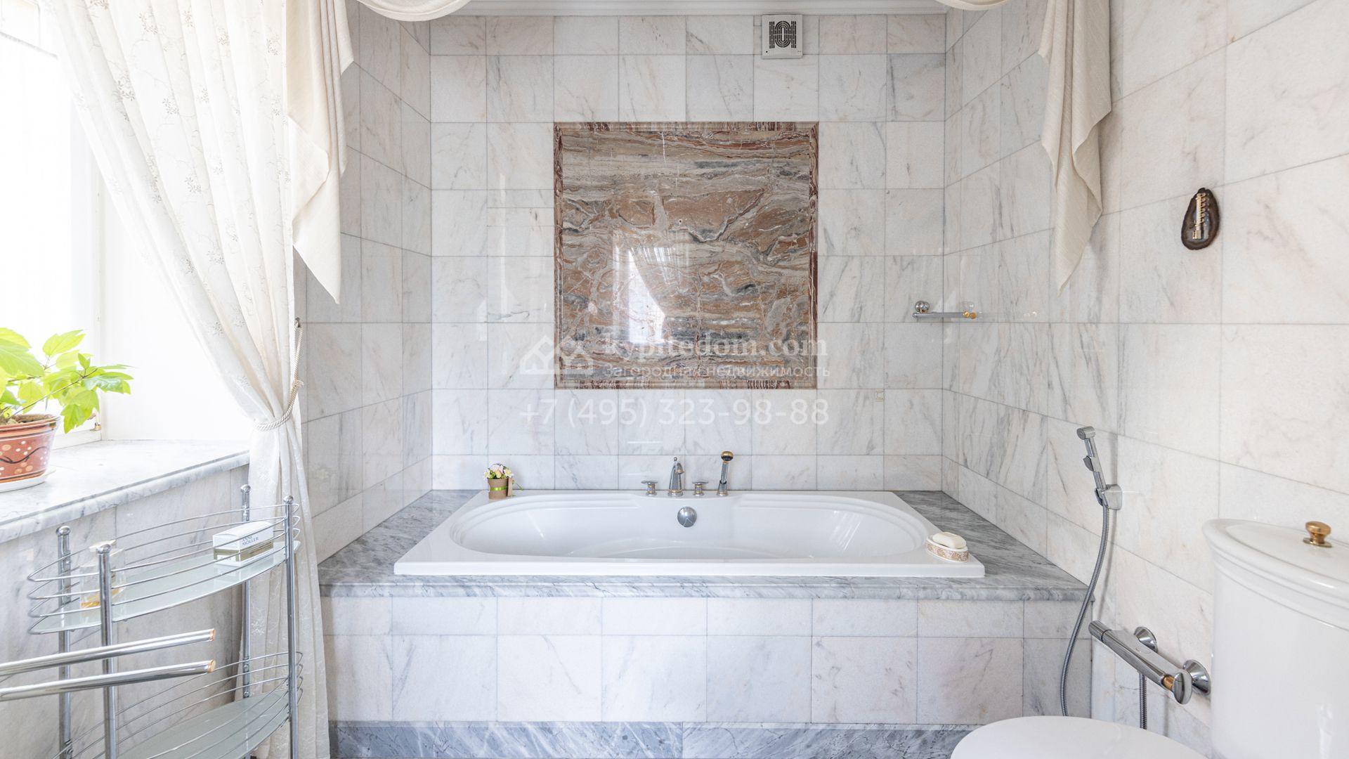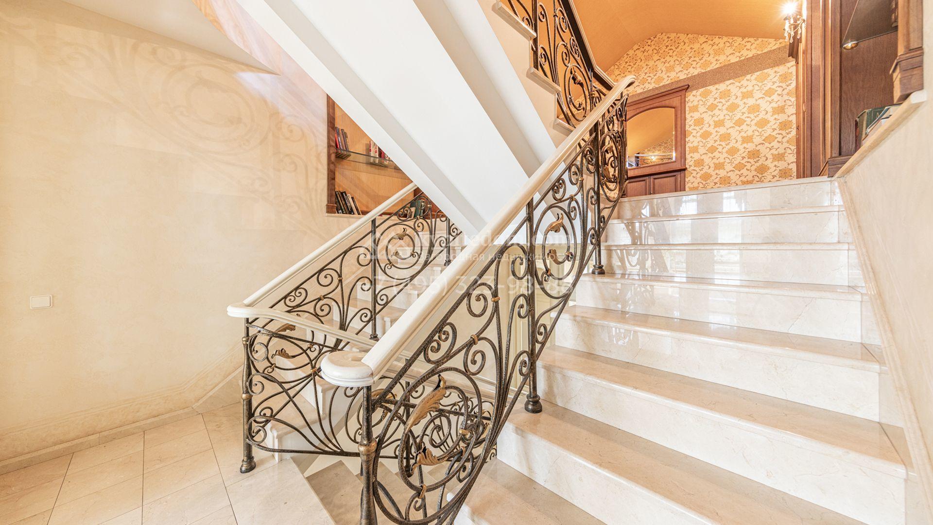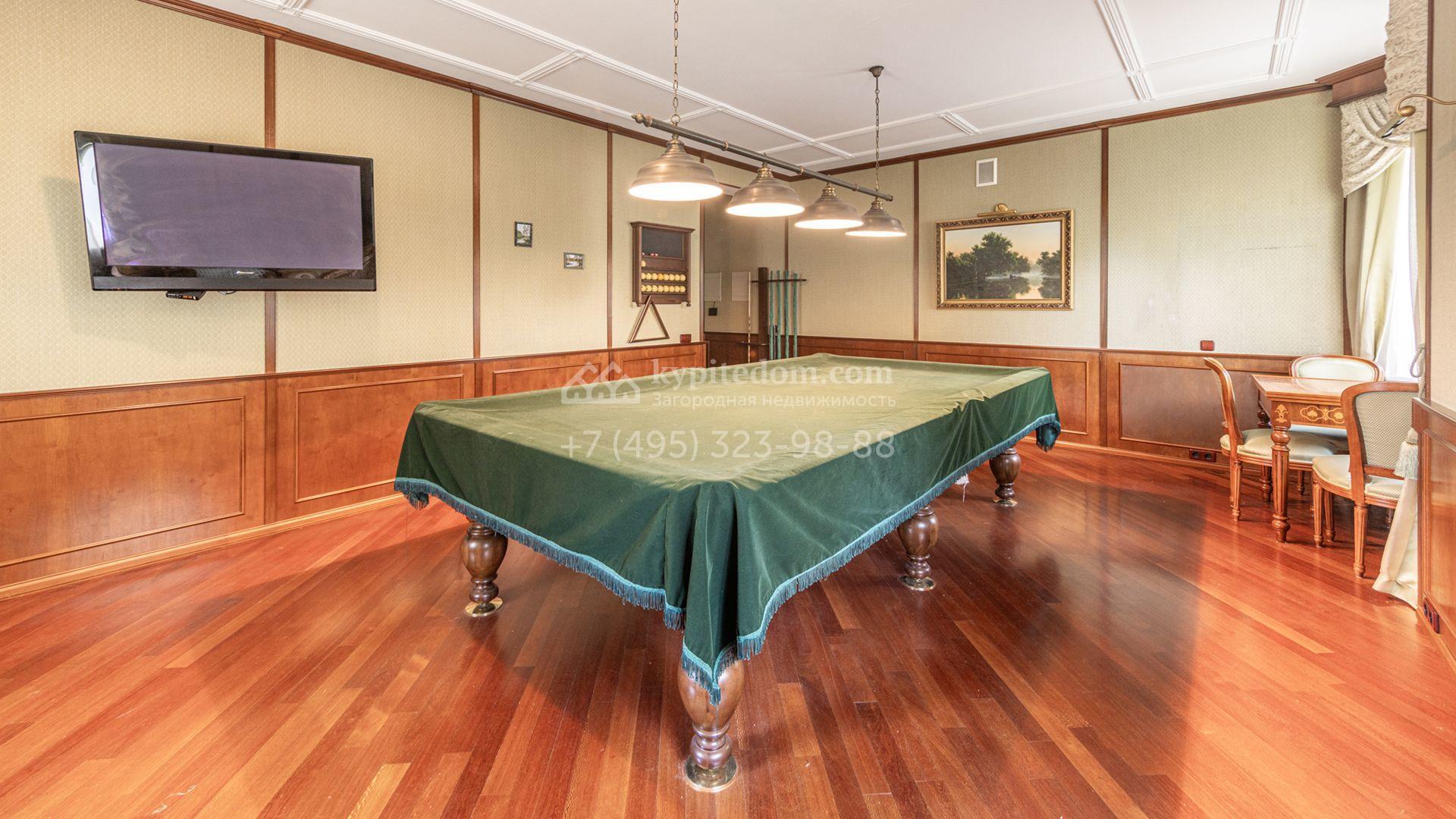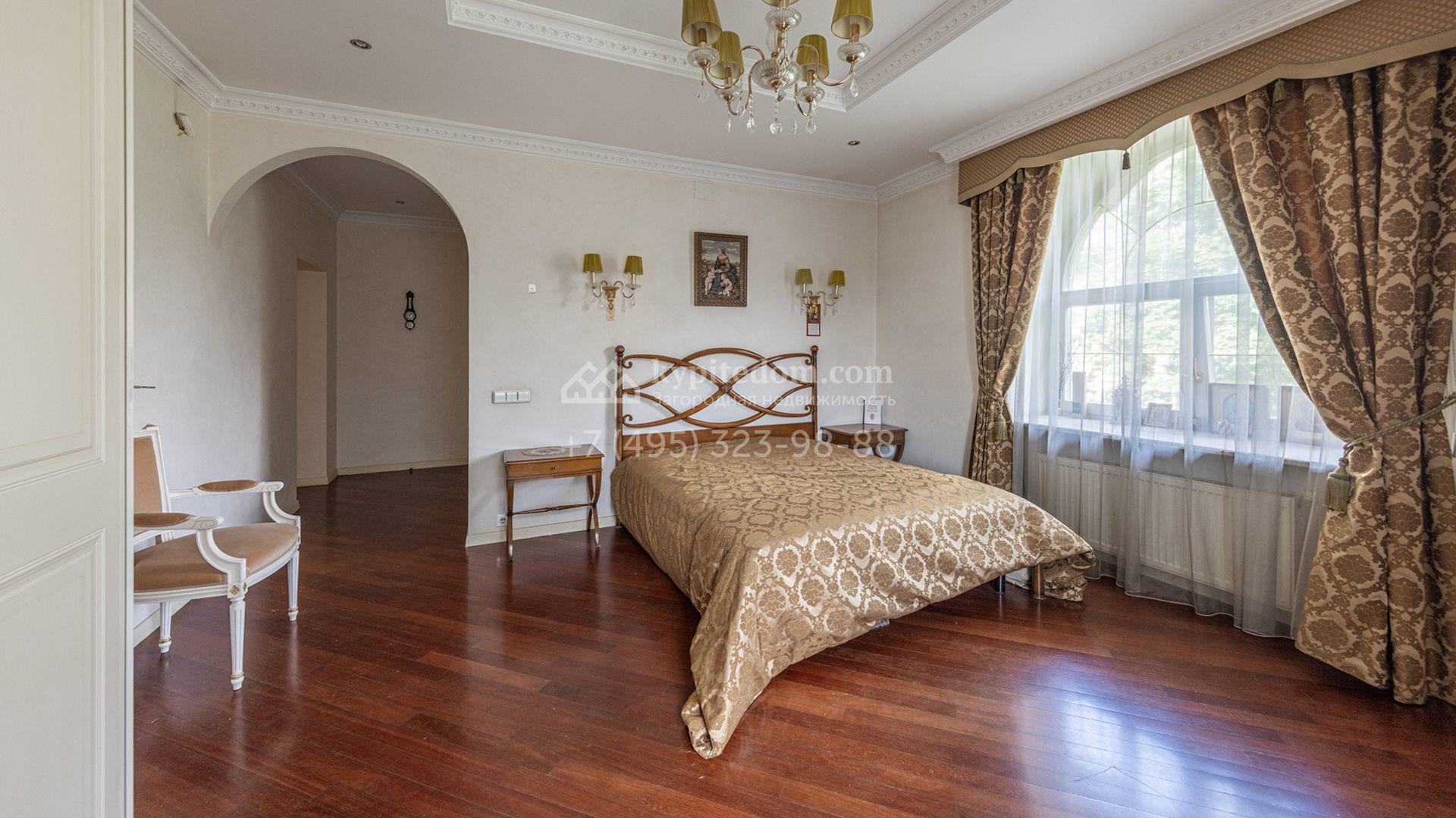 Загородный дом площадью 660 м² расположен на участке 15 соток с ландшафтным дизайном. Необычный фасад облицован бежевой клинкерной плиткой, украшен колоннами и рустовкой. Интерьер в классическом стиле выполнен в теплых тонах, в отделке использованы мрамор, дуб и карельская береза, лепнина украшена сусальным золотом. В особняке спланировали 5 спален гостиную с камином и зимним садом, кабинет, кухню-столову, игровую комнату, библиотеку, хамам, сауну и домашний кинотеатр. На участке построили дом для персонала, гараж и беседку, по периметру высадили хвойные деревья, дорожки вымощены из натурального камня.