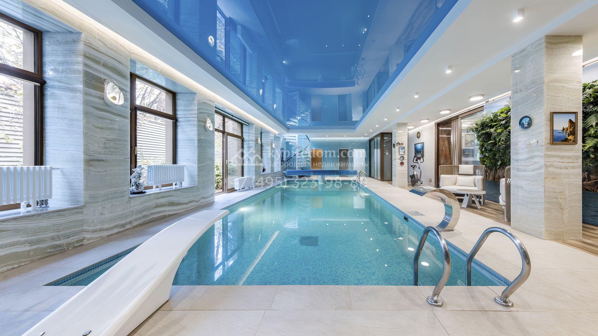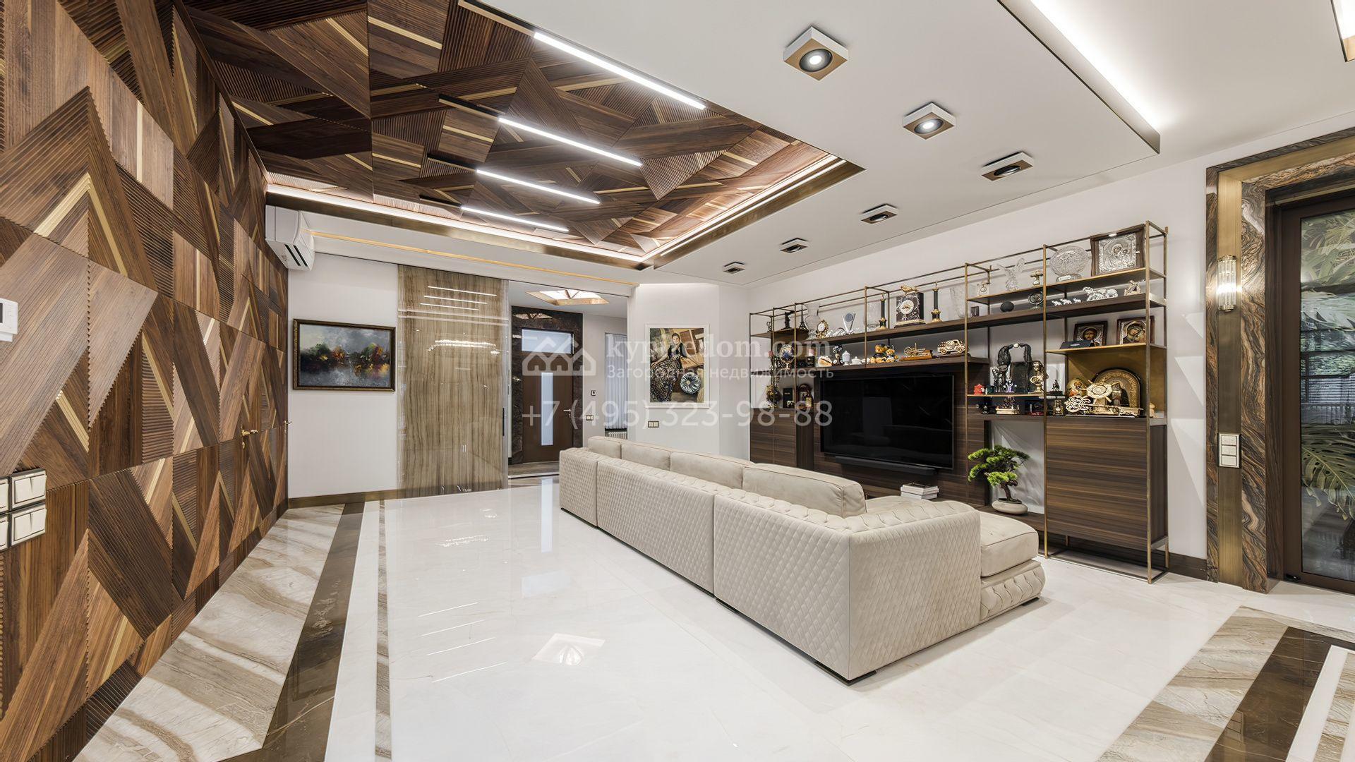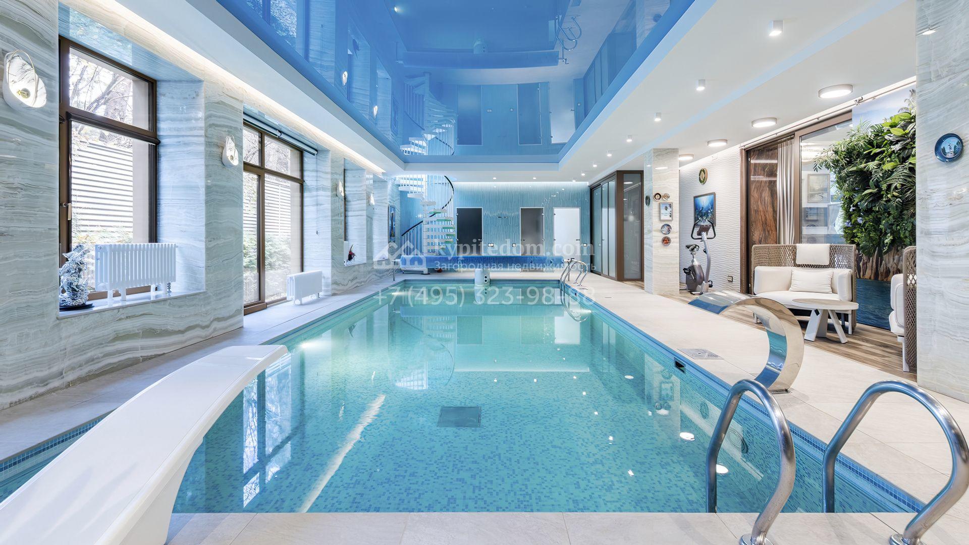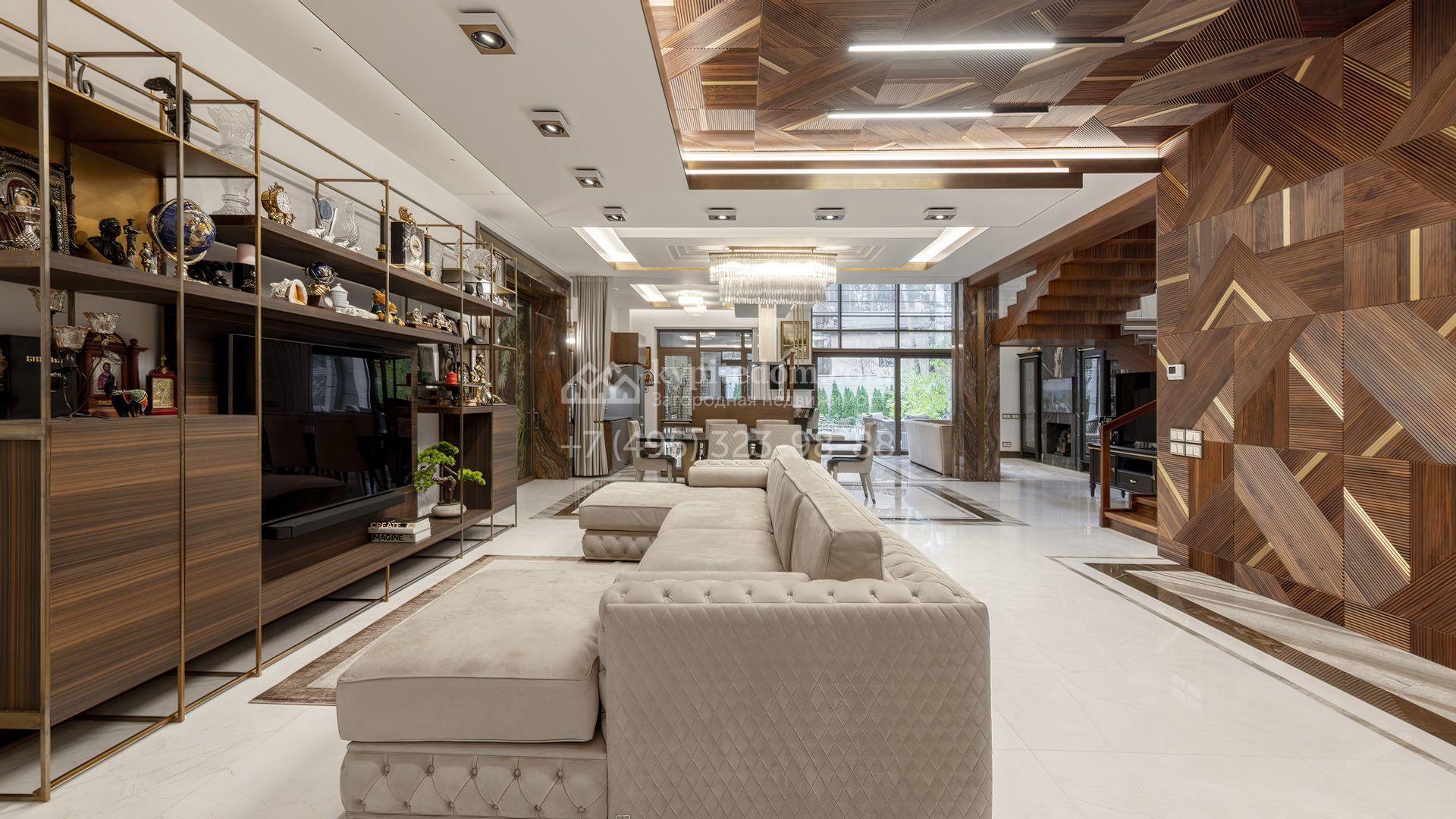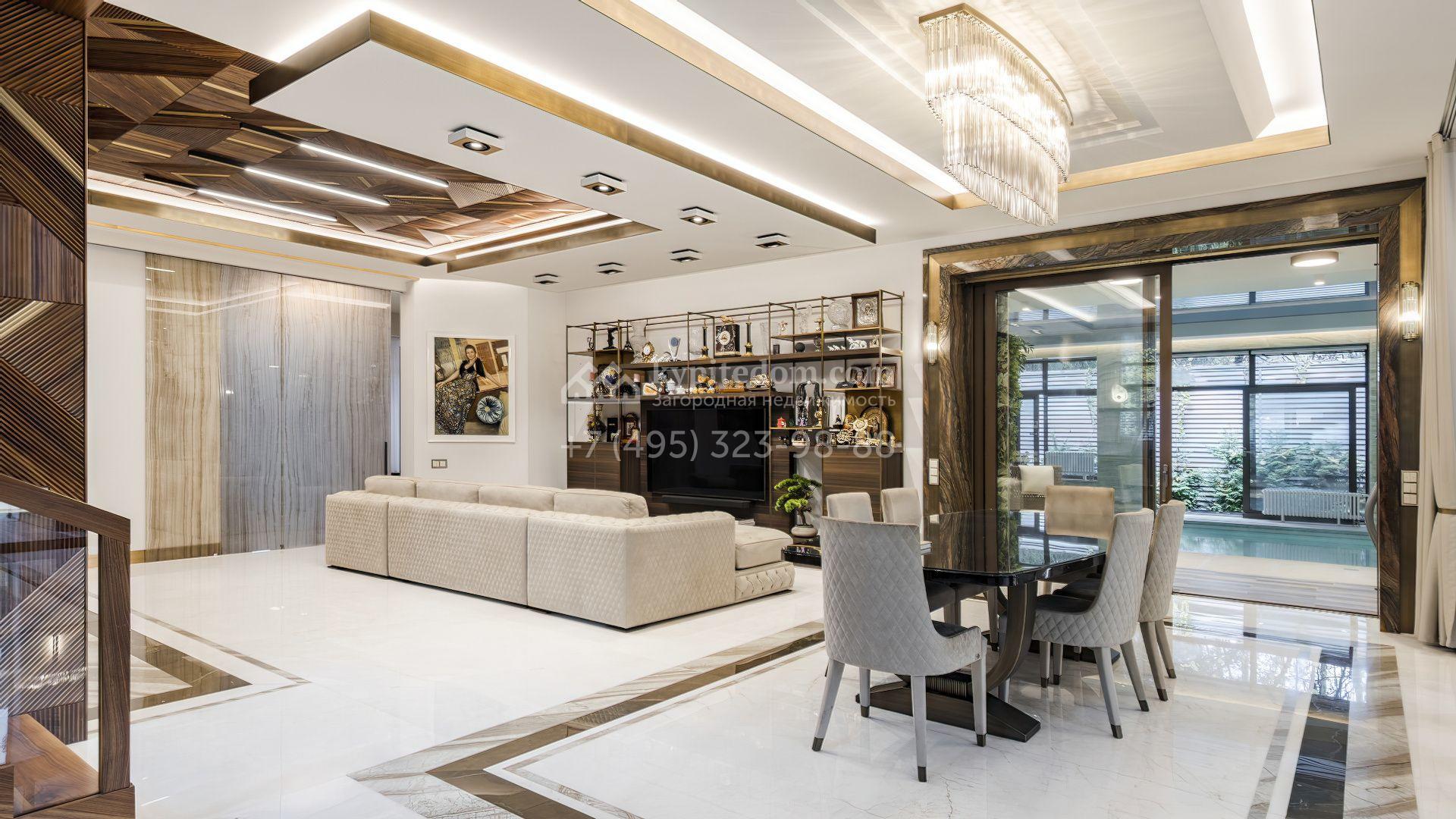 Загородная резиденция с бассейном площадью 875 м² расположен на участке в 24 сотки. Современный фасад в светло-бежевых и серых тонах подчеркивается элементами декоративной подсветки. Внутри выполнена премиальная отделка с использованием натуральных материалов — стены и многоуровневые потолки украшены панелями из ценных пород дерева. Дом оснащен системами для подогрева полов, приточно-вытяжной вентиляцией и кондиционированием.