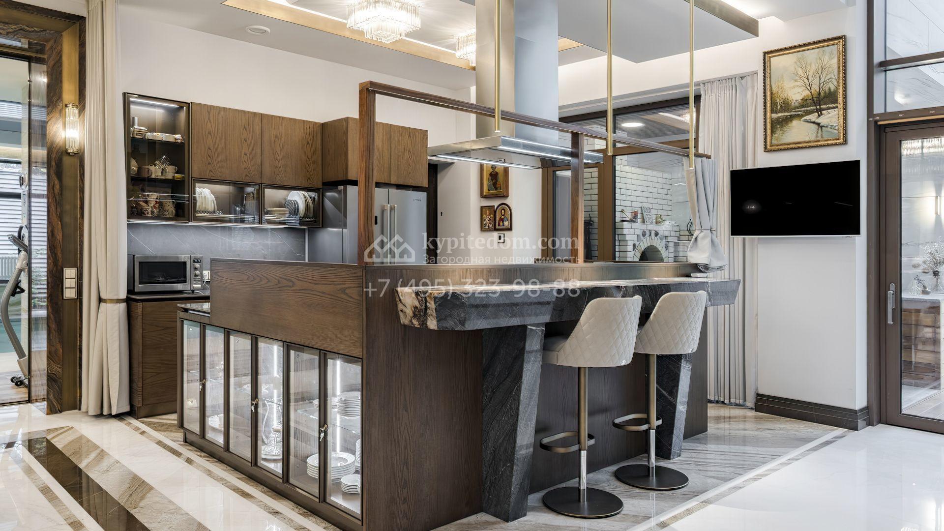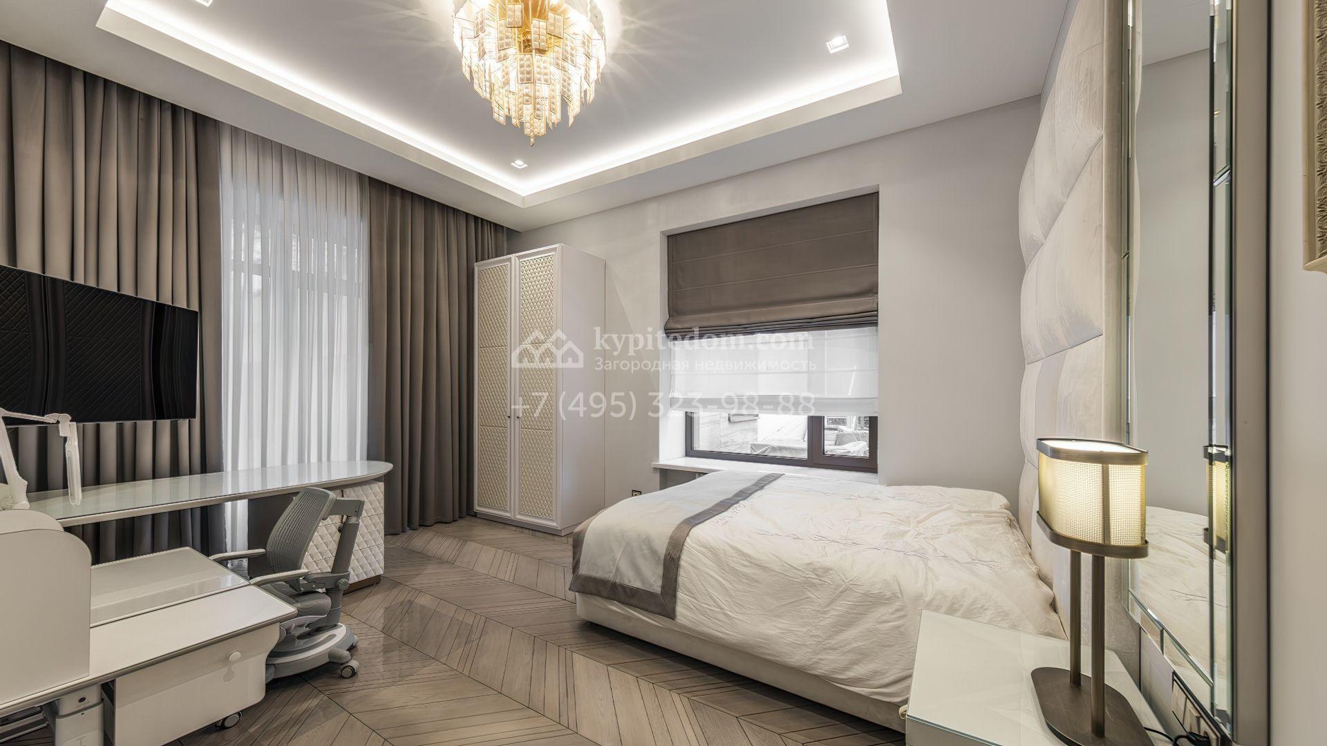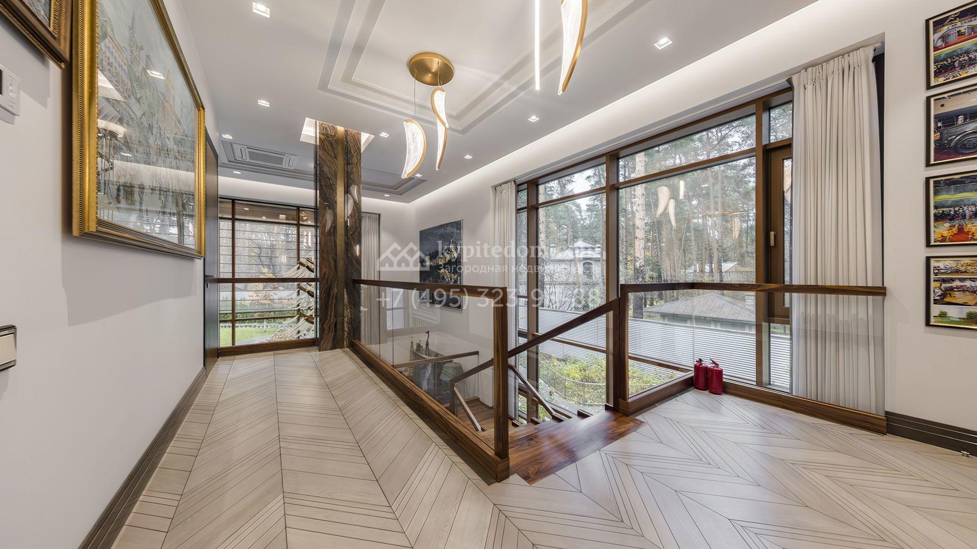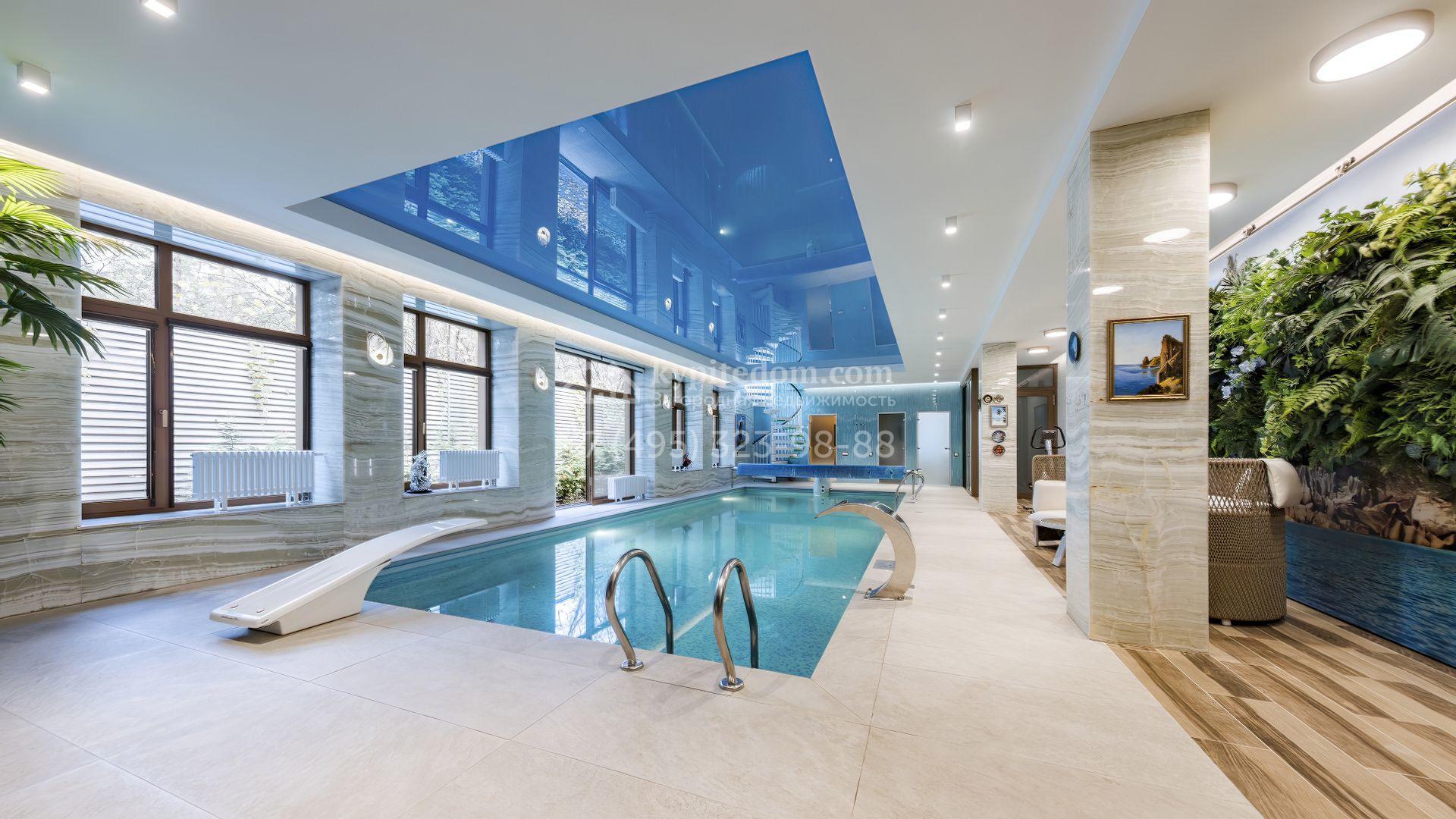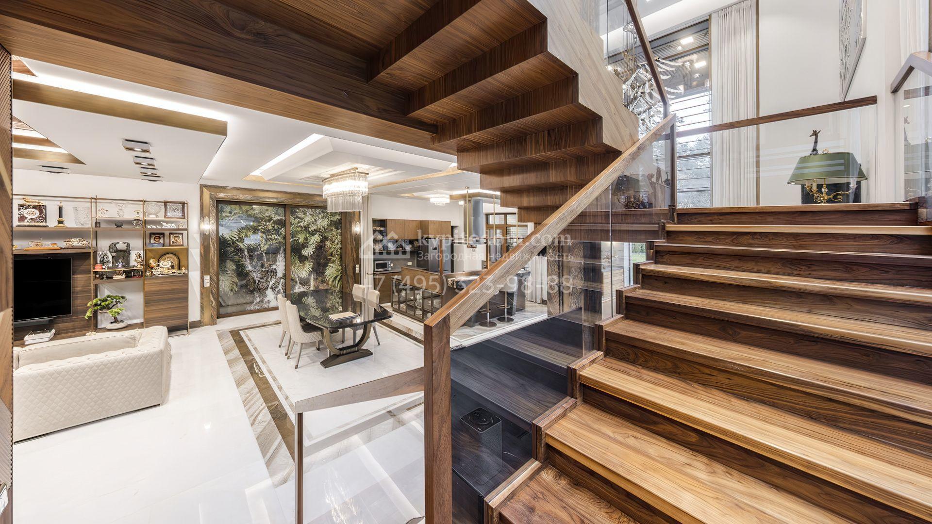 Загородная резиденция с бассейном площадью 875 м² расположен на участке в 24 сотки. Современный фасад в светло-бежевых и серых тонах подчеркивается элементами декоративной подсветки. Внутри выполнена премиальная отделка с использованием натуральных материалов — стены и многоуровневые потолки украшены панелями из ценных пород дерева. Дом оснащен системами для подогрева полов, приточно-вытяжной вентиляцией и кондиционированием.