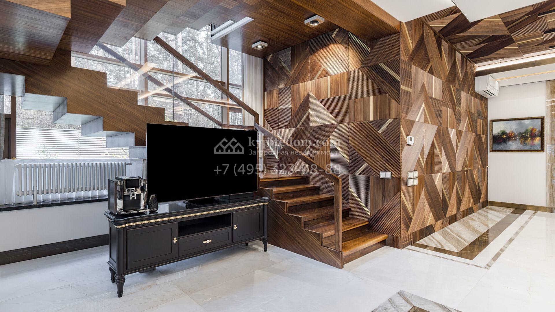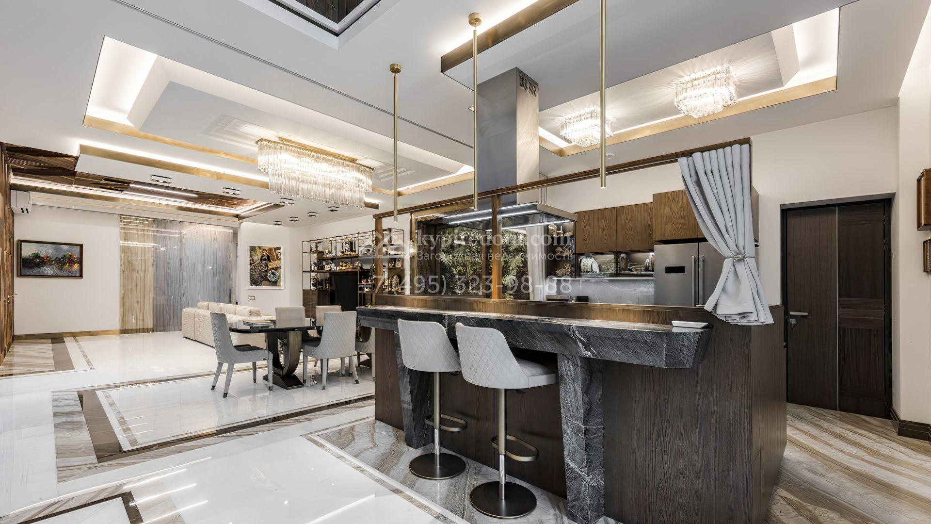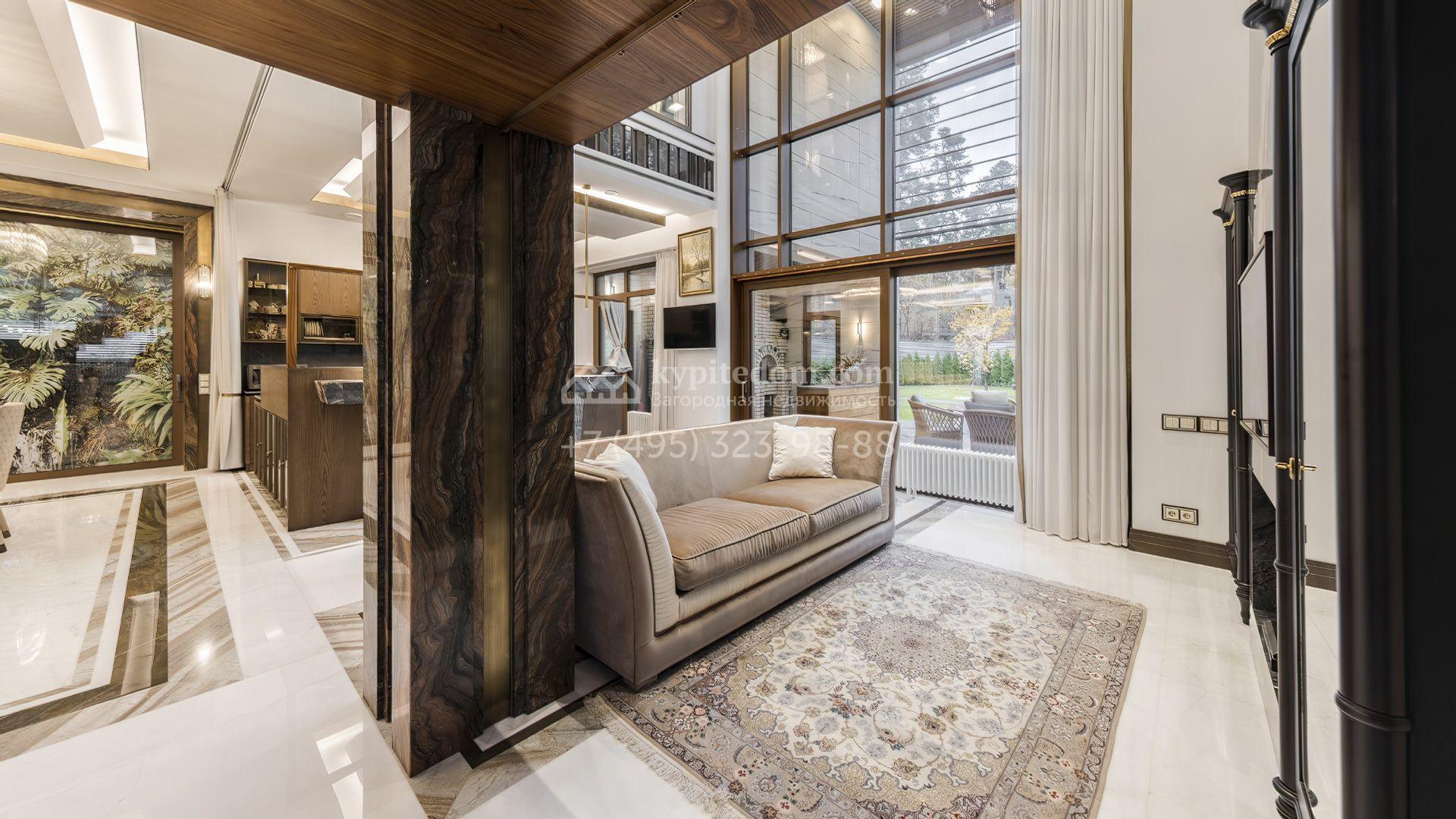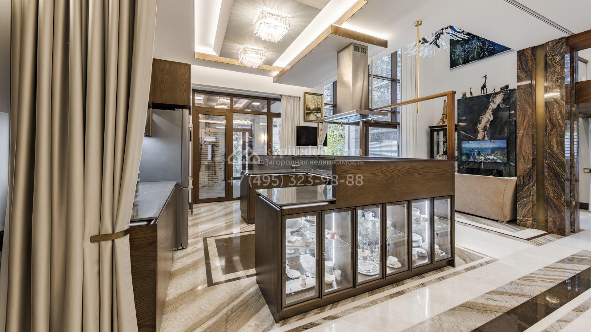 Загородная резиденция с бассейном площадью 875 м² расположен на участке в 24 сотки. Современный фасад в светло-бежевых и серых тонах подчеркивается элементами декоративной подсветки. Внутри выполнена премиальная отделка с использованием натуральных материалов — стены и многоуровневые потолки украшены панелями из ценных пород дерева. Дом оснащен системами для подогрева полов, приточно-вытяжной вентиляцией и кондиционированием.