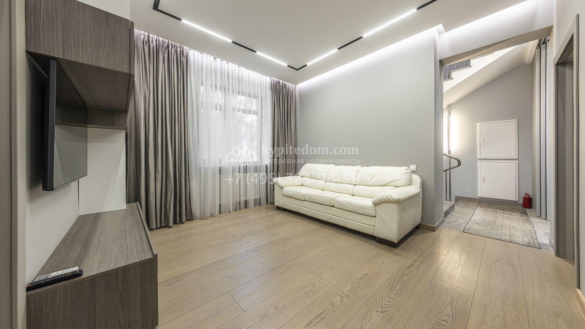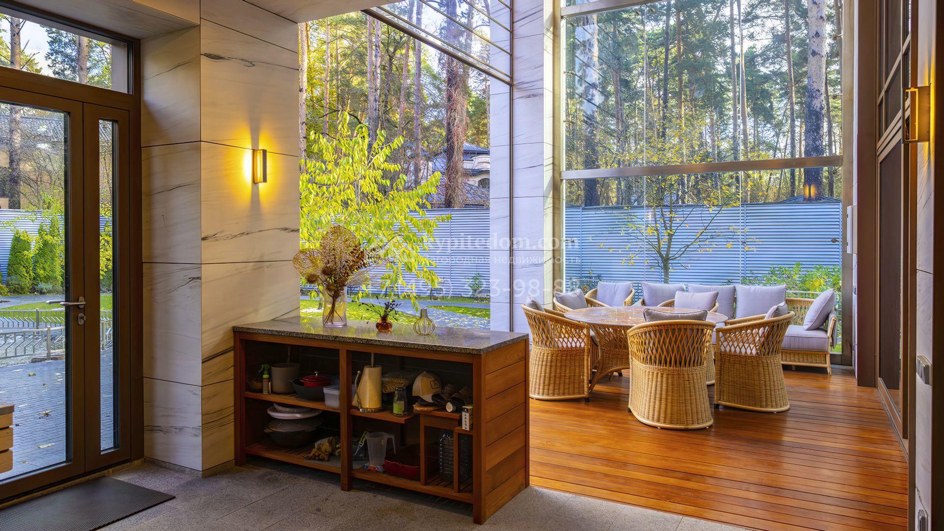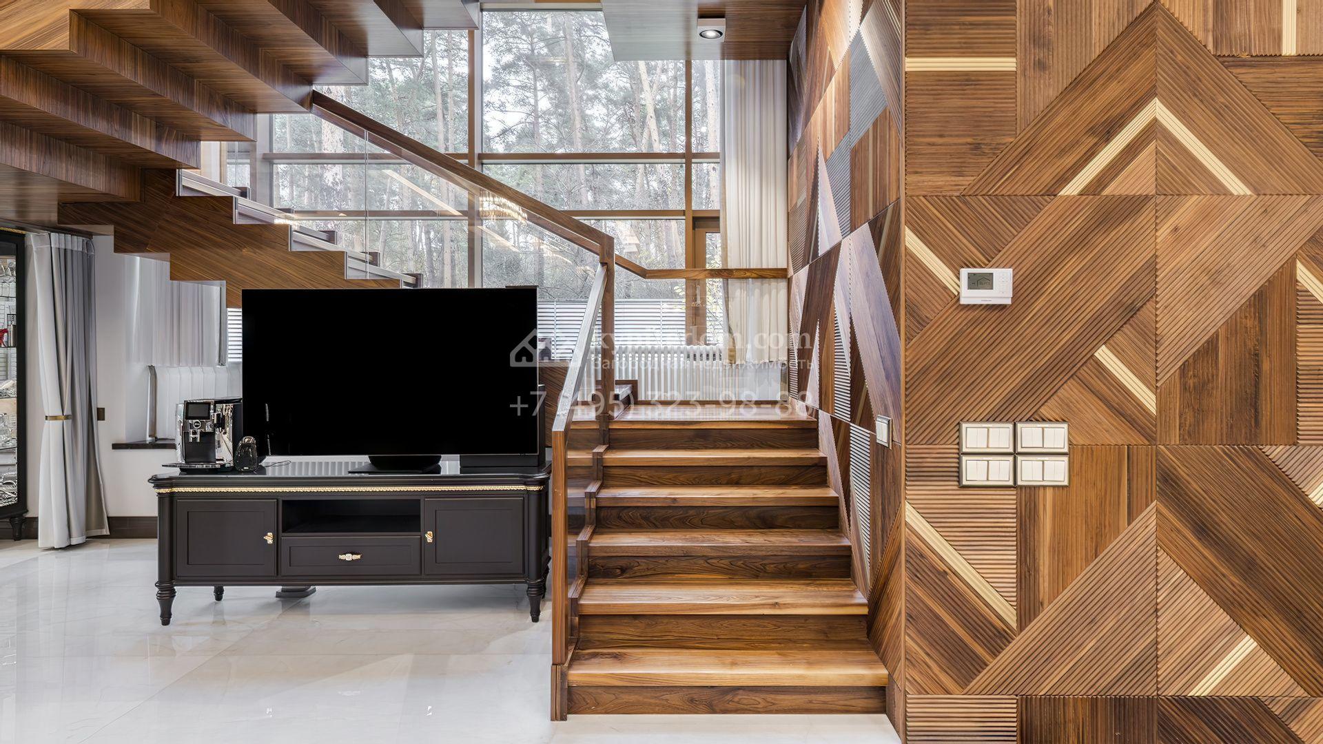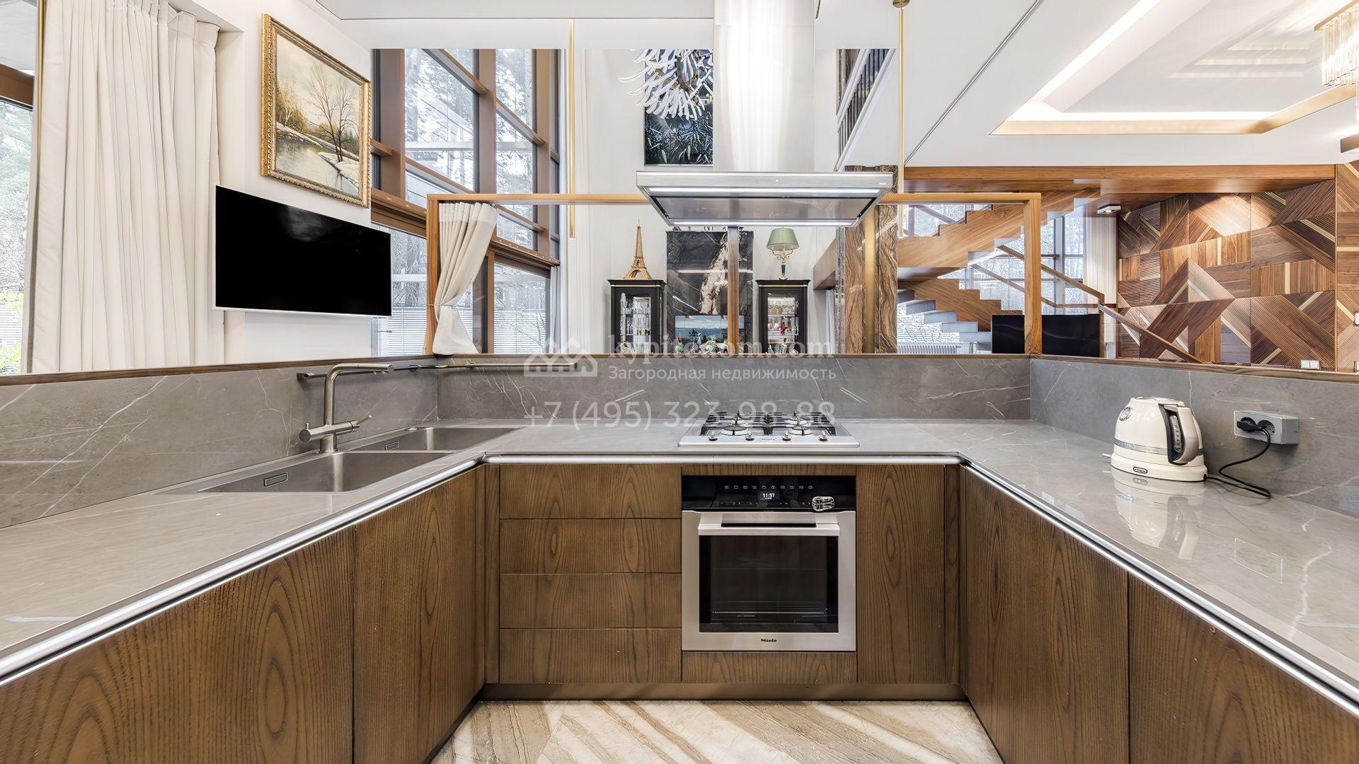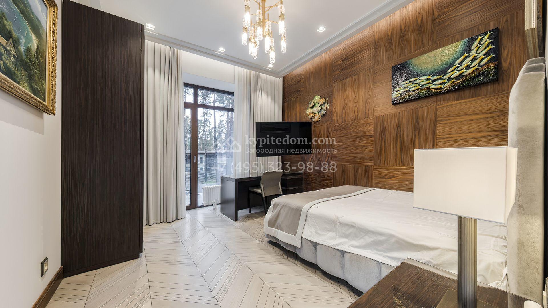 Загородная резиденция с бассейном площадью 875 м² расположен на участке в 24 сотки. Современный фасад в светло-бежевых и серых тонах подчеркивается элементами декоративной подсветки. Внутри выполнена премиальная отделка с использованием натуральных материалов — стены и многоуровневые потолки украшены панелями из ценных пород дерева. Дом оснащен системами для подогрева полов, приточно-вытяжной вентиляцией и кондиционированием.