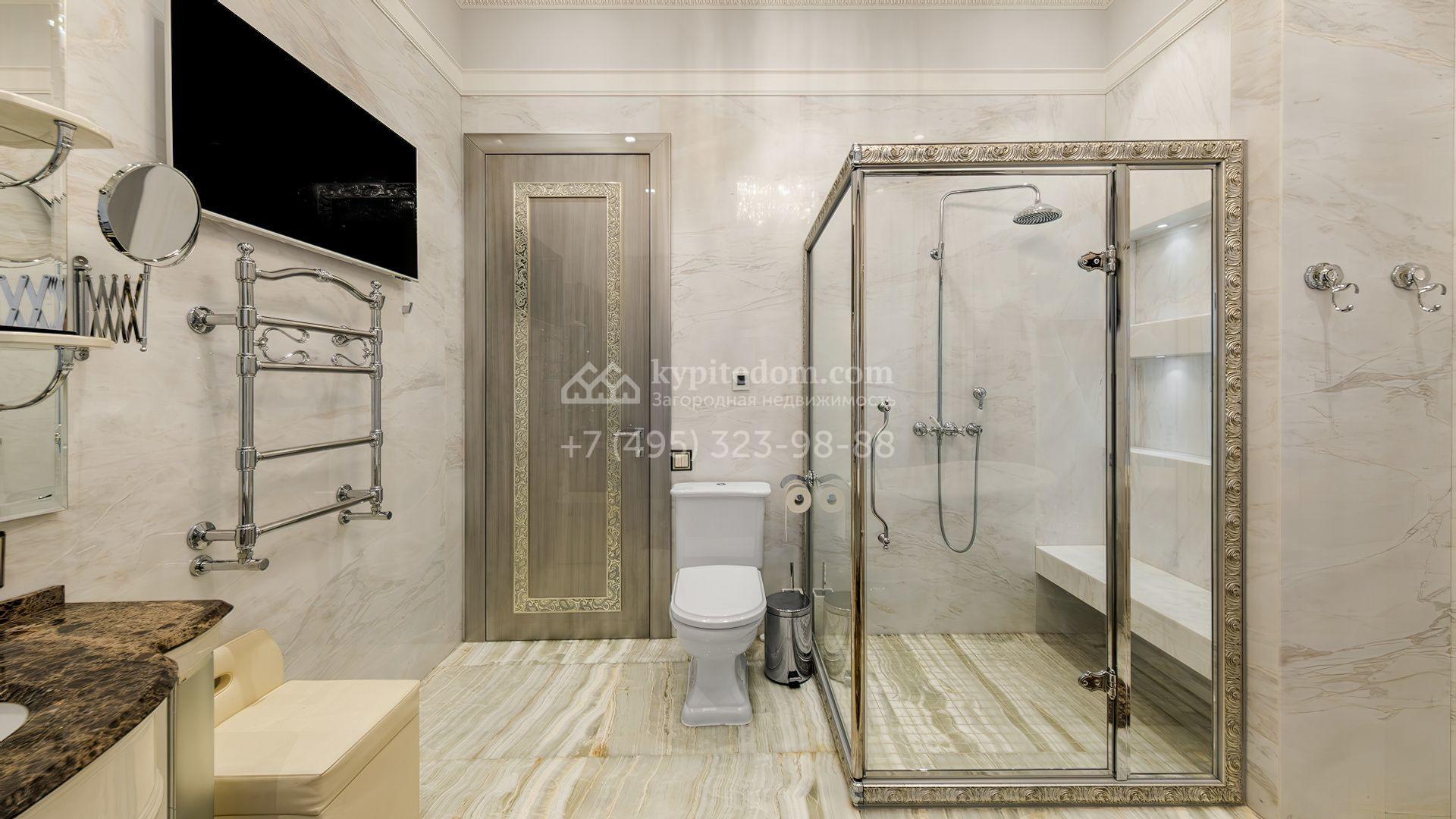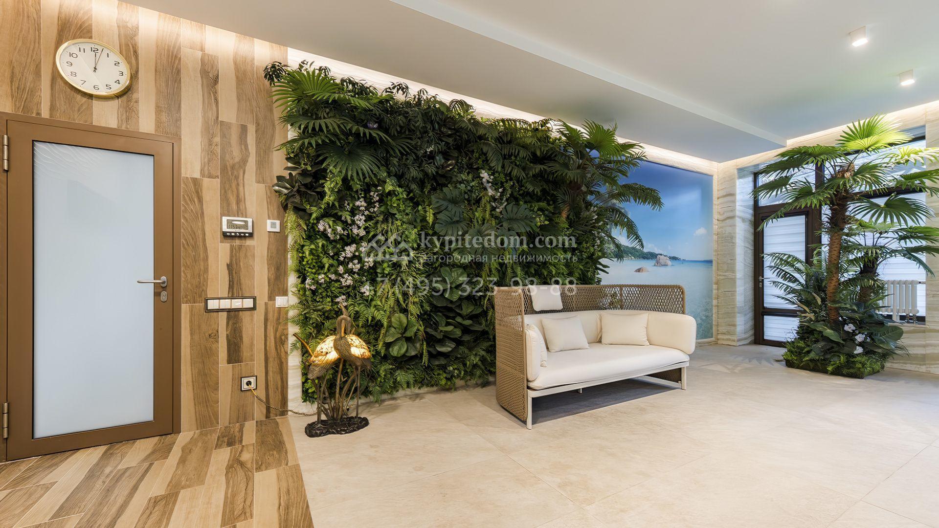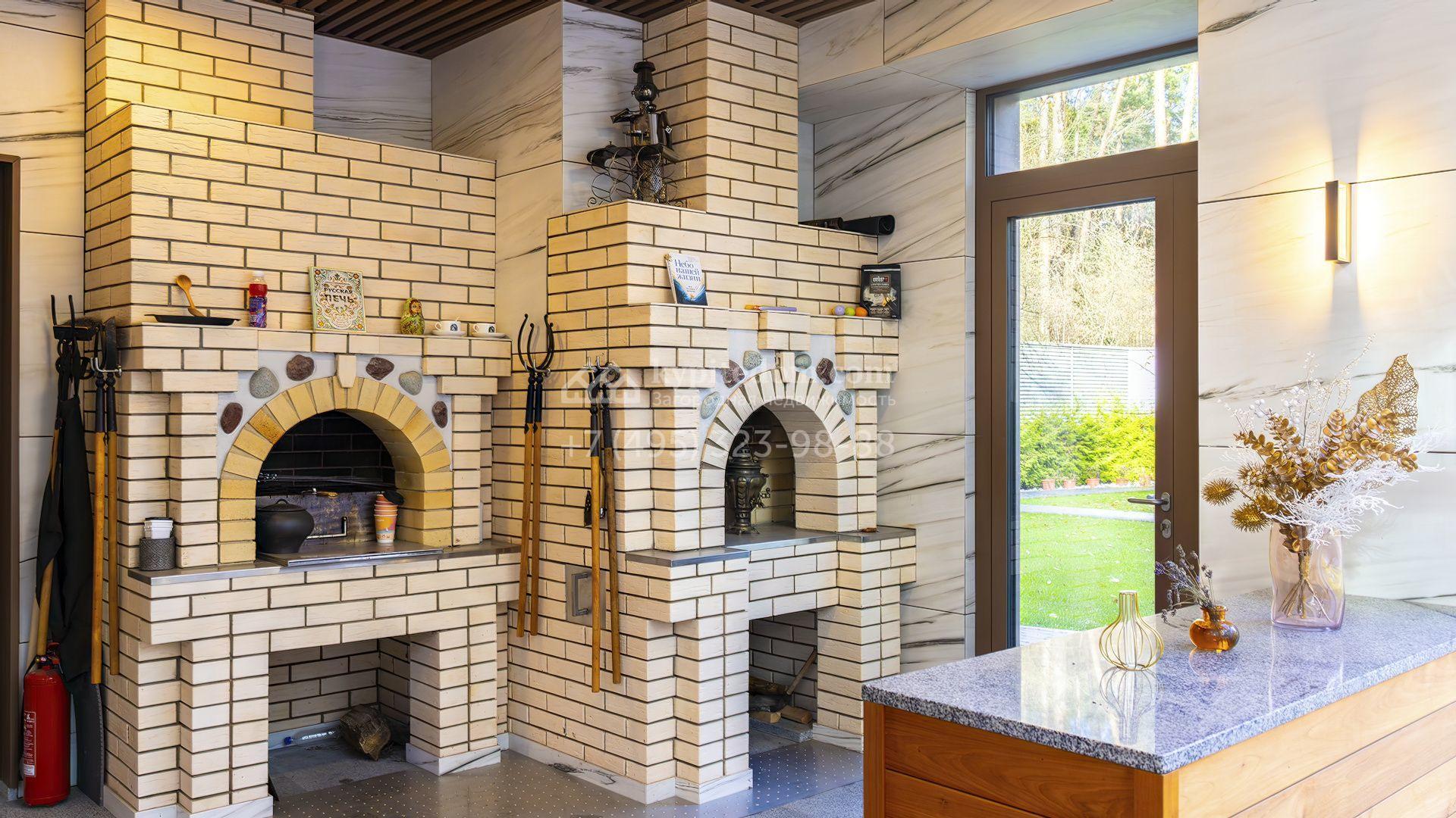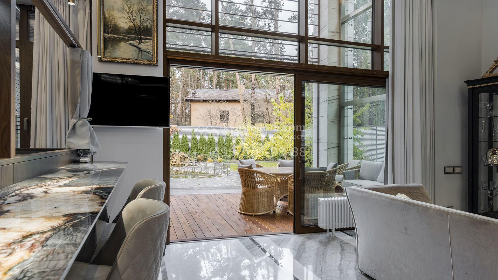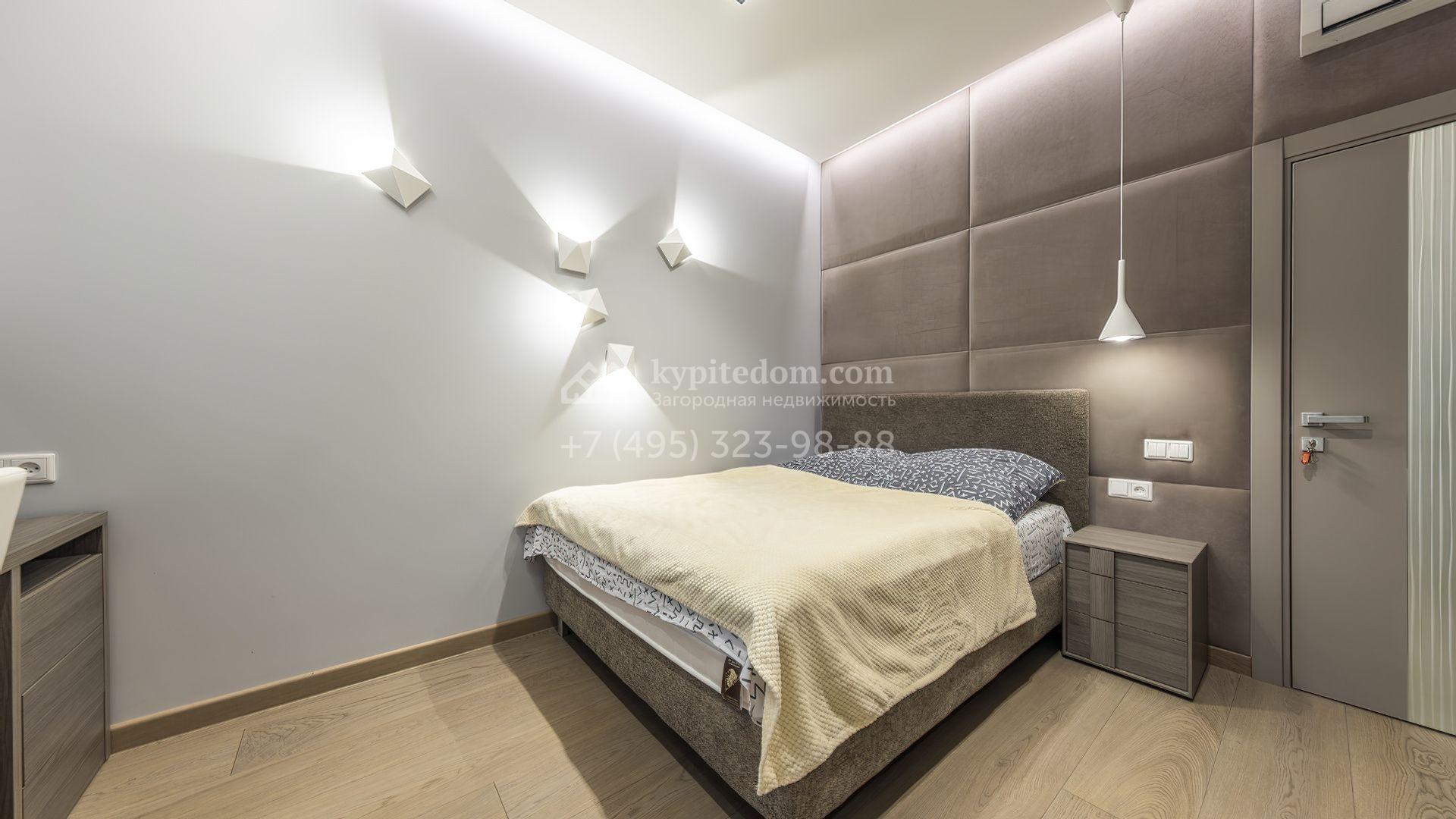 Загородная резиденция с бассейном площадью 875 м² расположен на участке в 24 сотки. Современный фасад в светло-бежевых и серых тонах подчеркивается элементами декоративной подсветки. Внутри выполнена премиальная отделка с использованием натуральных материалов — стены и многоуровневые потолки украшены панелями из ценных пород дерева. Дом оснащен системами для подогрева полов, приточно-вытяжной вентиляцией и кондиционированием.