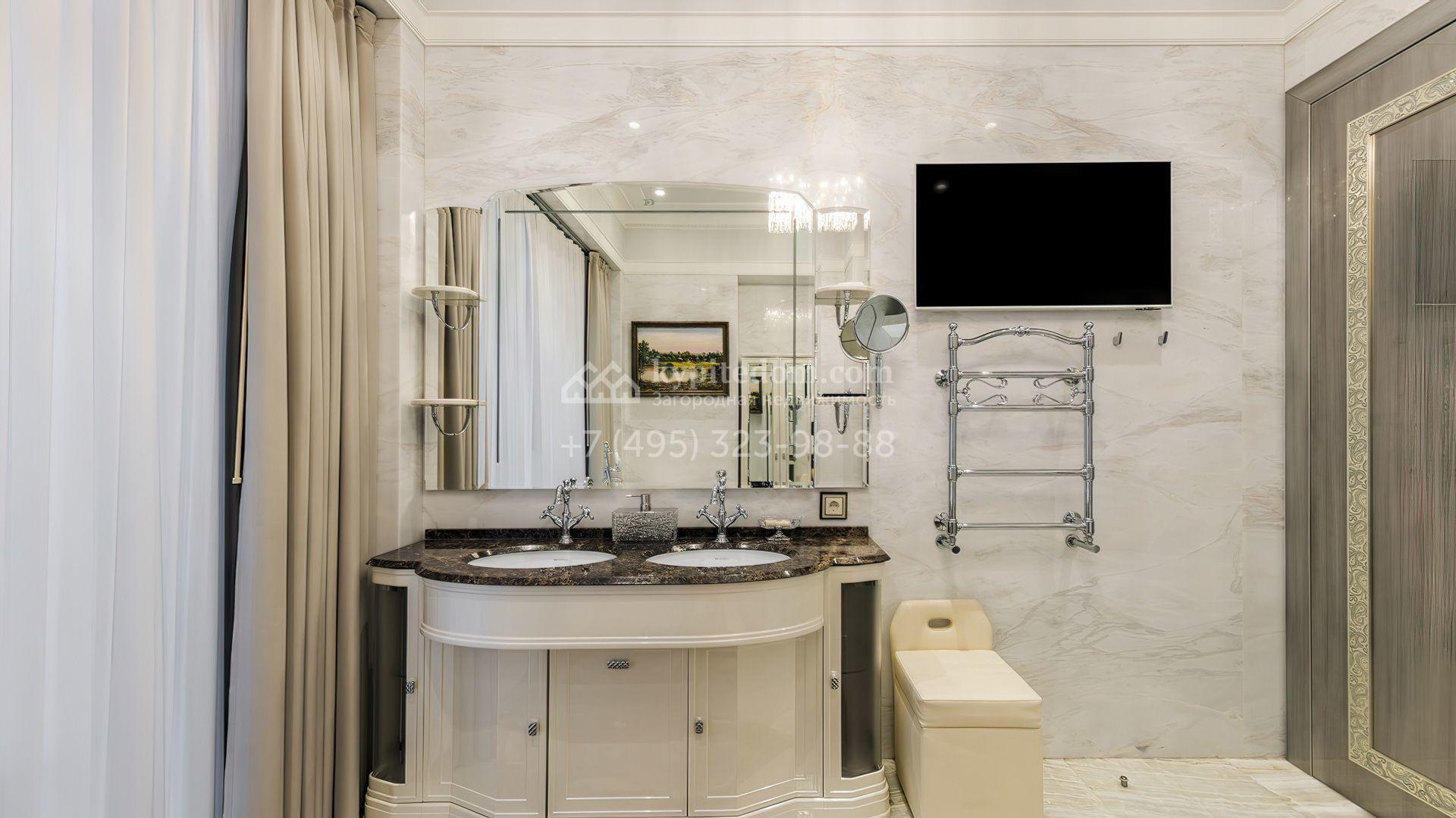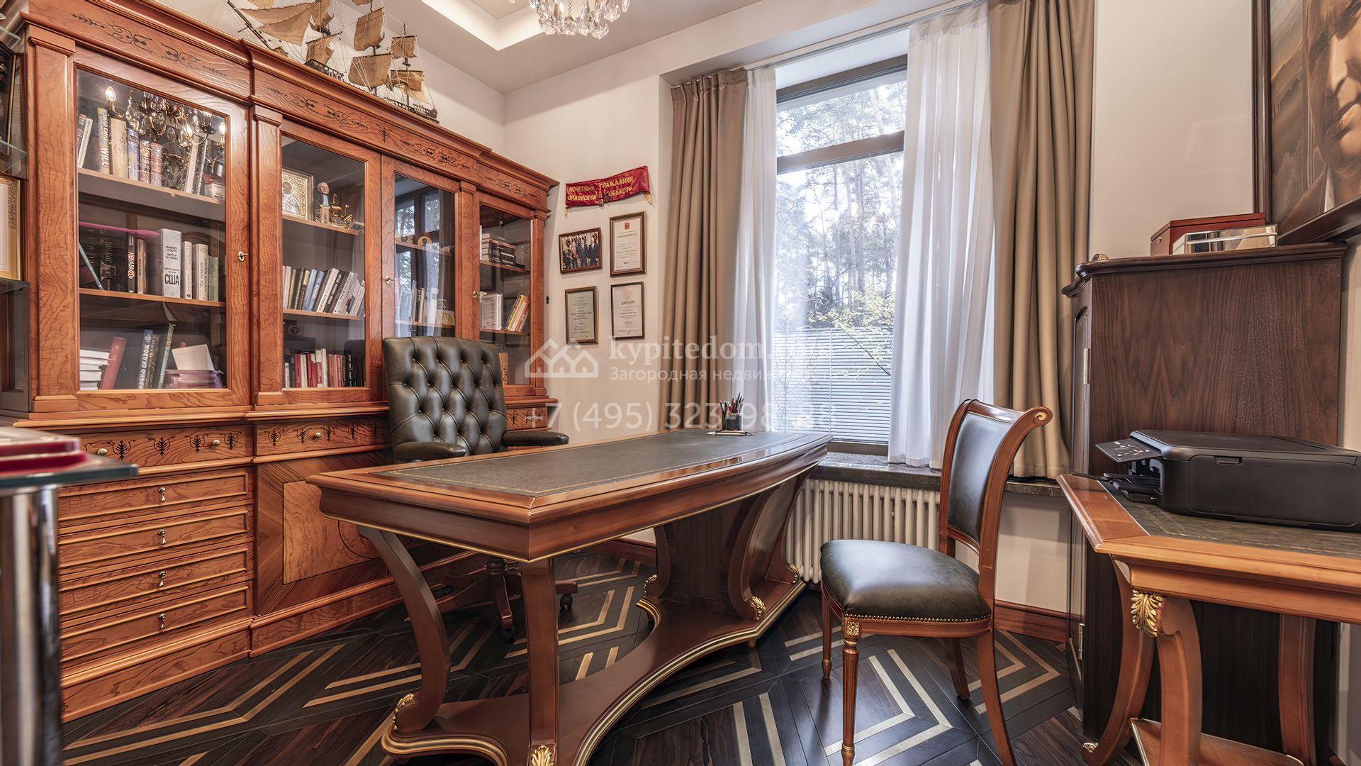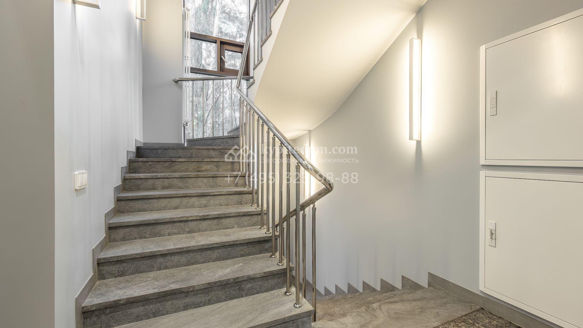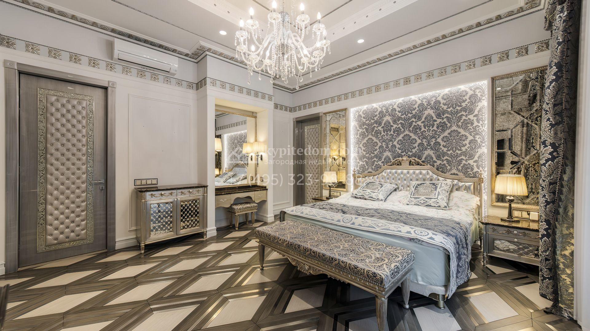 Интерьеры полностью укомплектованы мебелью от итальянских производителей, таких как Luciano Zonta, Arte Brotto, Guerra Vanni, Henge и других. Для создания уюта продуманы различные варианты освещения, установлены дизайнерские люстры и светильники. Планировочным решением предусмотрены кухня-гостиная с камином, 6 спален, кабинет, тренажерный зал, холл со вторым светом, блок для персонала с отдельным входом, гараж на 2 машины и SPA-зона с бассейном и хаммамом.