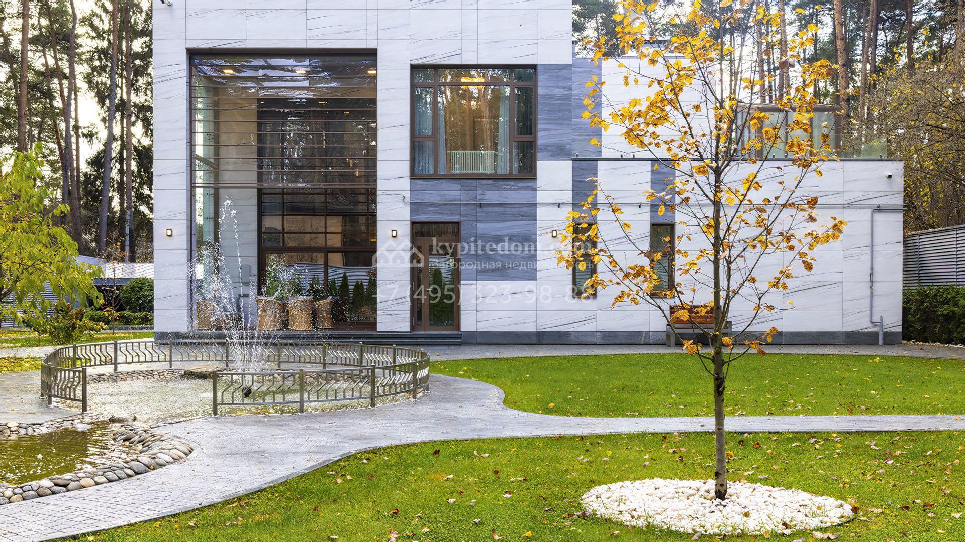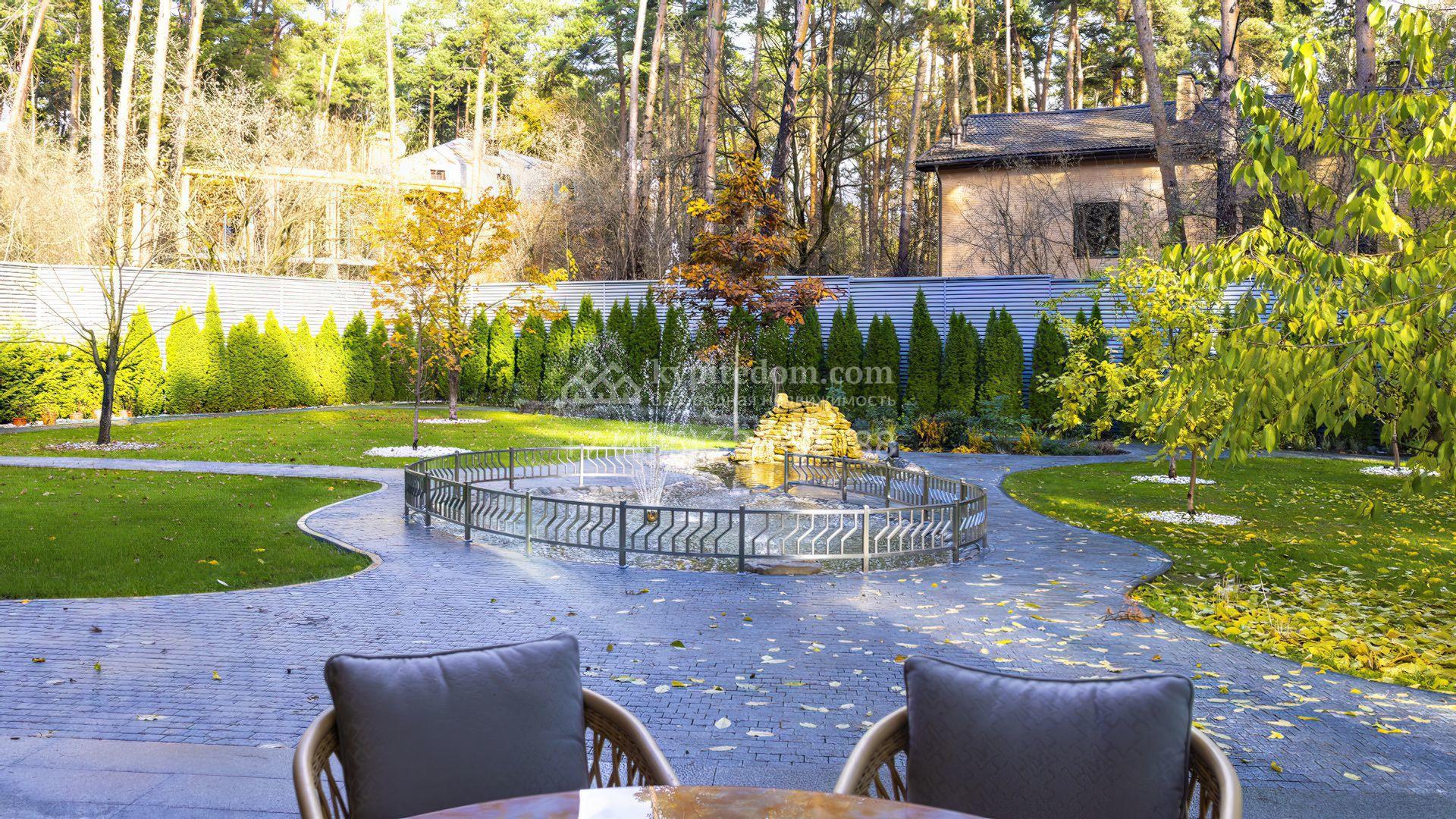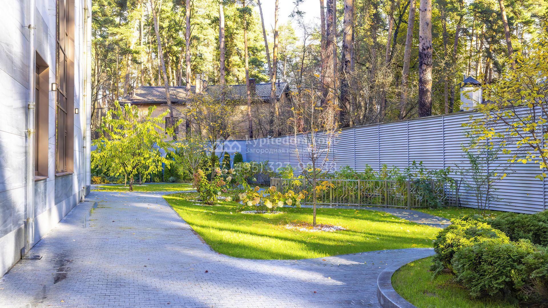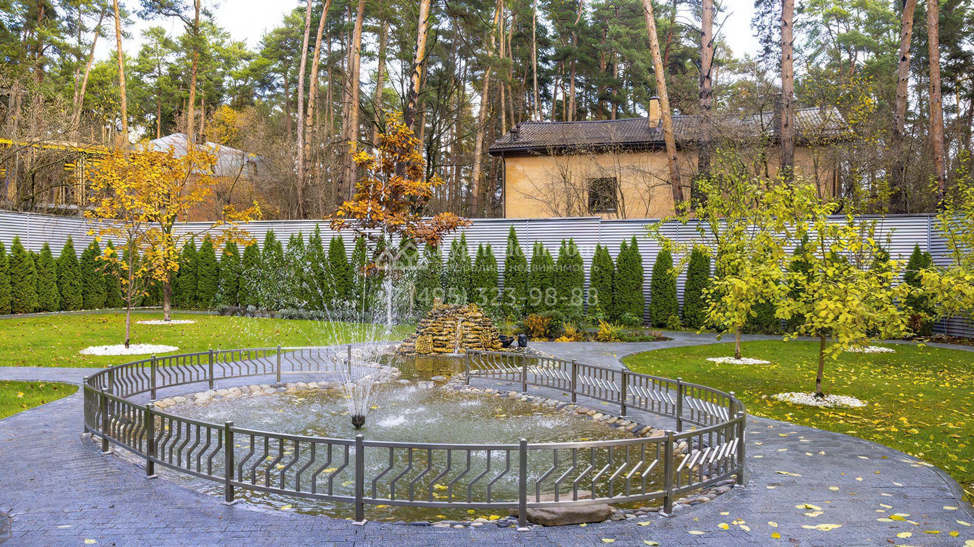 Участок окружен вековыми соснами, а вдоль периметра растут вечнозеленые туи. На территории организовано экопространство по индивидуальному проекту с грамотным зонированием, художественной подсветкой и плавными дорожками из термообработанной брусчатки. Здесь есть парк с редкими деревьями, плодовый сад, поляна и малинник. Завершает особую и уютную атмосферу фонтан и каскадный пруд с водопадом.
