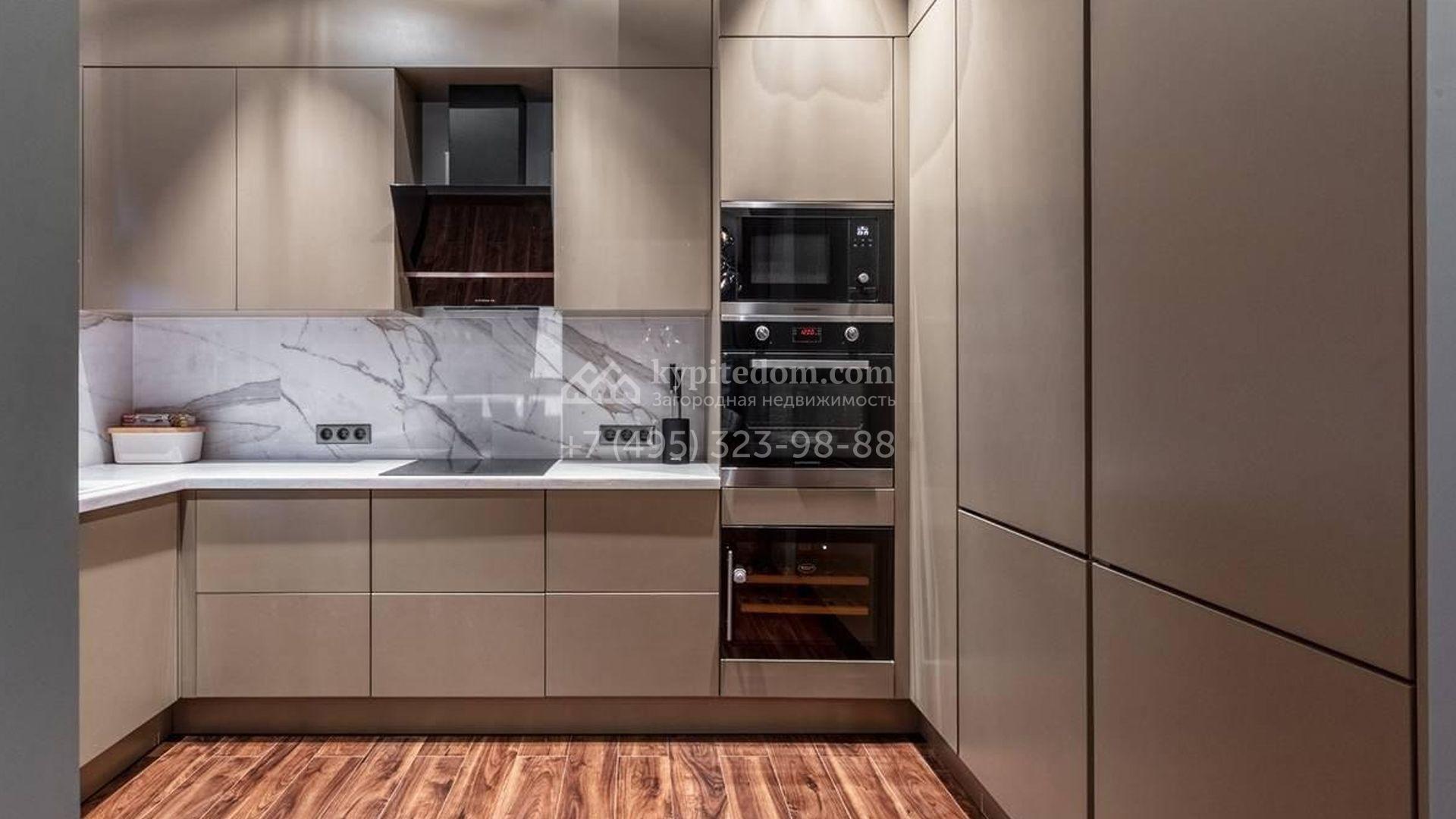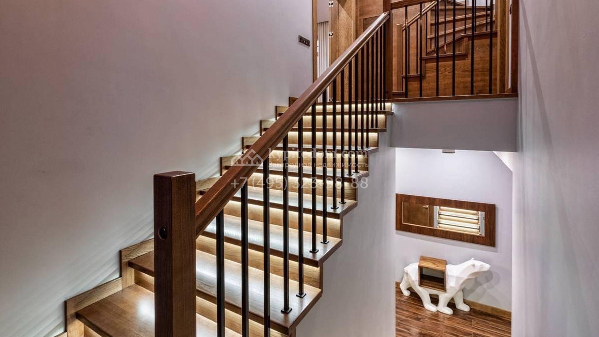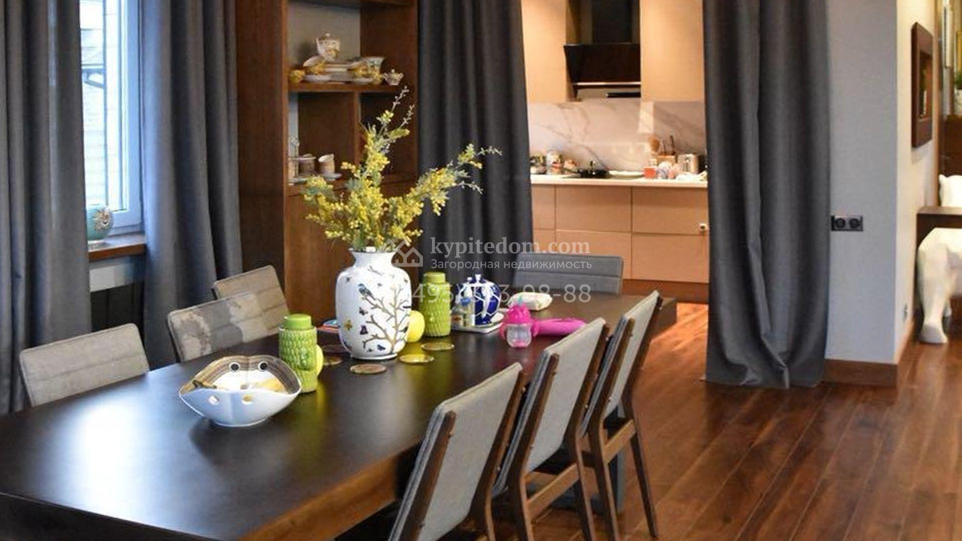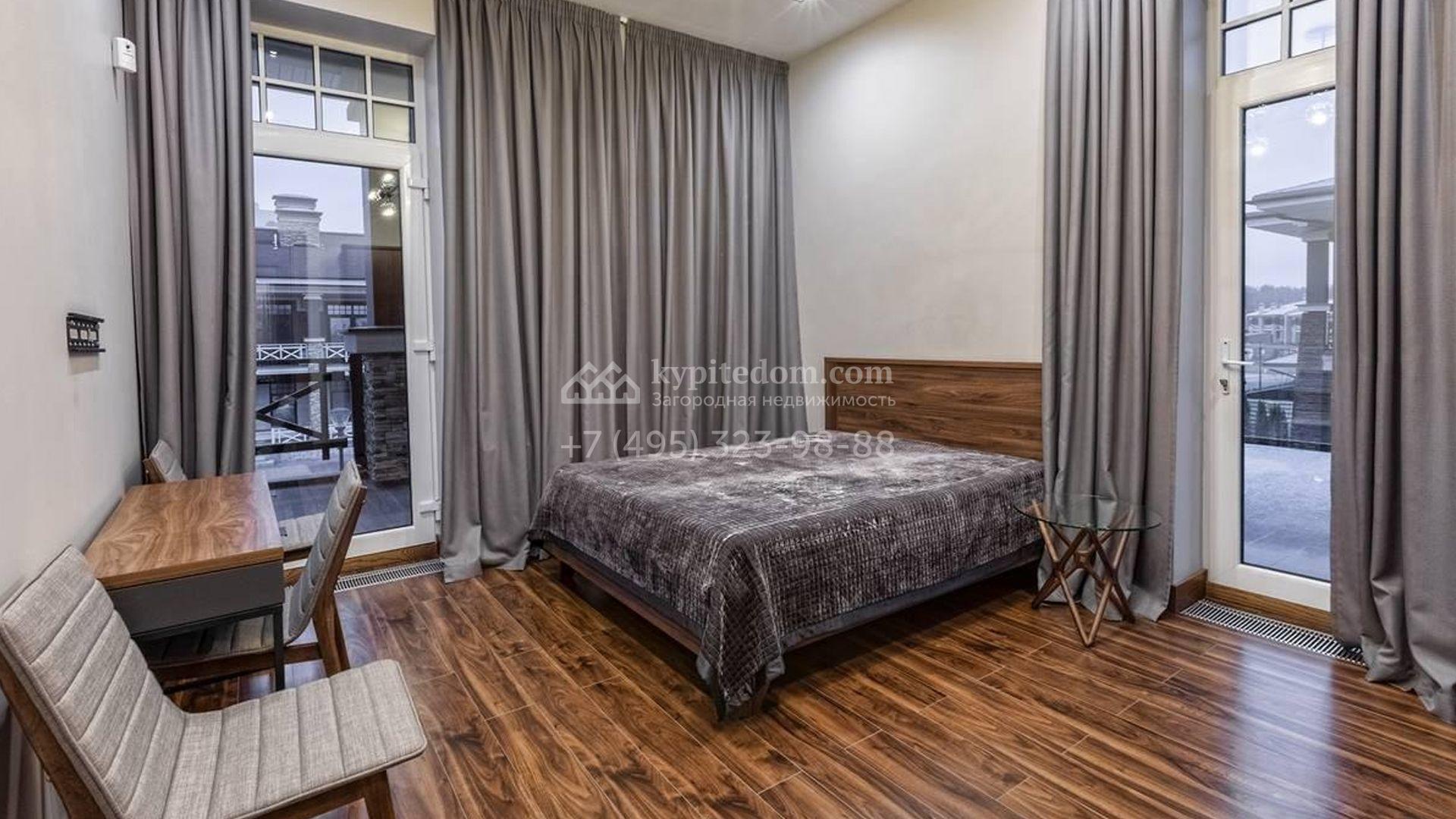 Двухэтажный загородный дом площадью 295 м² с отделкой «под ключ» расположен на участке 11 соток. Фасад в едином стиле поселка разработан в архитектурном бюро Павла Романова, облицован натуральным камнем и керамогранитом, украшен колоннами. На первом этаже расположена гостиная-столовая и кухня, оборудованная встроенной техникой. На втором этаже три спальни. Интерьер выдержан в современном стиле — в отделке использовали дерево, крупноформатный керамогранит под камень и дизайнерское освещение. Все комнаты меблированы. На участке рядом с домом засеян газон, расположен навес для машины и домик для персонала с двумя спальнями, санузлом и кухней.