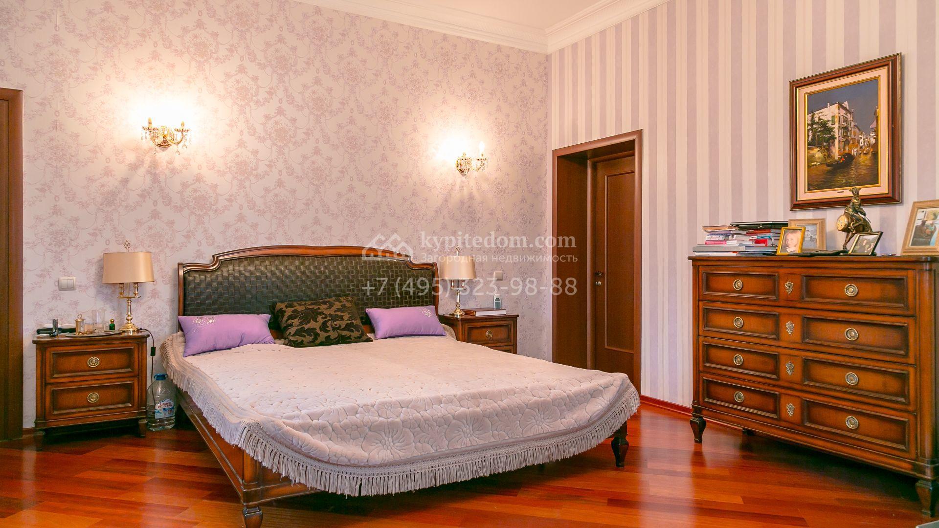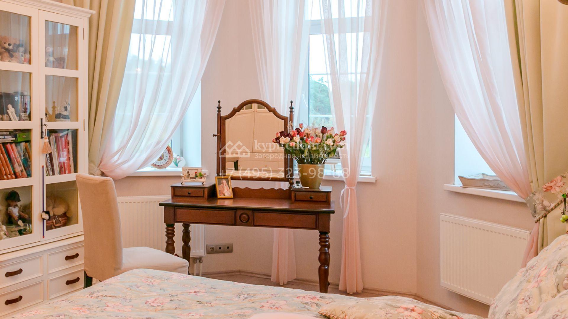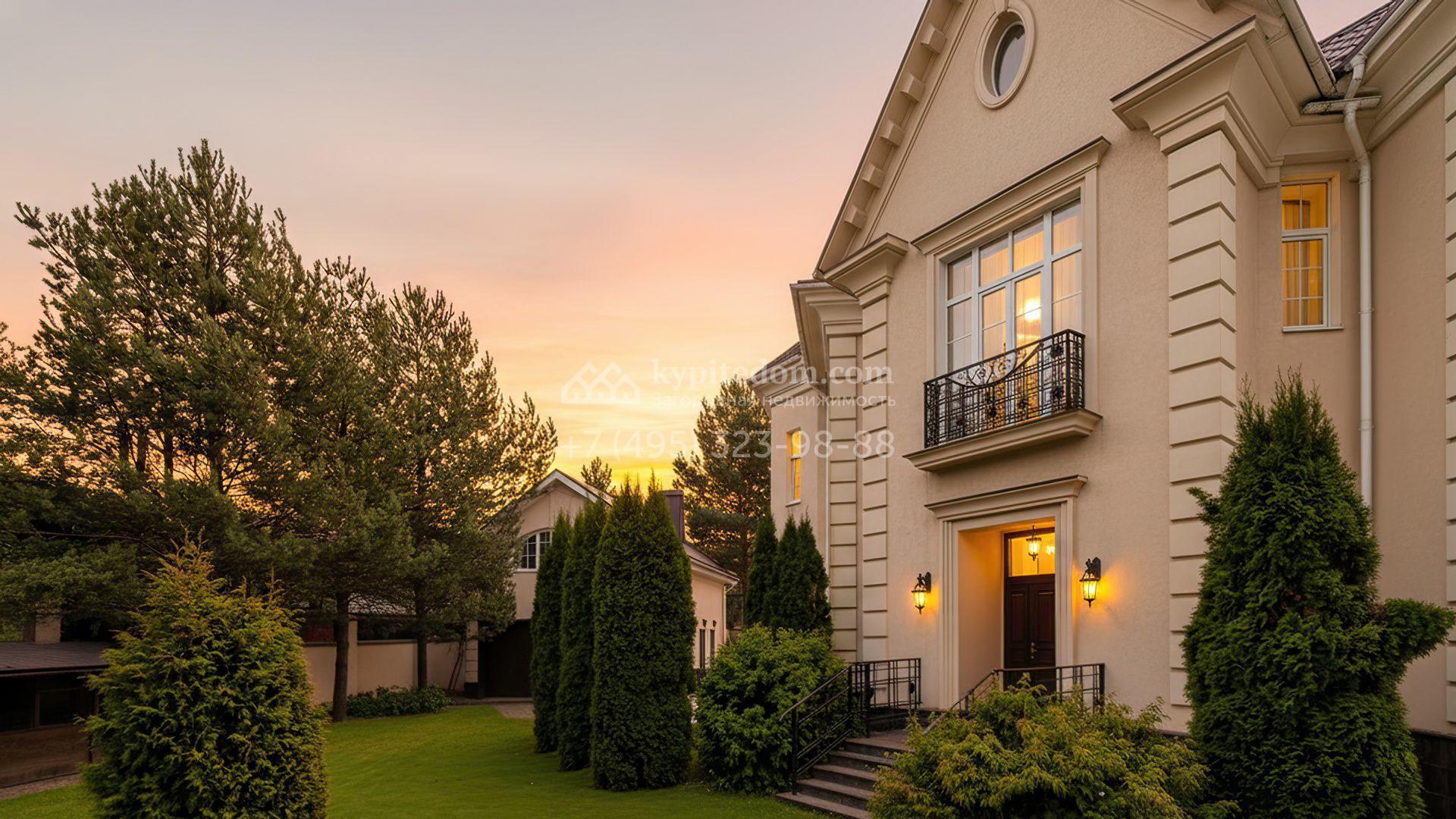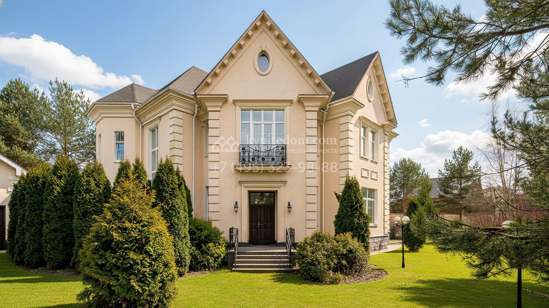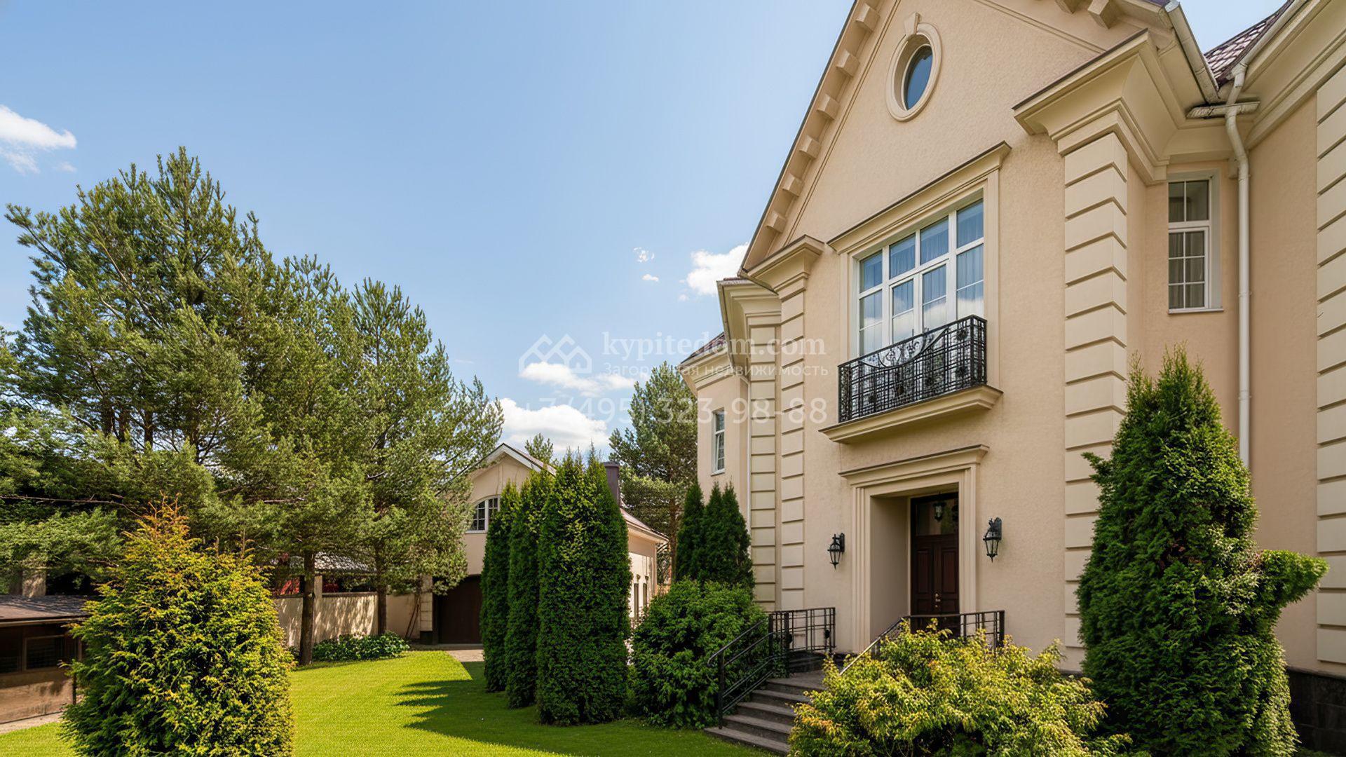 Загородный дом в неоклассическом стиле площадью 600 м² построен на прилесном участке 24 сотки. Бежевый фасад облицован штукатуркой, украшен рустовкой, наличниками и карнизом. Интерьер оформлен в мягких тёплых оттенках. В главном доме на первом этаже расположена парадная гостиная со вторым светом, камином и выходом на террасу. В коттедже спланированы четыре спальни, кабинет и спа-зона, включающая бассейн, сауну и душевую. Резиденция укомплектована мебелью производства Италии и Испании, бытовой техникой. Предусмотрена квартира для персонала с кухней и двумя спальнями. У дома есть гараж на две машины. На участке выполнен ландшафтный дизайн, проложены дорожки, высажены яблони, вишни, сосны и другие растения.