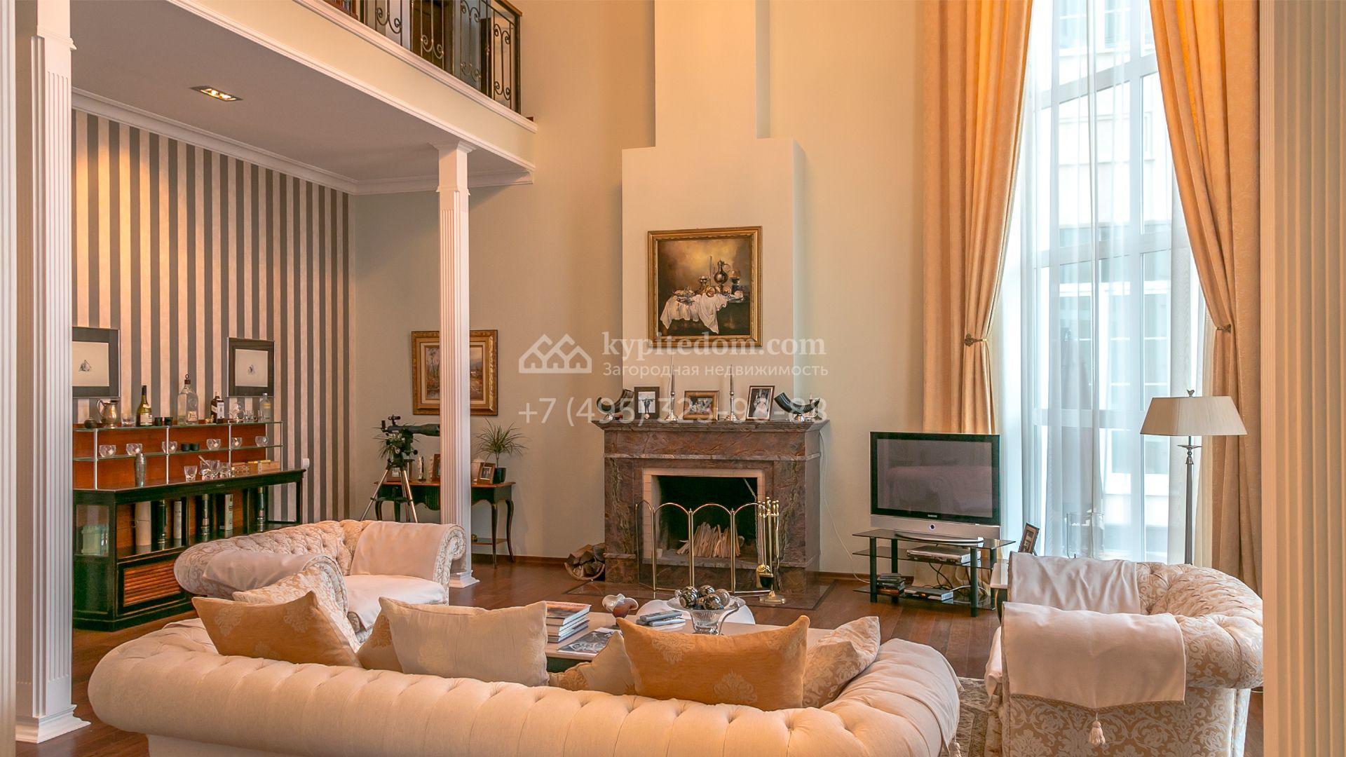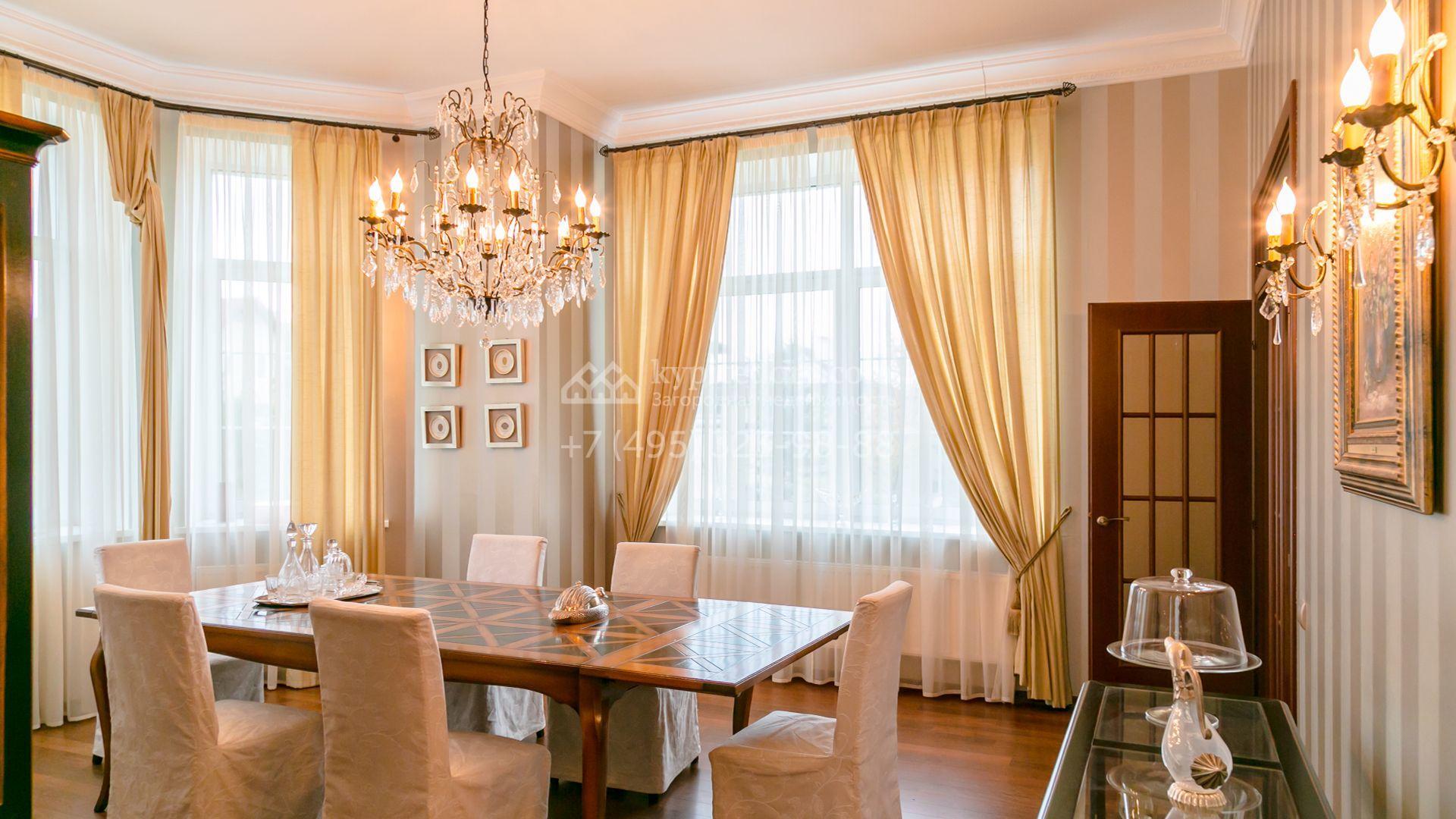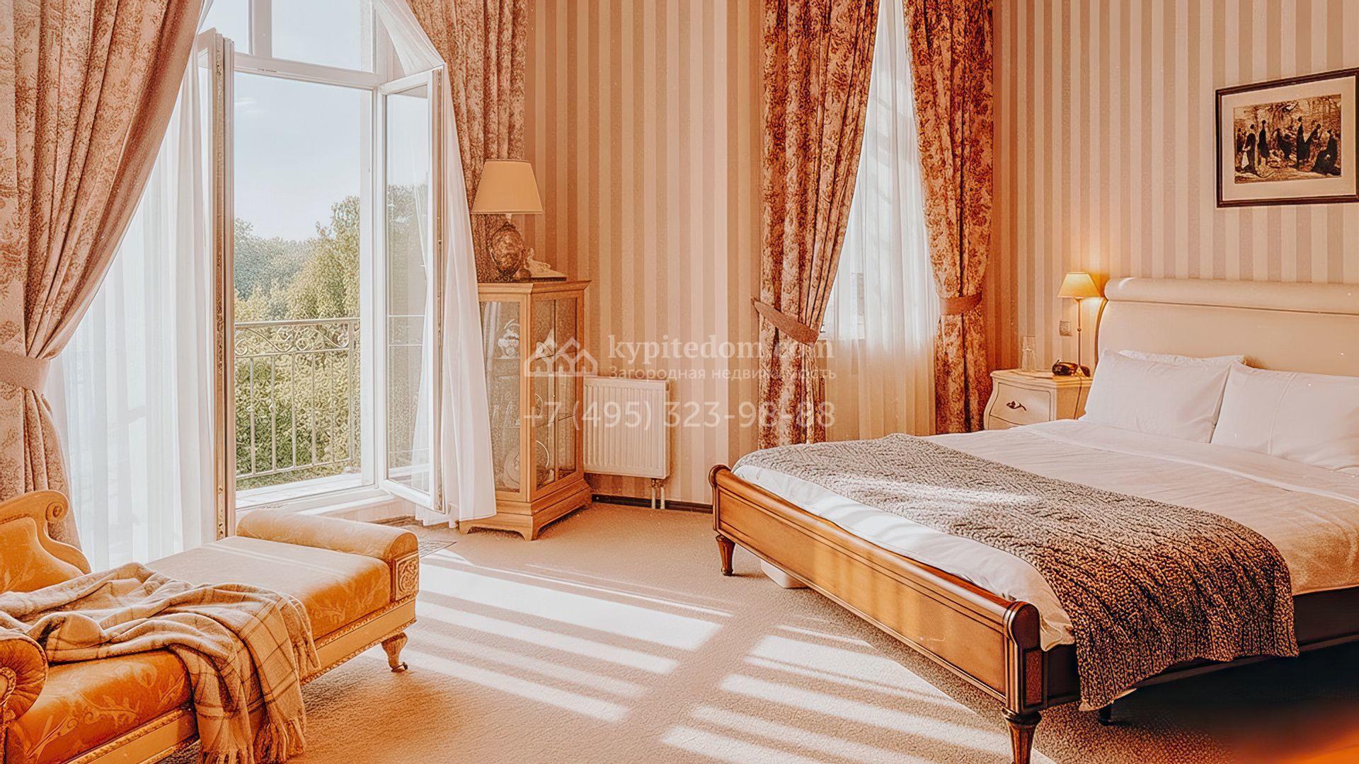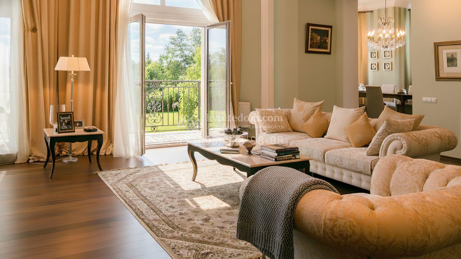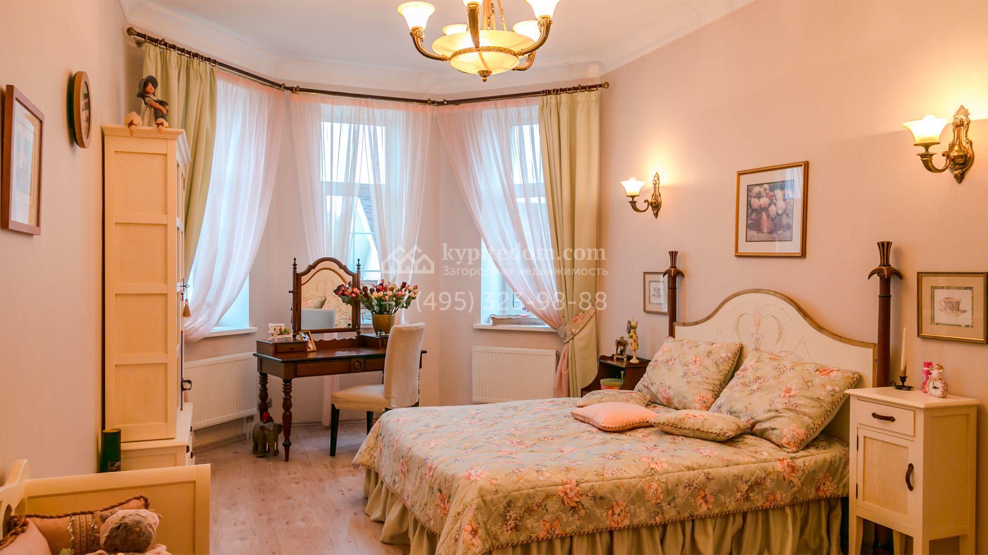 Загородный дом в неоклассическом стиле площадью 600 м² построен на прилесном участке 24 сотки. Бежевый фасад облицован штукатуркой, украшен рустовкой, наличниками и карнизом. Интерьер оформлен в мягких тёплых оттенках. В главном доме на первом этаже расположена парадная гостиная со вторым светом, камином и выходом на террасу. В коттедже спланированы четыре спальни, кабинет и спа-зона, включающая бассейн, сауну и душевую. Резиденция укомплектована мебелью производства Италии и Испании, бытовой техникой. Предусмотрена квартира для персонала с кухней и двумя спальнями. У дома есть гараж на две машины. На участке выполнен ландшафтный дизайн, проложены дорожки, высажены яблони, вишни, сосны и другие растения.
