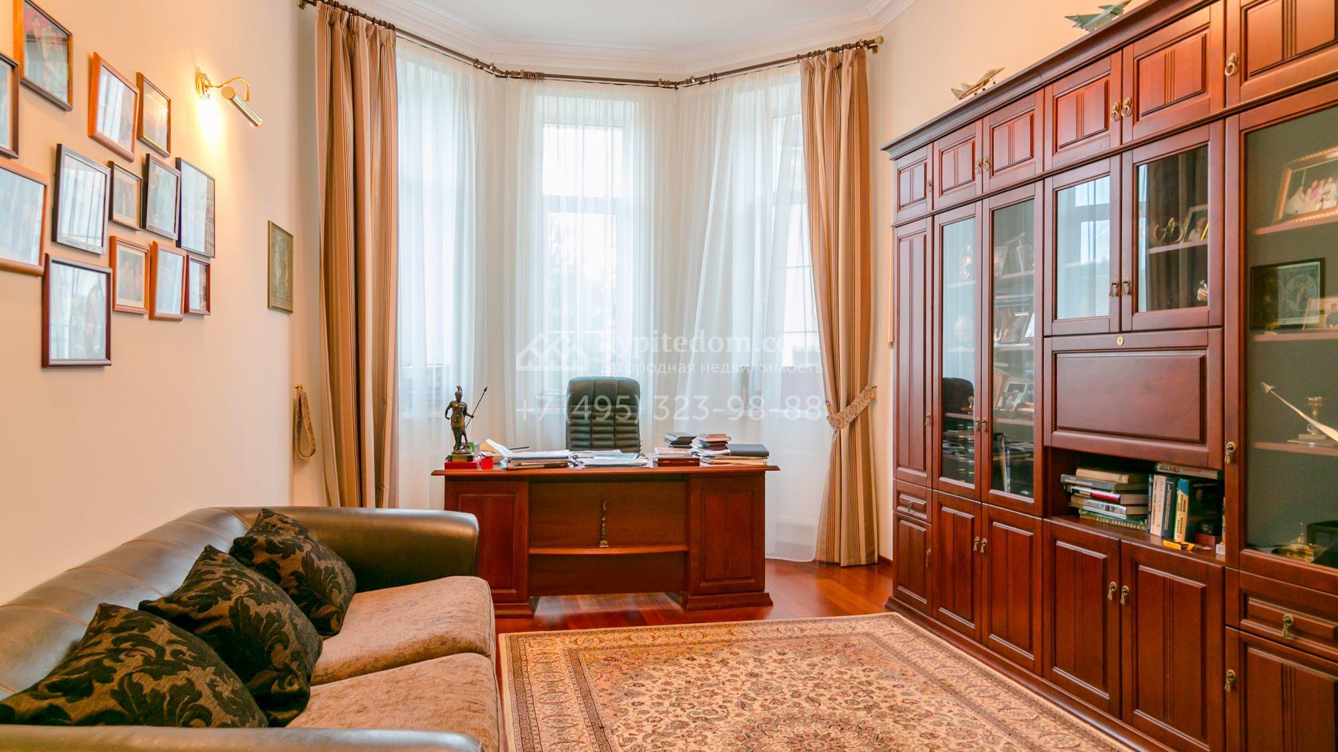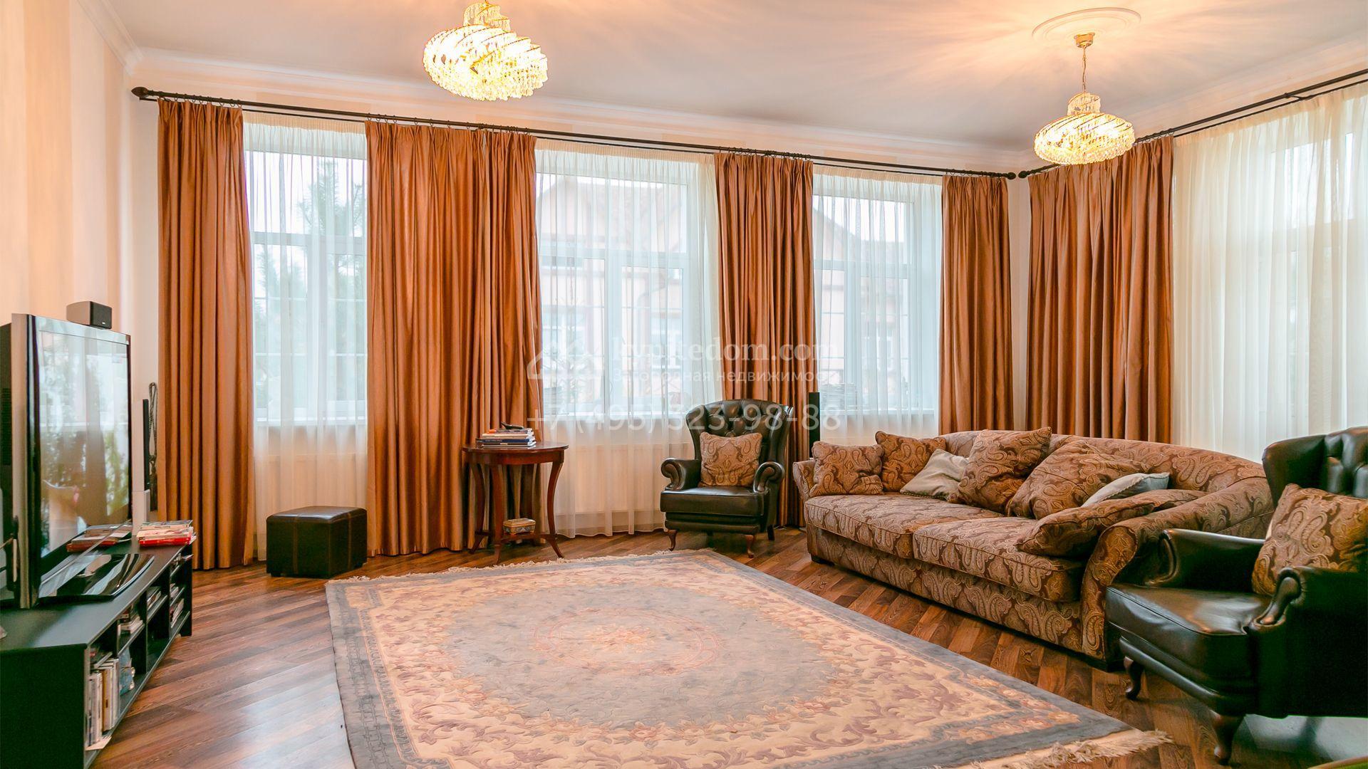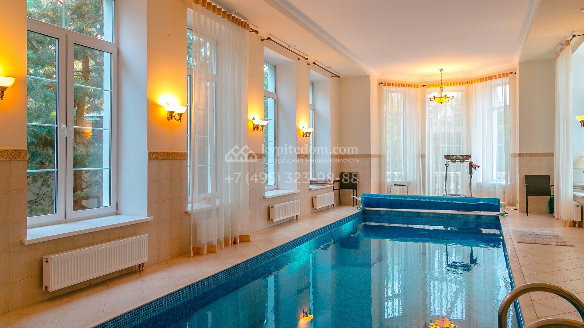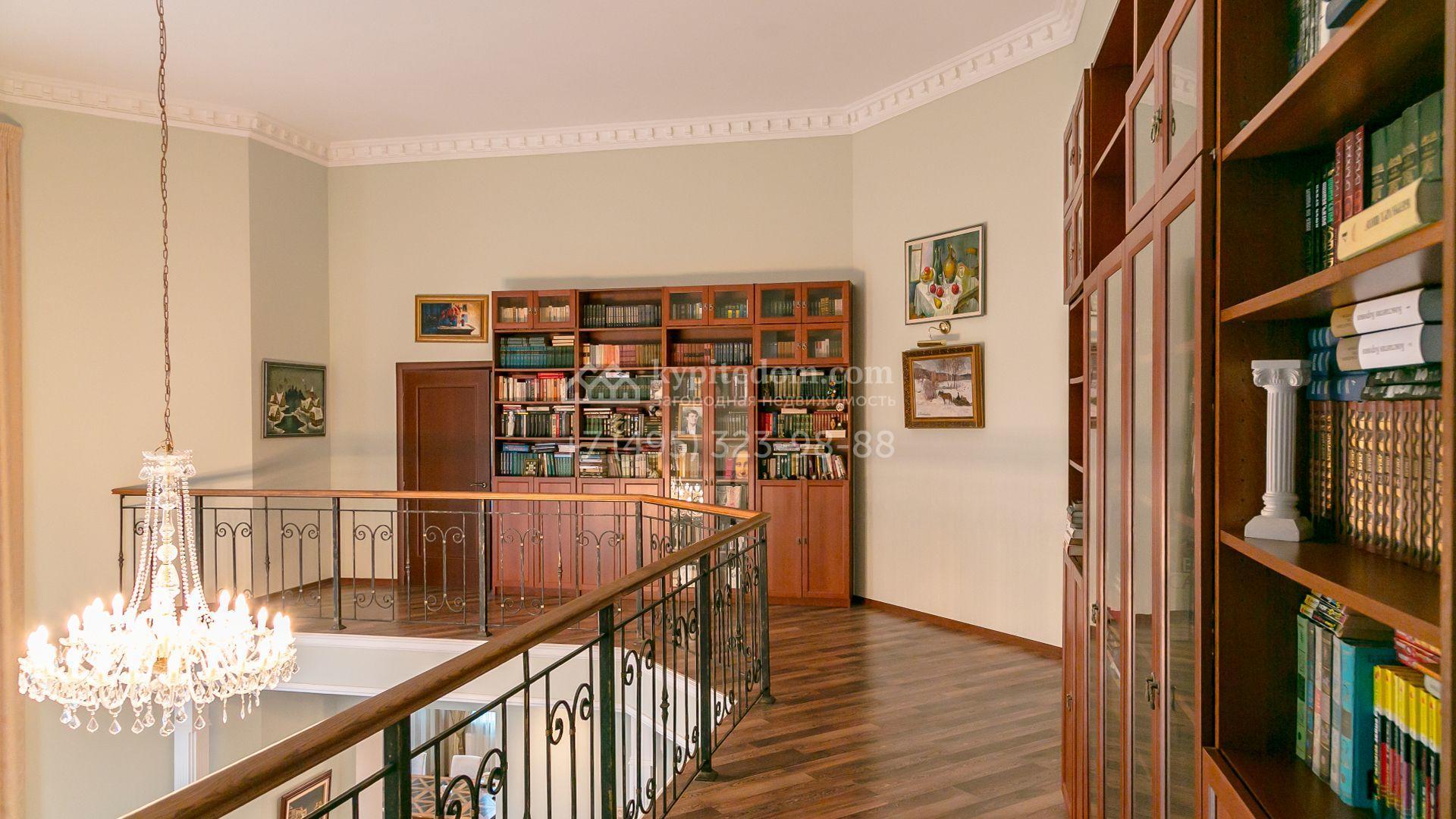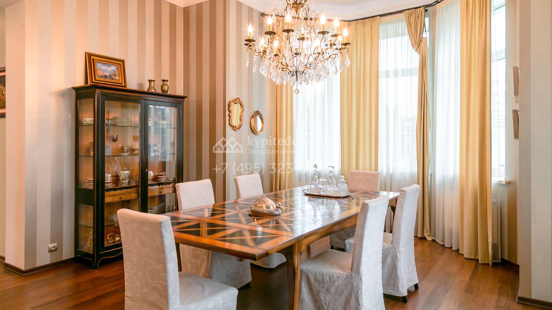 Загородный дом в неоклассическом стиле площадью 600 м² построен на прилесном участке 24 сотки. Бежевый фасад облицован штукатуркой, украшен рустовкой, наличниками и карнизом. Интерьер оформлен в мягких тёплых оттенках. В главном доме на первом этаже расположена парадная гостиная со вторым светом, камином и выходом на террасу. В коттедже спланированы четыре спальни, кабинет и спа-зона, включающая бассейн, сауну и душевую. Резиденция укомплектована мебелью производства Италии и Испании, бытовой техникой. Предусмотрена квартира для персонала с кухней и двумя спальнями. У дома есть гараж на две машины. На участке выполнен ландшафтный дизайн, проложены дорожки, высажены яблони, вишни, сосны и другие растения.